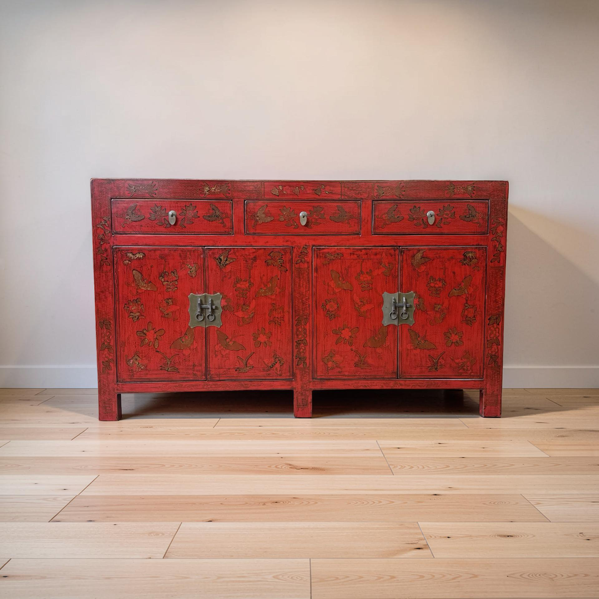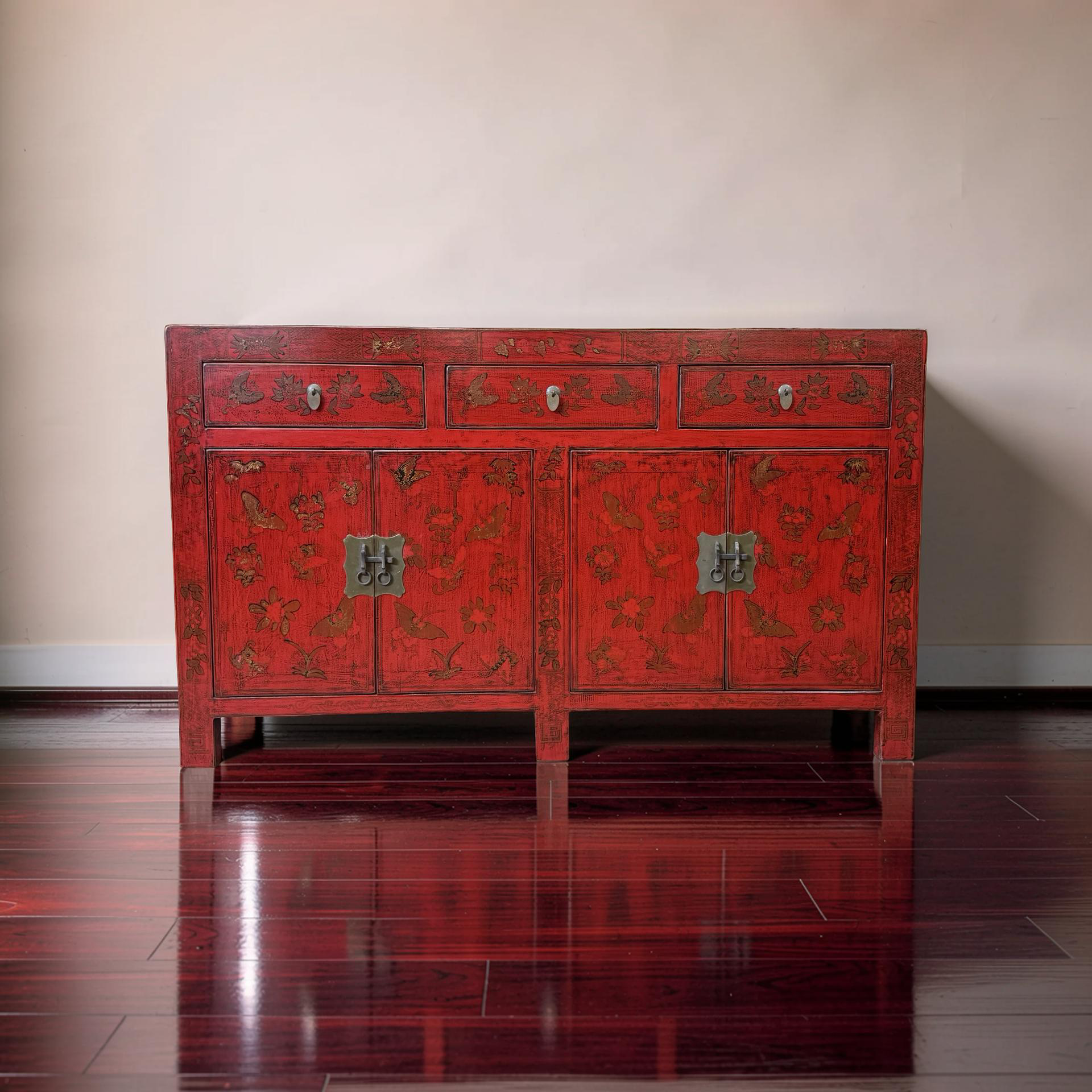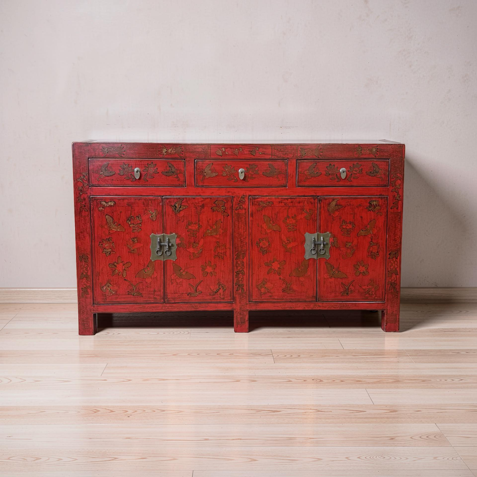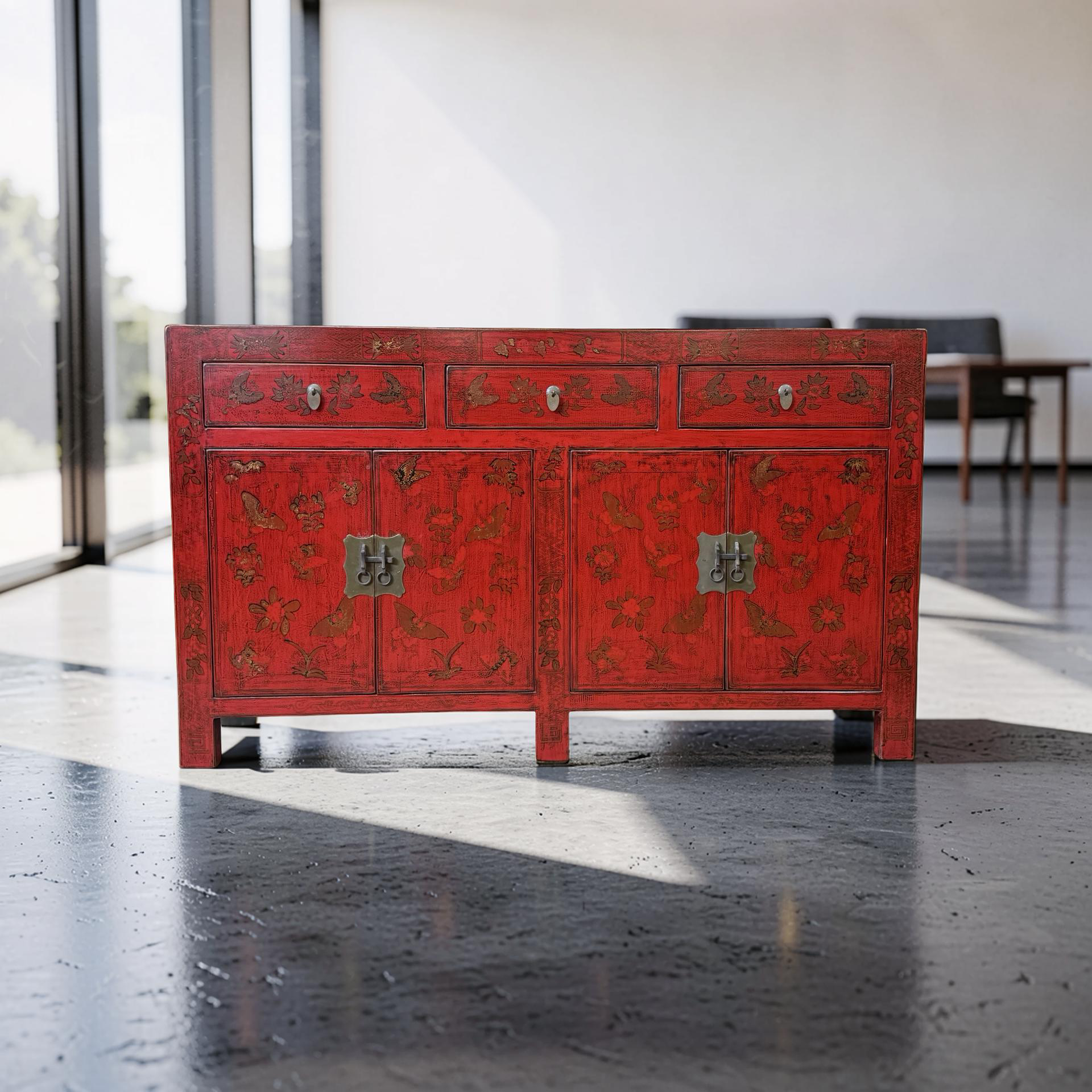 Dit unieke dressoir uit China is rijkelijk met de hand beschilderd in een warme rode kleur, wat het meubel een uitgesproken en authentieke uitstraling geeft. Met vier deuren en drie lades biedt het volop praktische opbergruimte, terwijl de traditionele schilderingen zorgen voor een decoratief en karaktervol geheel.