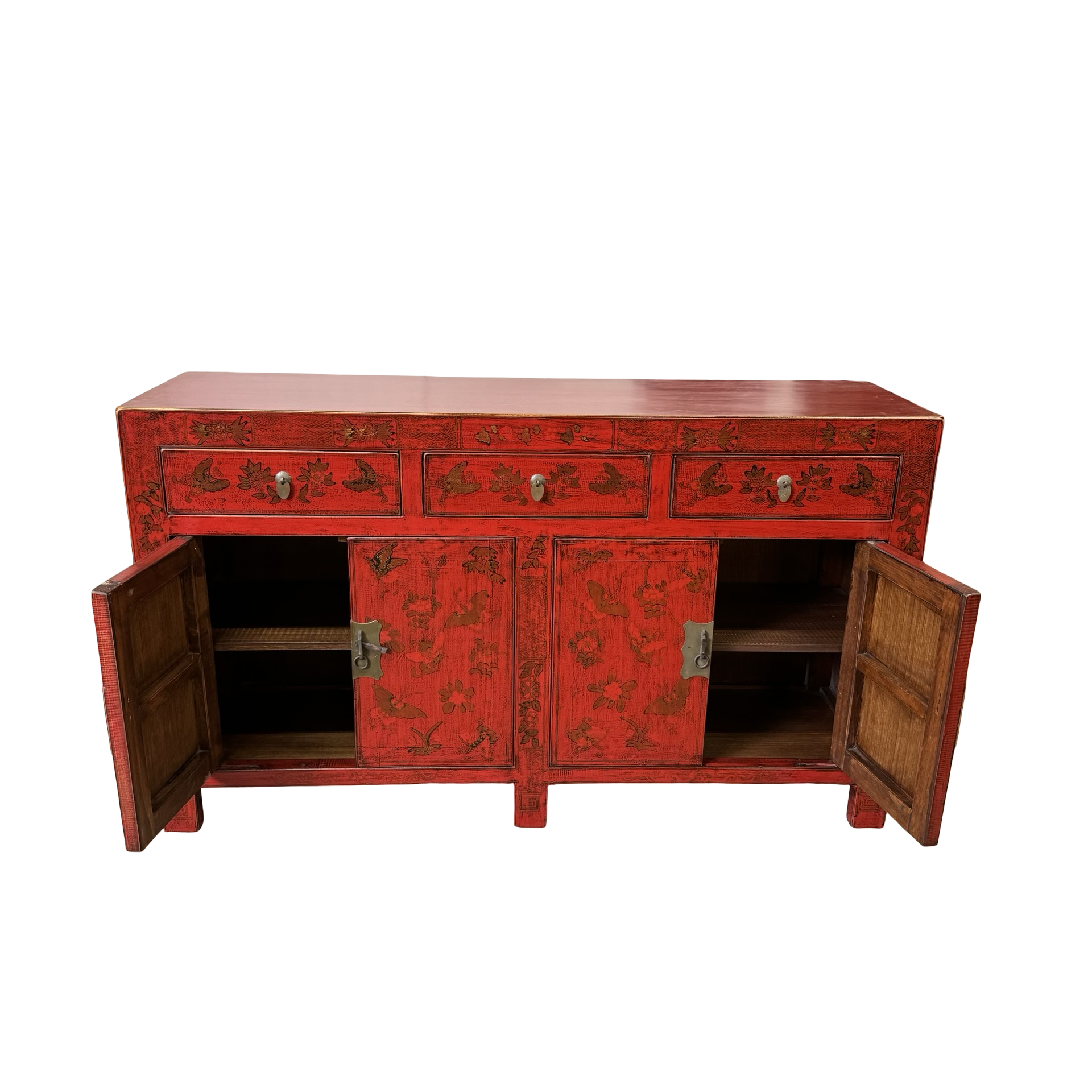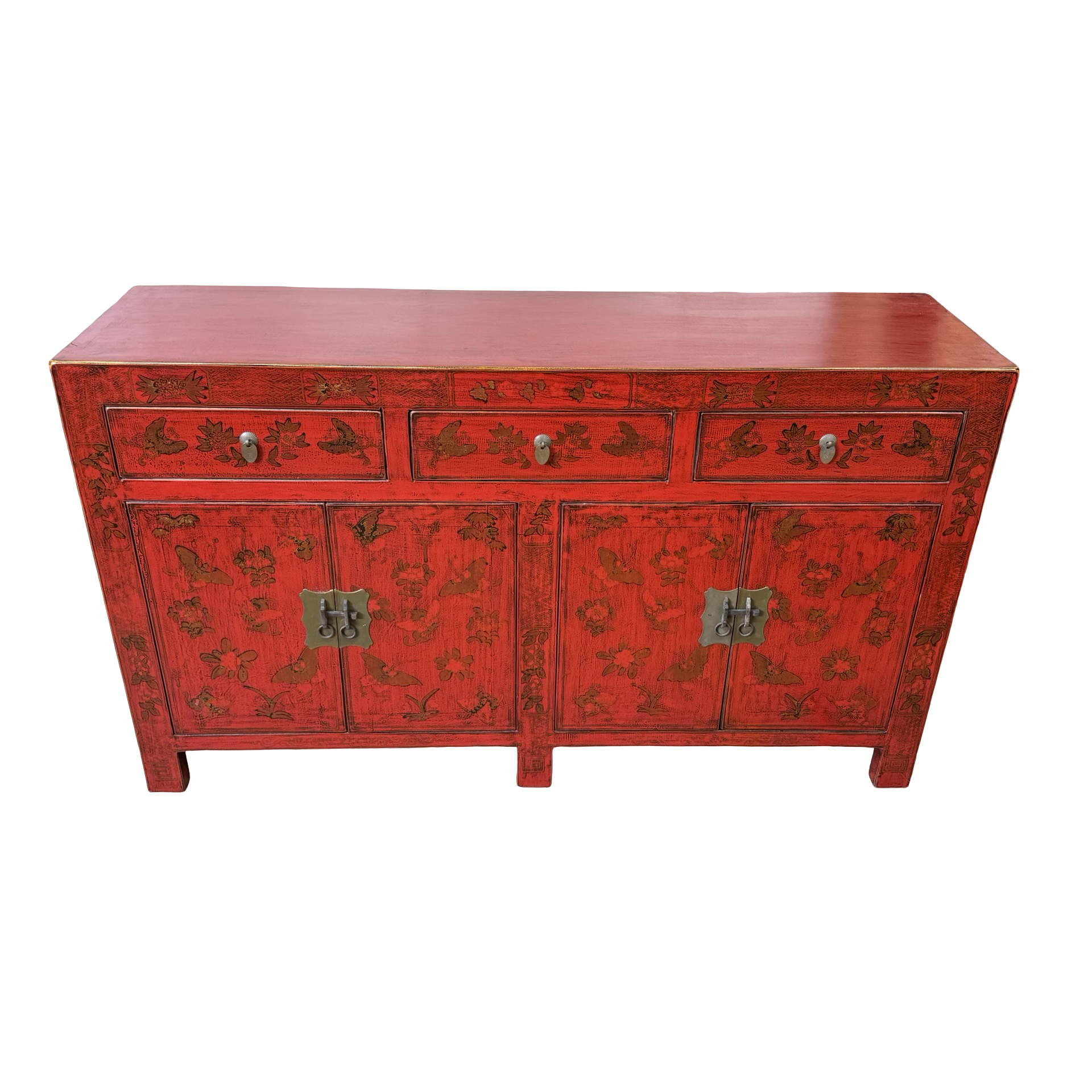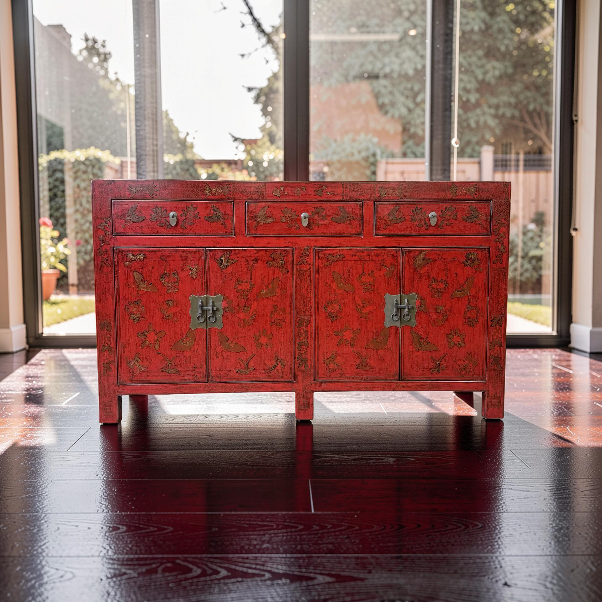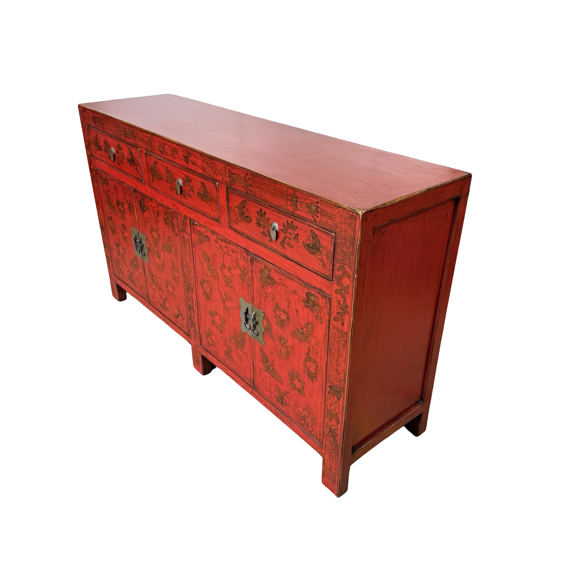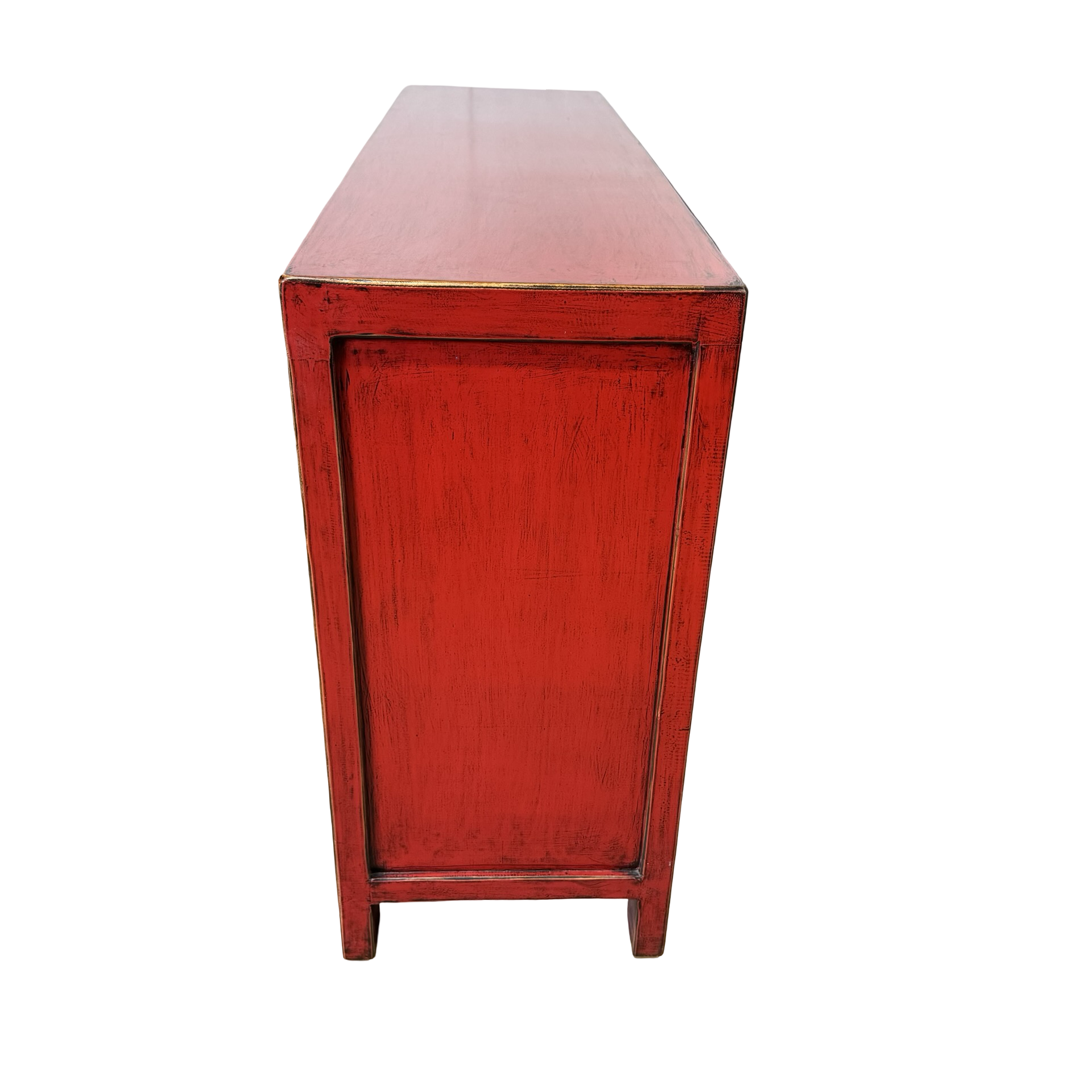 Dit unieke dressoir uit China is rijkelijk met de hand beschilderd in een warme rode kleur, wat het meubel een uitgesproken en authentieke uitstraling geeft. Met vier deuren en drie lades biedt het volop praktische opbergruimte, terwijl de traditionele schilderingen zorgen voor een decoratief en karaktervol geheel.