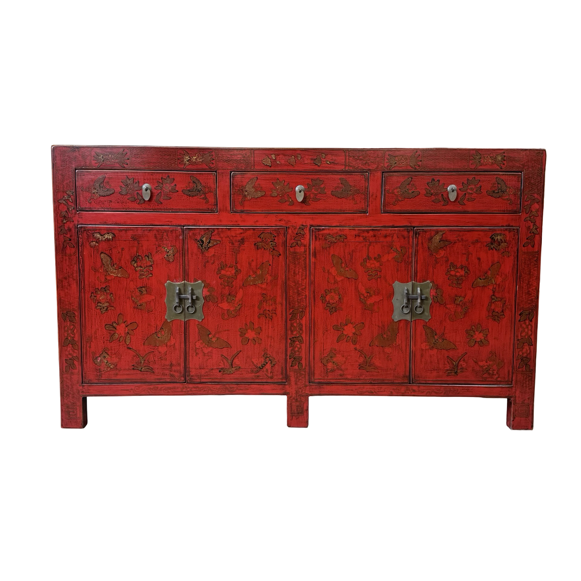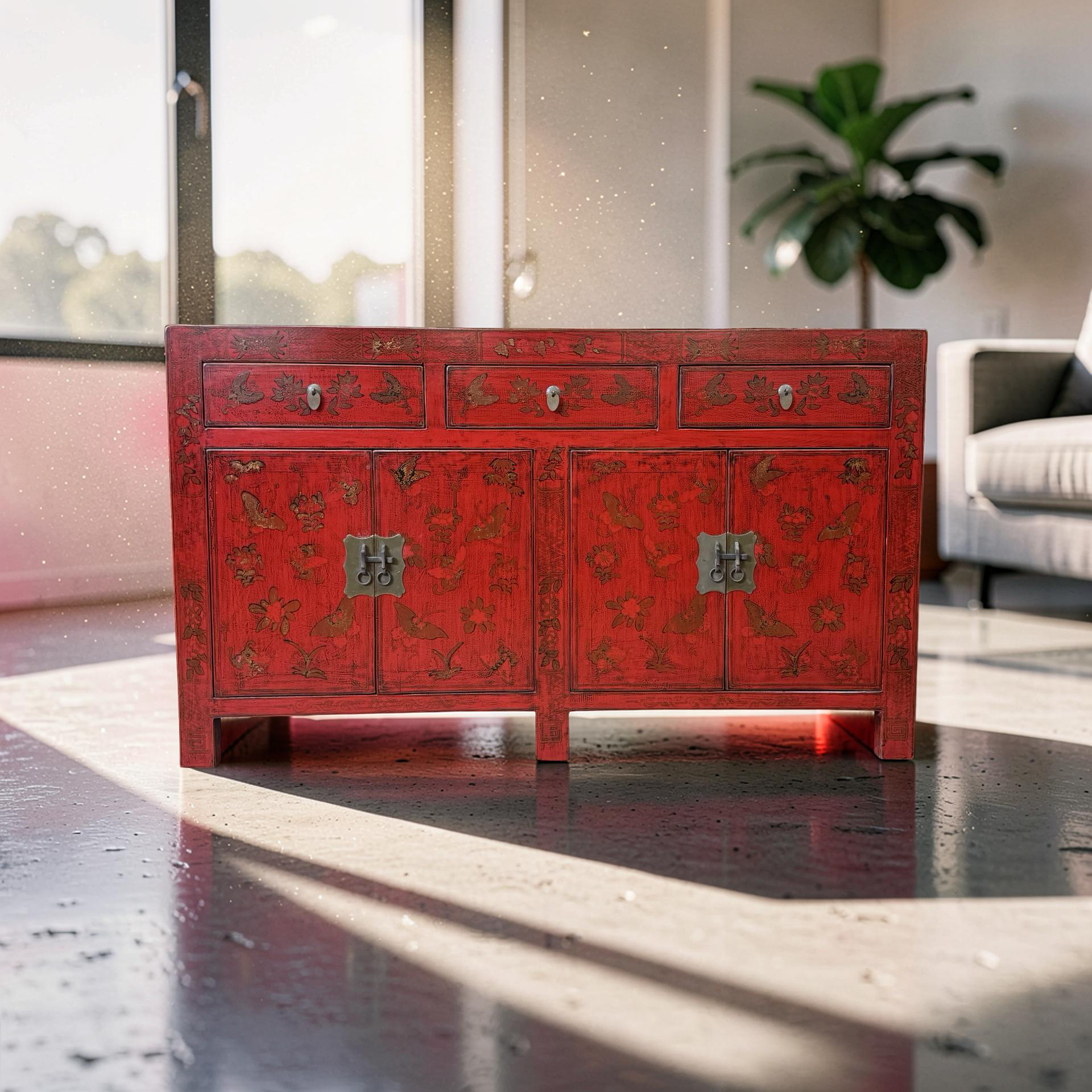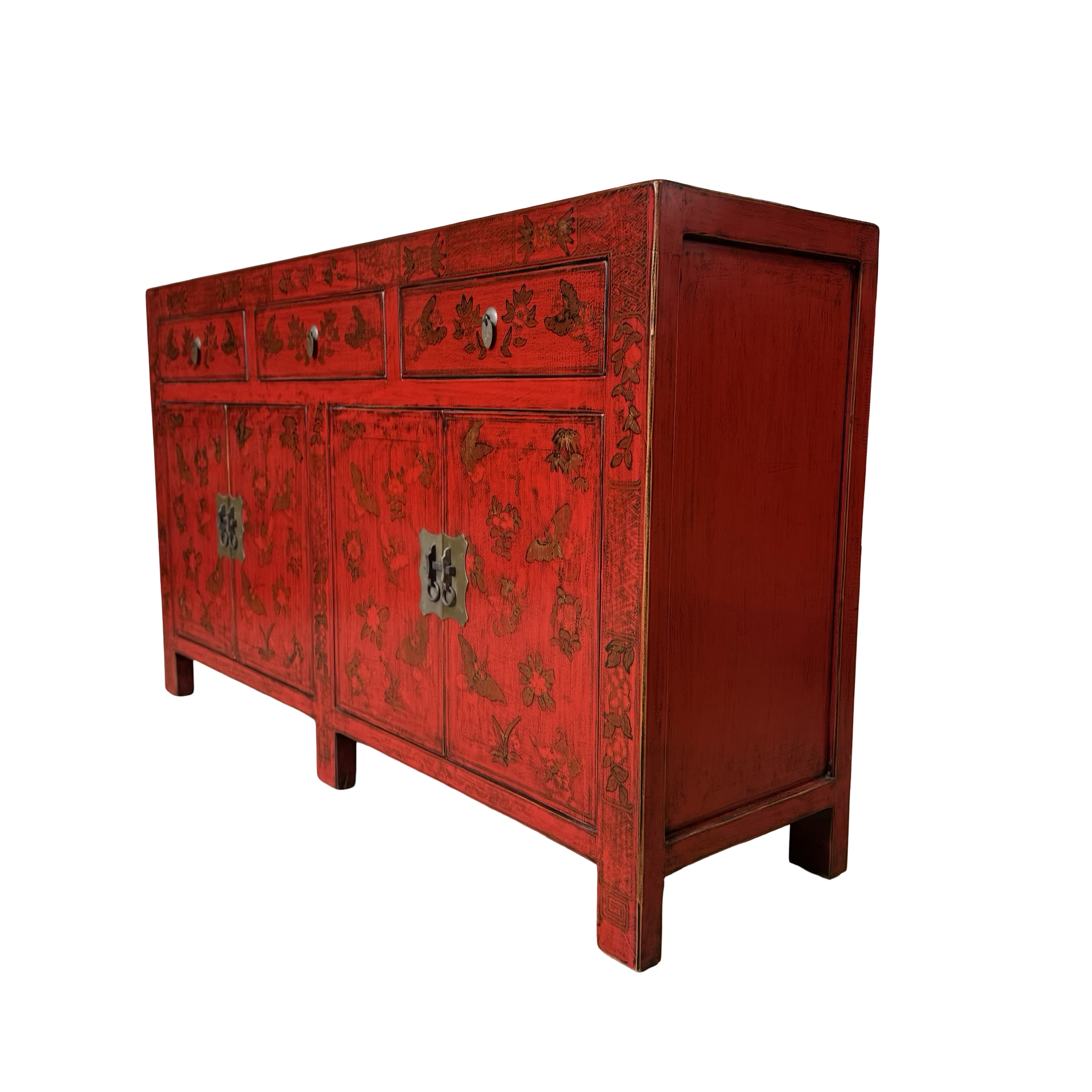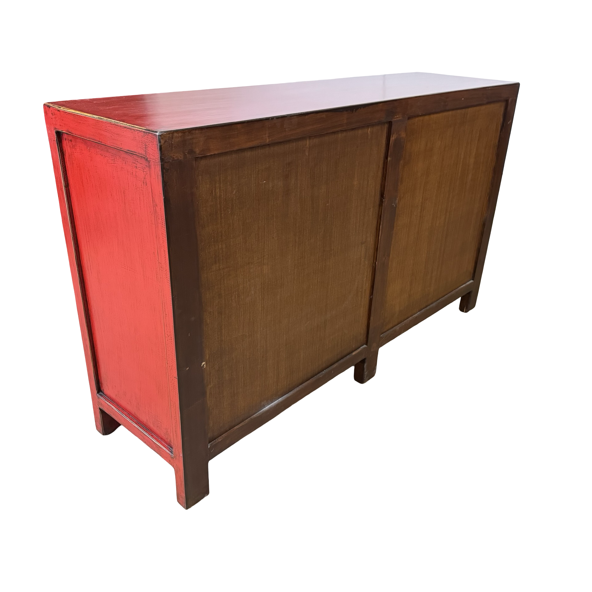 Dit unieke dressoir uit China is rijkelijk met de hand beschilderd in een warme rode kleur, wat het meubel een uitgesproken en authentieke uitstraling geeft. Met vier deuren en drie lades biedt het volop praktische opbergruimte, terwijl de traditionele schilderingen zorgen voor een decoratief en karaktervol geheel.