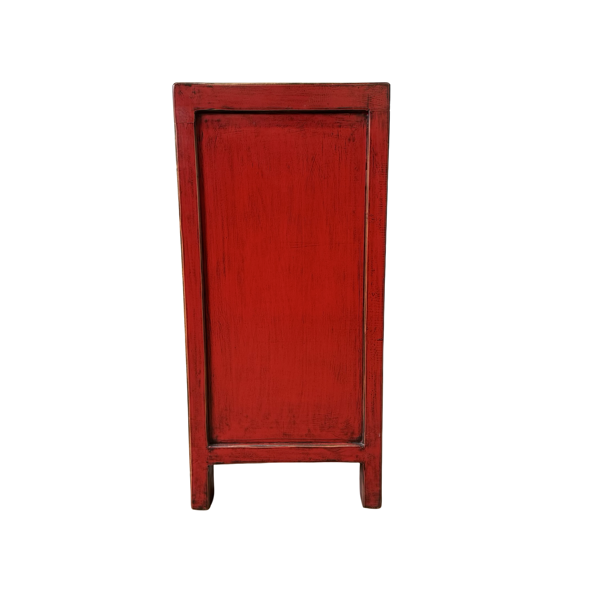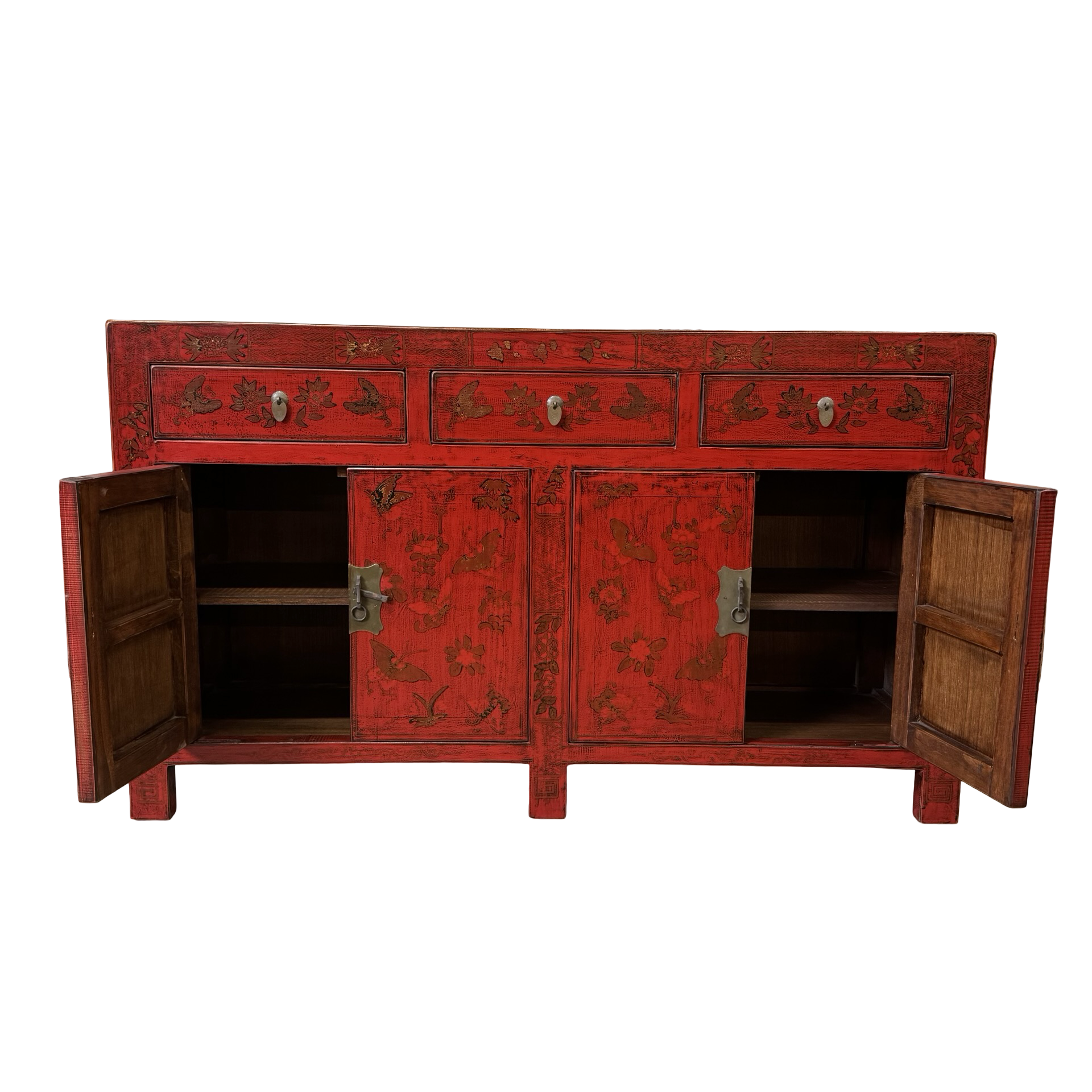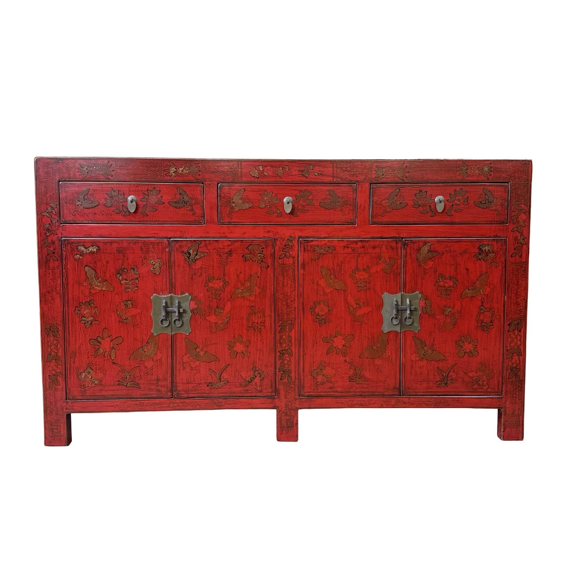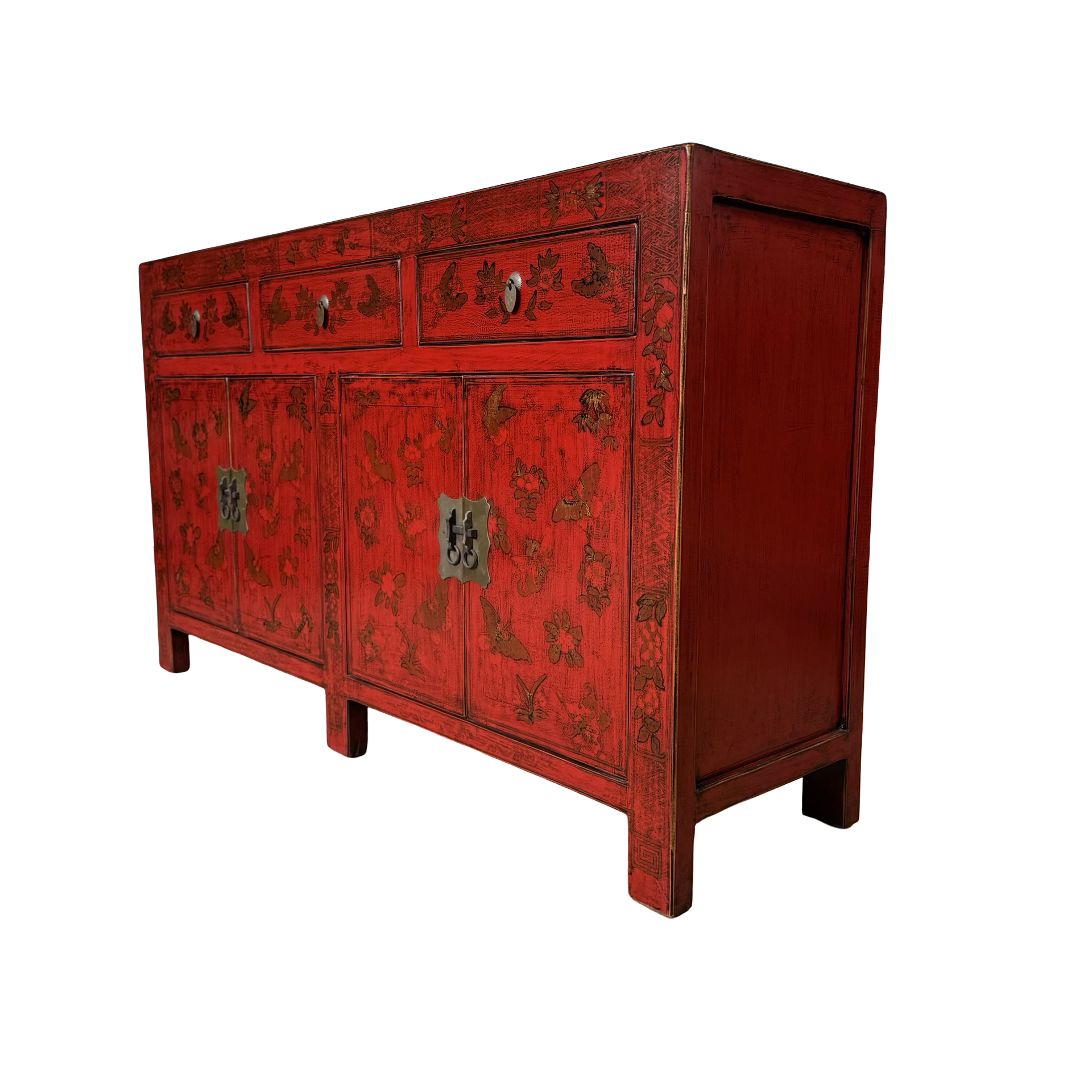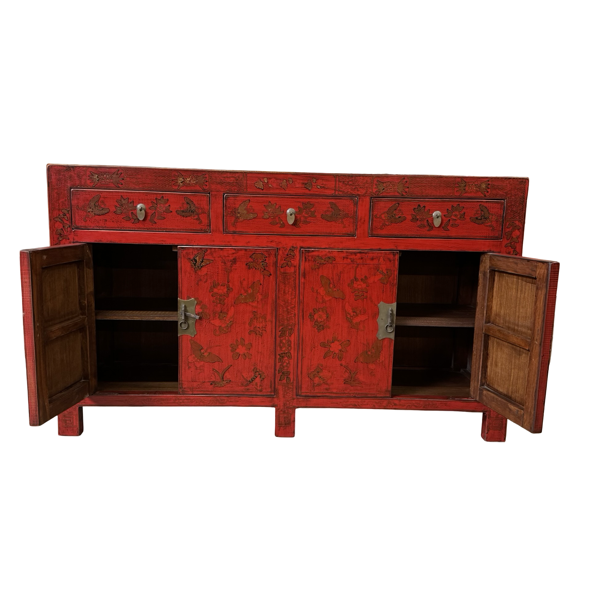 Dit unieke dressoir uit China is rijkelijk met de hand beschilderd in een warme rode kleur, wat het meubel een uitgesproken en authentieke uitstraling geeft. Met vier deuren en drie lades biedt het volop praktische opbergruimte, terwijl de traditionele schilderingen zorgen voor een decoratief en karaktervol geheel.