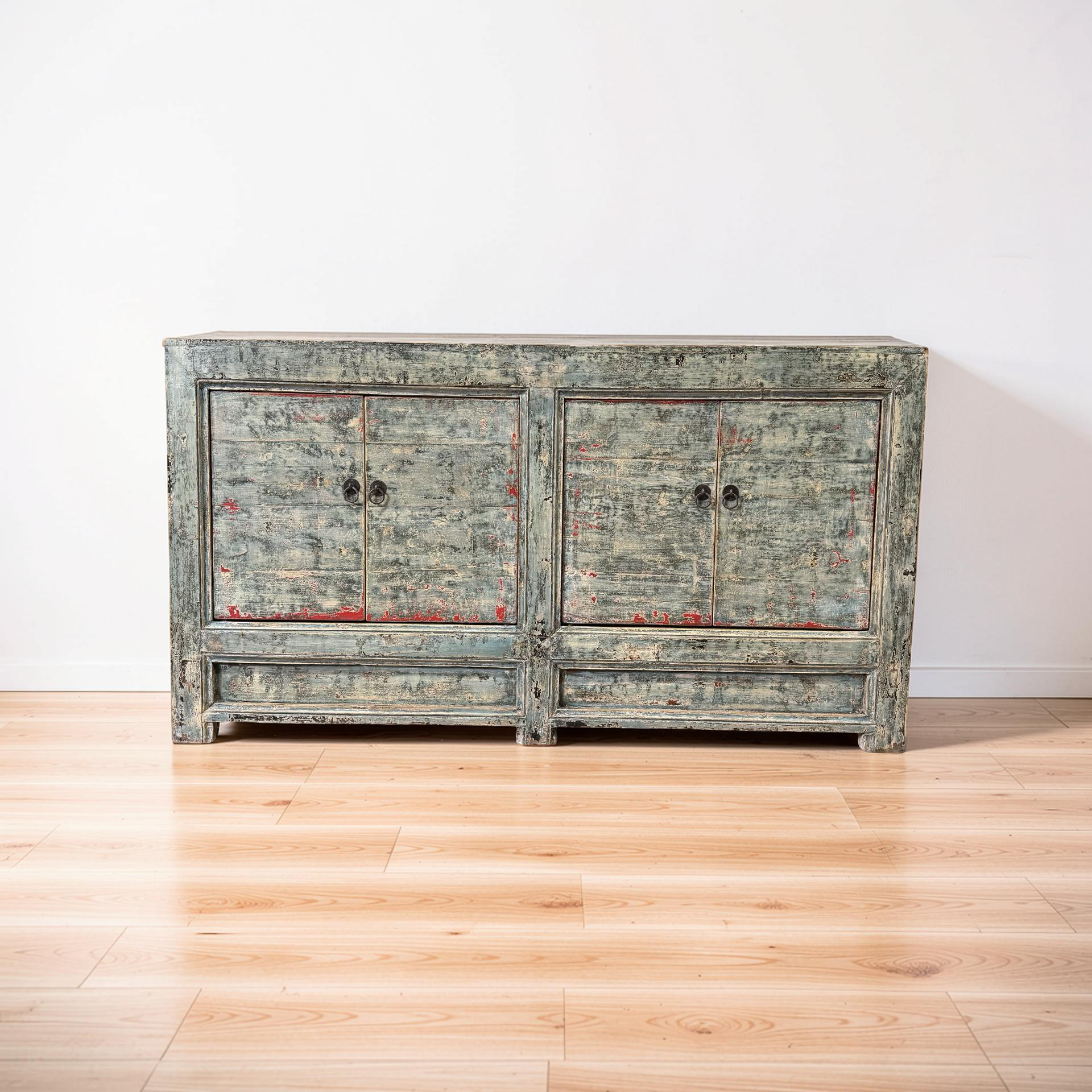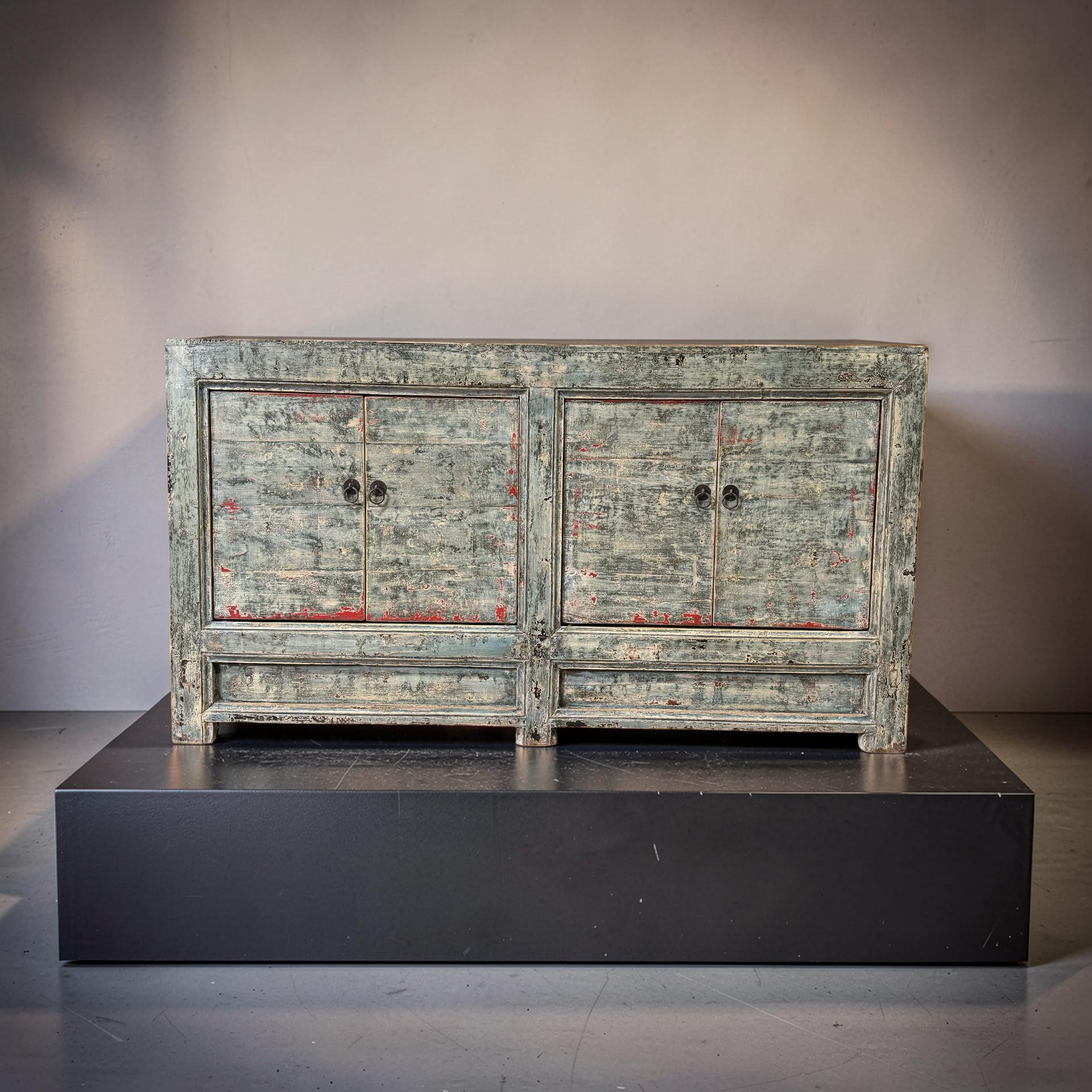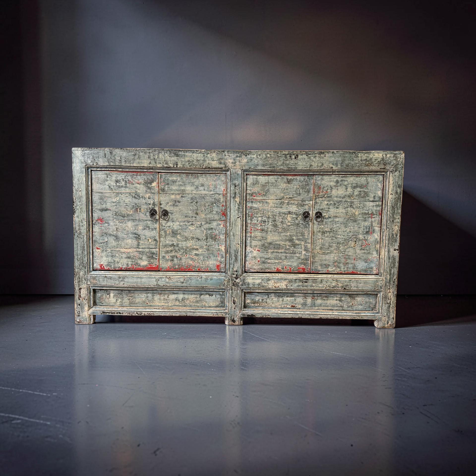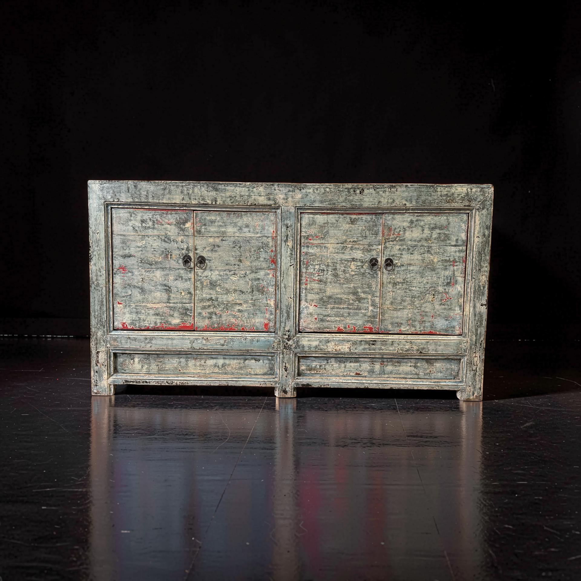 Dit blauw met rode accenten dressoir met vier deuren is een uniek, handgemaakt meubelstuk uit China. De rustige kleur en strakke belijning geven het meubel een karaktervolle uitstraling, terwijl het ambachtelijke karakter zorgt voor een authentiek en tijdloos geheel.