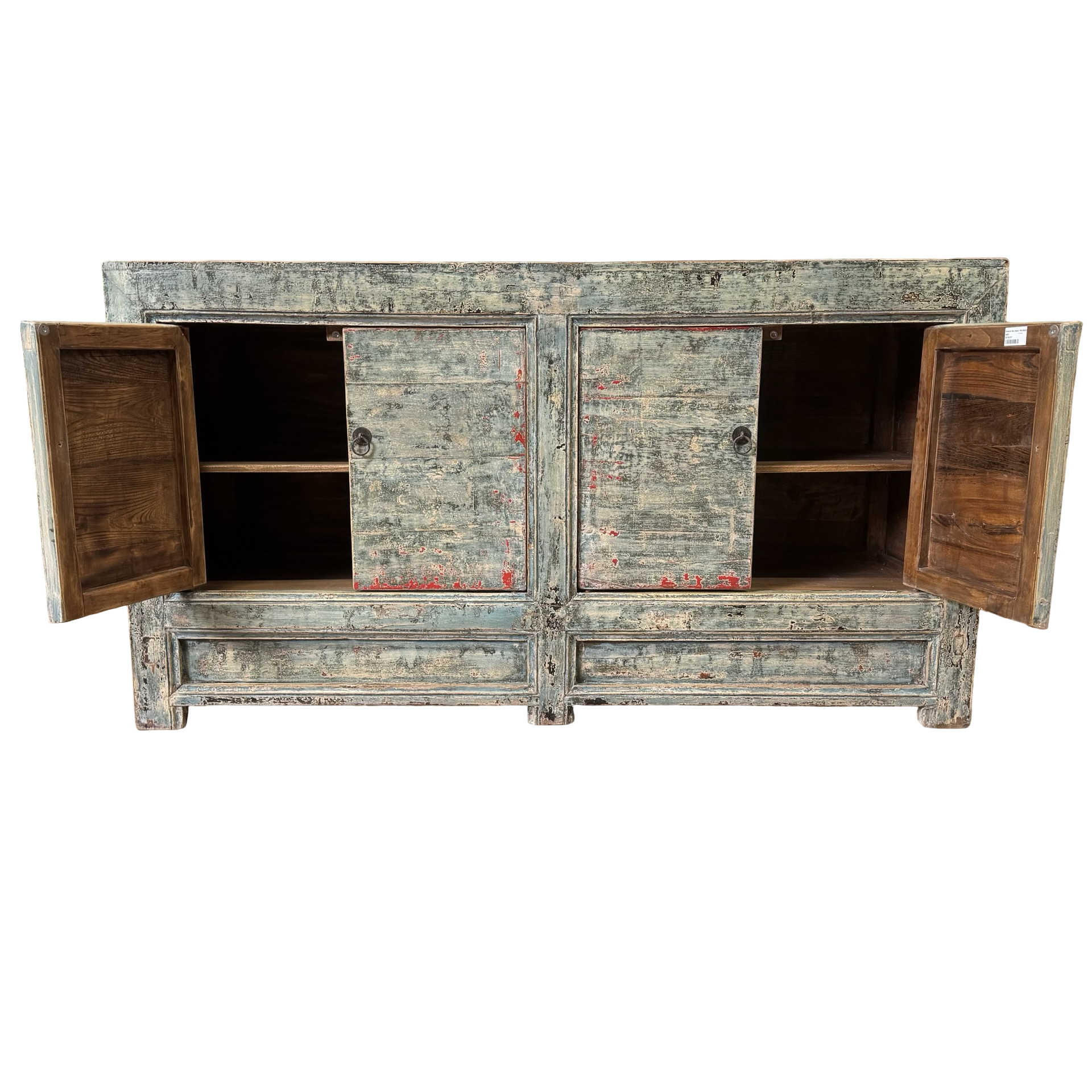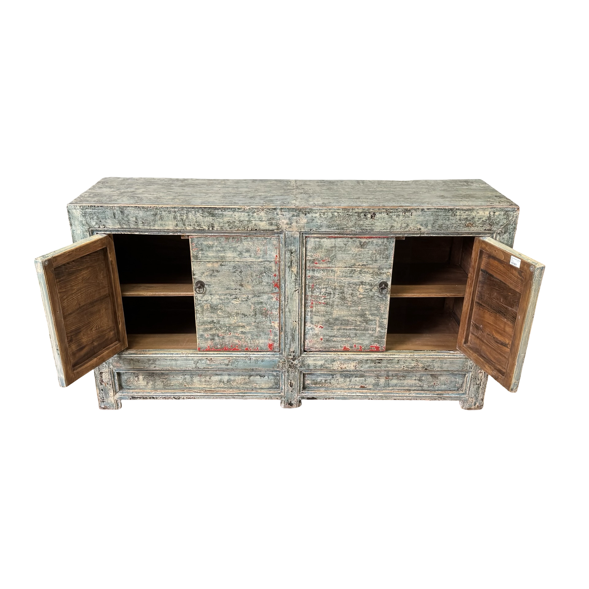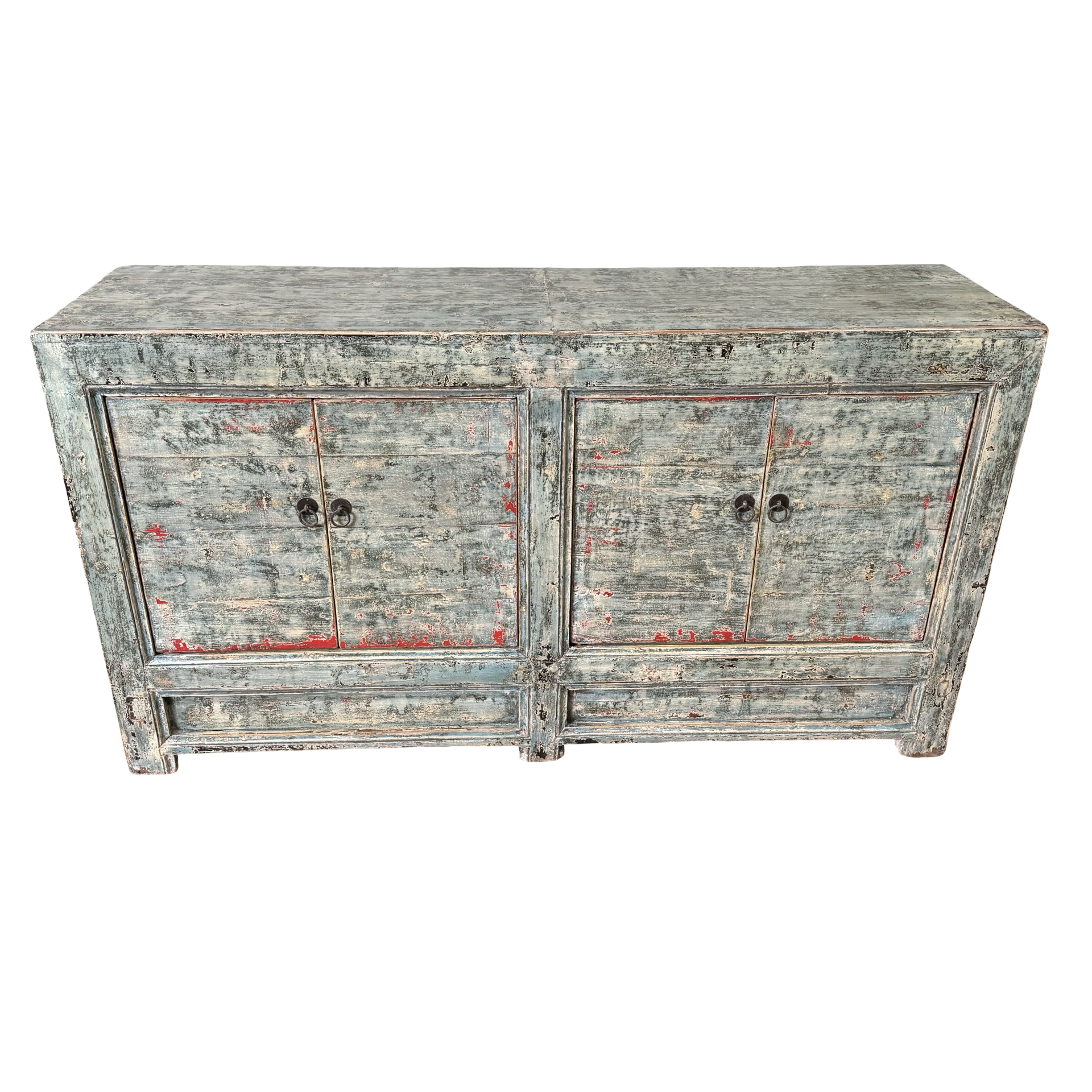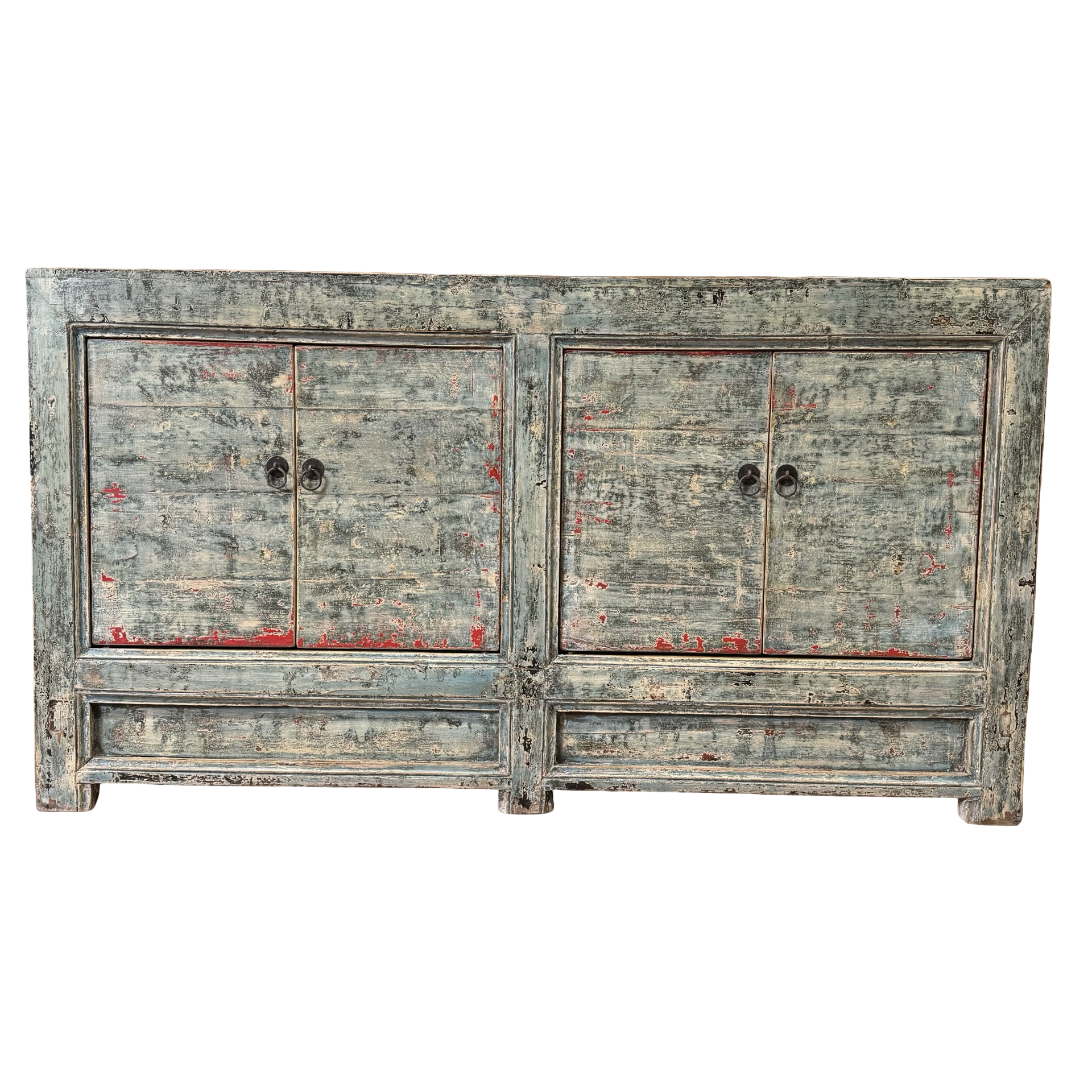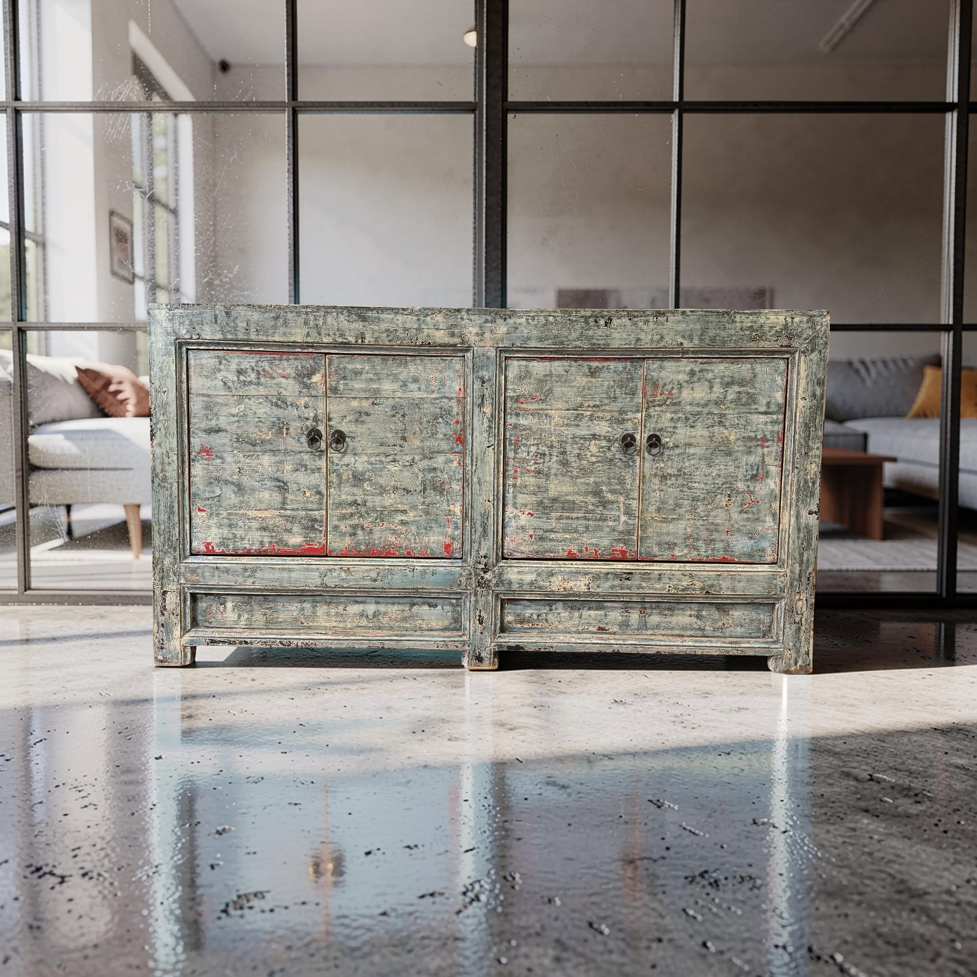 Dit blauw met rode accenten dressoir met vier deuren is een uniek, handgemaakt meubelstuk uit China. De rustige kleur en strakke belijning geven het meubel een karaktervolle uitstraling, terwijl het ambachtelijke karakter zorgt voor een authentiek en tijdloos geheel.