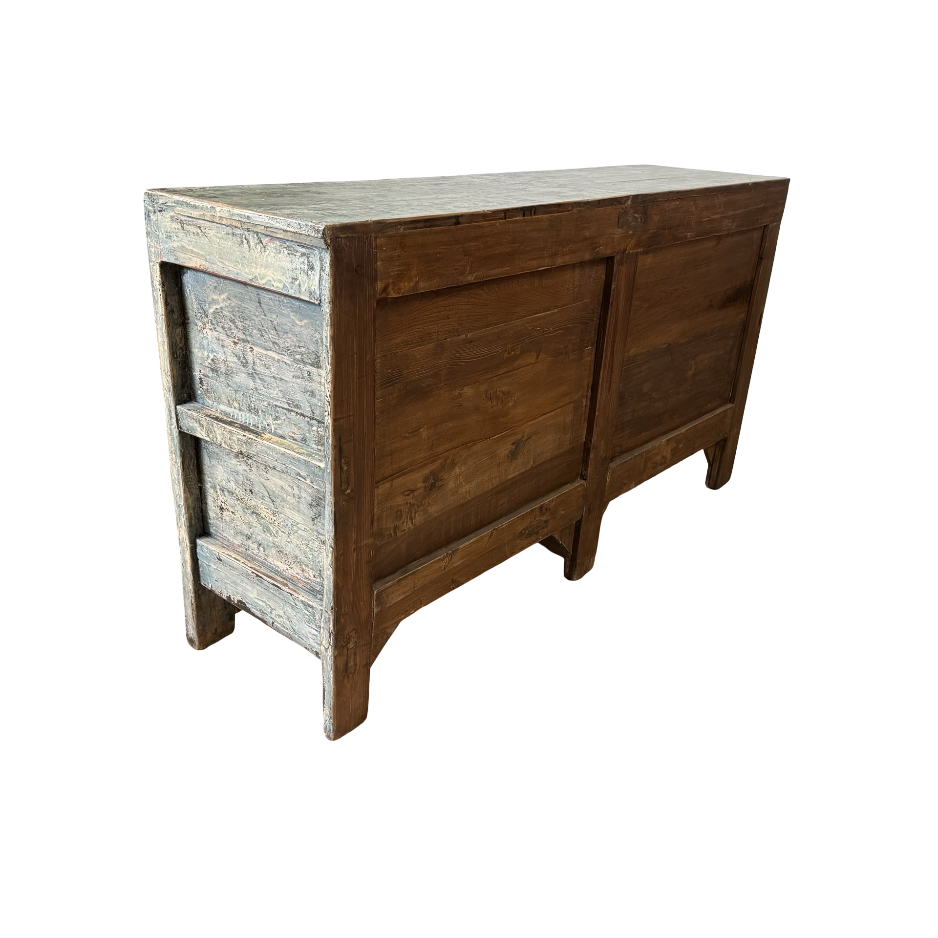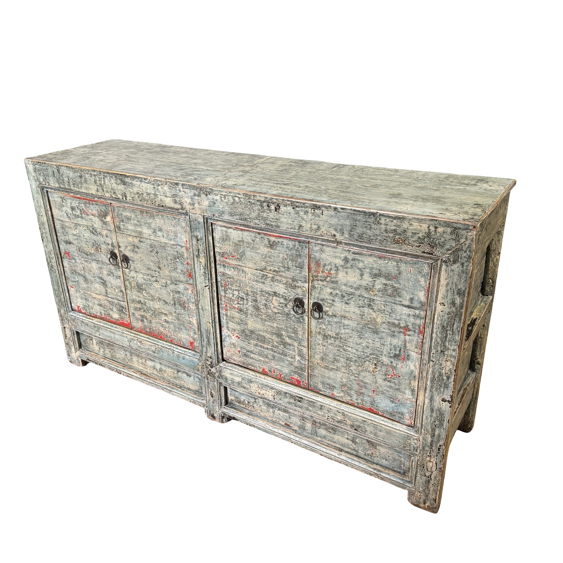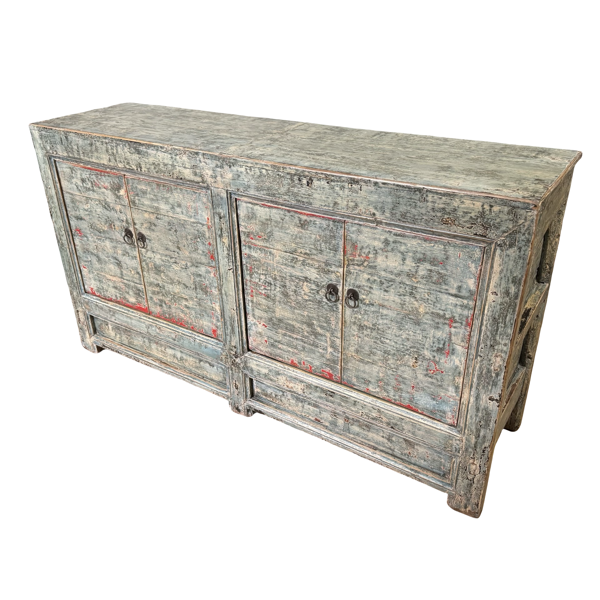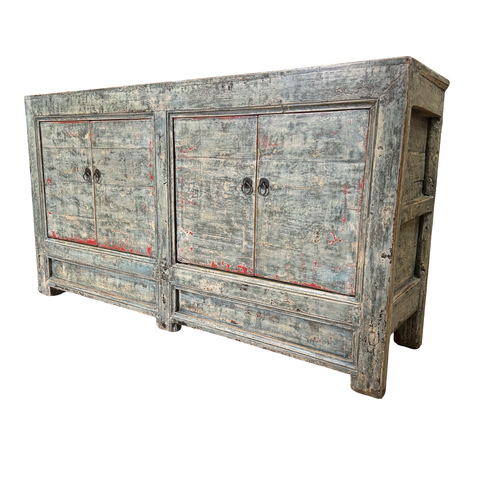 Dit blauw met rode accenten dressoir met vier deuren is een uniek, handgemaakt meubelstuk uit China. De rustige kleur en strakke belijning geven het meubel een karaktervolle uitstraling, terwijl het ambachtelijke karakter zorgt voor een authentiek en tijdloos geheel.