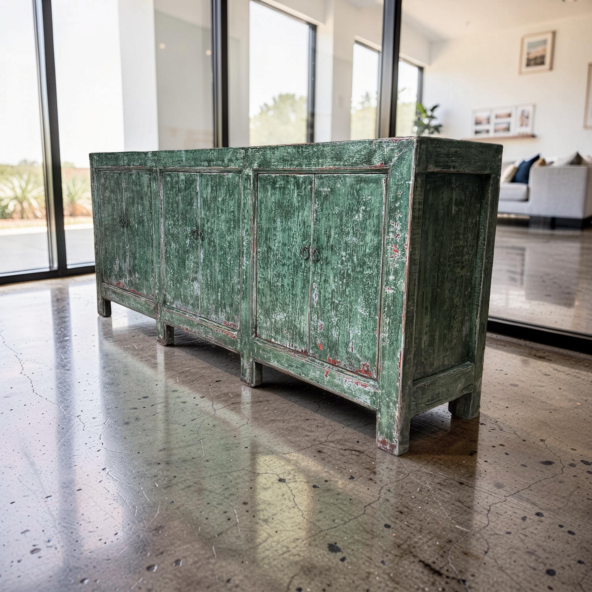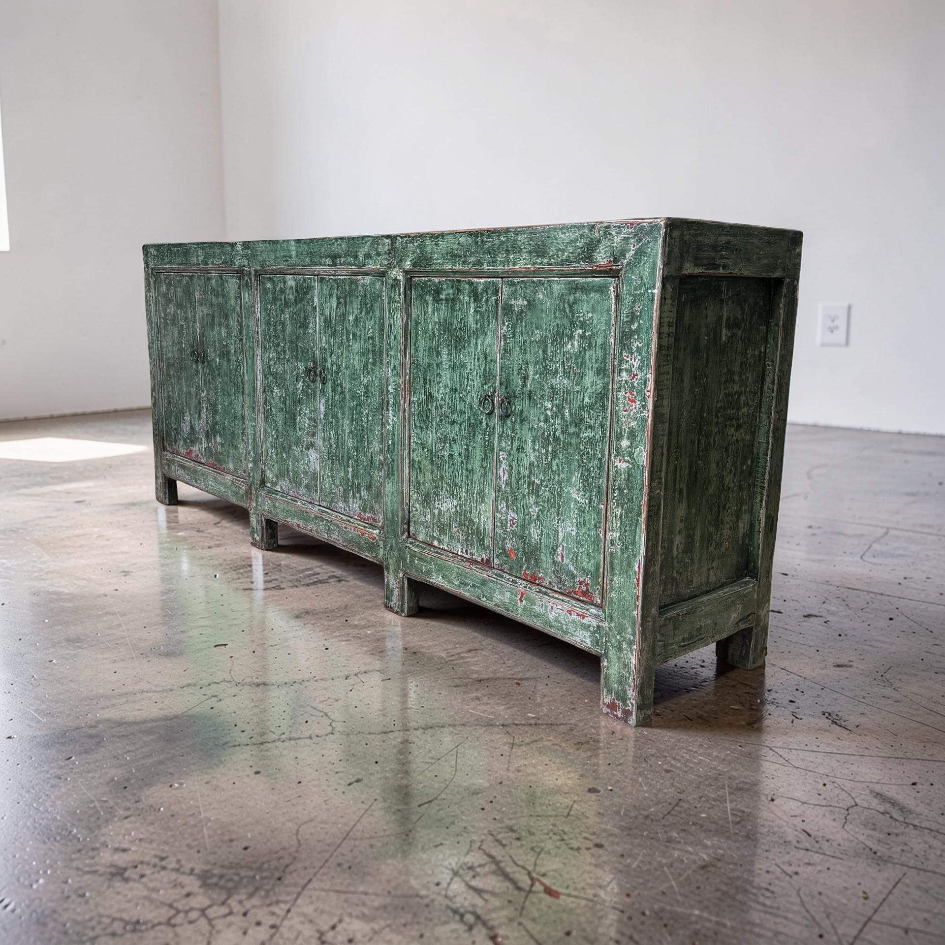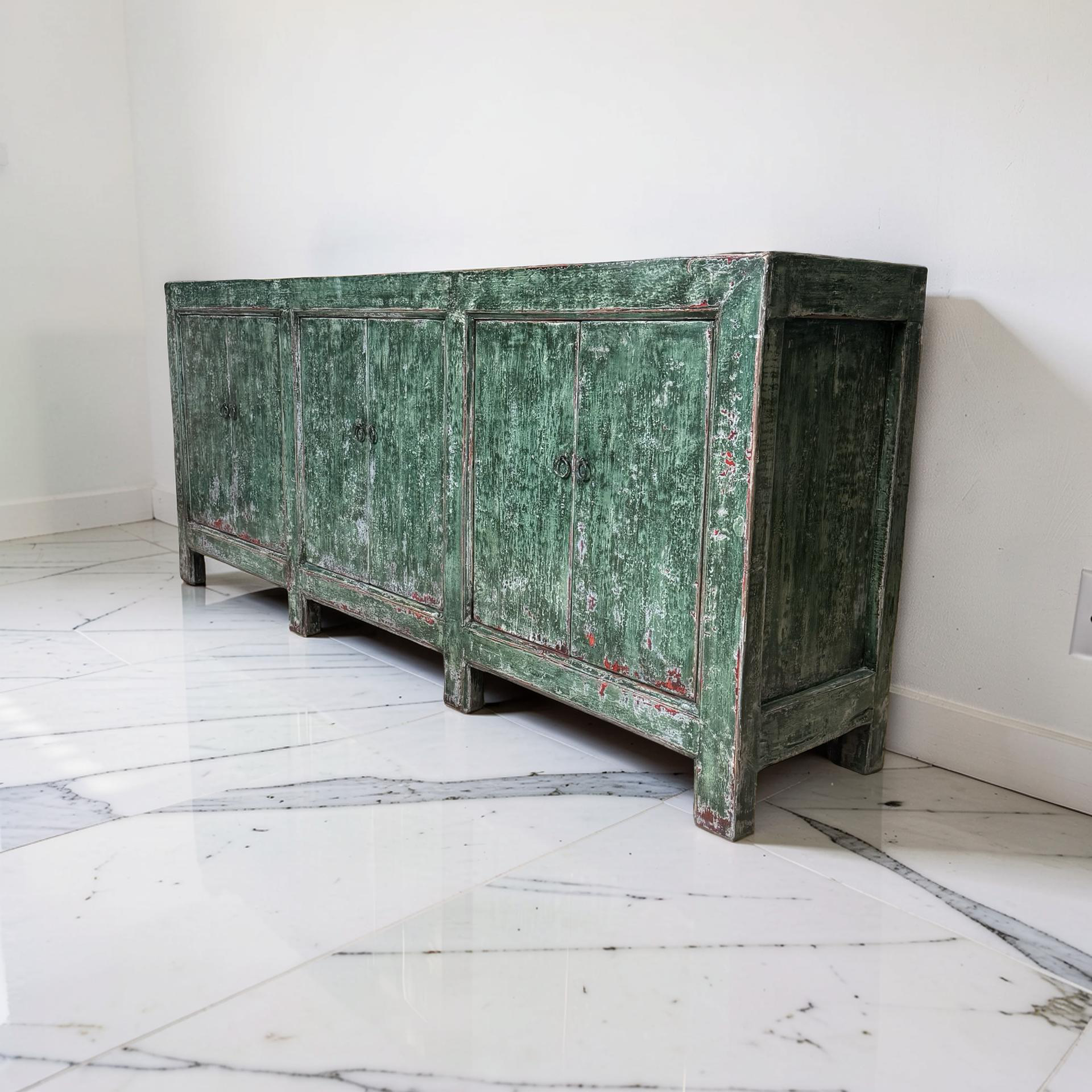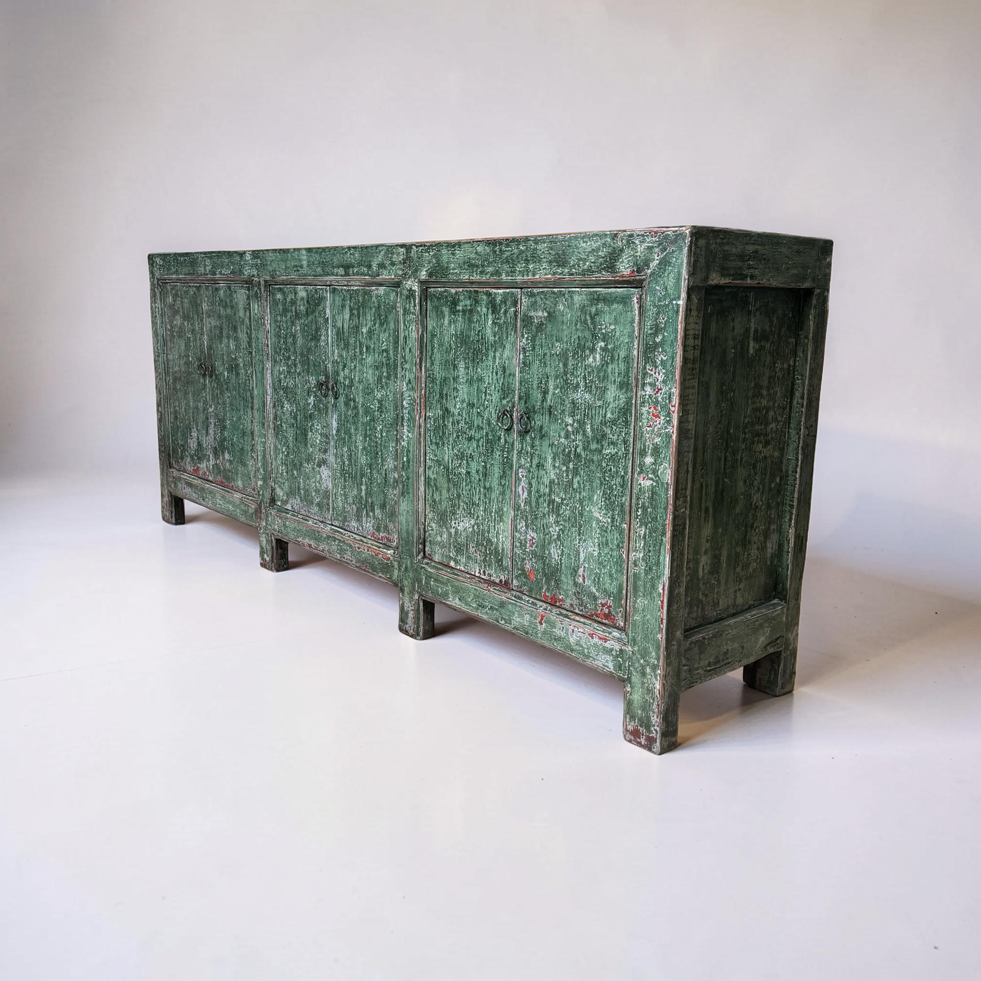 Dit unieke dressoir uit China is handgemaakt en uitgevoerd in een karaktervolle groene lakafwerking. Met zes deuren biedt het meubel royale opbergruimte, terwijl de lange, evenwichtige vorm zorgt voor een rustige en krachtige uitstraling.