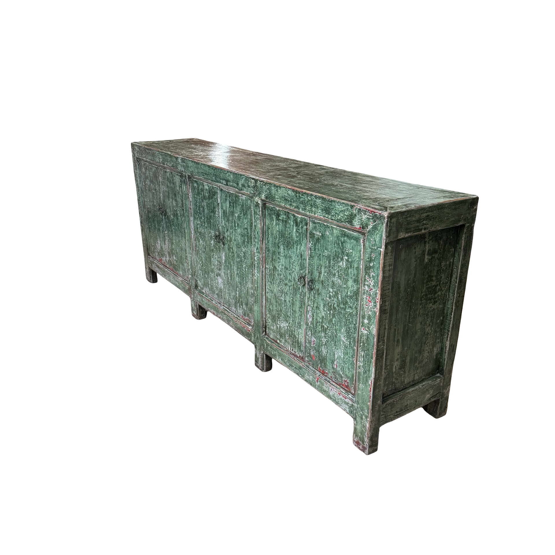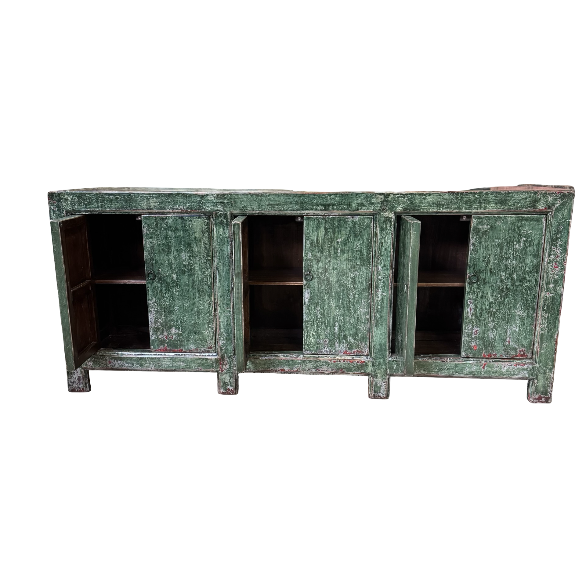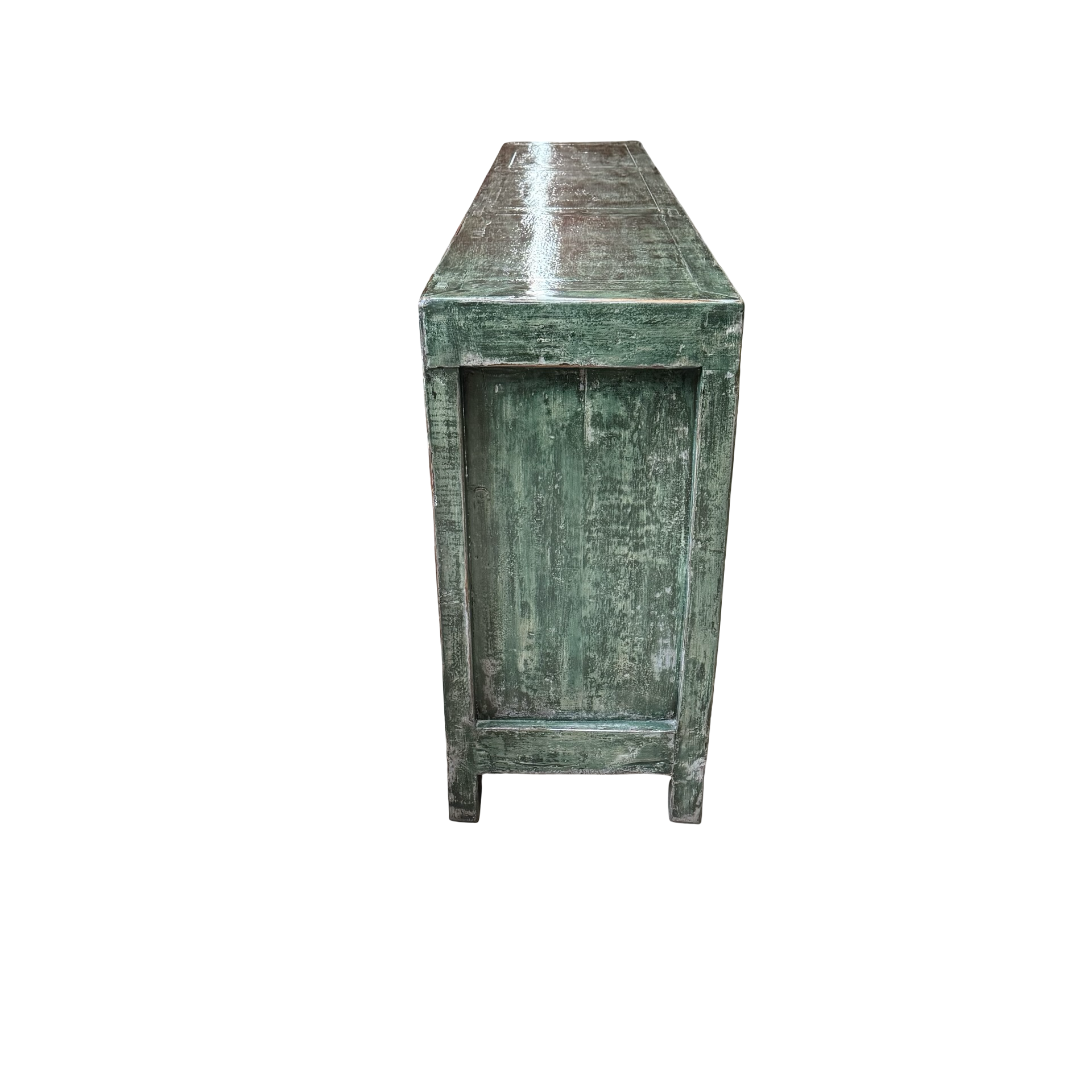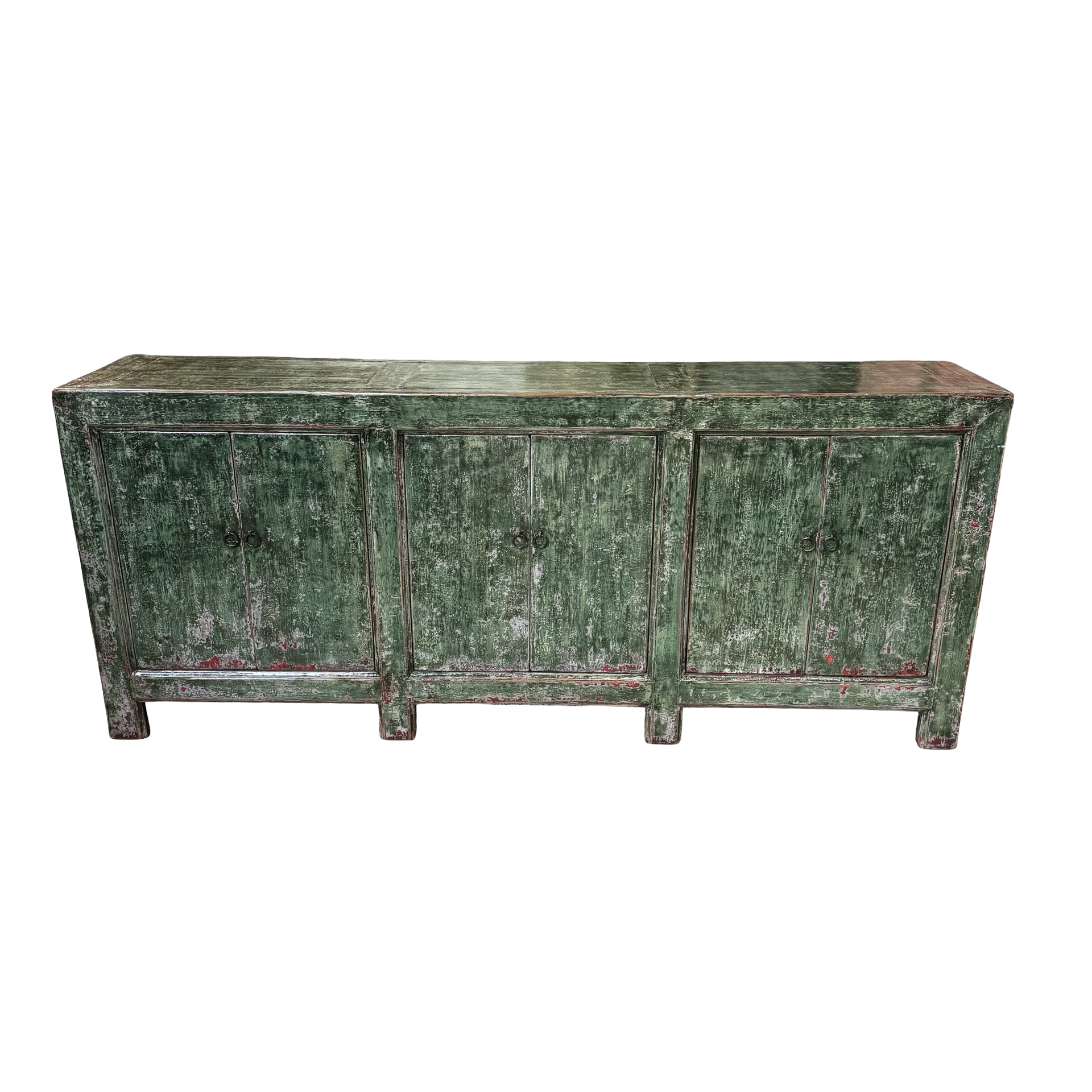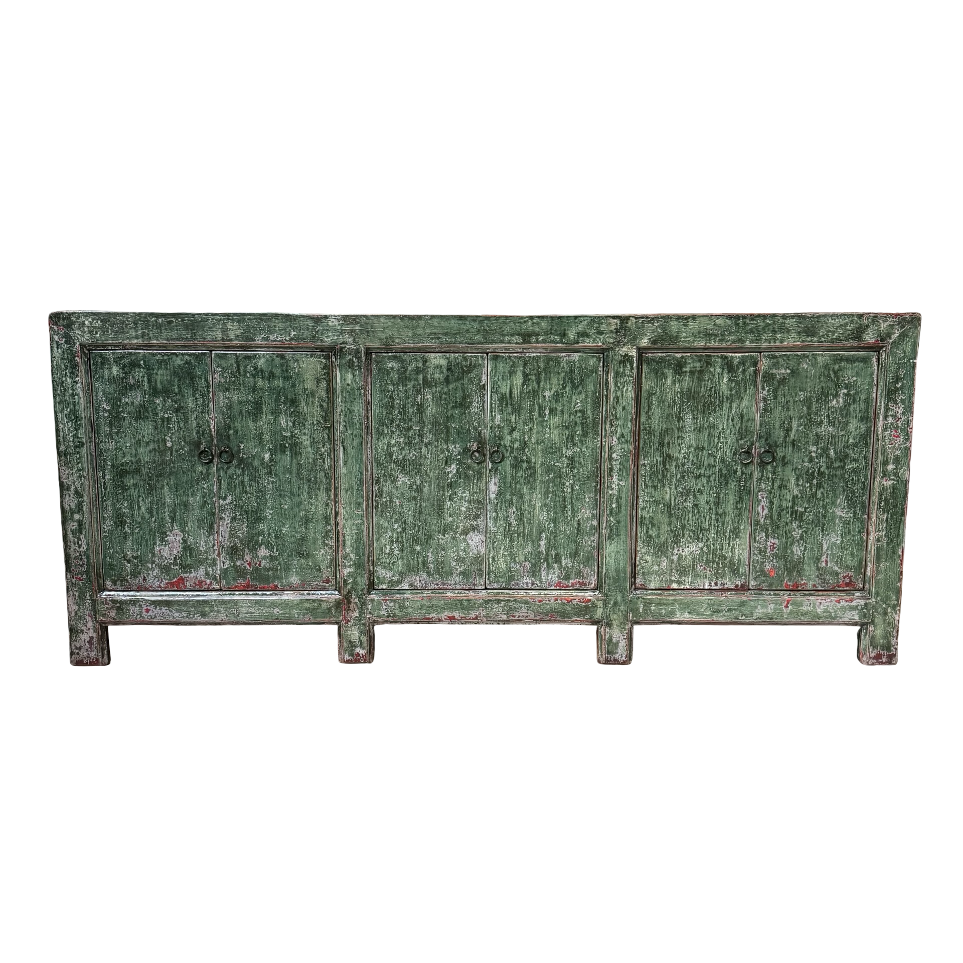 Dit unieke dressoir uit China is handgemaakt en uitgevoerd in een karaktervolle groene lakafwerking. Met zes deuren biedt het meubel royale opbergruimte, terwijl de lange, evenwichtige vorm zorgt voor een rustige en krachtige uitstraling.