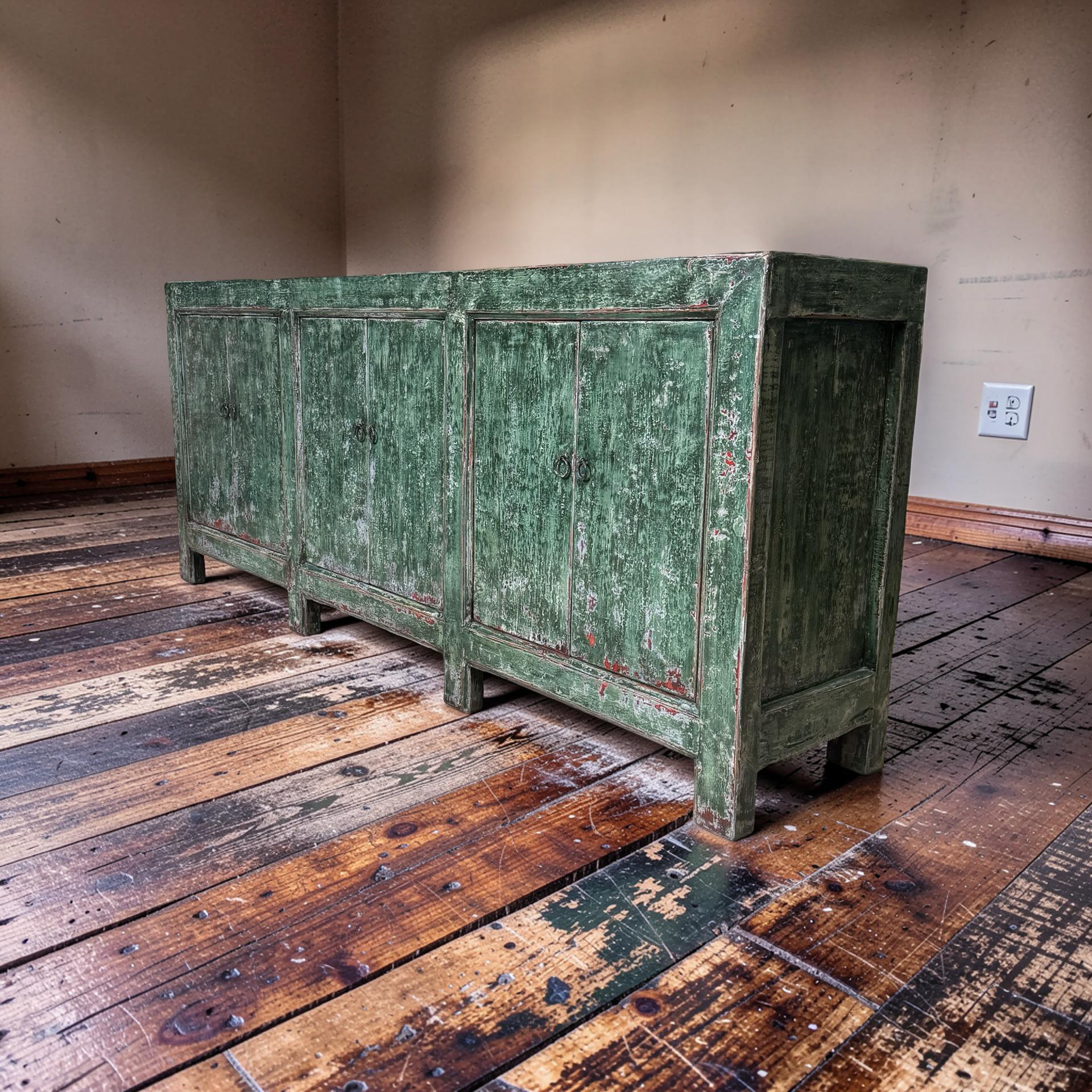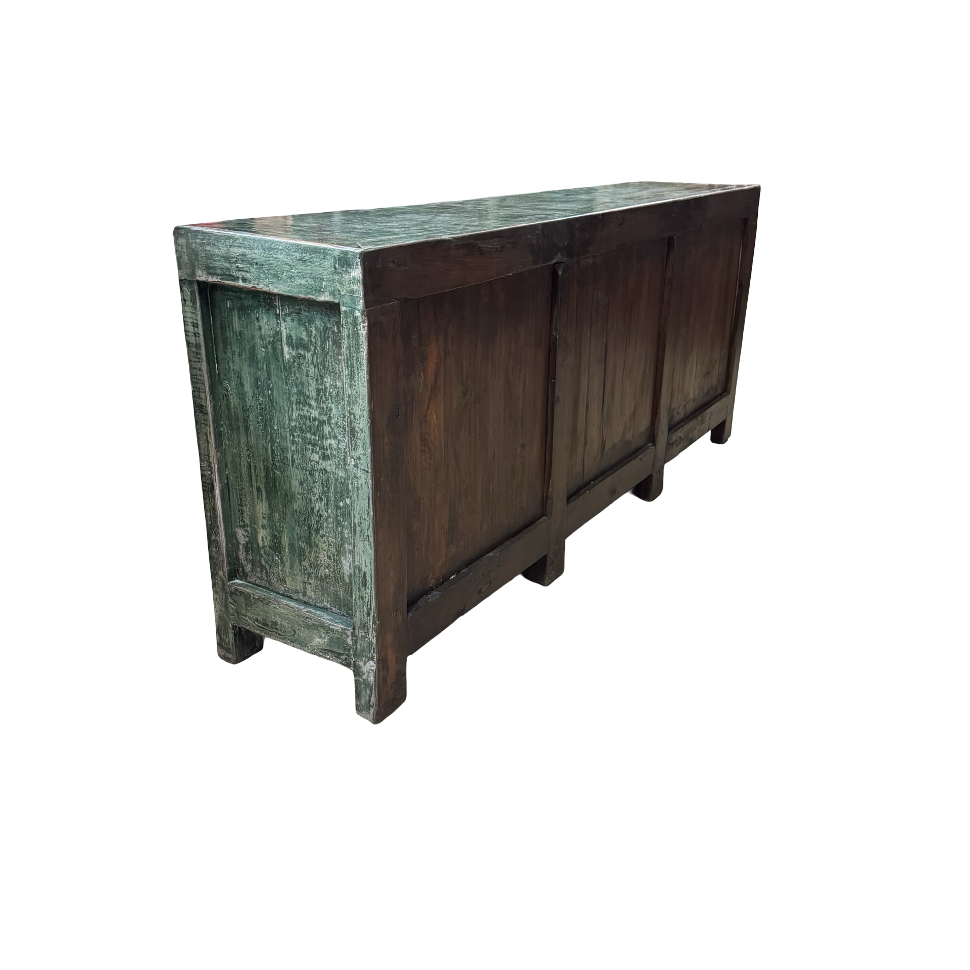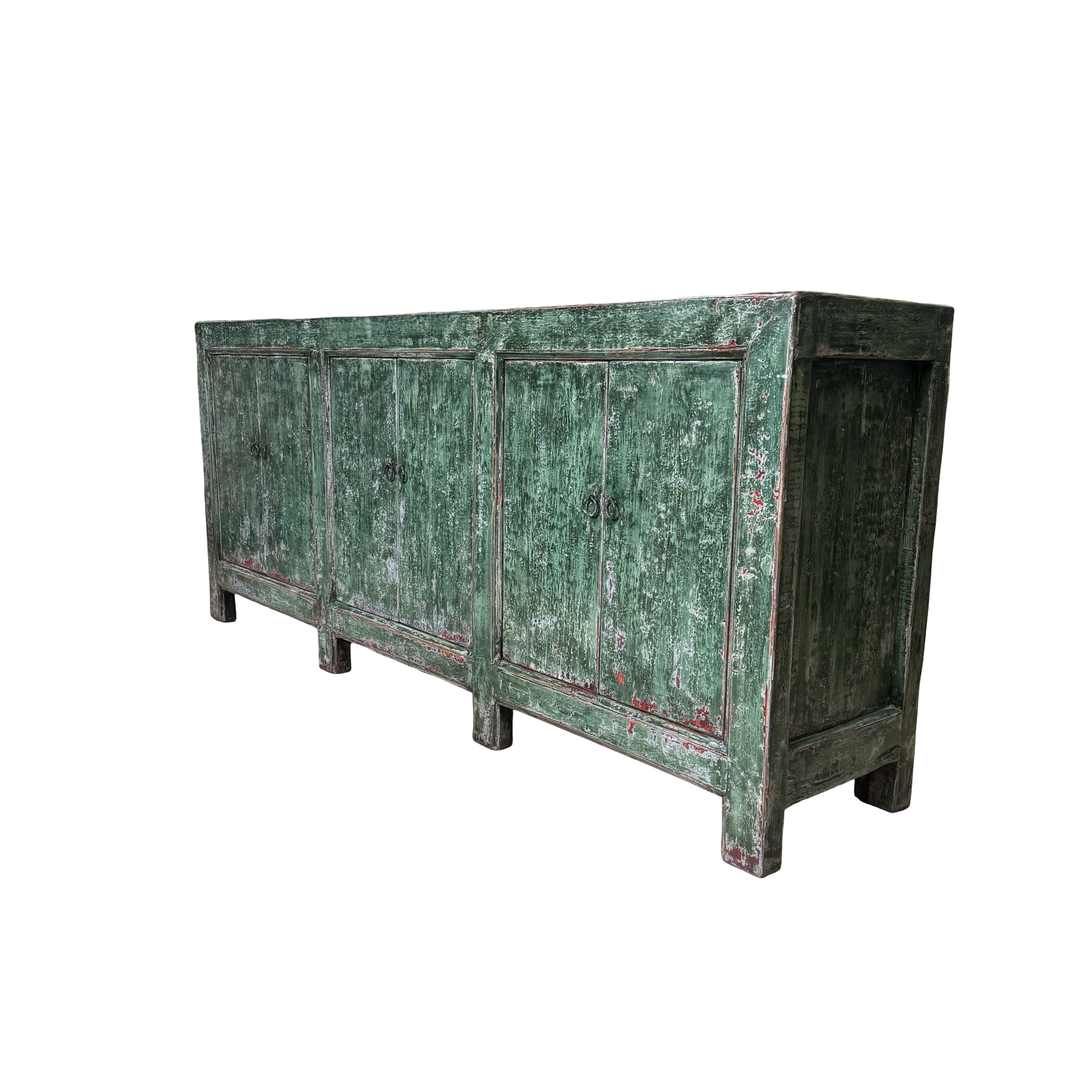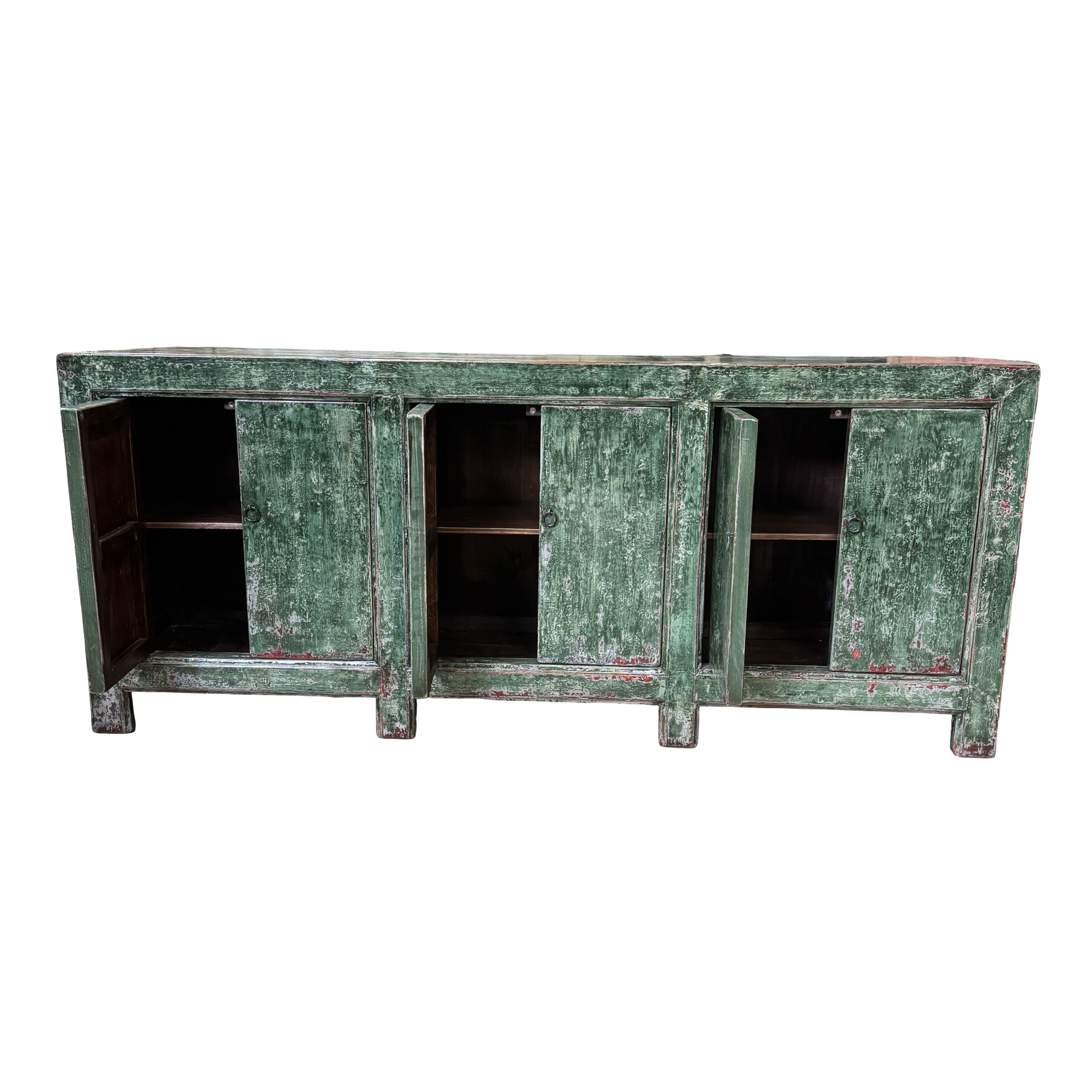 Dit unieke dressoir uit China is handgemaakt en uitgevoerd in een karaktervolle groene lakafwerking. Met zes deuren biedt het meubel royale opbergruimte, terwijl de lange, evenwichtige vorm zorgt voor een rustige en krachtige uitstraling.