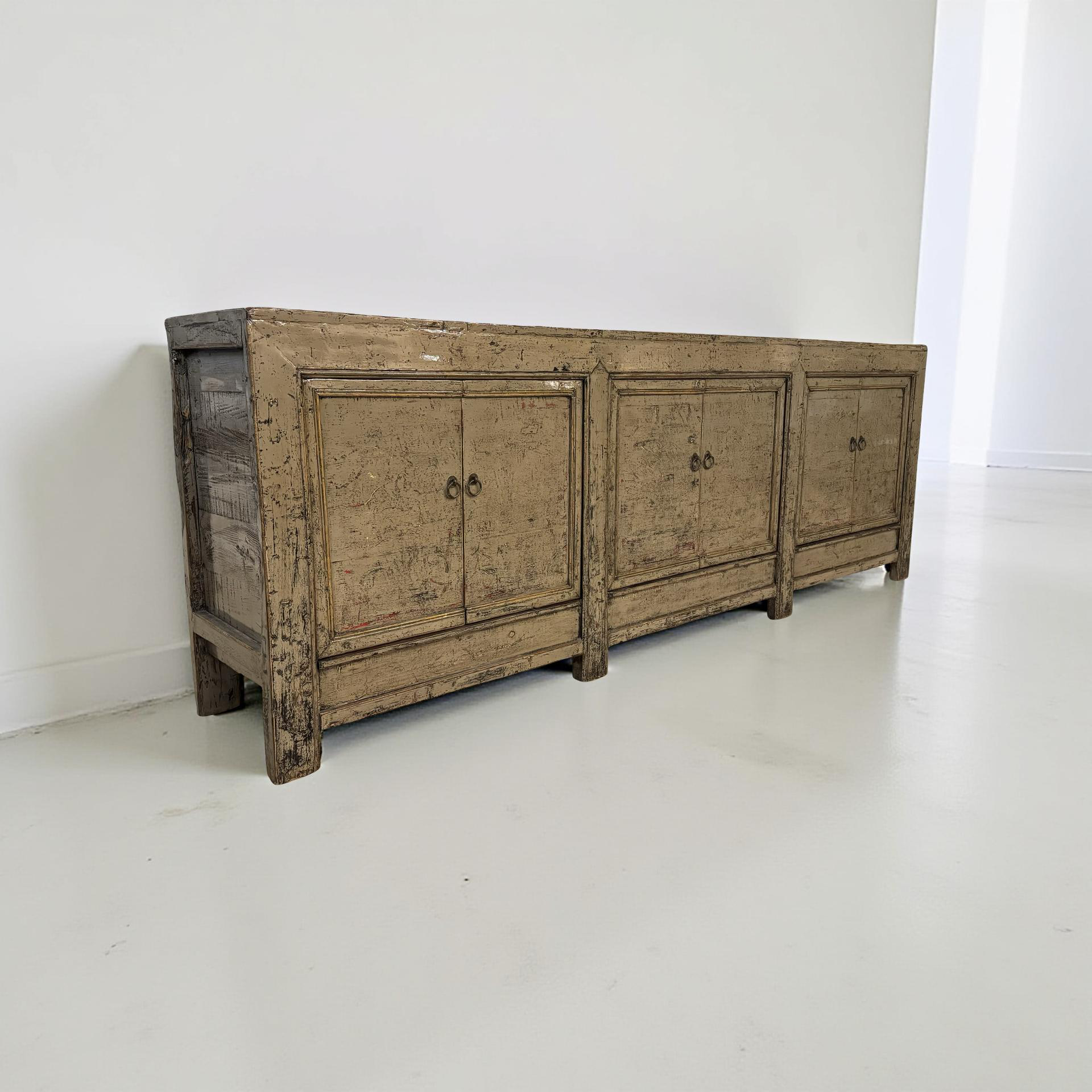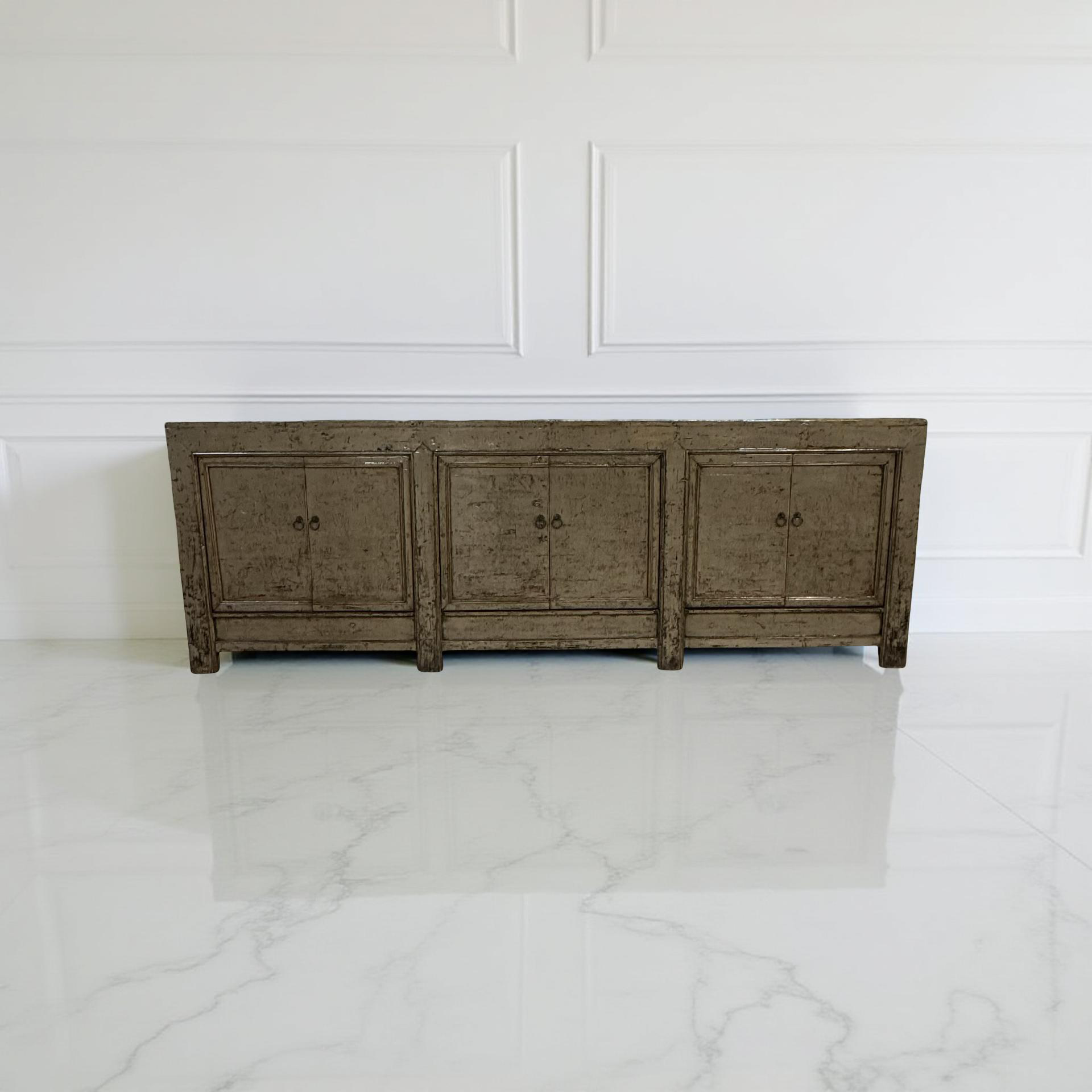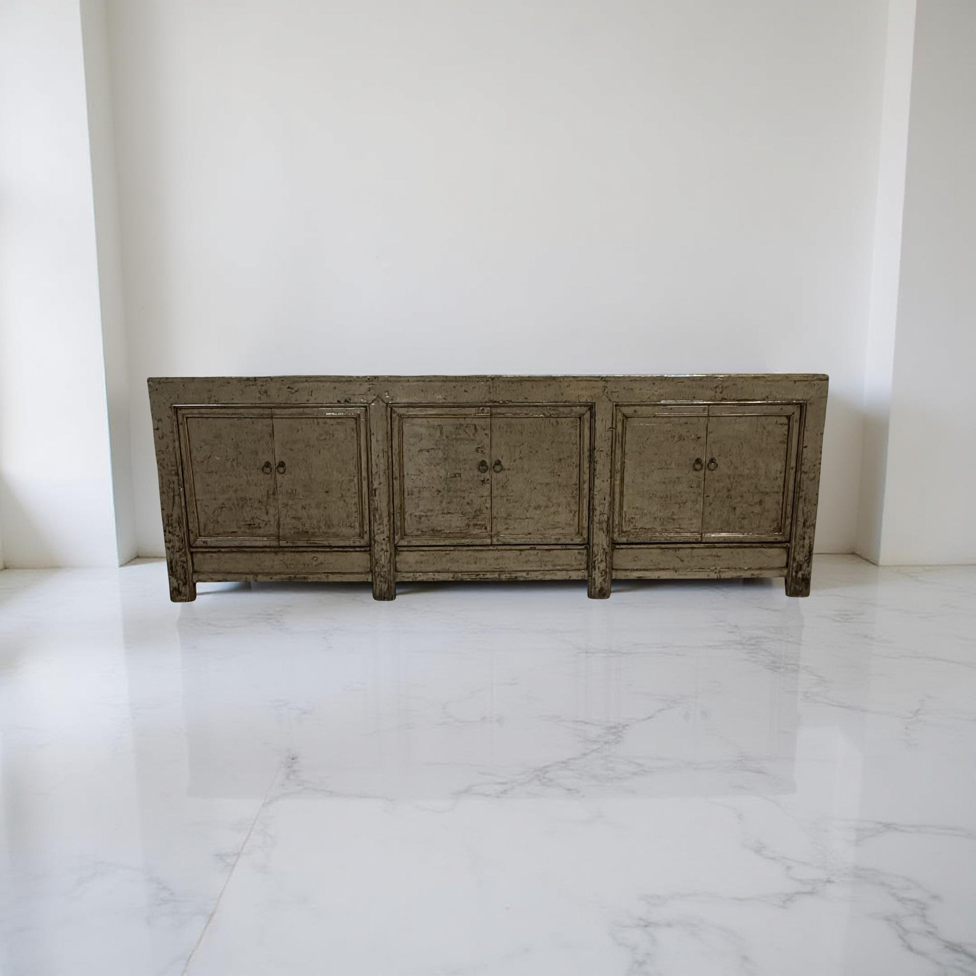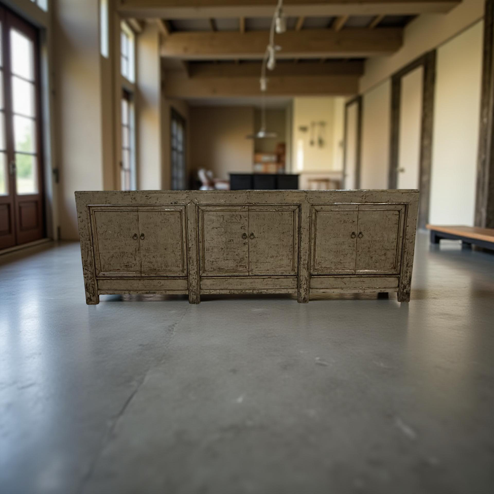 Dit unieke dressoir uit China is met de hand vervaardigd uit massief hout en heeft een ingetogen olijfgroene finish. De zes deuren bieden royale opbergruimte, terwijl de rustige kleur en strakke belijning zorgen voor een tijdloze, sobere uitstraling.