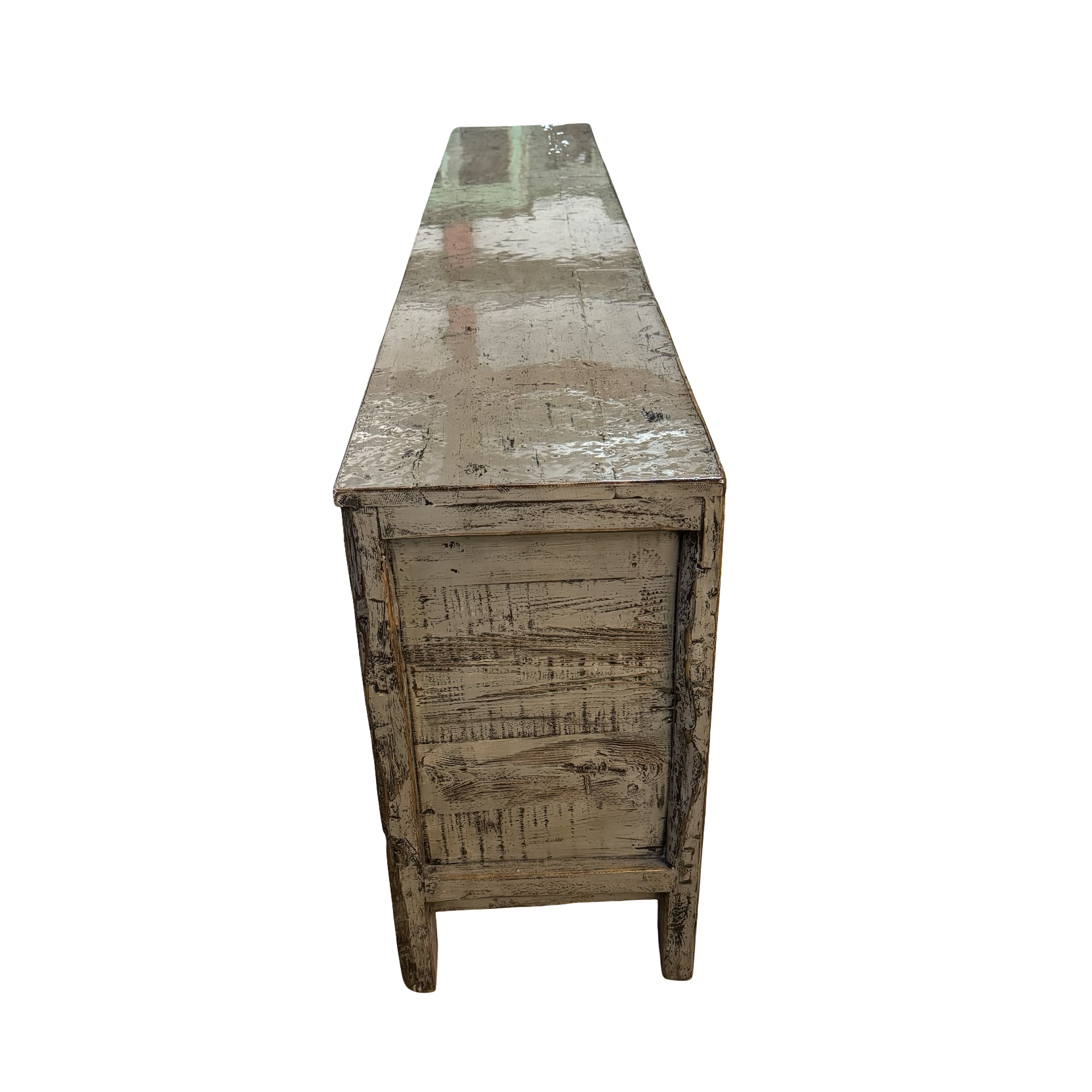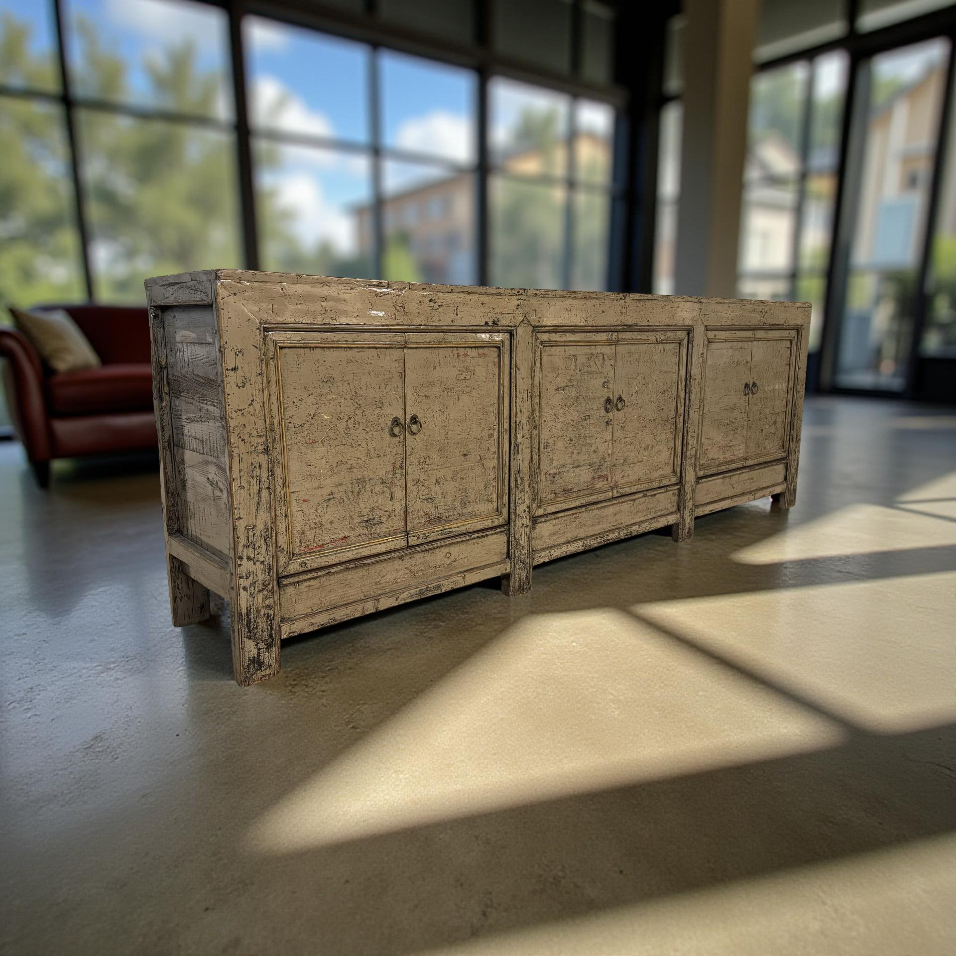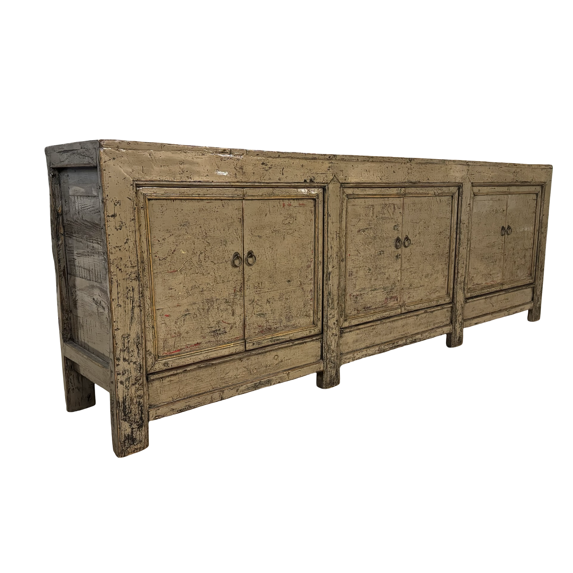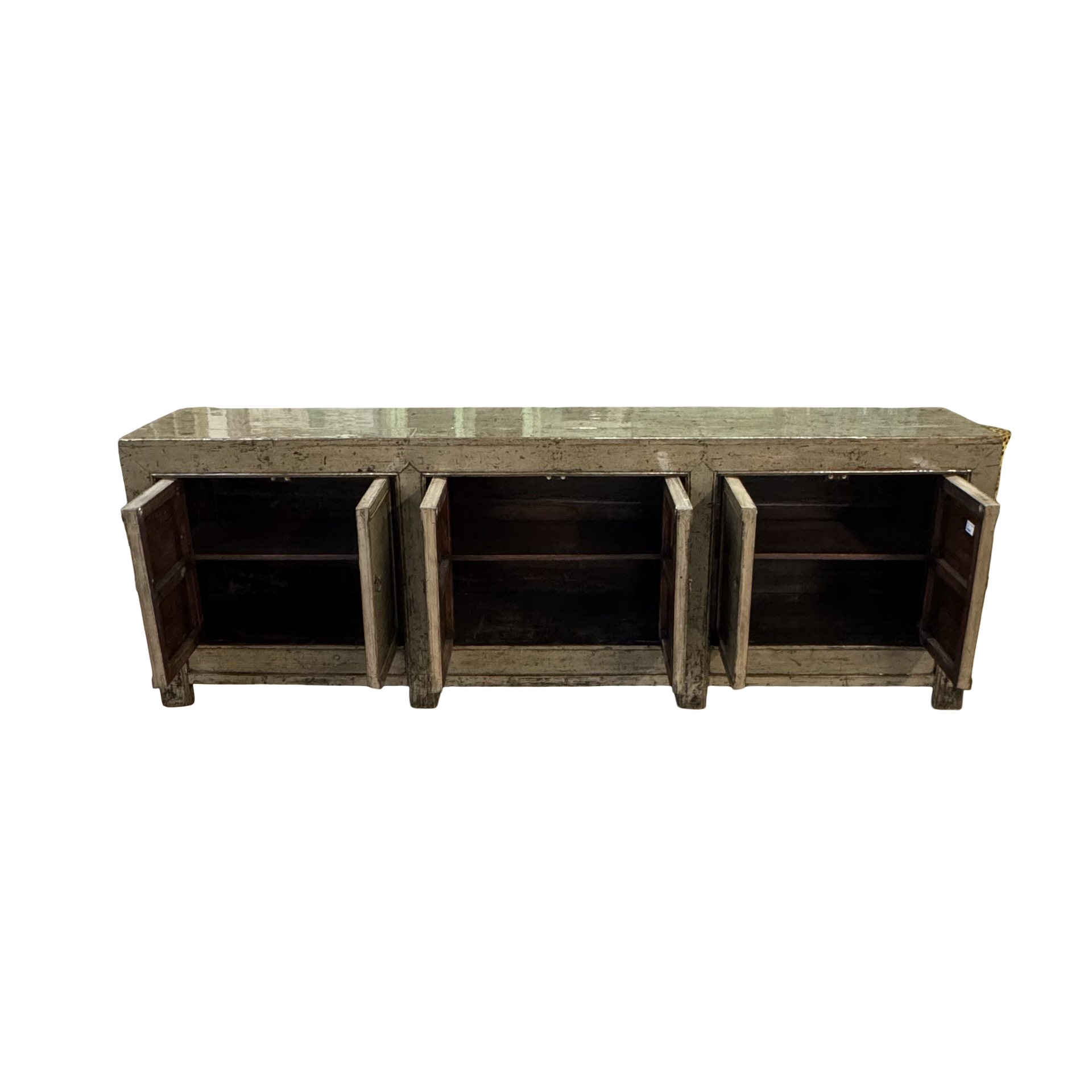 Dit unieke dressoir uit China is met de hand vervaardigd uit massief hout en heeft een ingetogen olijfgroene finish. De zes deuren bieden royale opbergruimte, terwijl de rustige kleur en strakke belijning zorgen voor een tijdloze, sobere uitstraling.