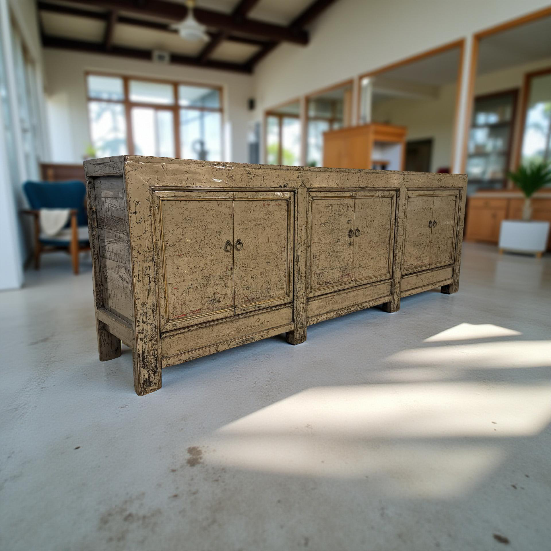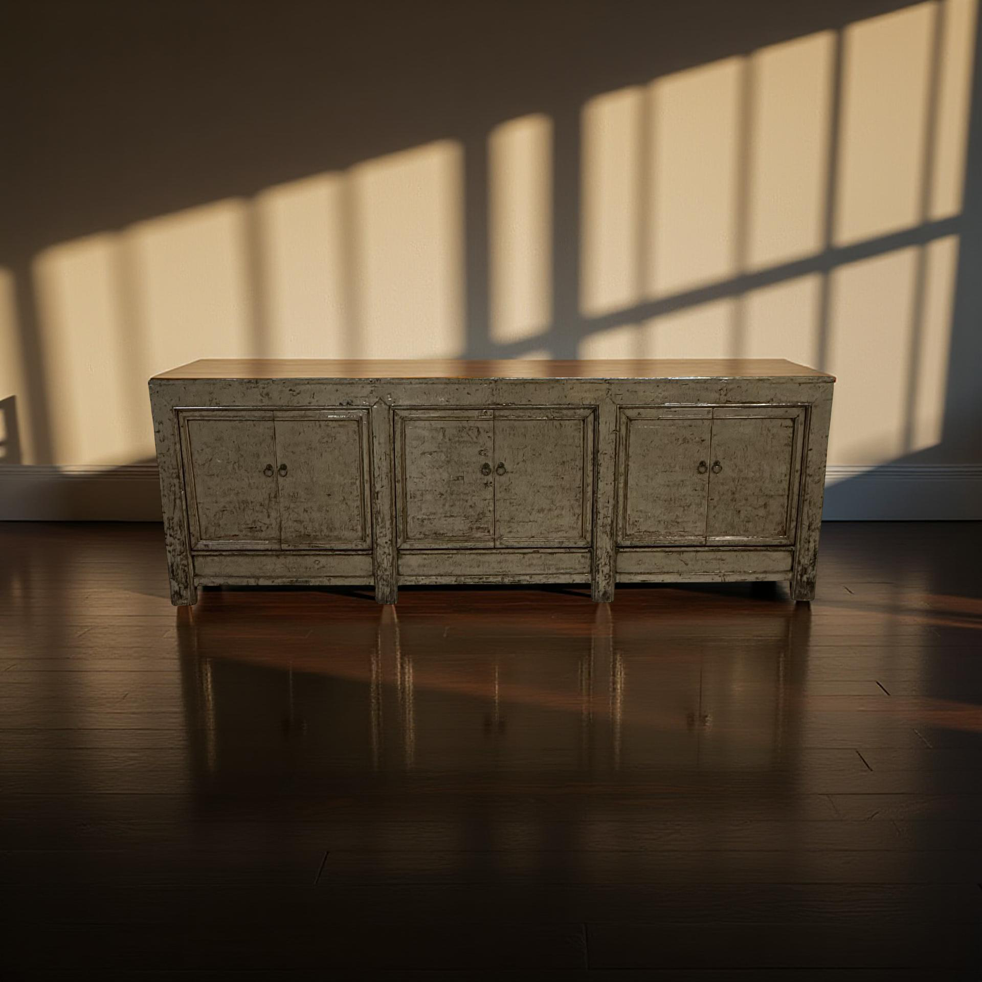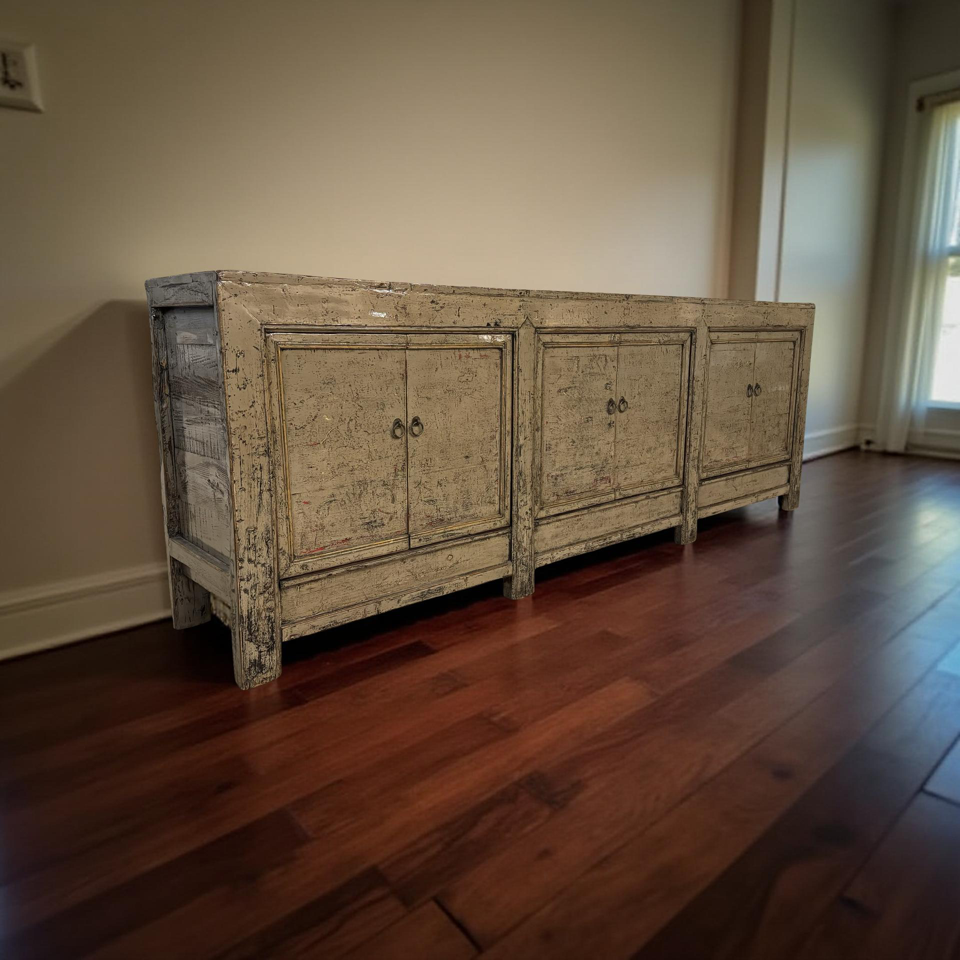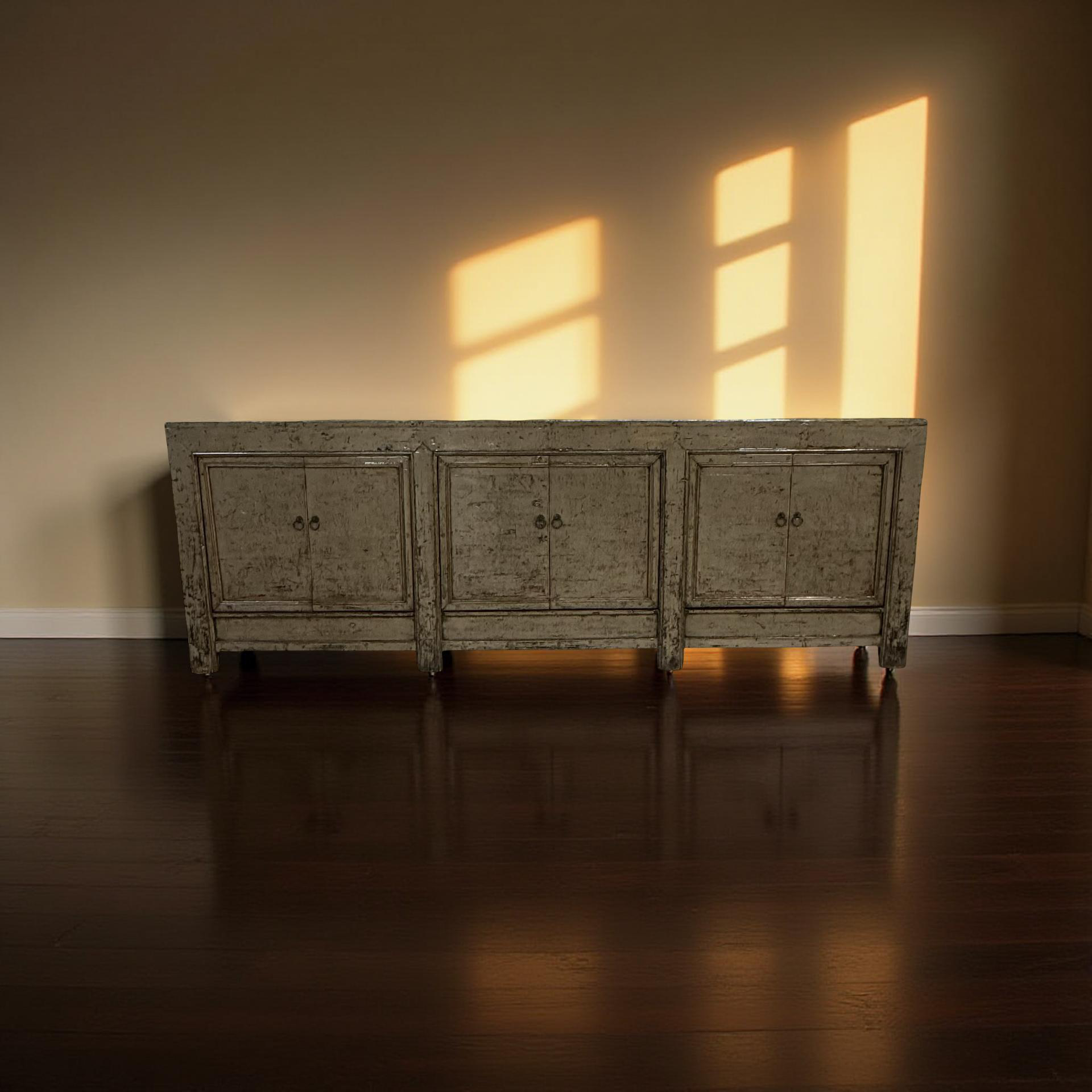Dit unieke dressoir uit China is met de hand vervaardigd uit massief hout en heeft een ingetogen olijfgroene finish. De zes deuren bieden royale opbergruimte, terwijl de rustige kleur en strakke belijning zorgen voor een tijdloze, sobere uitstraling.