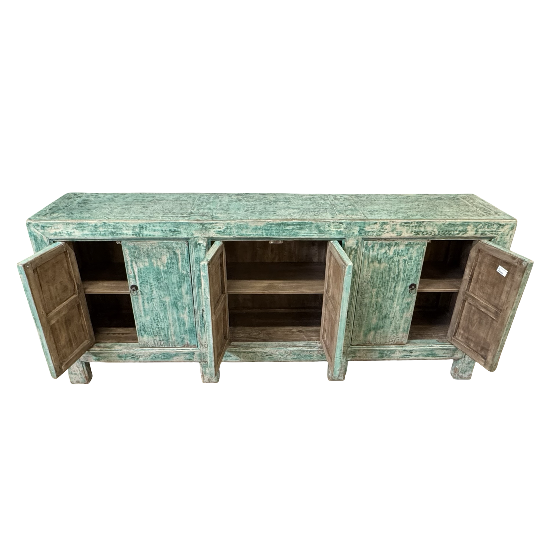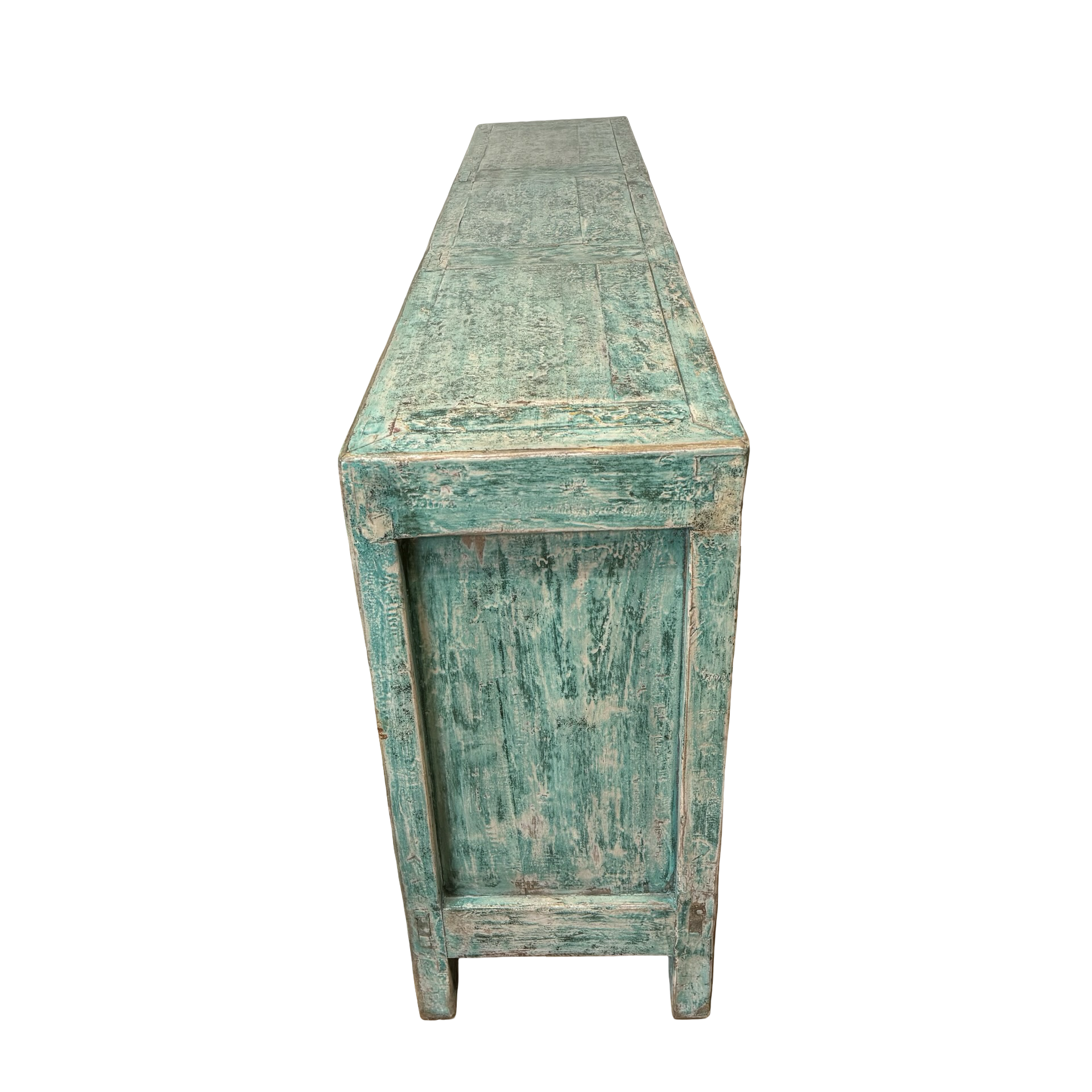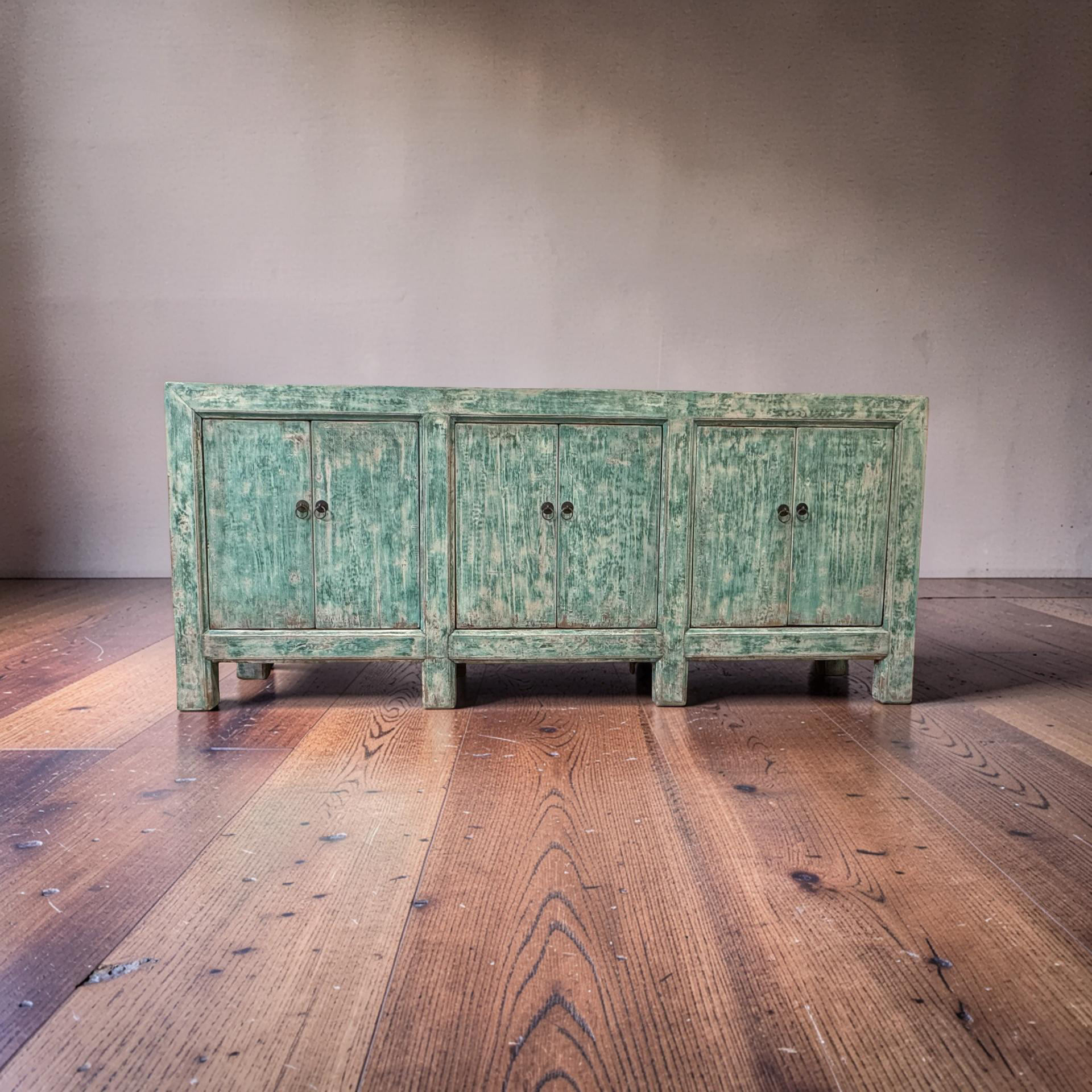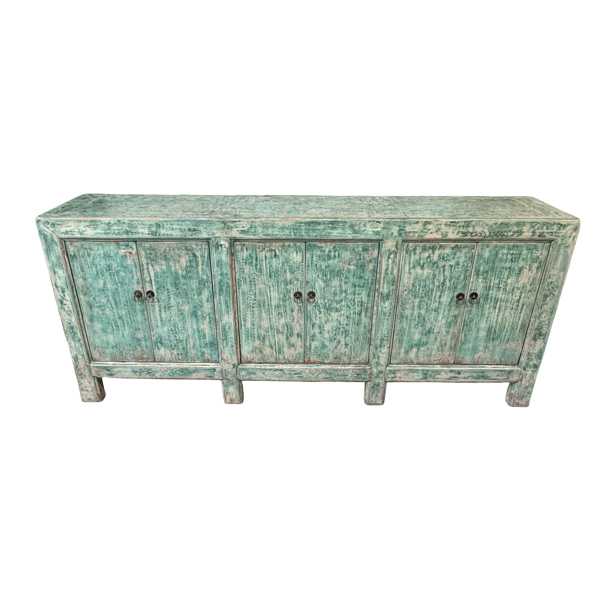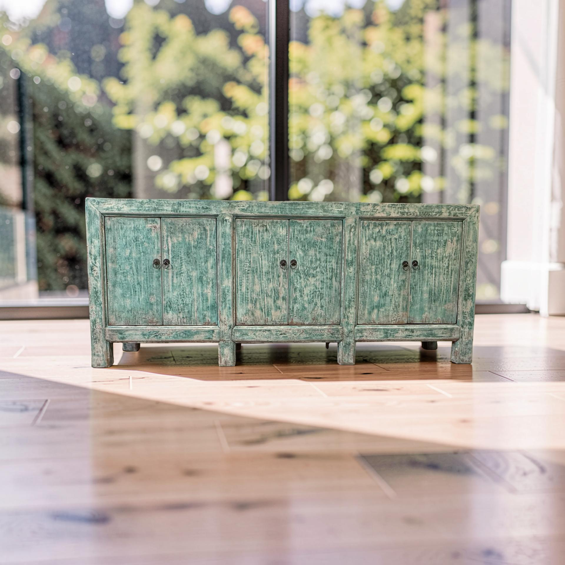 Dit unieke dressoir uit China is een handgemaakt meubel met een levendige turquoise afwerking. Met zes deuren biedt het ruime opbergmogelijkheden, terwijl de lange, lage vorm zorgt voor een krachtig en evenwichtig silhouet.