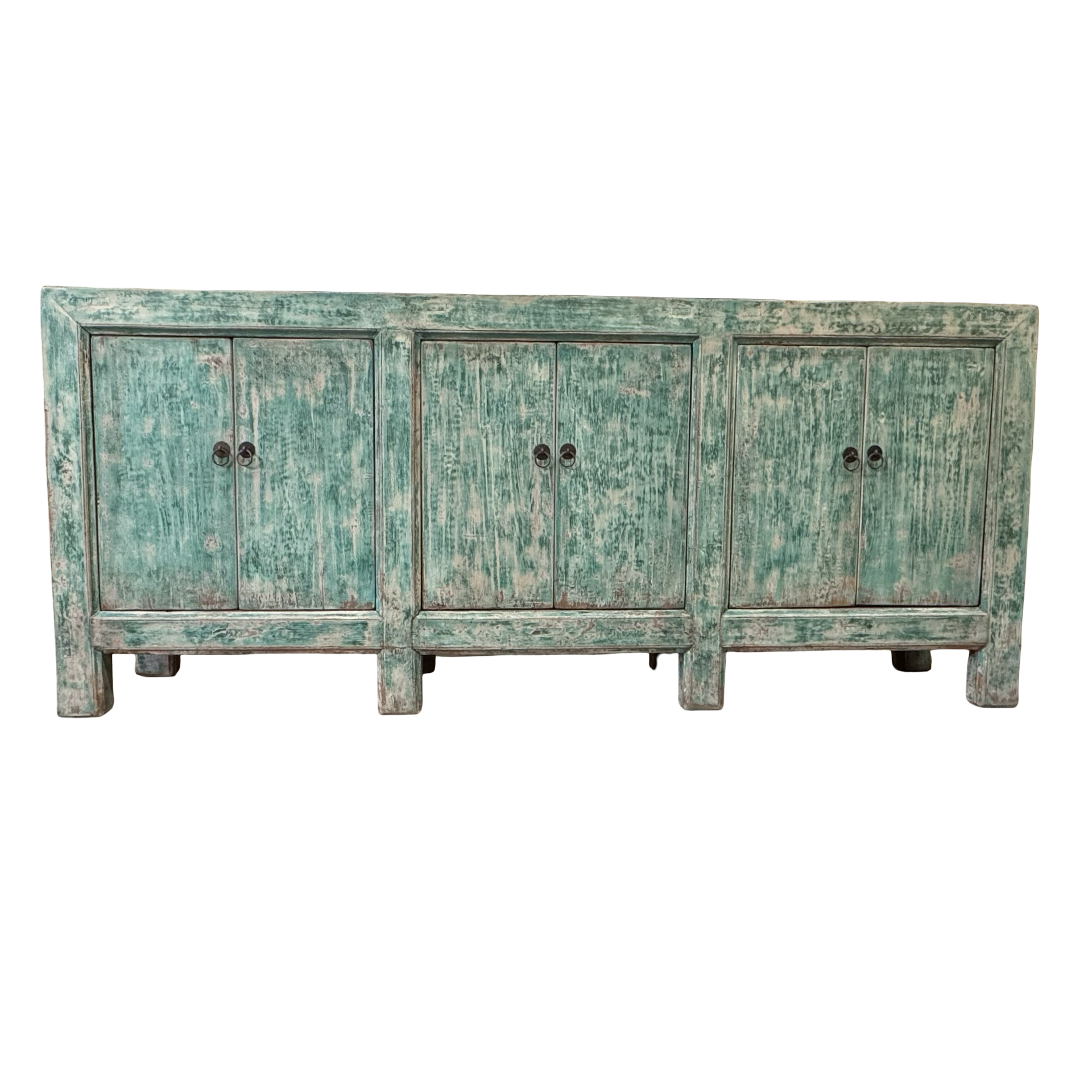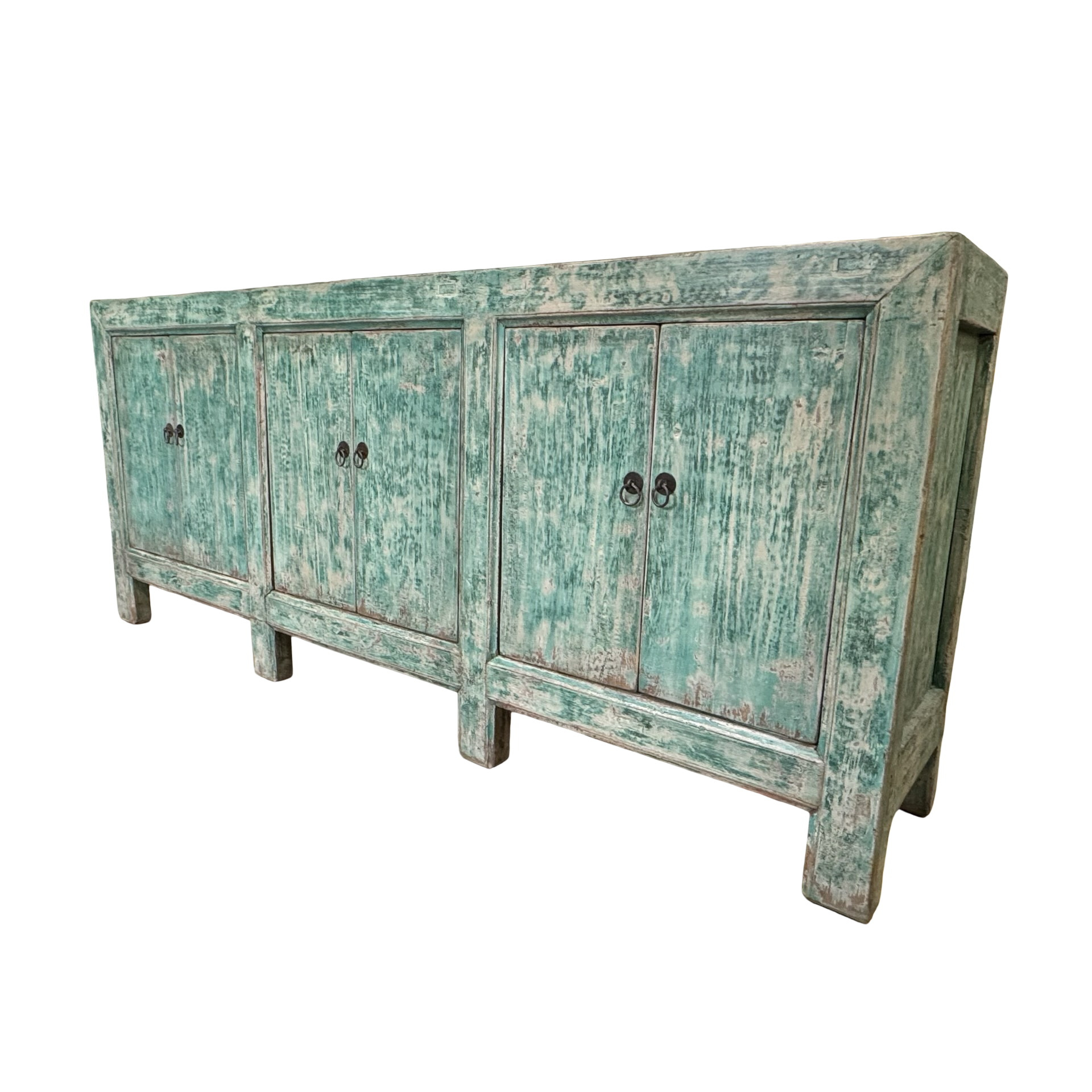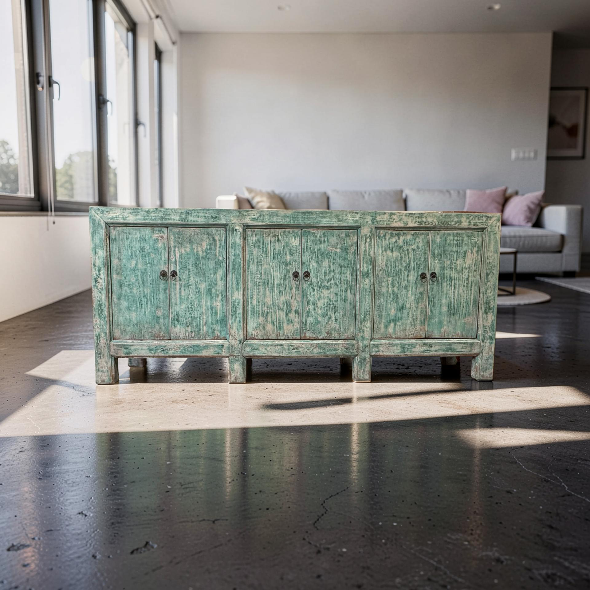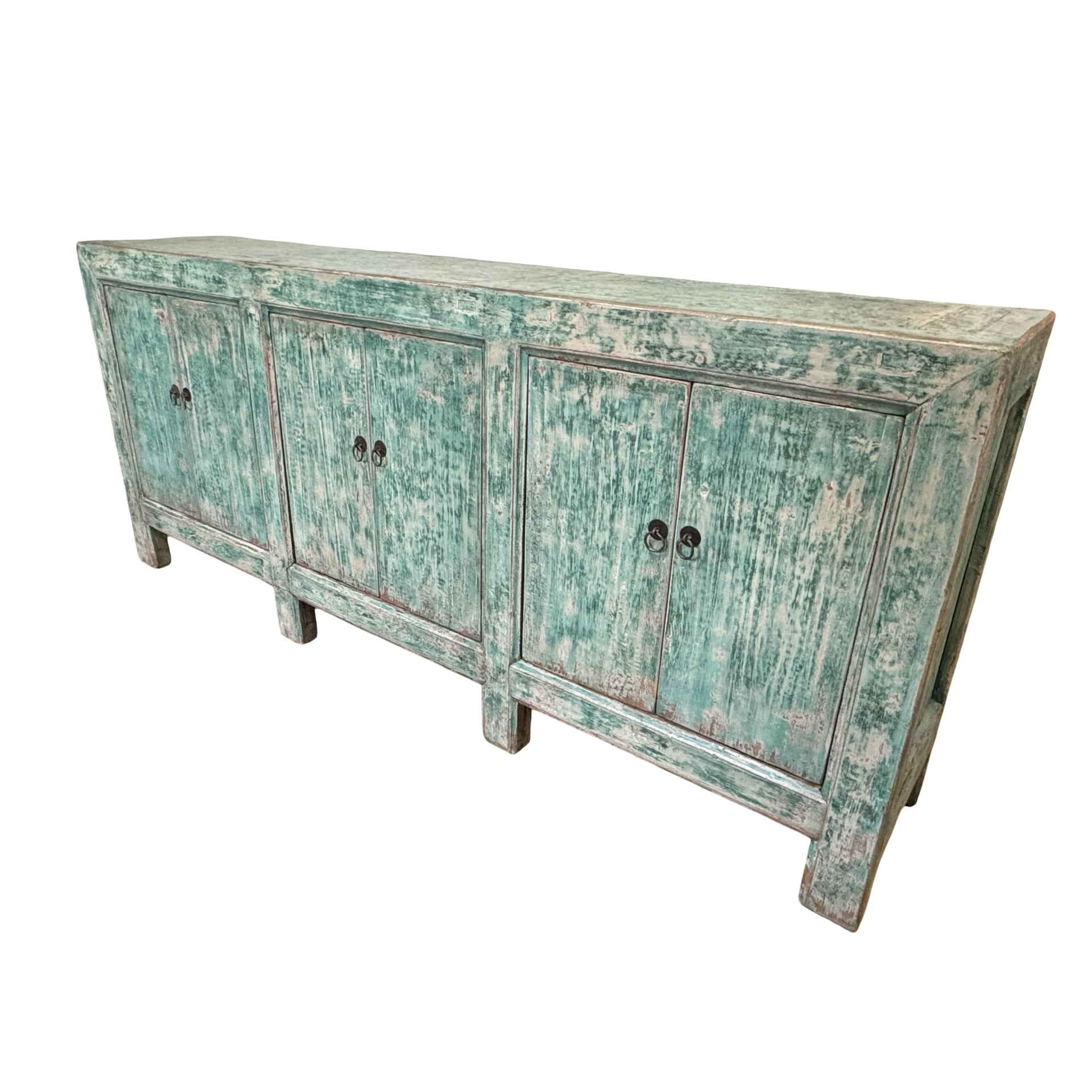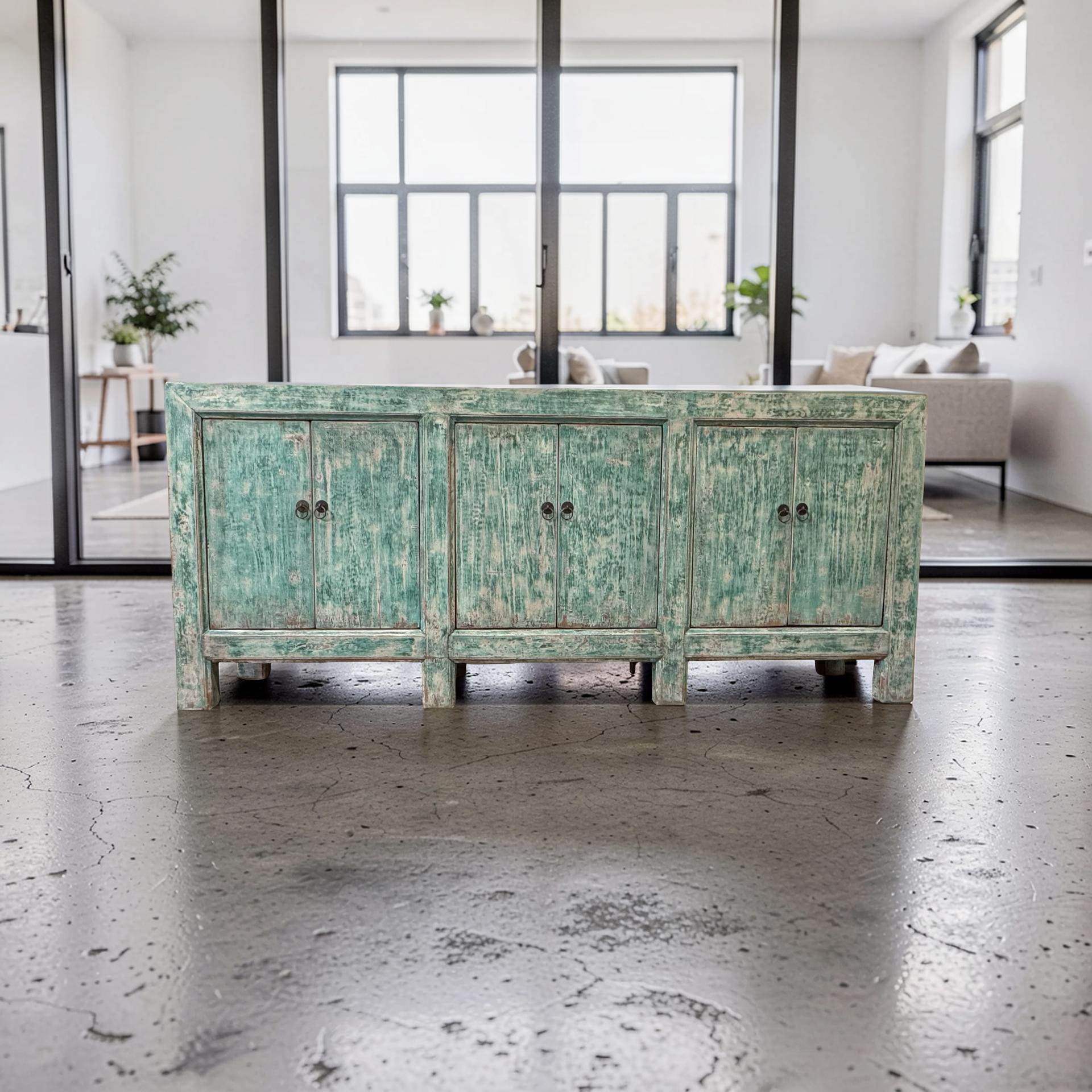 Dit unieke dressoir uit China is een handgemaakt meubel met een levendige turquoise afwerking. Met zes deuren biedt het ruime opbergmogelijkheden, terwijl de lange, lage vorm zorgt voor een krachtig en evenwichtig silhouet.