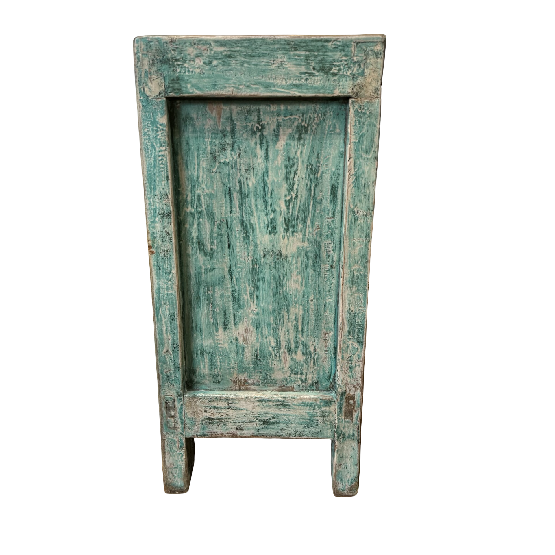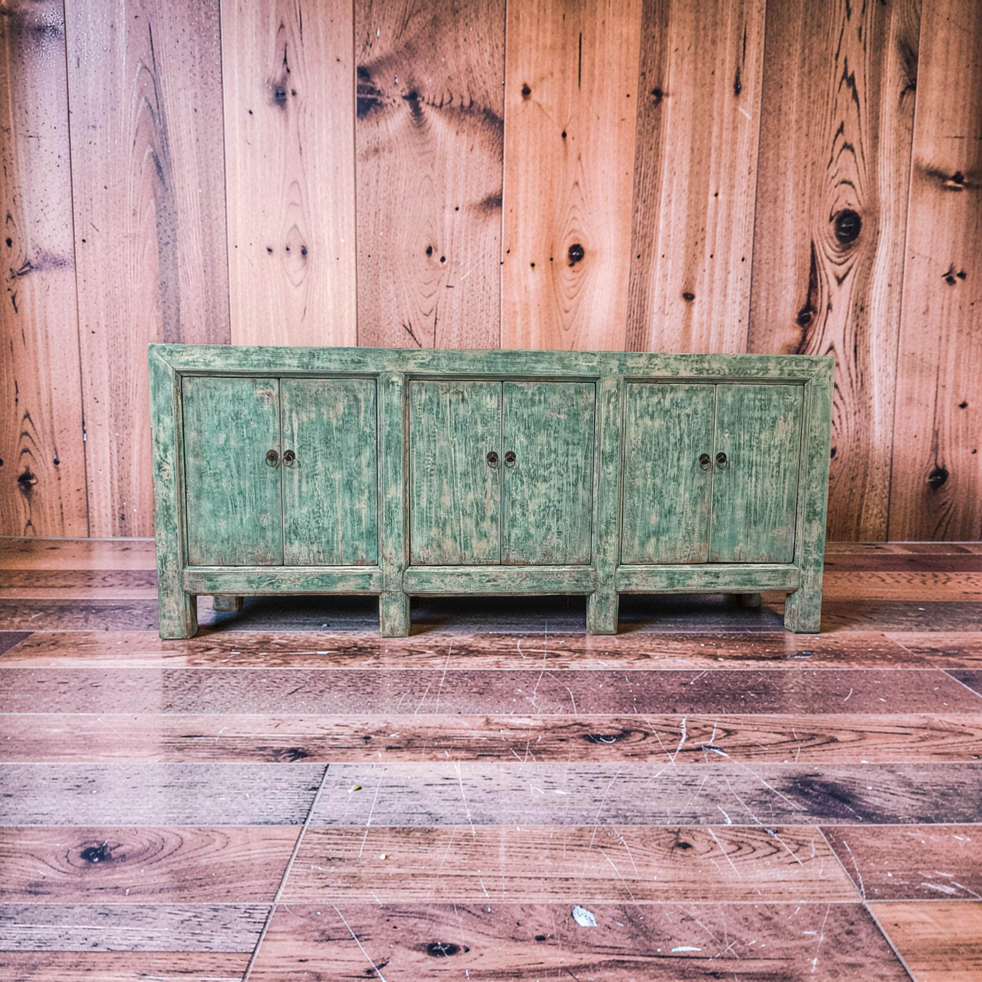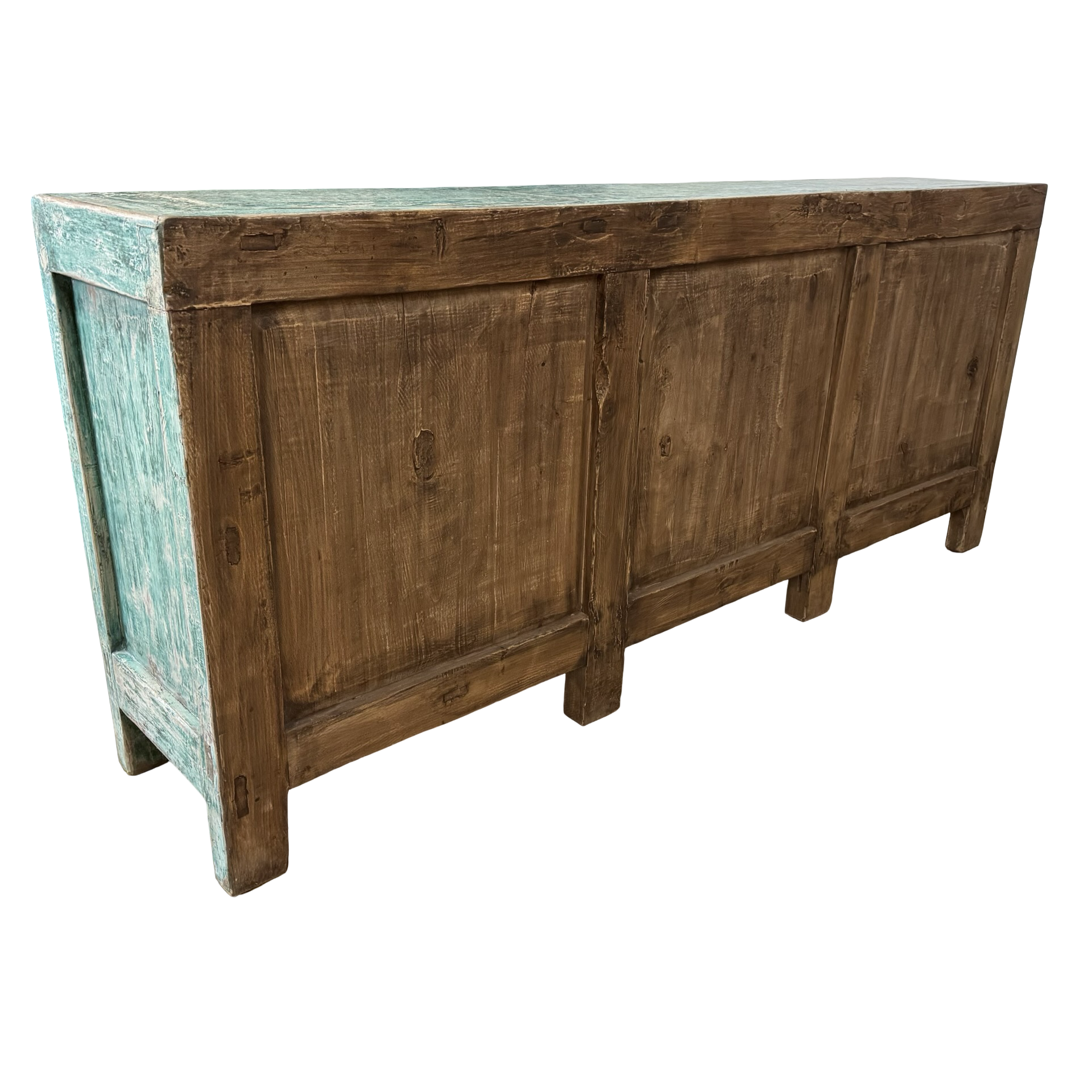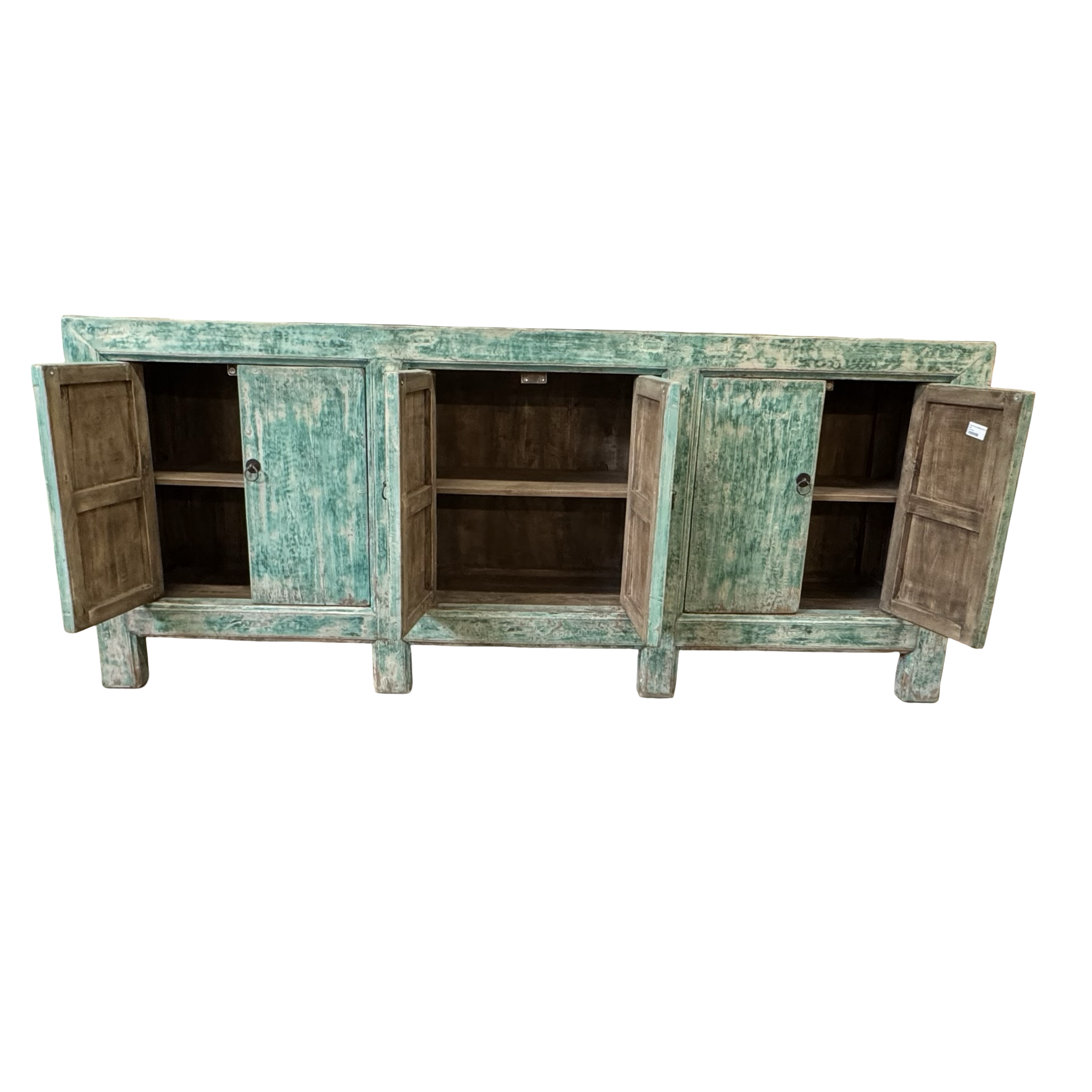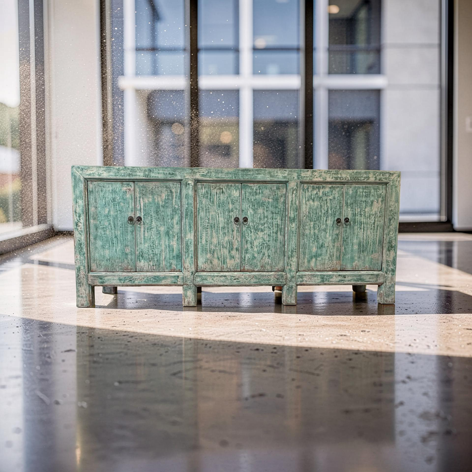 Dit unieke dressoir uit China is een handgemaakt meubel met een levendige turquoise afwerking. Met zes deuren biedt het ruime opbergmogelijkheden, terwijl de lange, lage vorm zorgt voor een krachtig en evenwichtig silhouet.