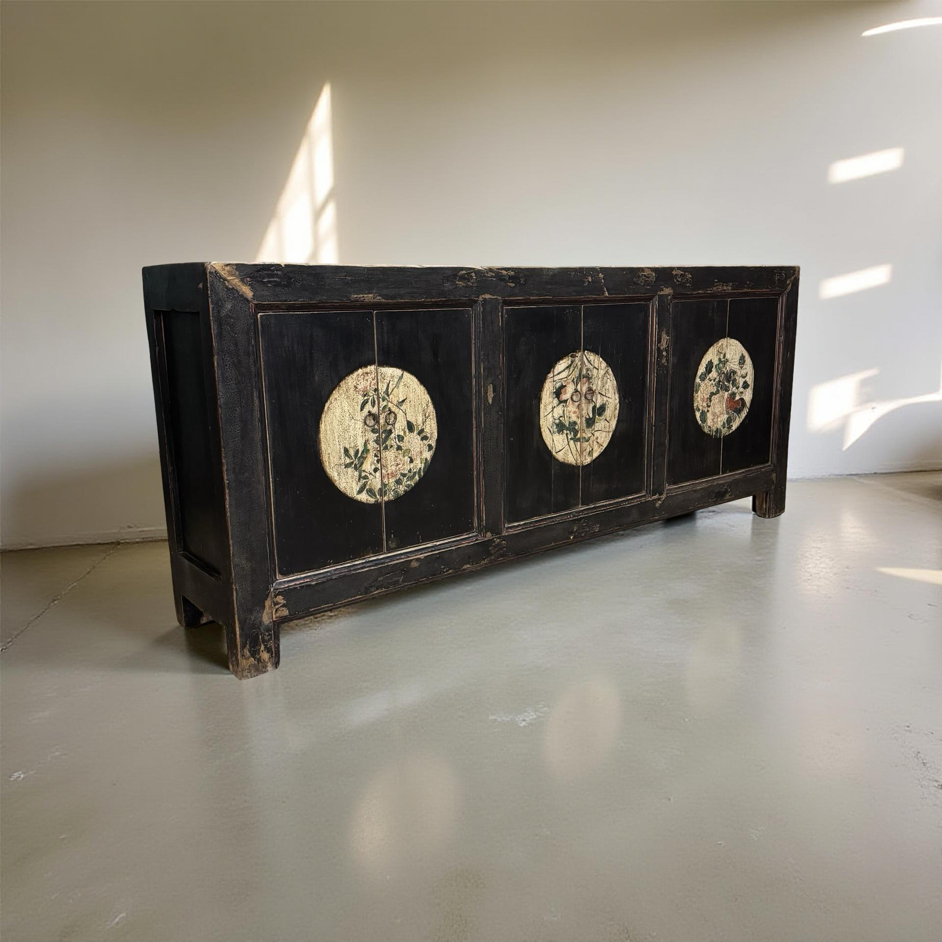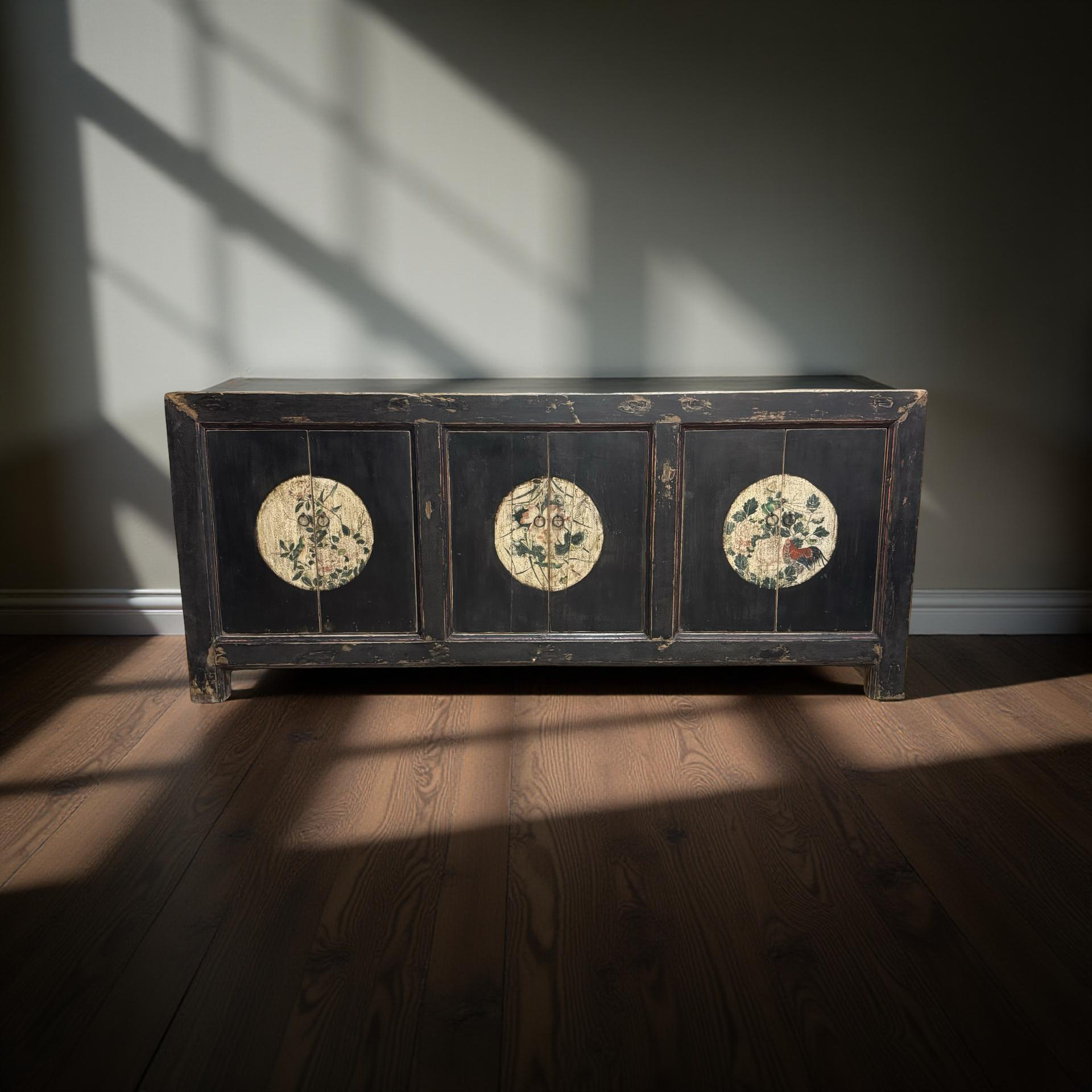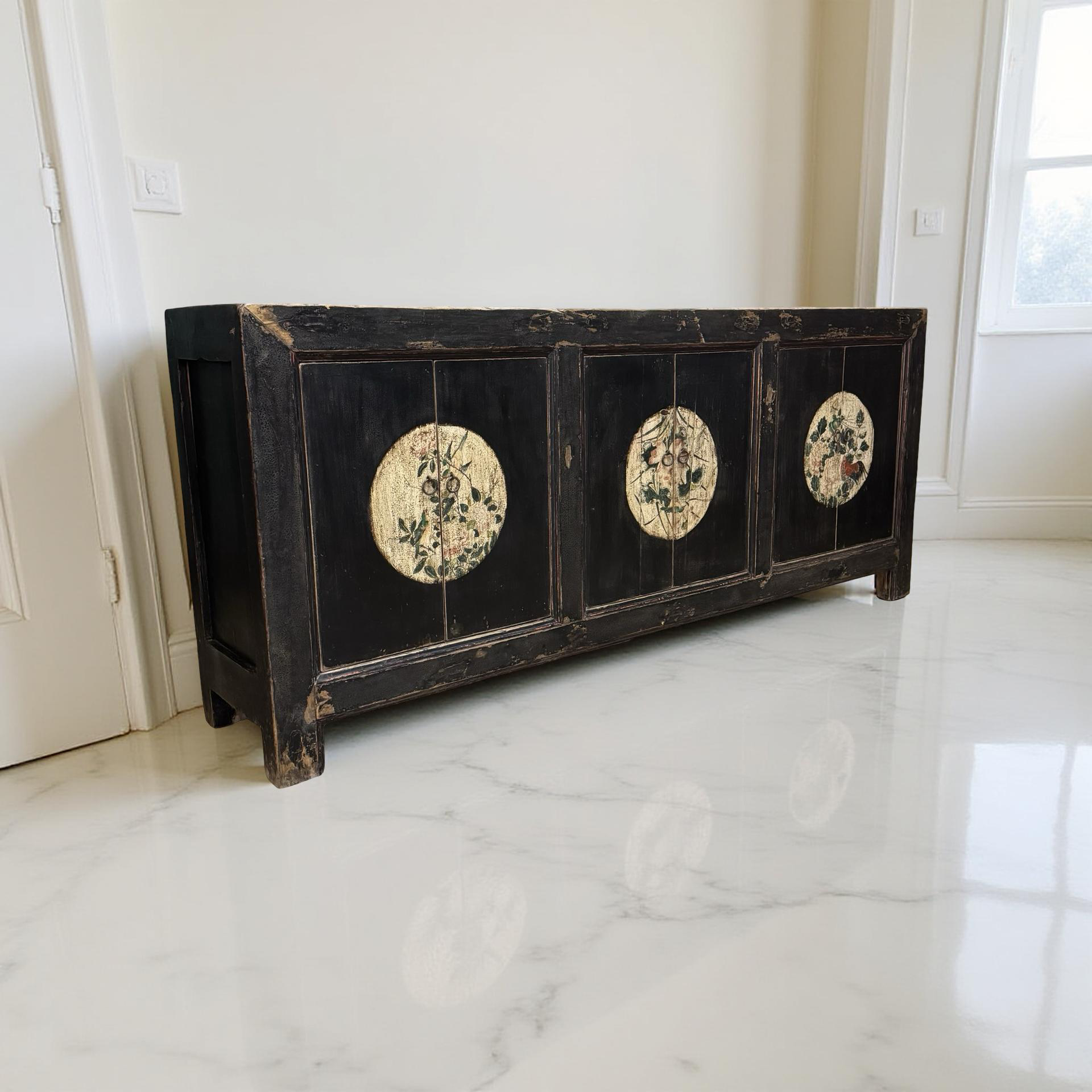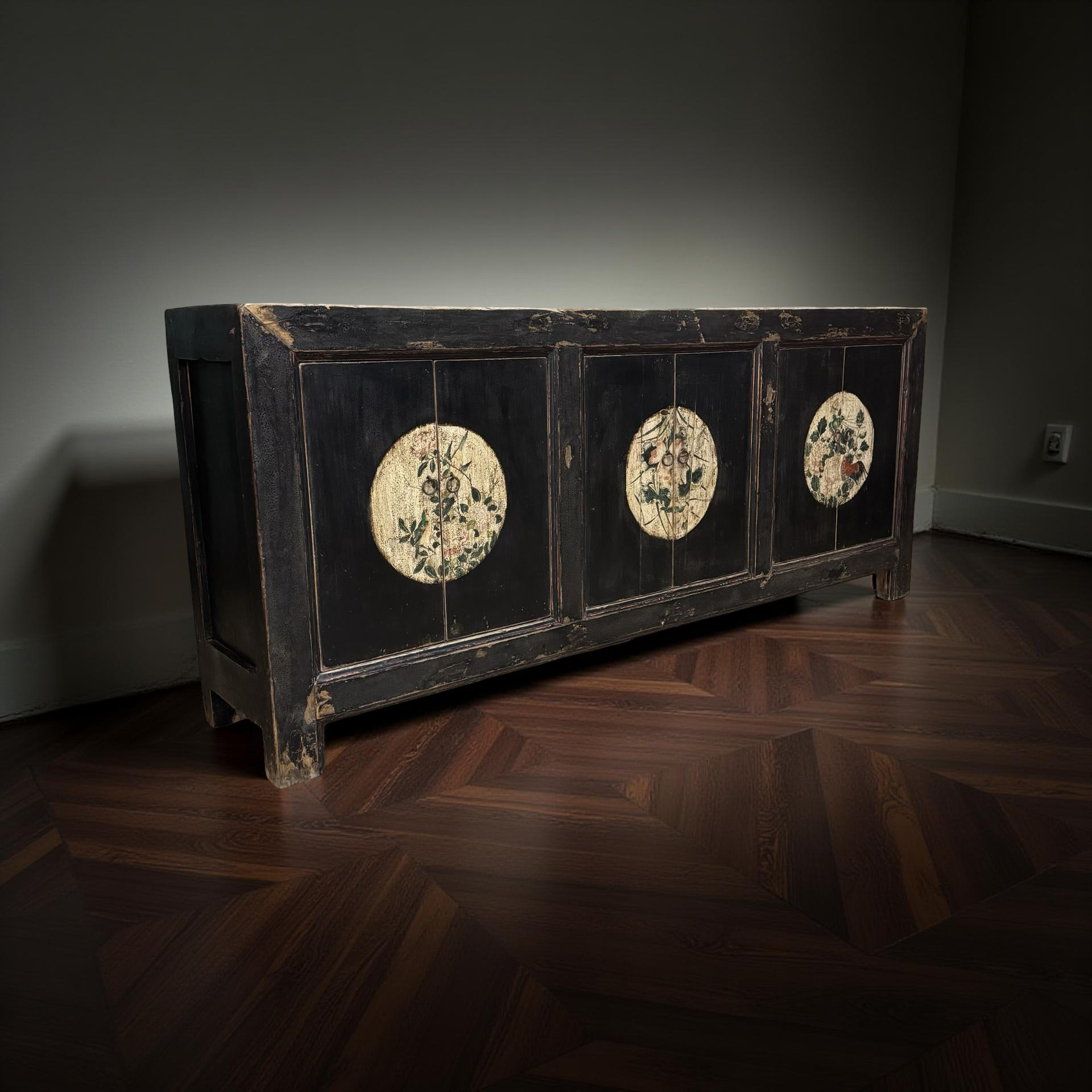 Dit unieke, handgemaakte dressoir uit China is uitgevoerd in een rustige zwarte tint, waardoor de verfijnde beschilderingen op het midden van de deuren subtiel naar voren komen. Het houten meubel ademt traditioneel vakmanschap, met zorg aangebrachte details die diepte en karakter geven.