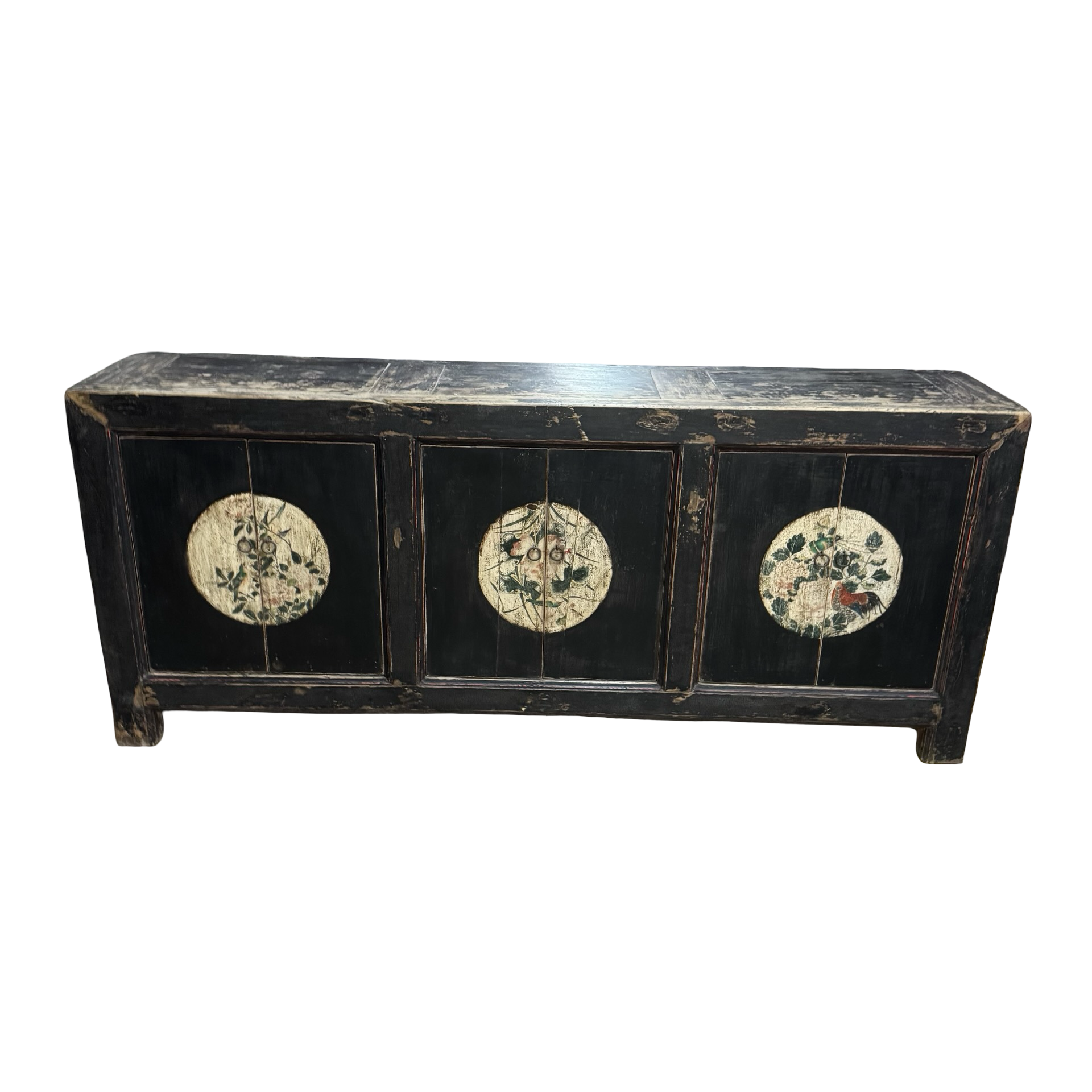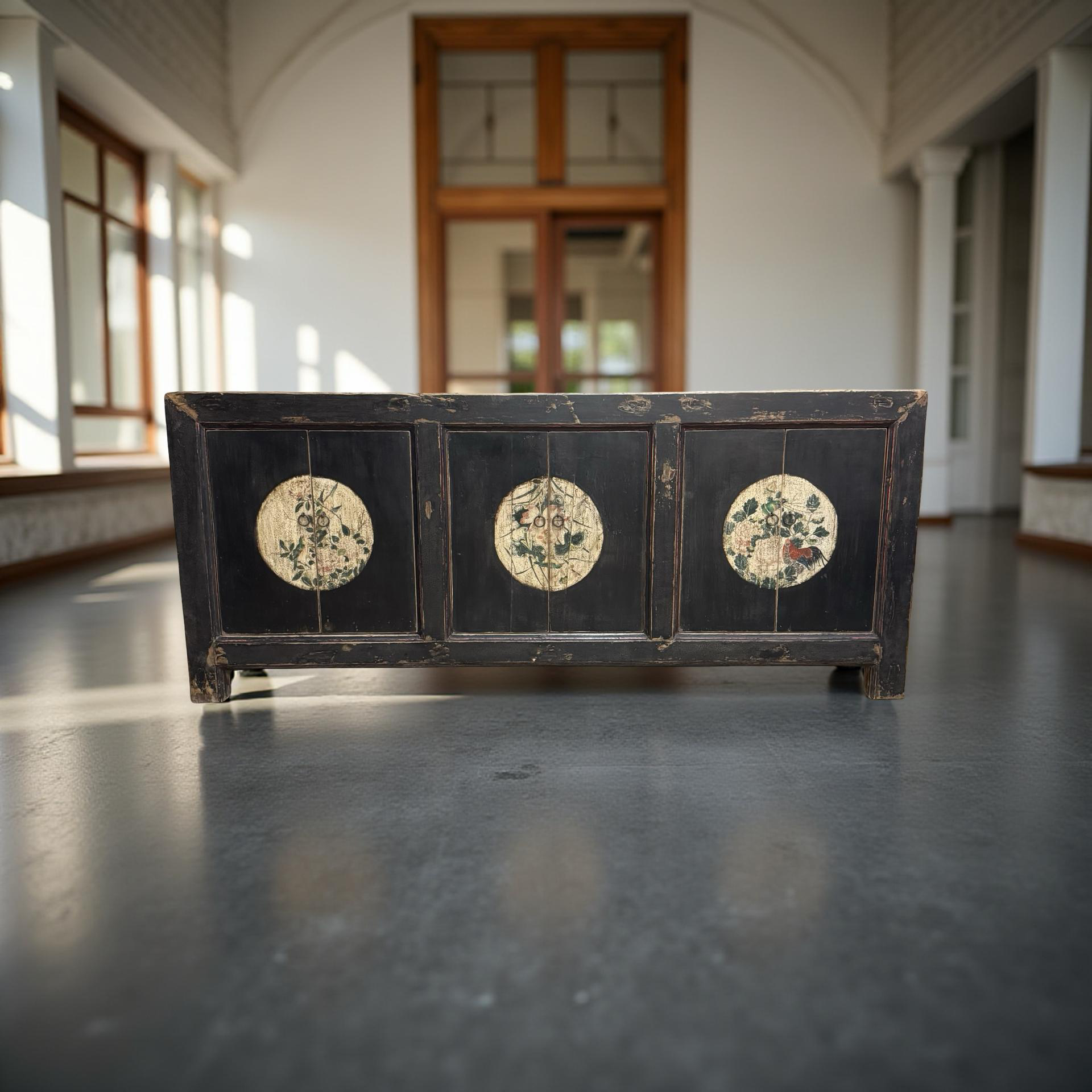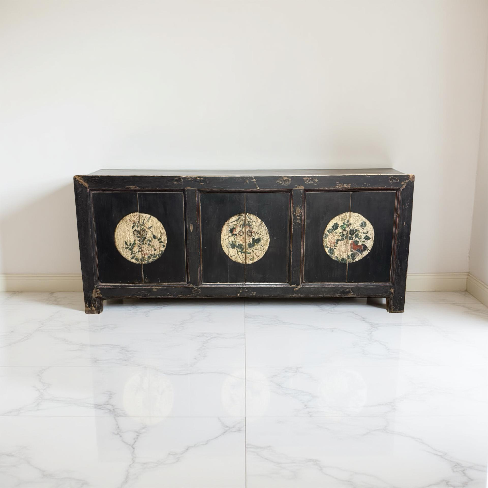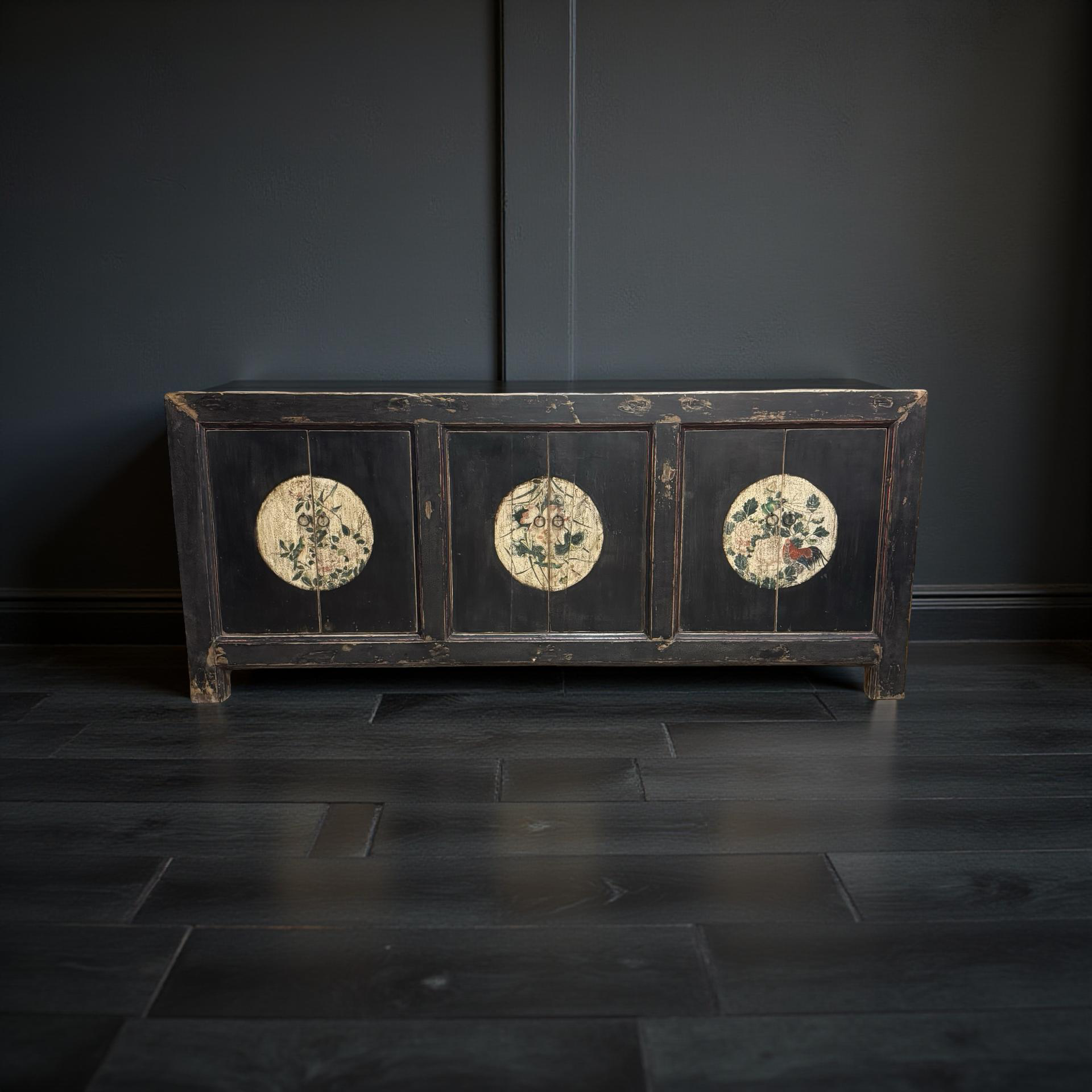 Dit unieke, handgemaakte dressoir uit China is uitgevoerd in een rustige zwarte tint, waardoor de verfijnde beschilderingen op het midden van de deuren subtiel naar voren komen. Het houten meubel ademt traditioneel vakmanschap, met zorg aangebrachte details die diepte en karakter geven.