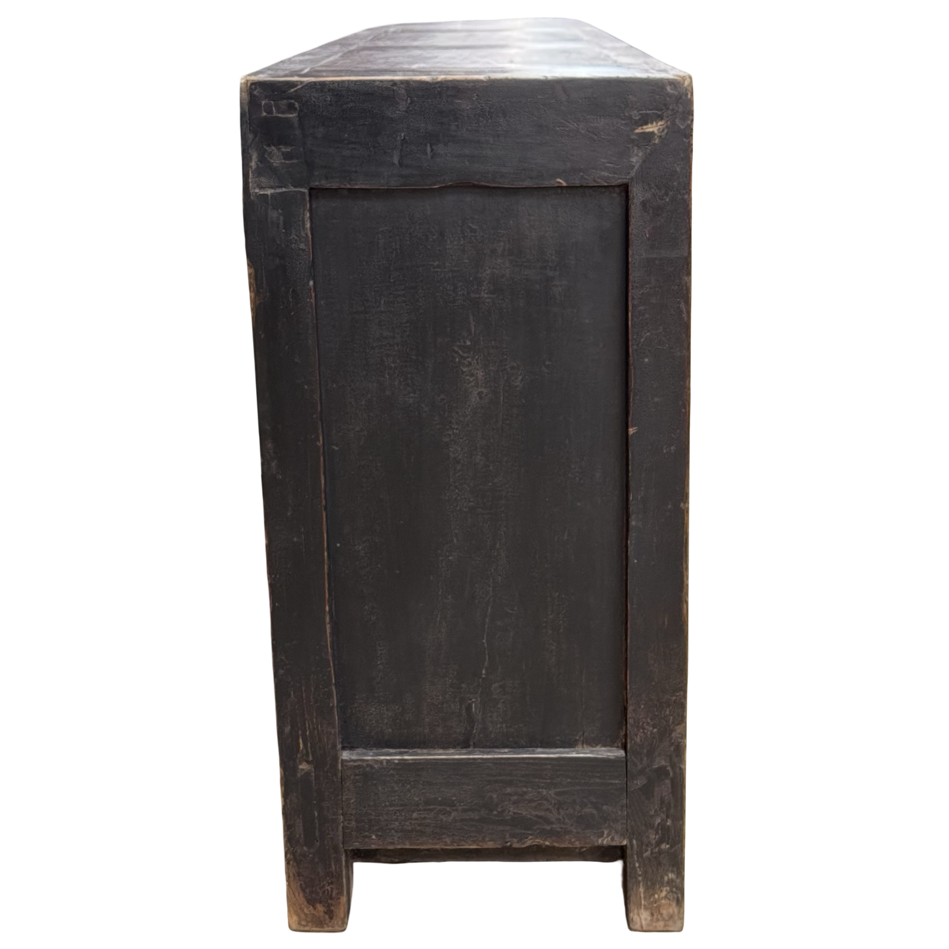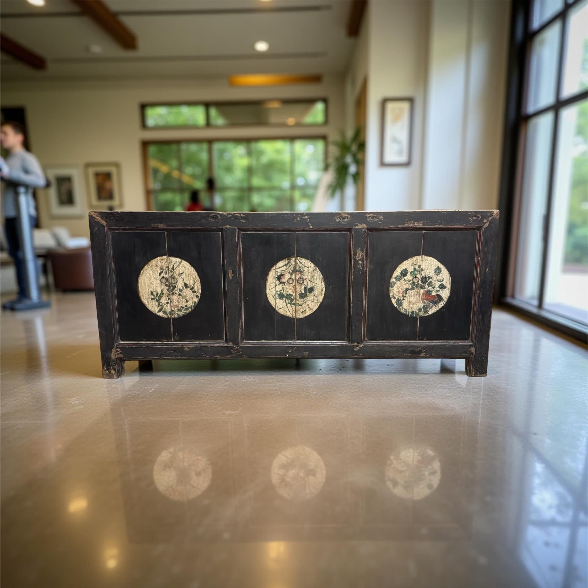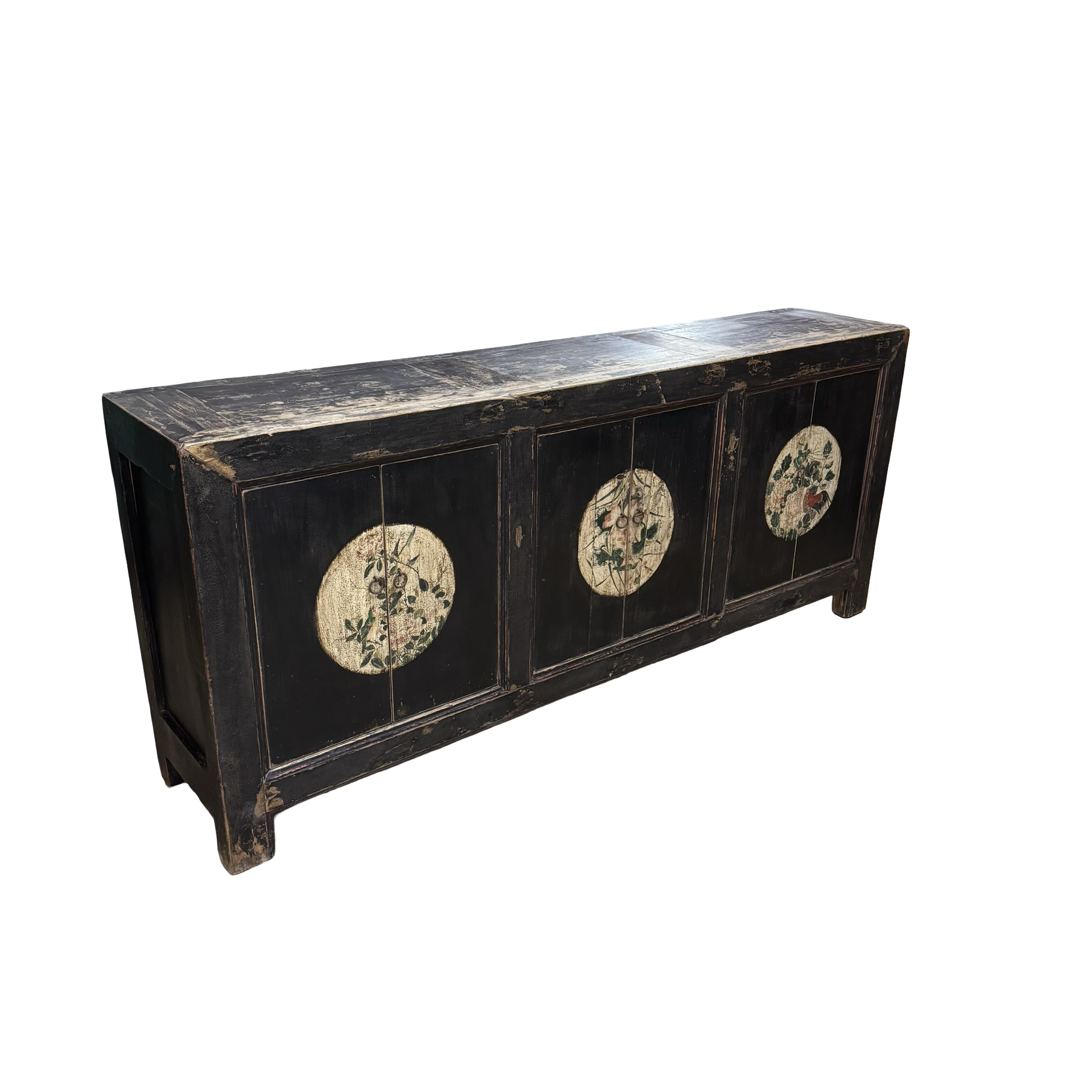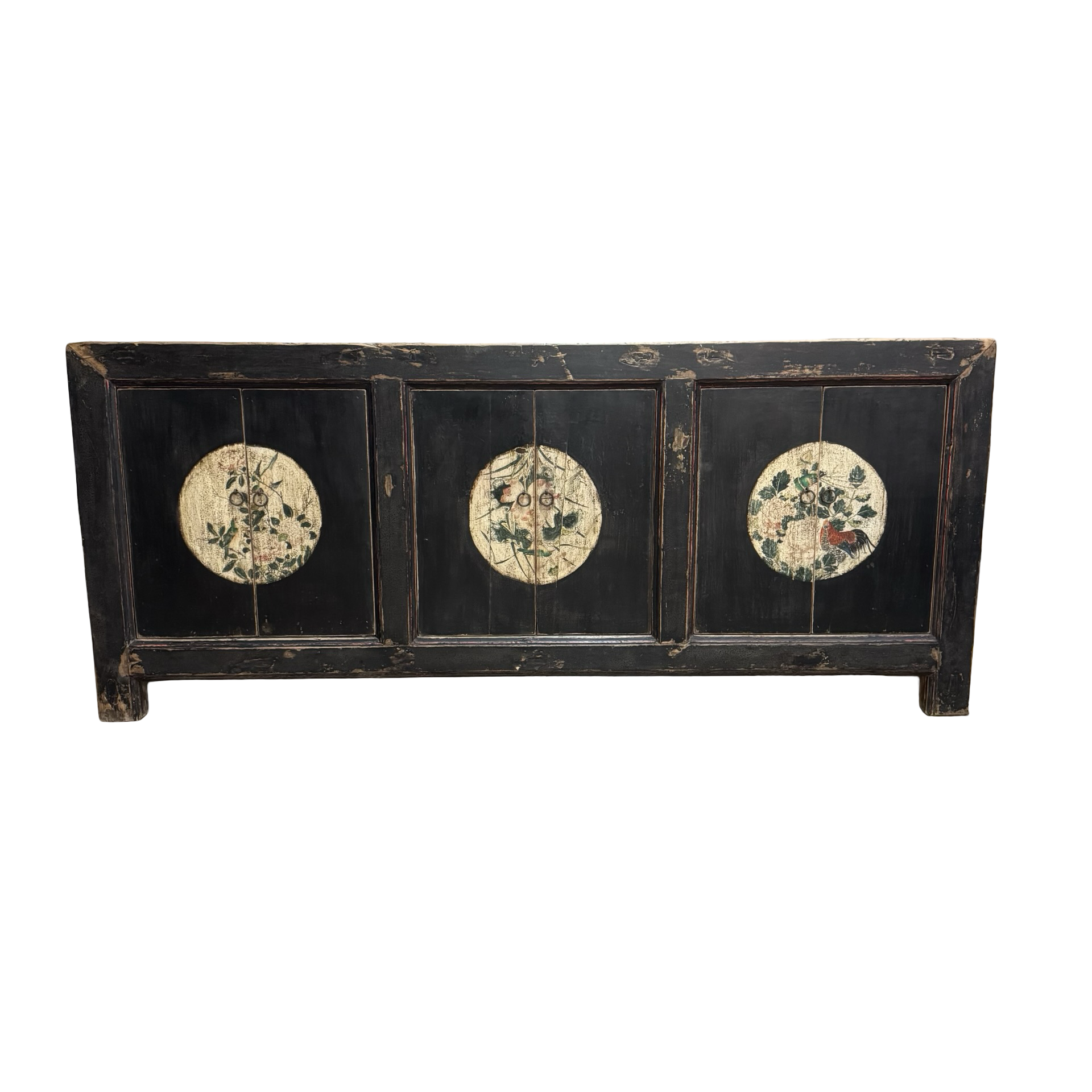 Dit unieke, handgemaakte dressoir uit China is uitgevoerd in een rustige zwarte tint, waardoor de verfijnde beschilderingen op het midden van de deuren subtiel naar voren komen. Het houten meubel ademt traditioneel vakmanschap, met zorg aangebrachte details die diepte en karakter geven.