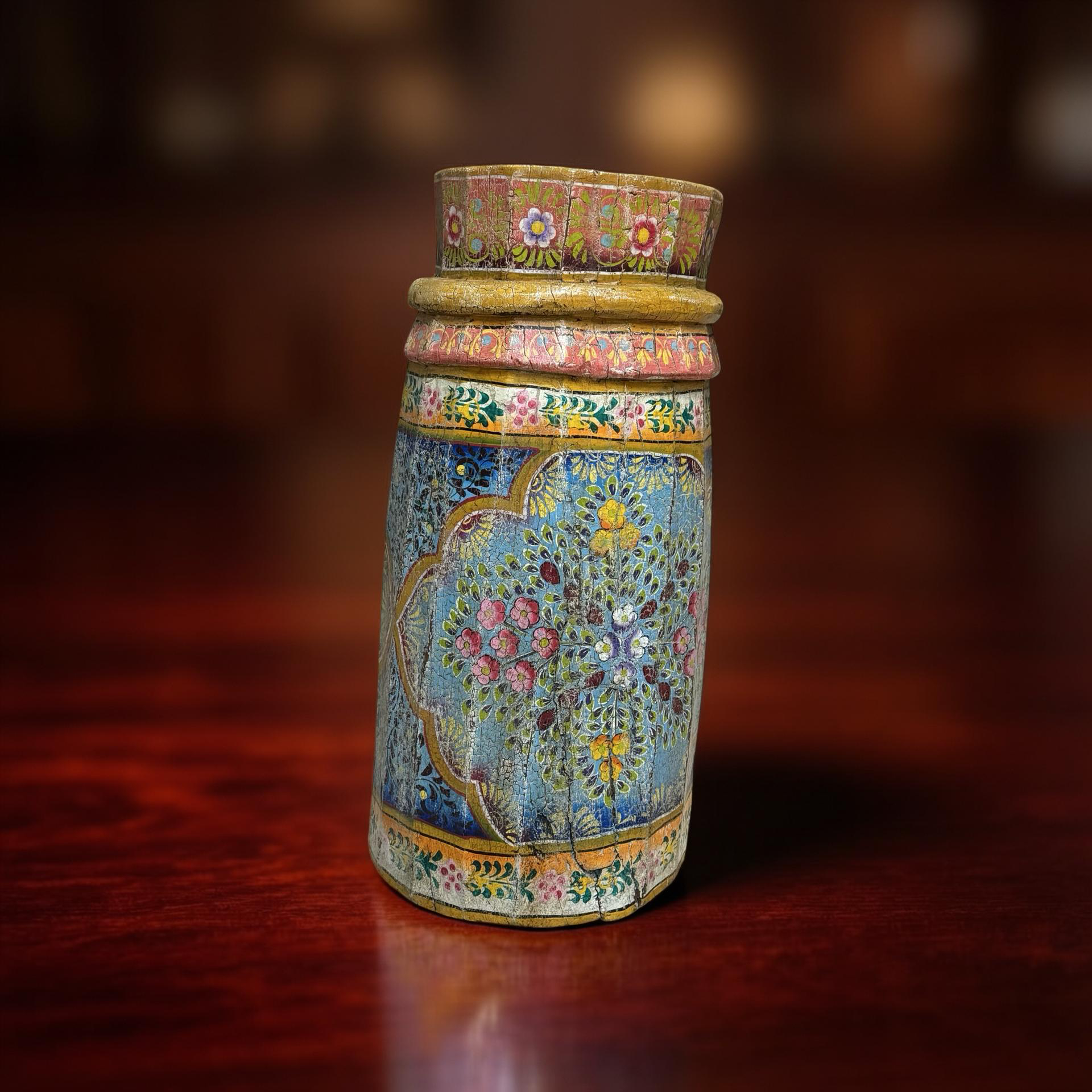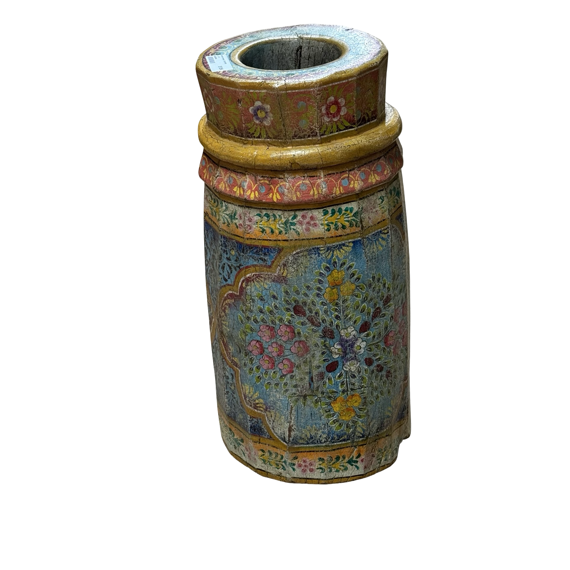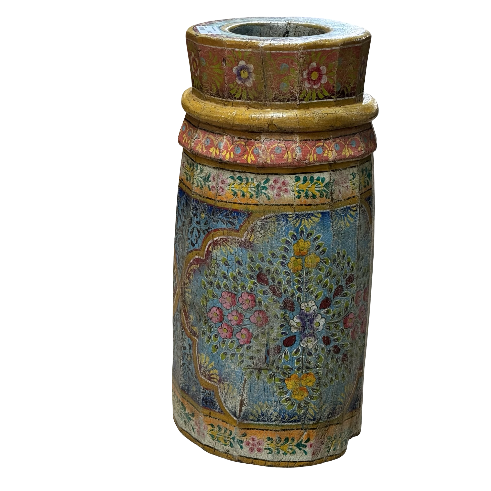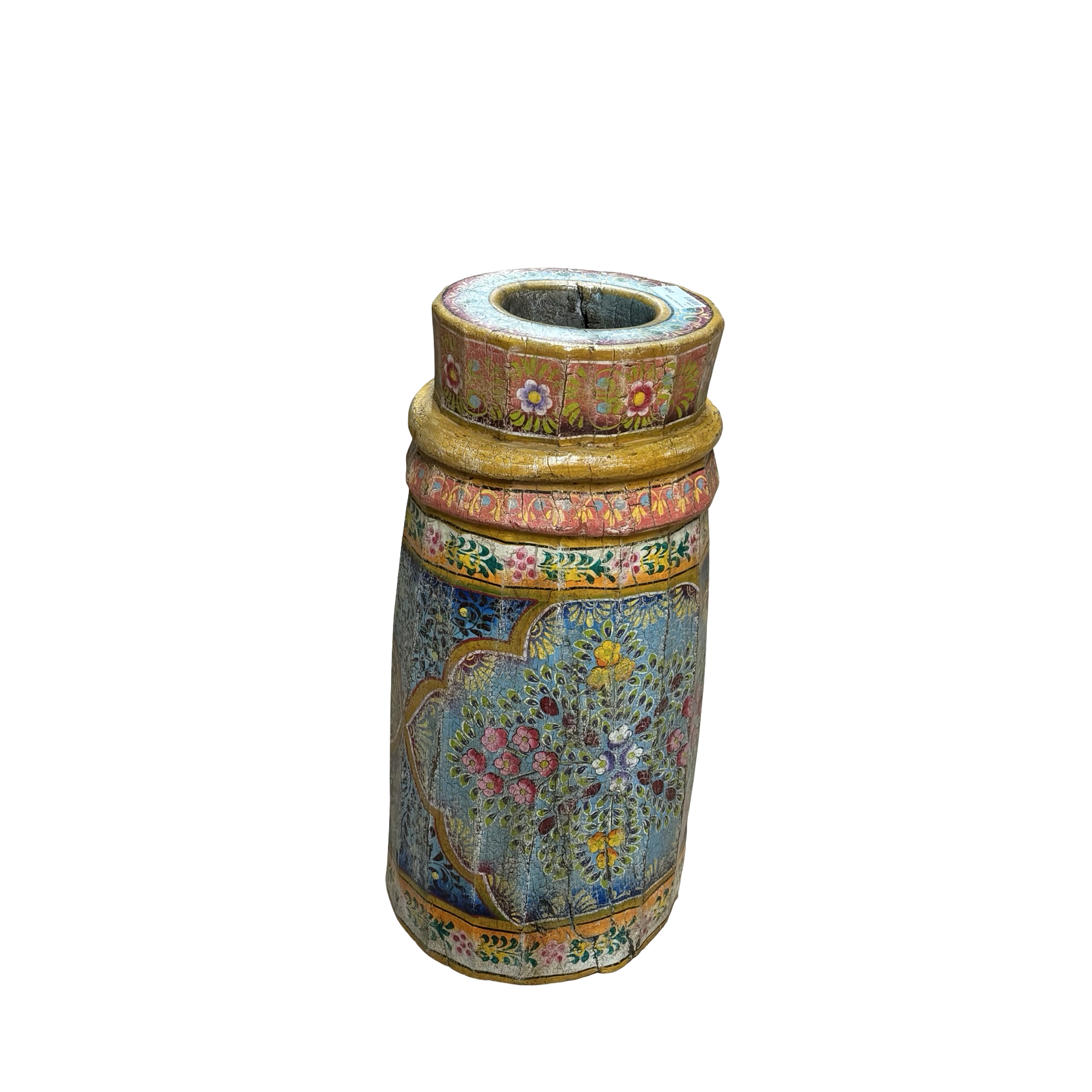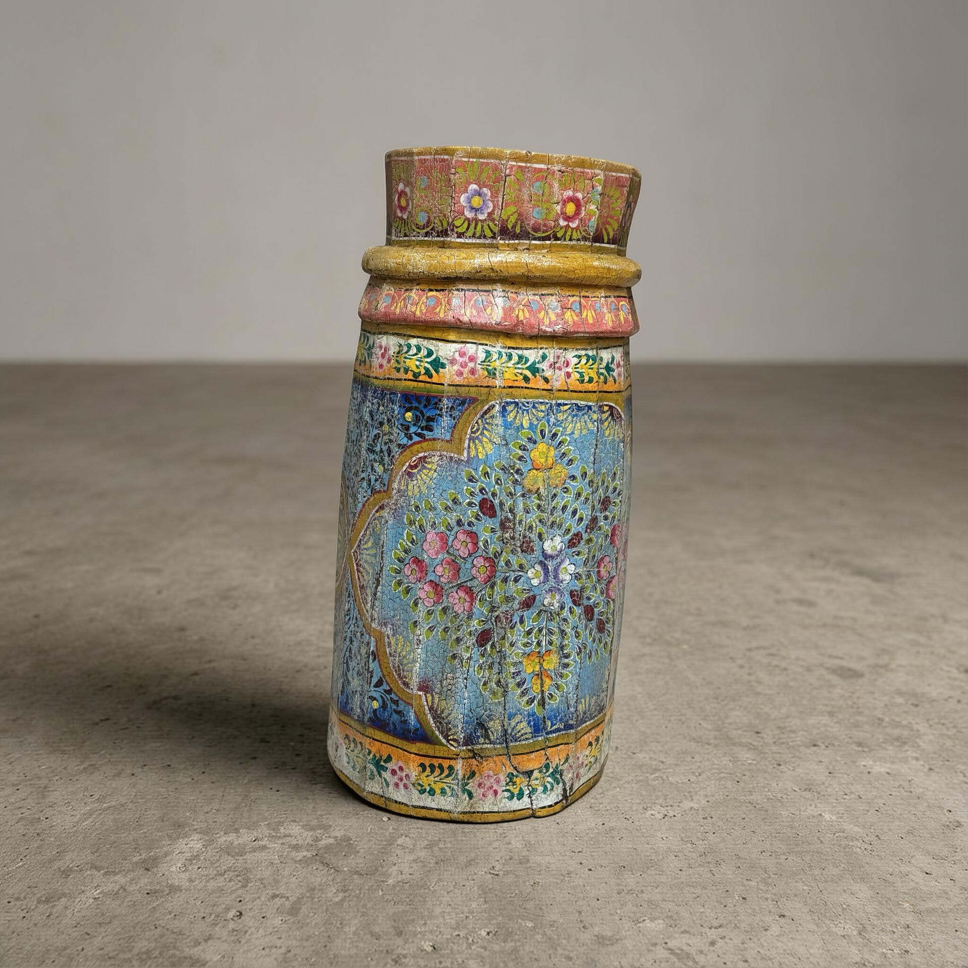• Deze unieke grainder is een handgemaakt object uit India met een karaktervolle, beschilderde afwerking. Het houten object toont duidelijke sporen van traditioneel gebruik en ambacht, waarbij de kleurrijke schildering het geheel een levendige en authentieke uitstraling geeft.