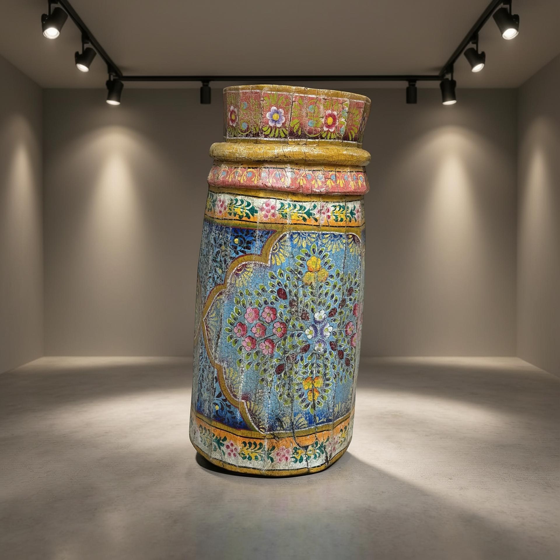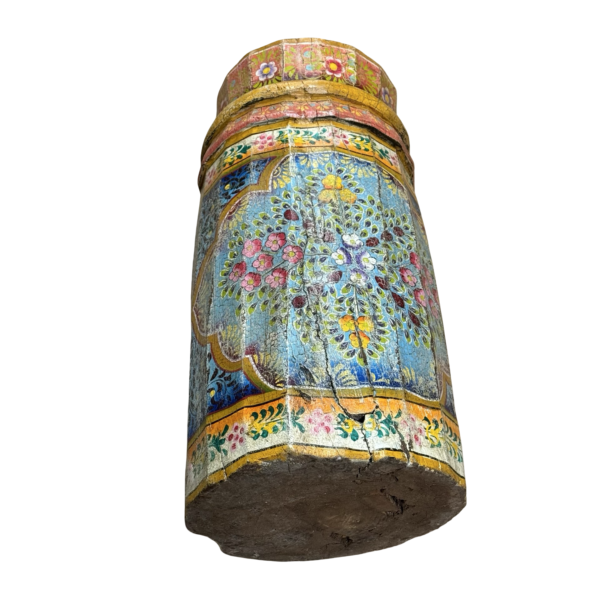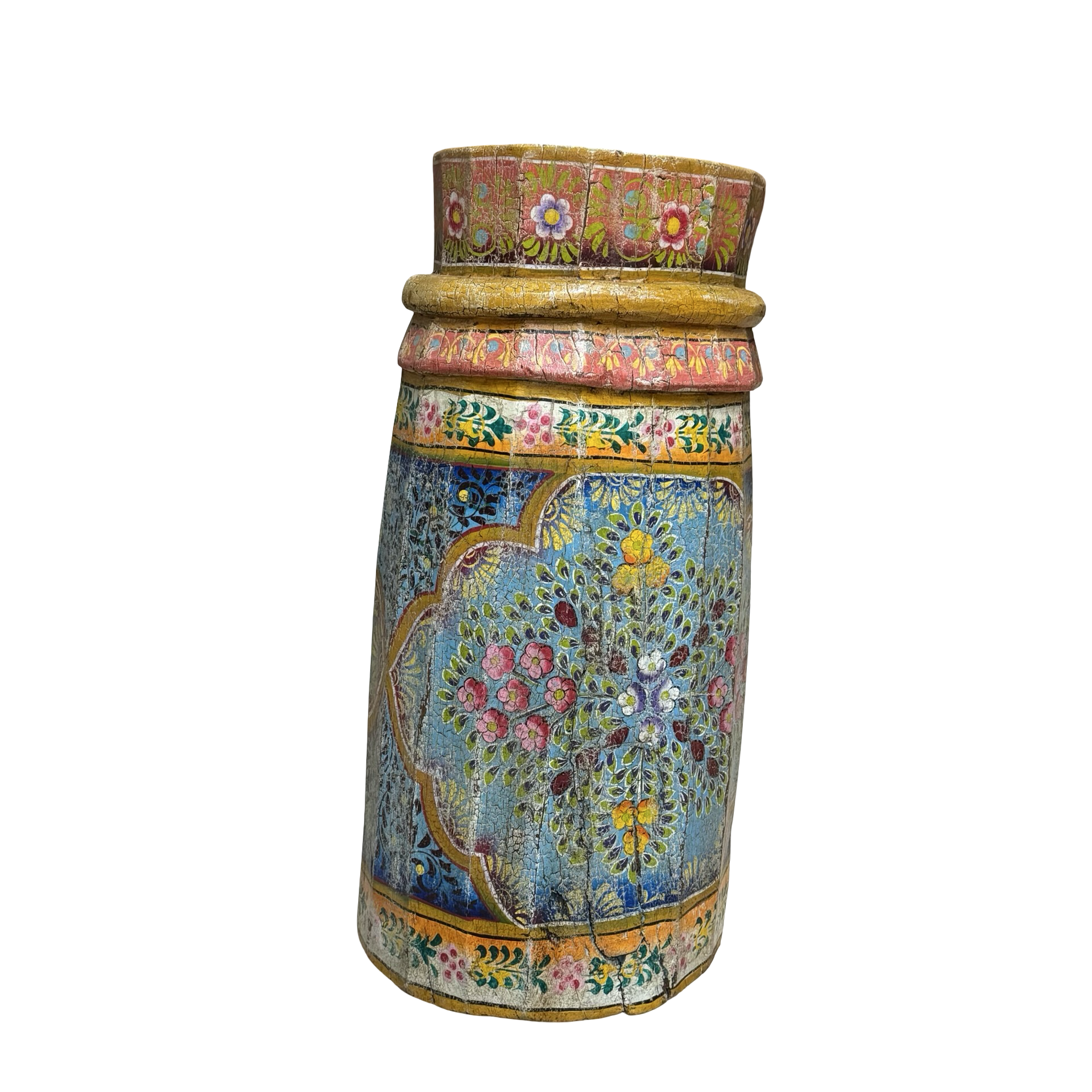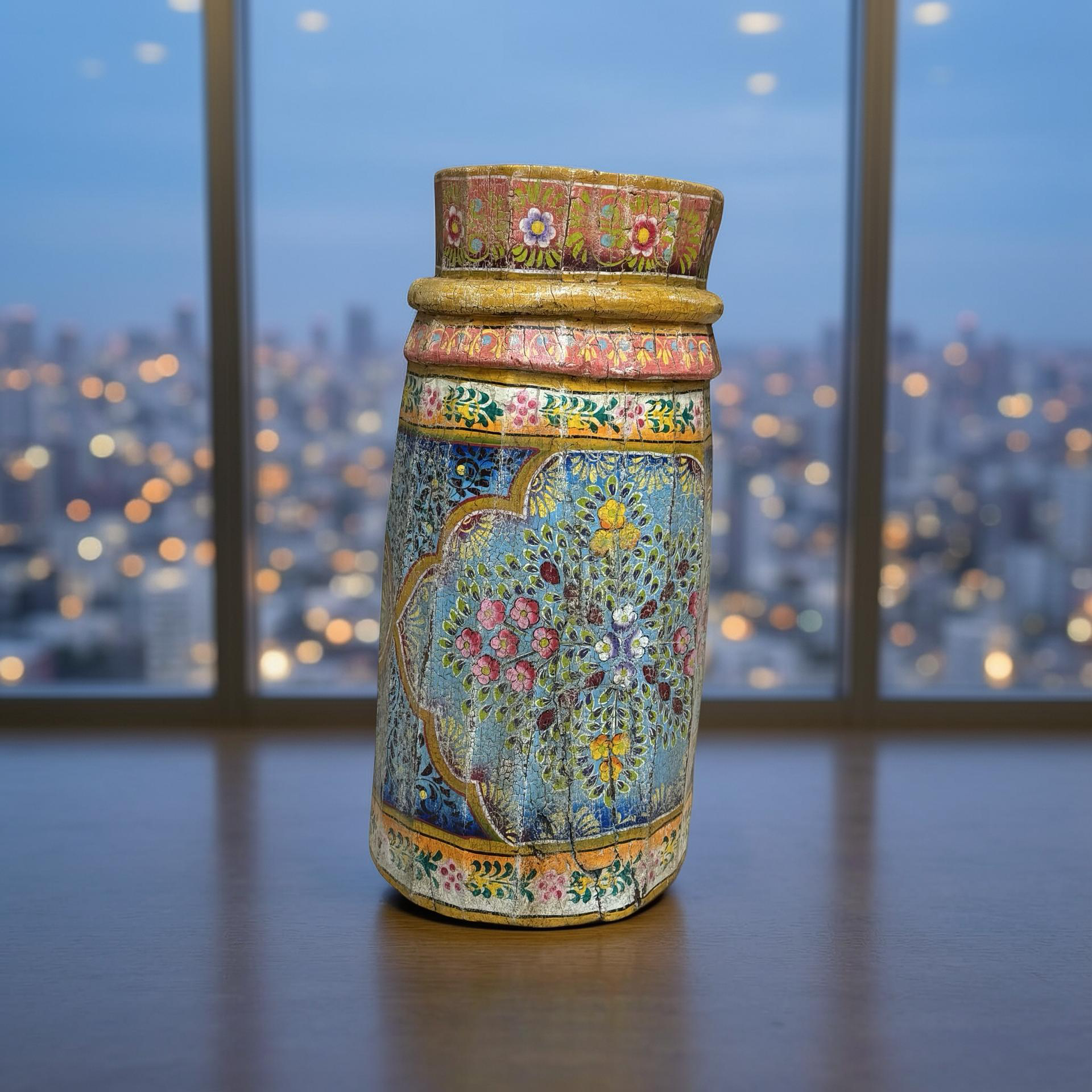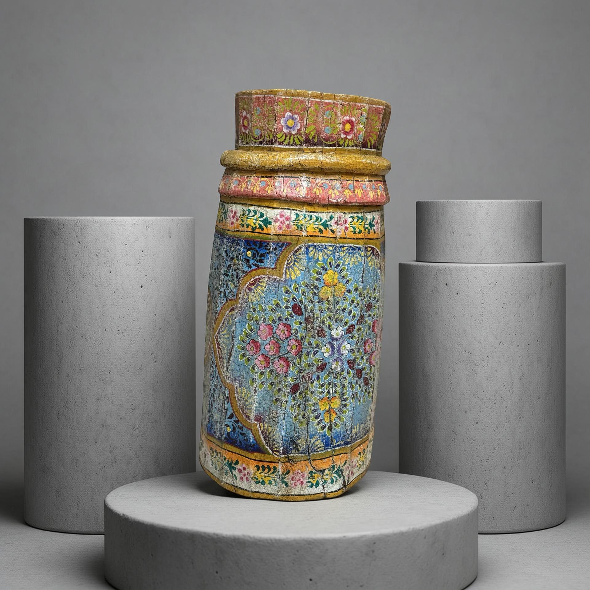 • Deze unieke grainder is een handgemaakt object uit India met een karaktervolle, beschilderde afwerking. Het houten object toont duidelijke sporen van traditioneel gebruik en ambacht, waarbij de kleurrijke schildering het geheel een levendige en authentieke uitstraling geeft.