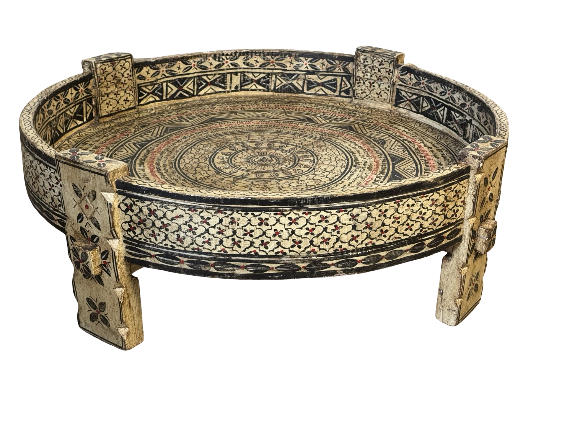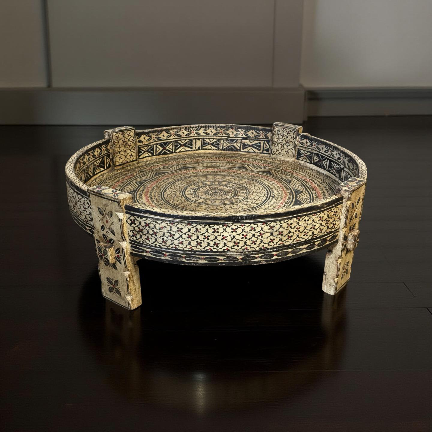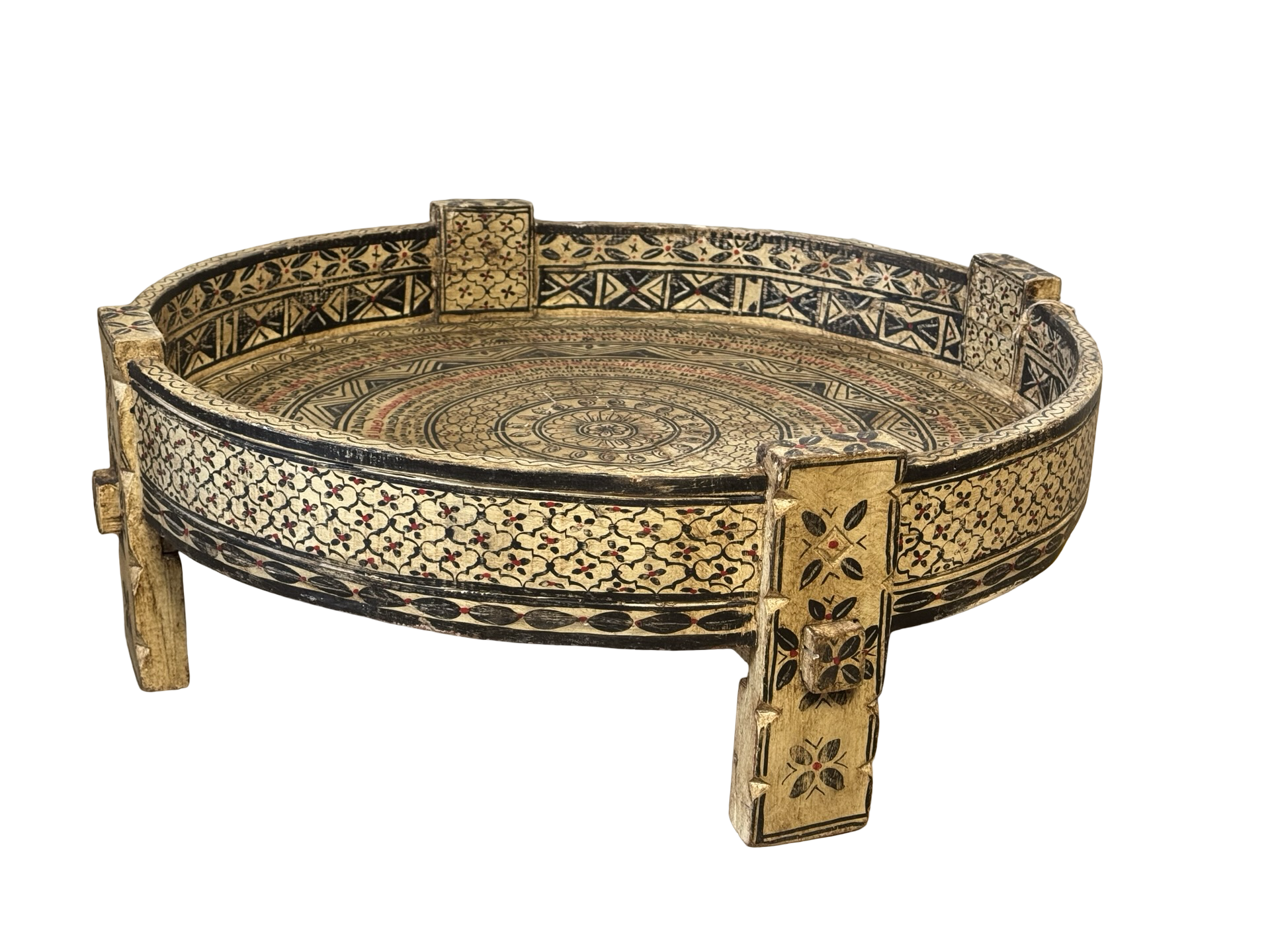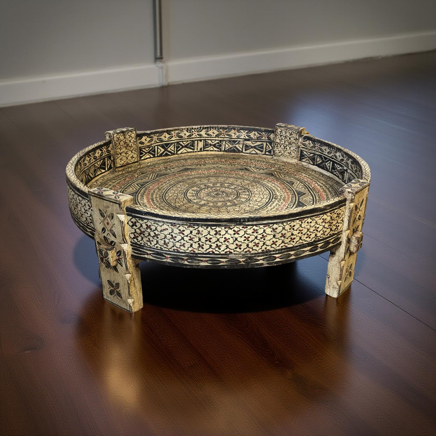 Deze unieke grainder salontafel is met de hand gemaakt en beschilderd in India. De zwart-witte patronen geven het stuk een opvallende, artistieke uitstraling. Een echte eyecatcher met een verhaal.