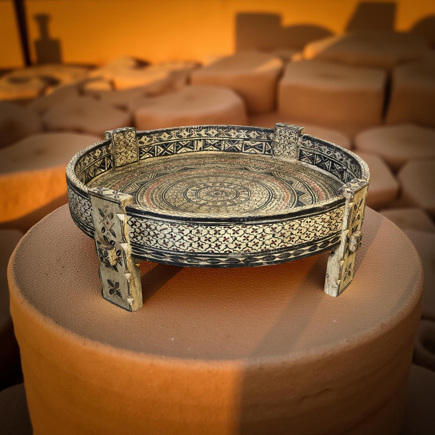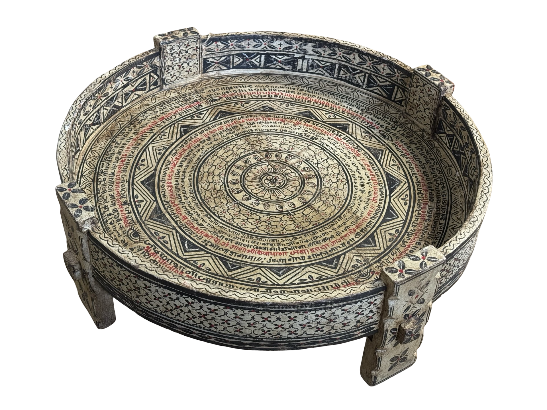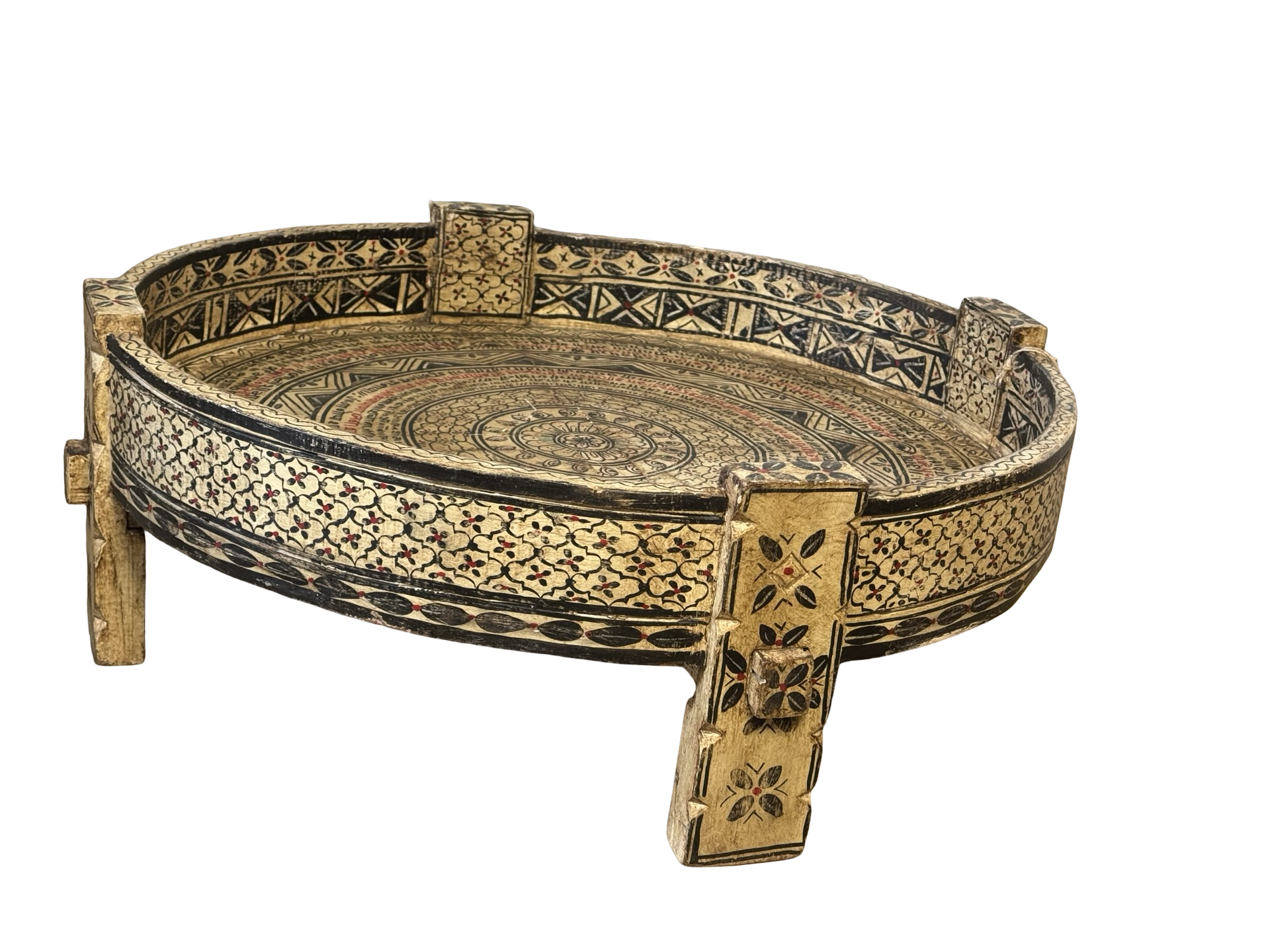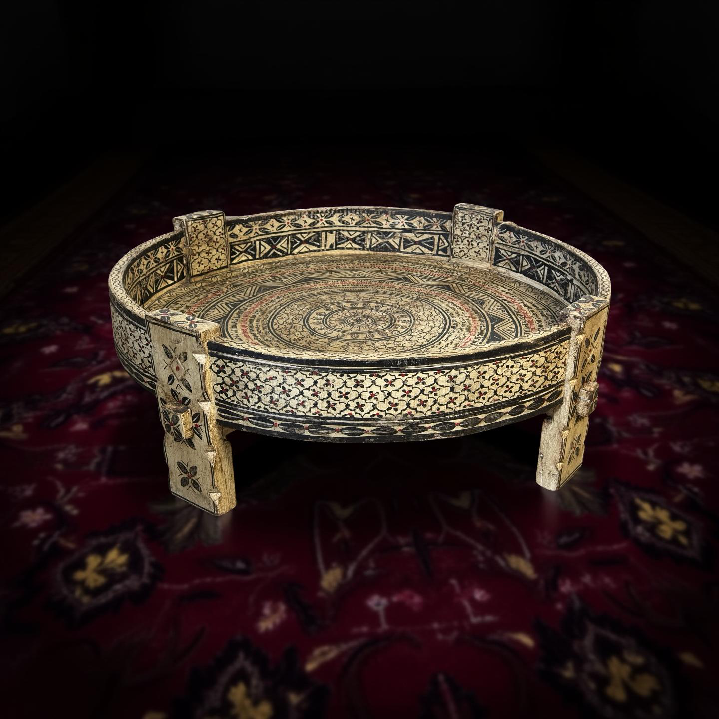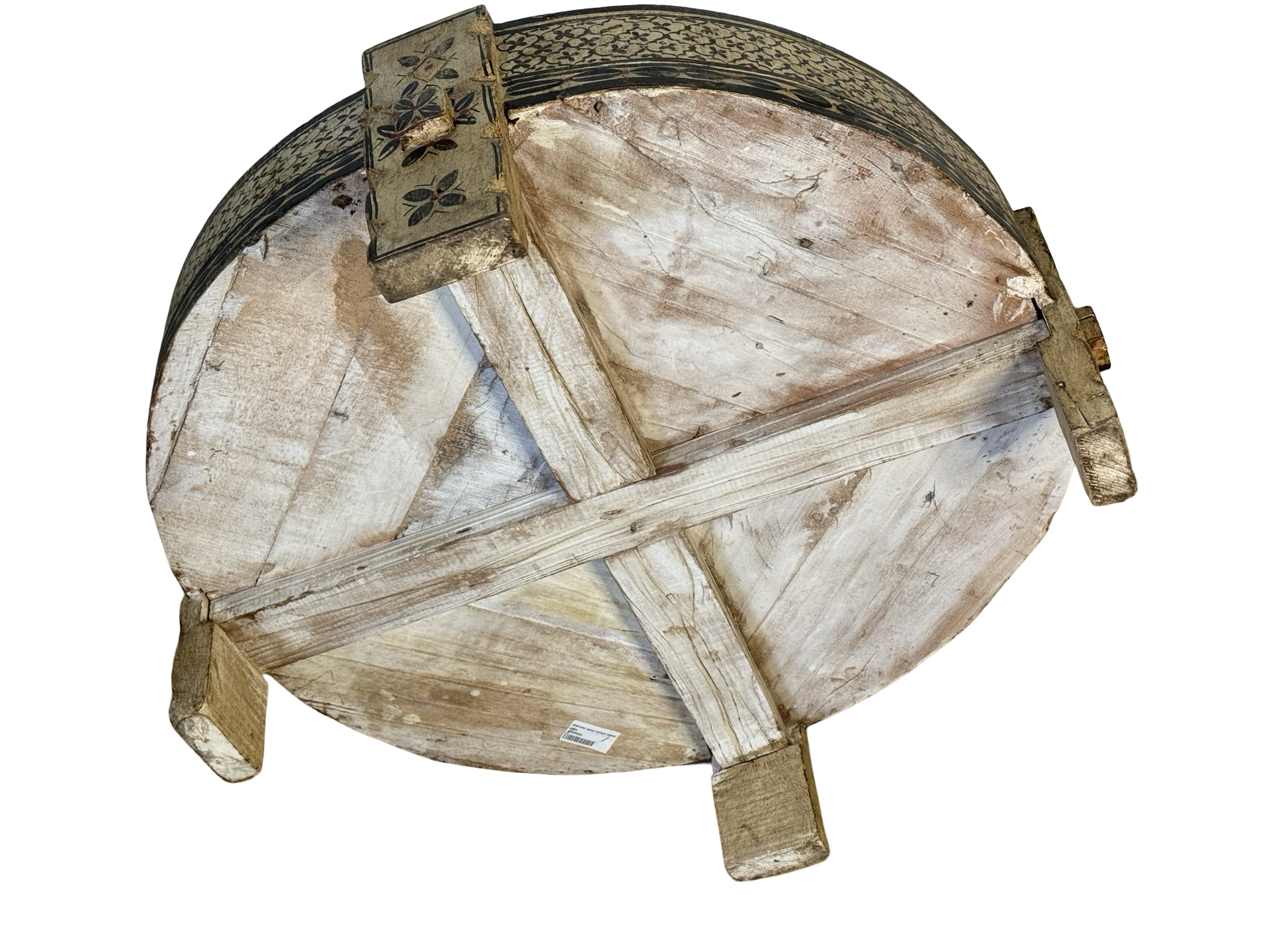Deze unieke grainder salontafel is met de hand gemaakt en beschilderd in India. De zwart-witte patronen geven het stuk een opvallende, artistieke uitstraling. Een echte eyecatcher met een verhaal.