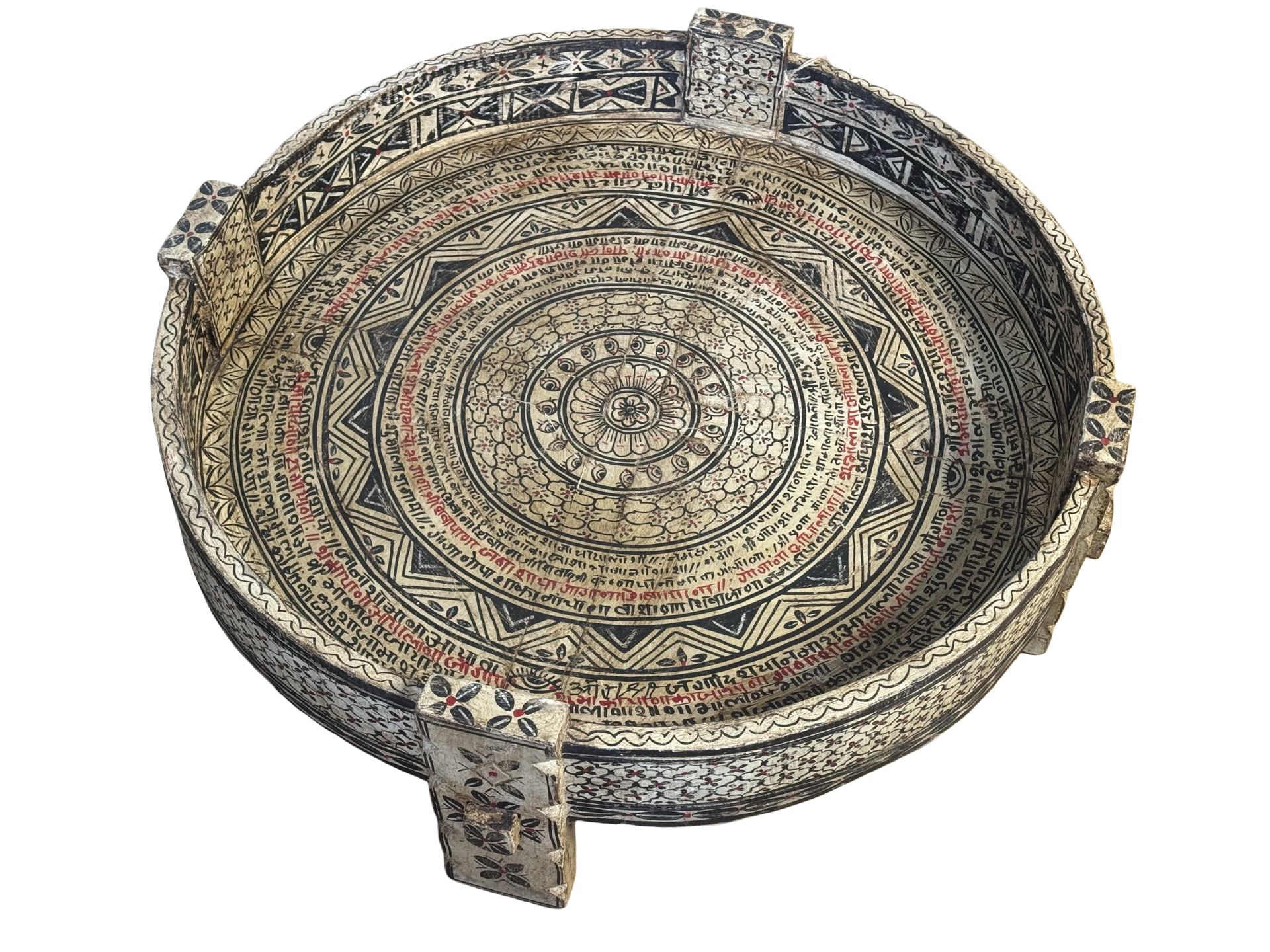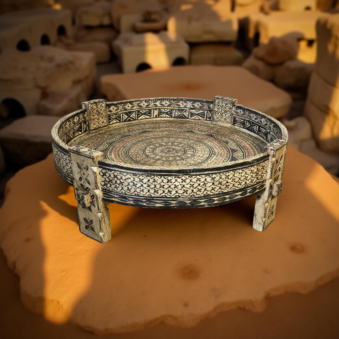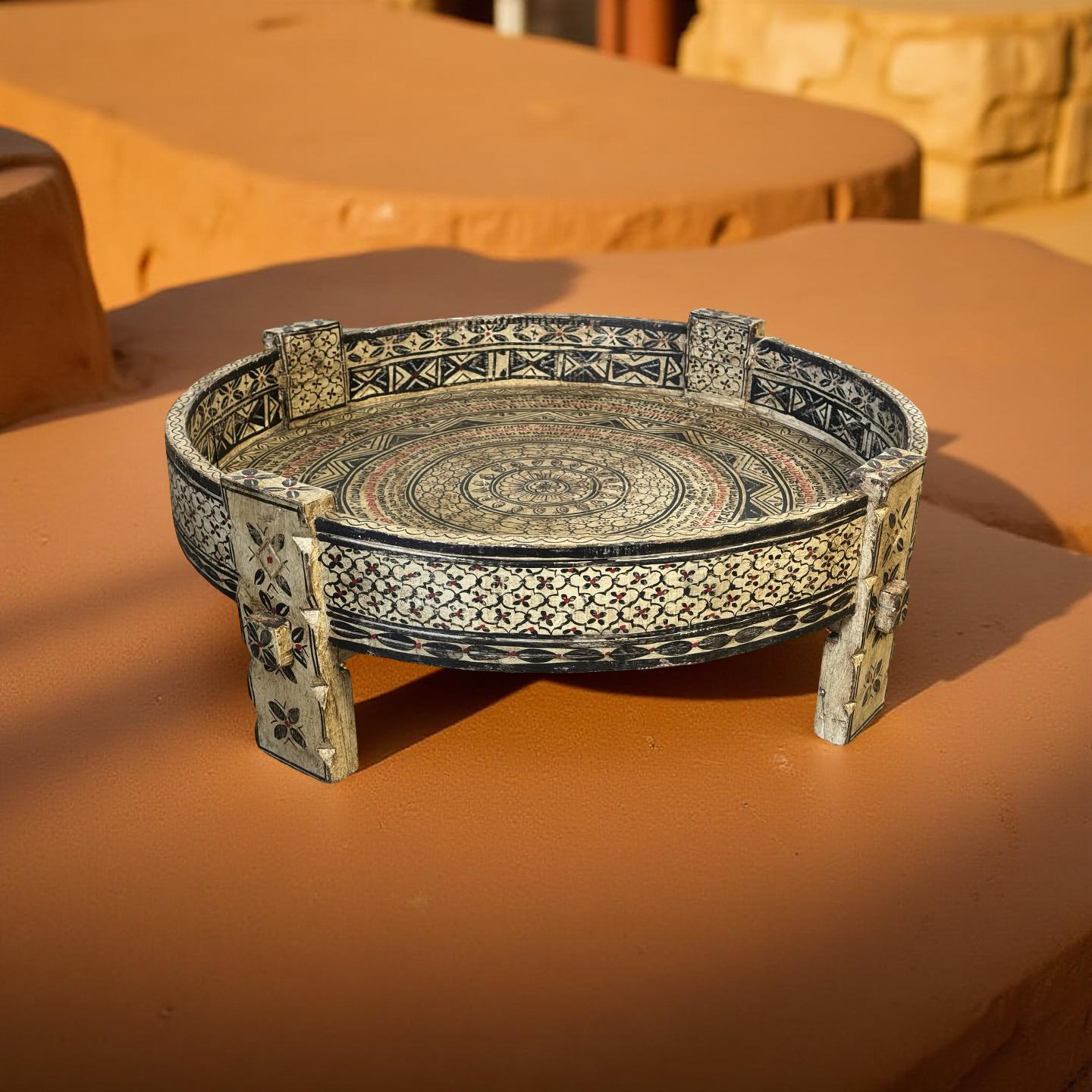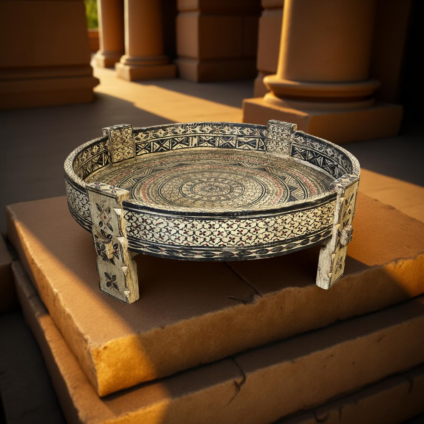 Deze unieke grainder salontafel is met de hand gemaakt en beschilderd in India. De zwart-witte patronen geven het stuk een opvallende, artistieke uitstraling. Een echte eyecatcher met een verhaal.