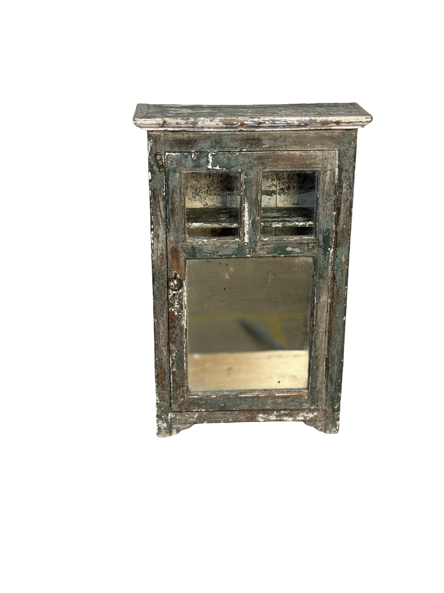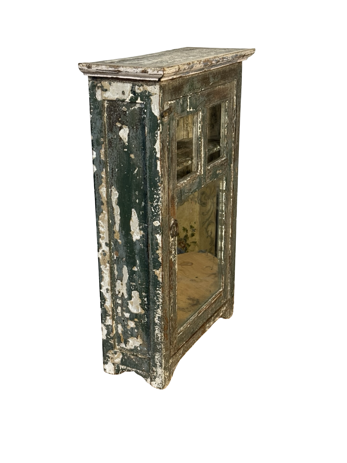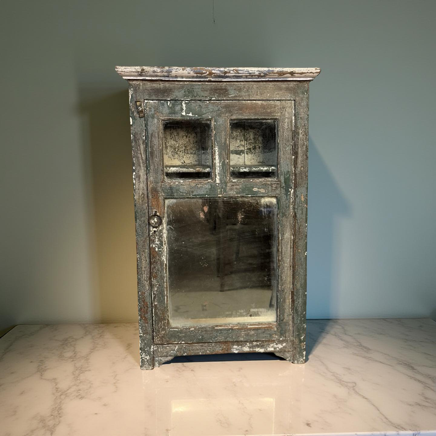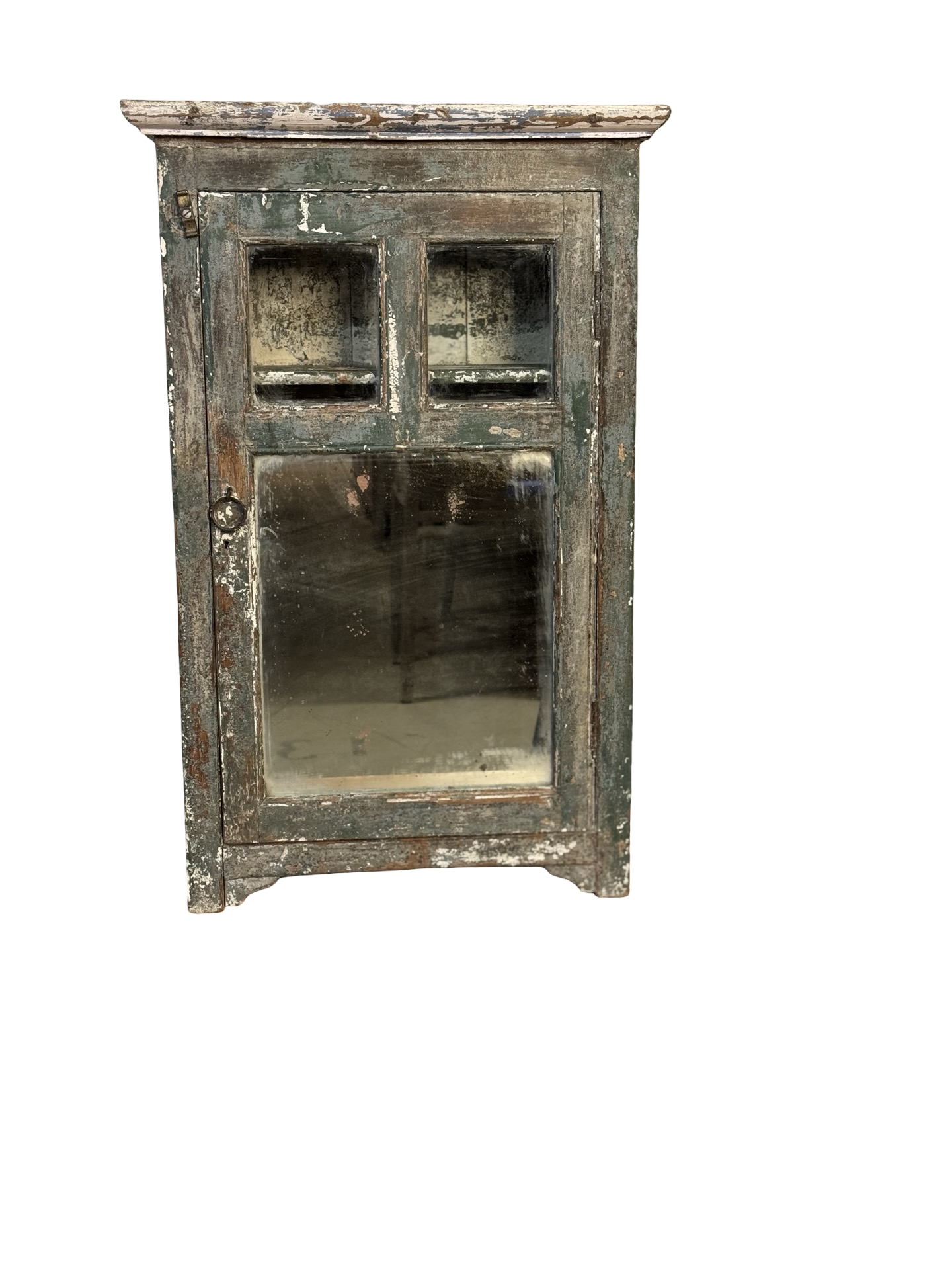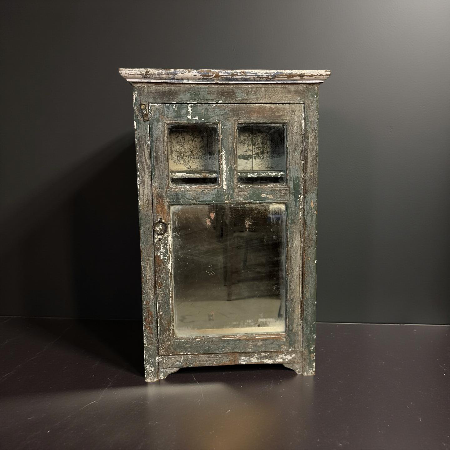 Dit handgemaakte hangkastje met spiegel combineert een prachtige blauw-grijs kleurstelling met uniek vakmanschap. Een sfeervol en stijlvol accent voor aan de muur.
