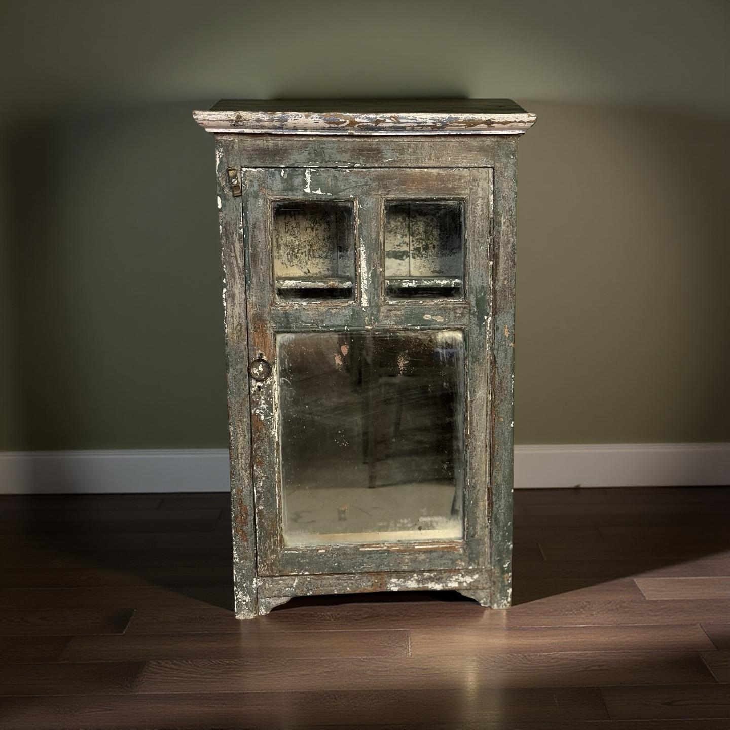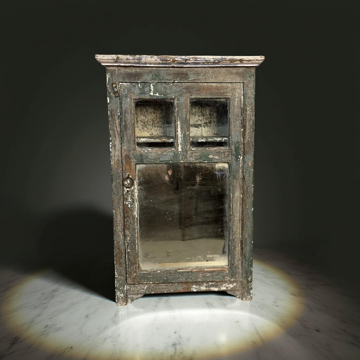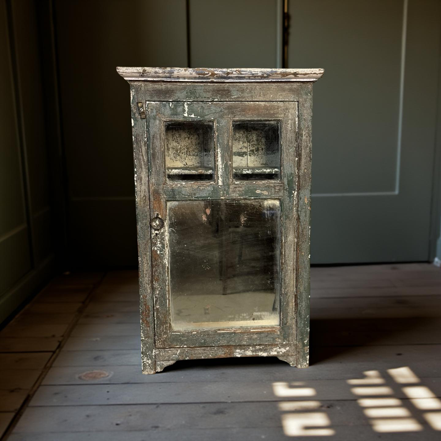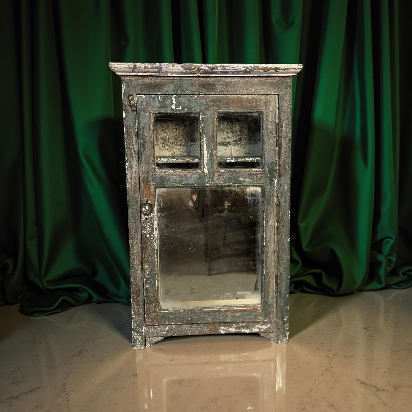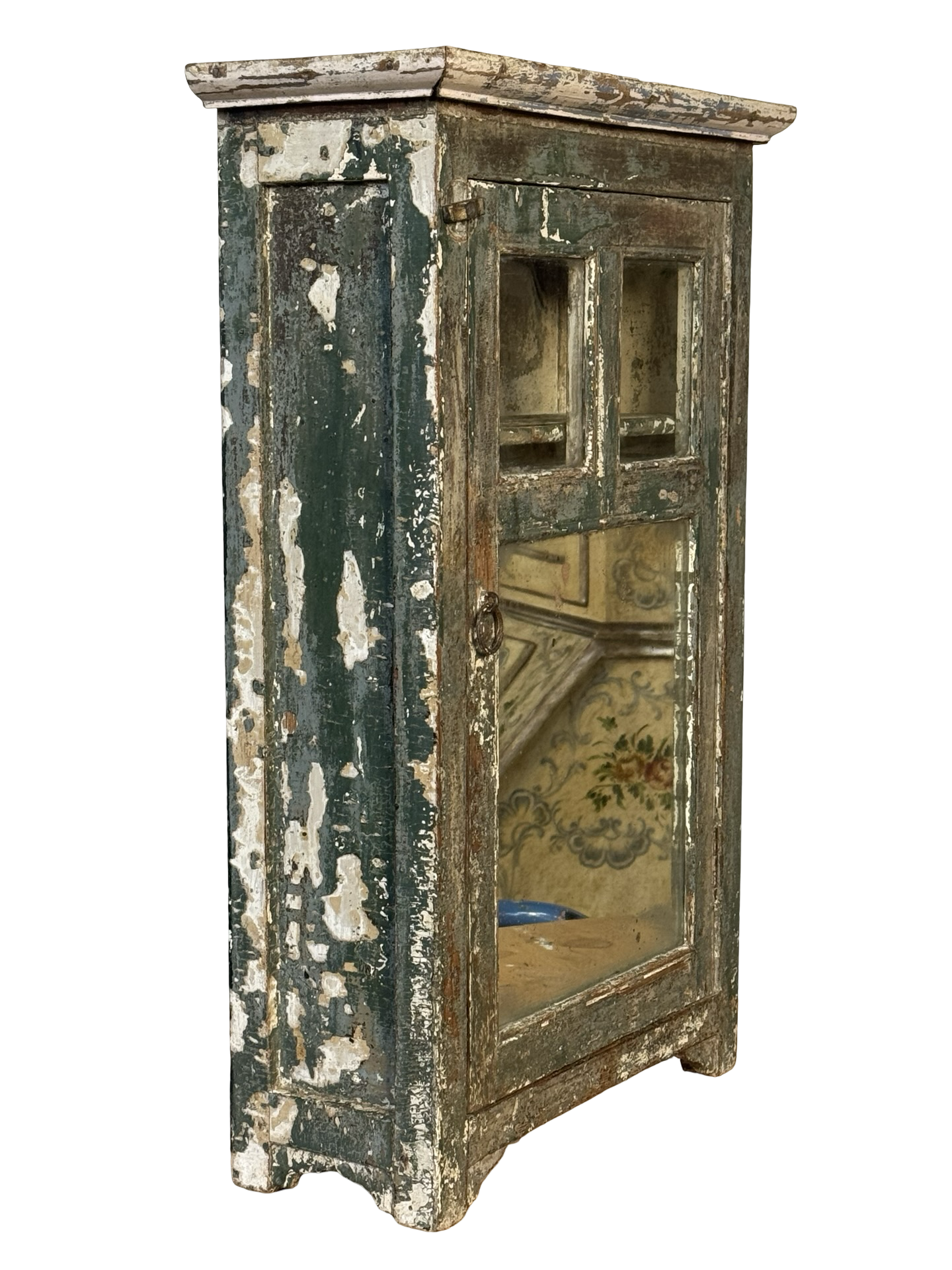 Dit handgemaakte hangkastje met spiegel combineert een prachtige blauw-grijs kleurstelling met uniek vakmanschap. Een sfeervol en stijlvol accent voor aan de muur.