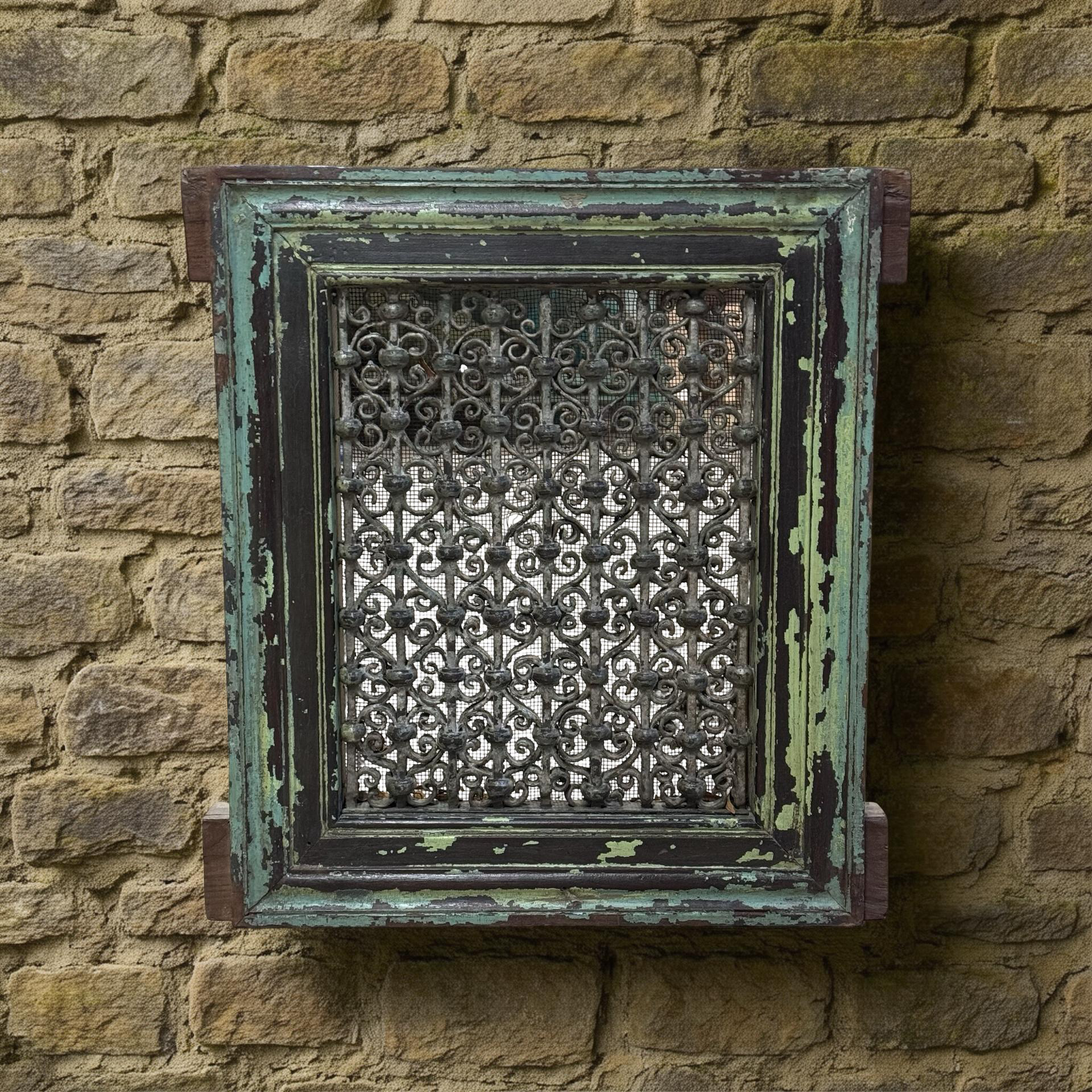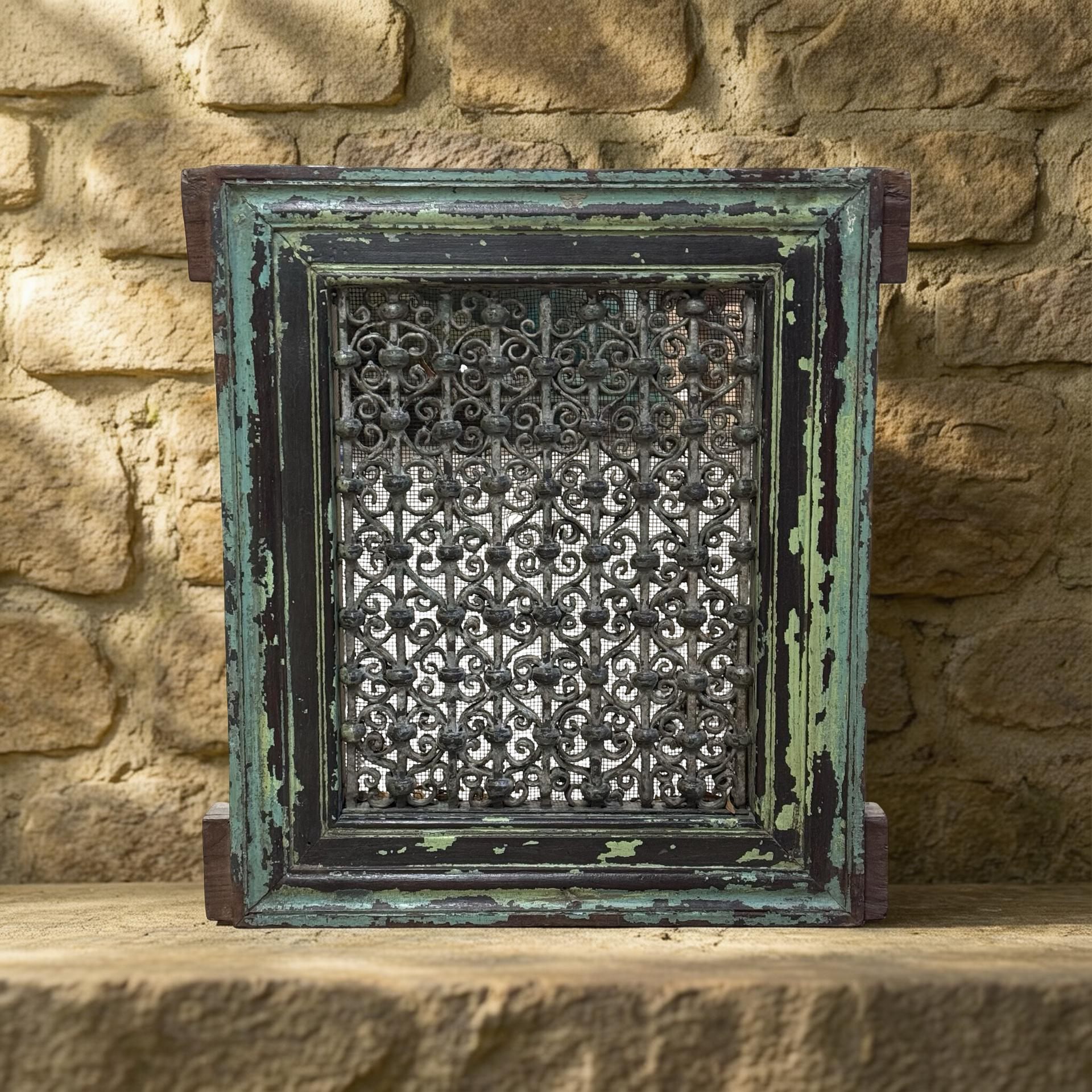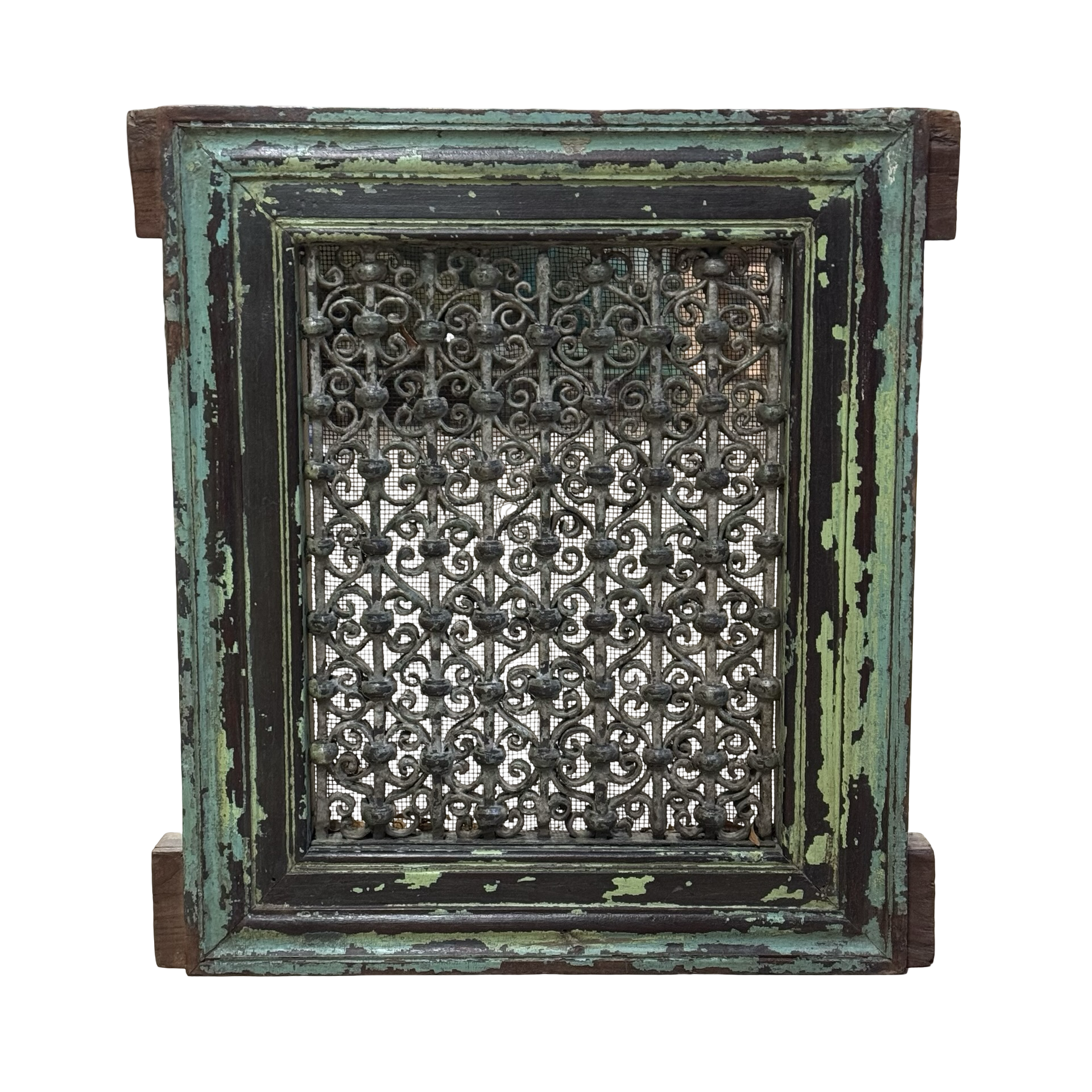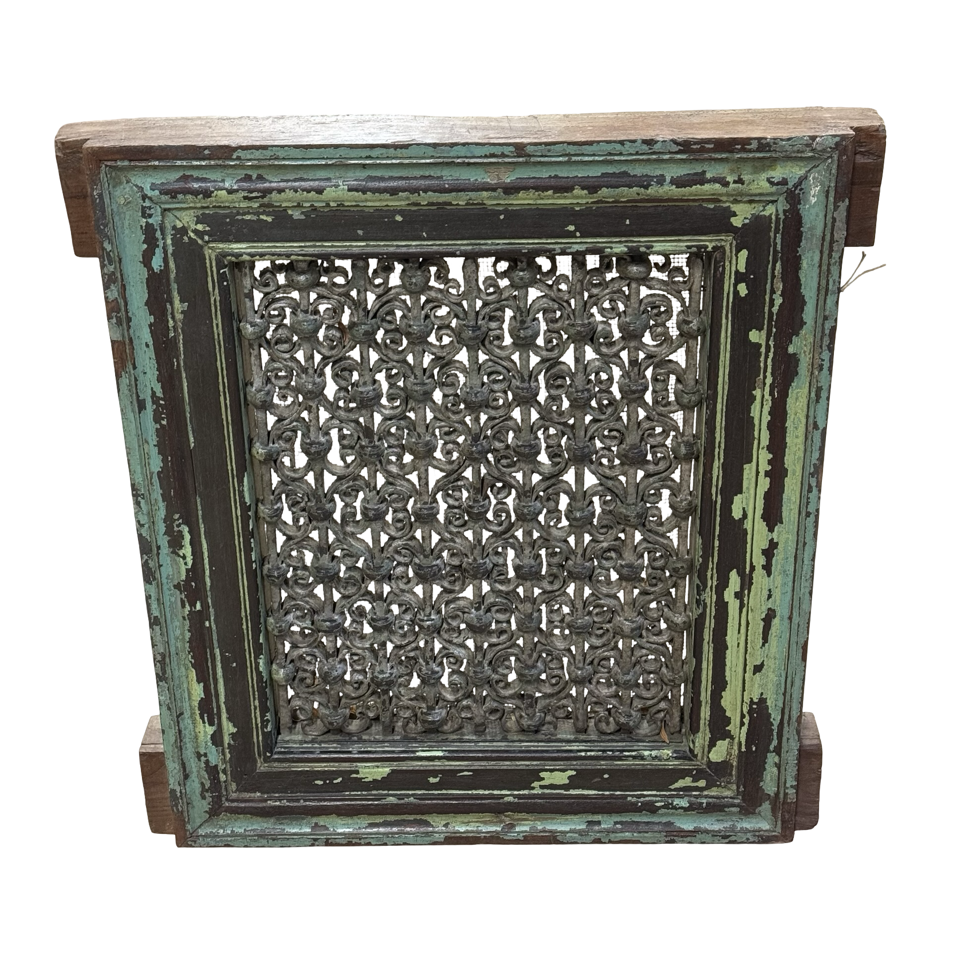 Deze unieke ijzeren jali uit India is een handgemaakt stuk met een karaktervolle groene patina. Het verfijnde opengewerkte patroon weerspiegelt traditioneel vakmanschap en geeft het object een subtiele, decoratieve uitstraling.