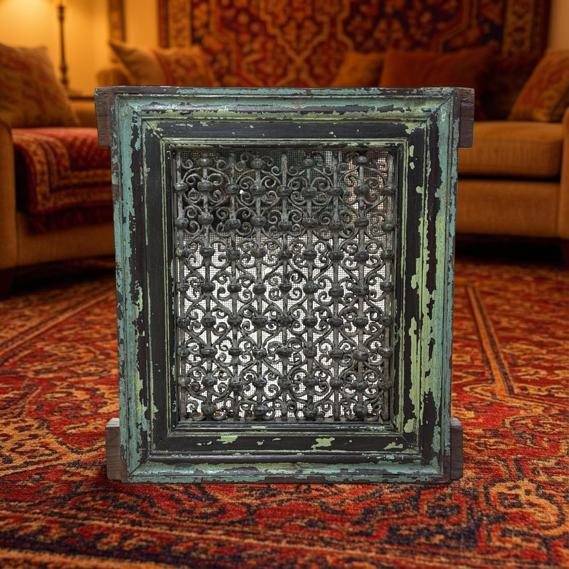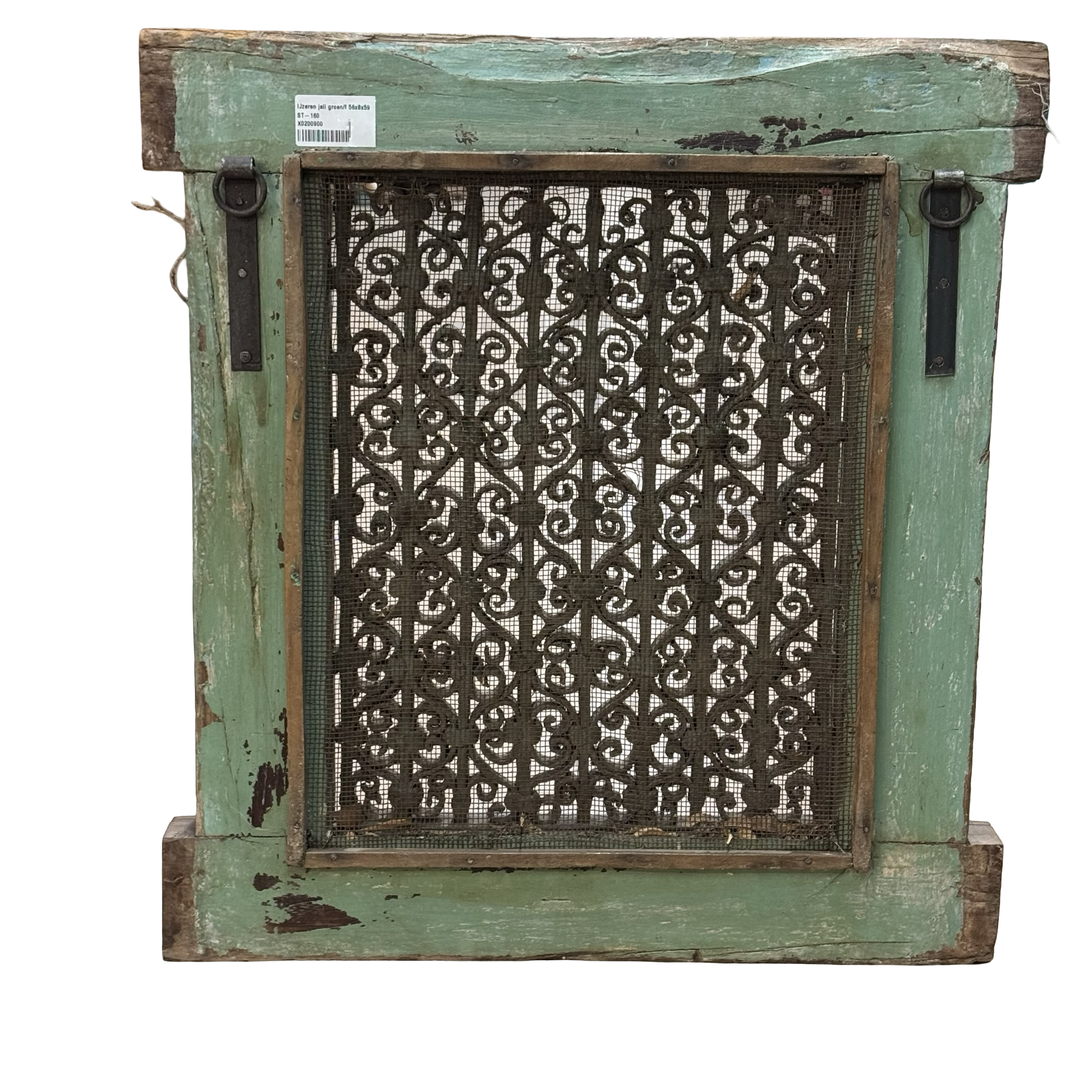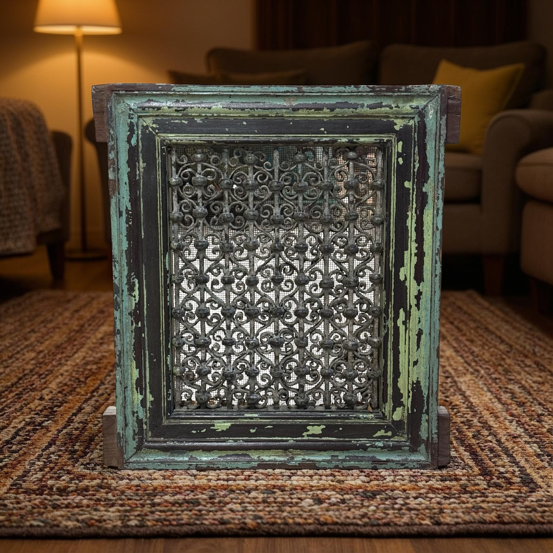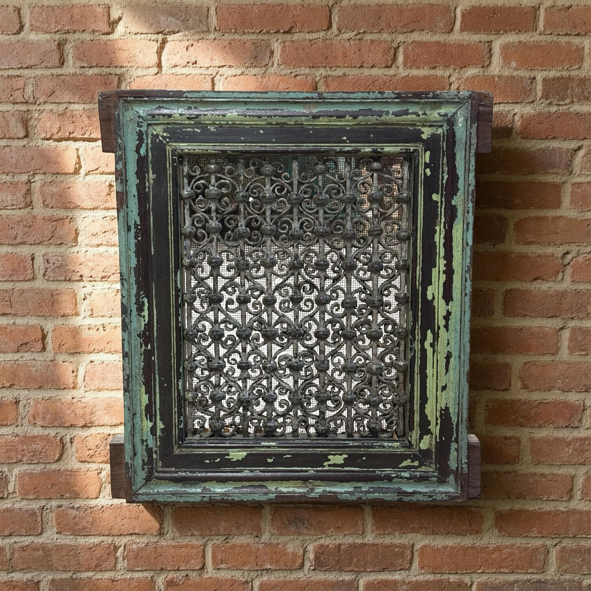 Deze unieke ijzeren jali uit India is een handgemaakt stuk met een karaktervolle groene patina. Het verfijnde opengewerkte patroon weerspiegelt traditioneel vakmanschap en geeft het object een subtiele, decoratieve uitstraling.