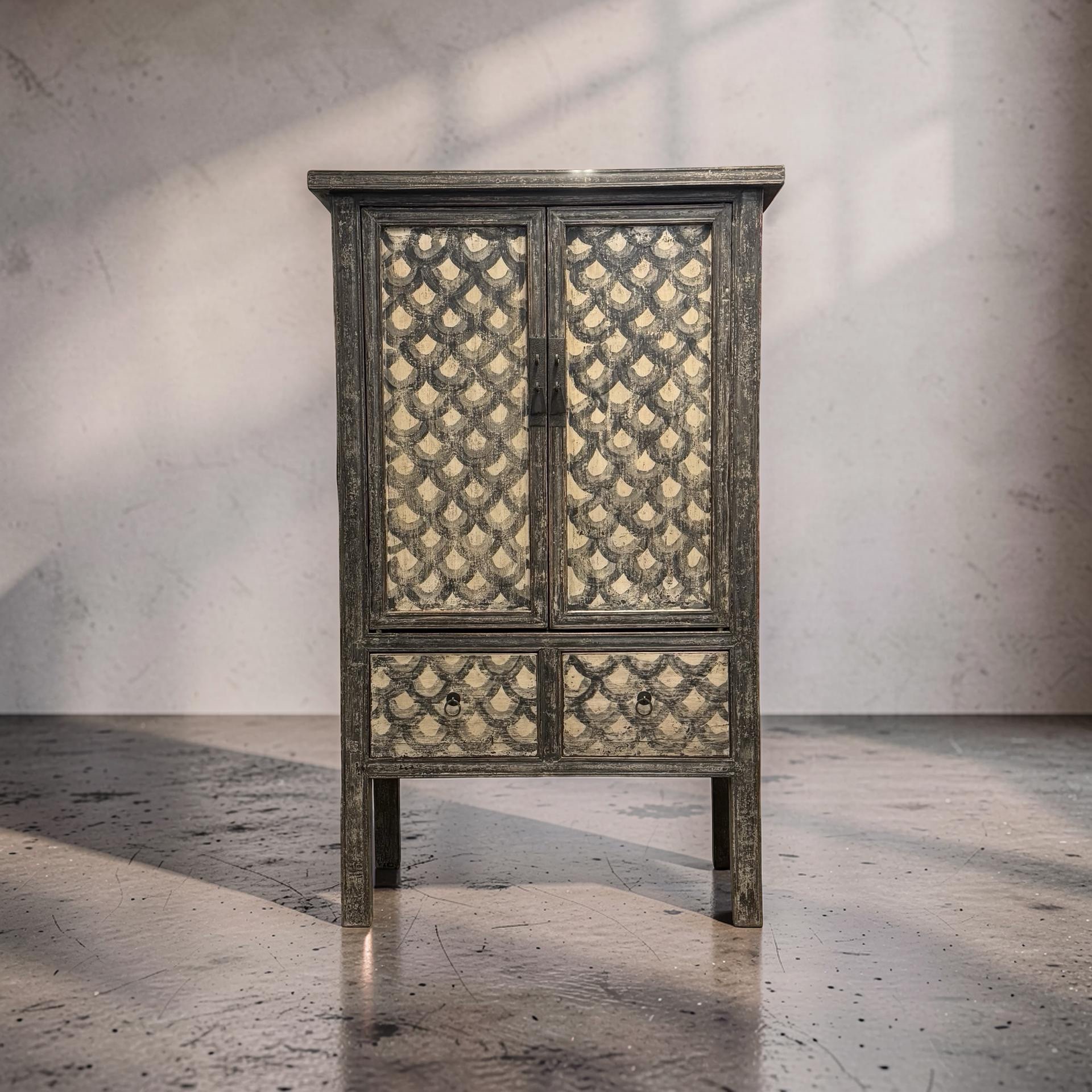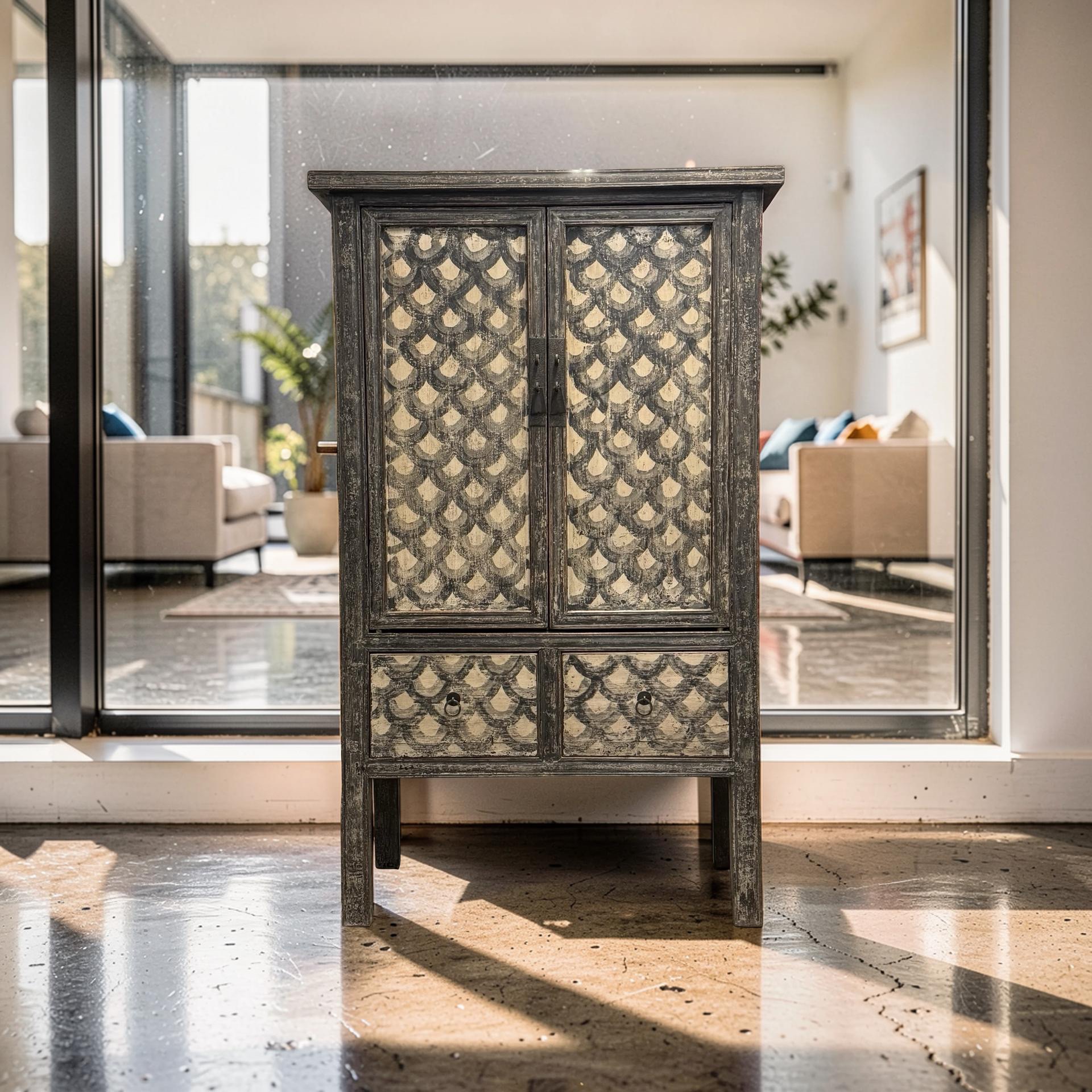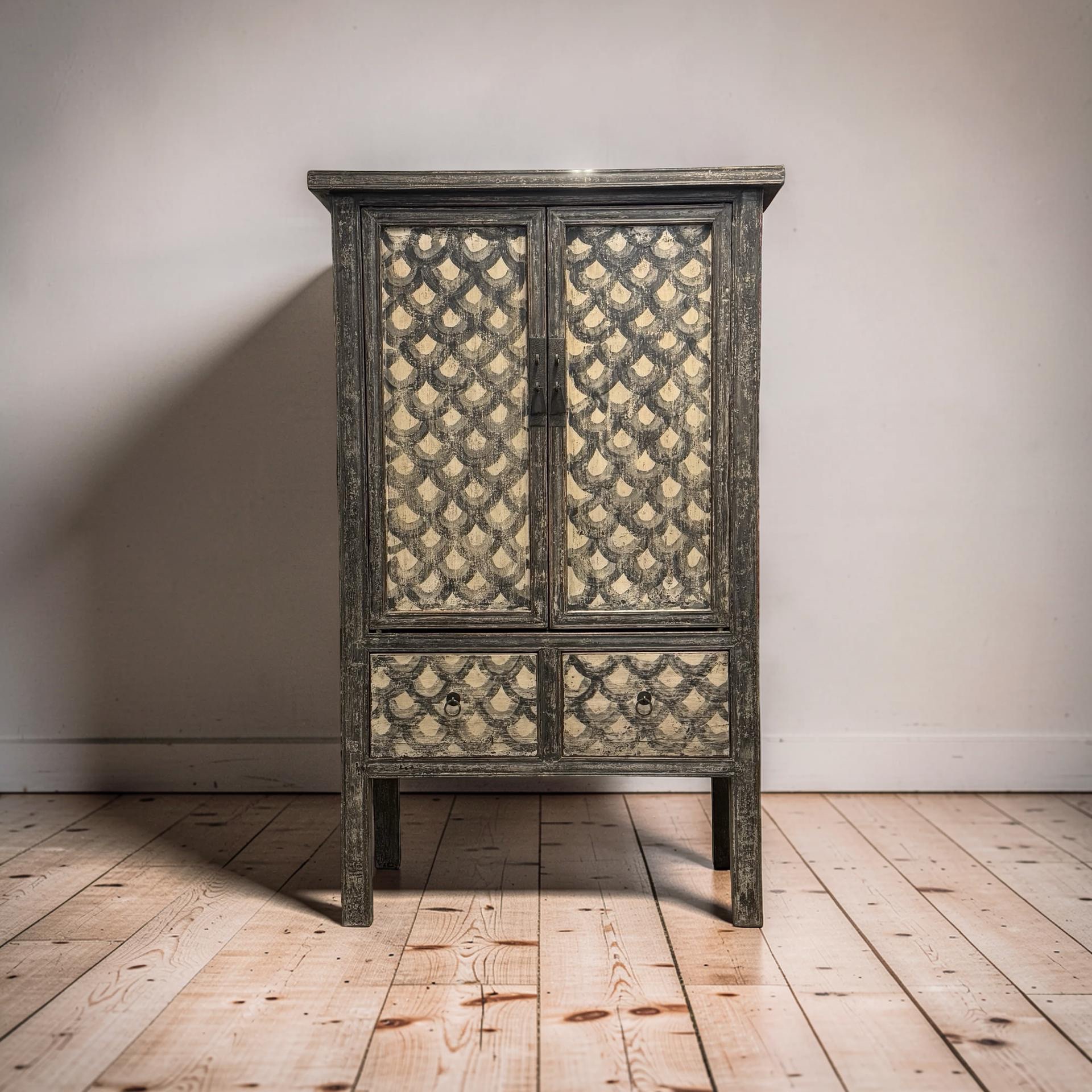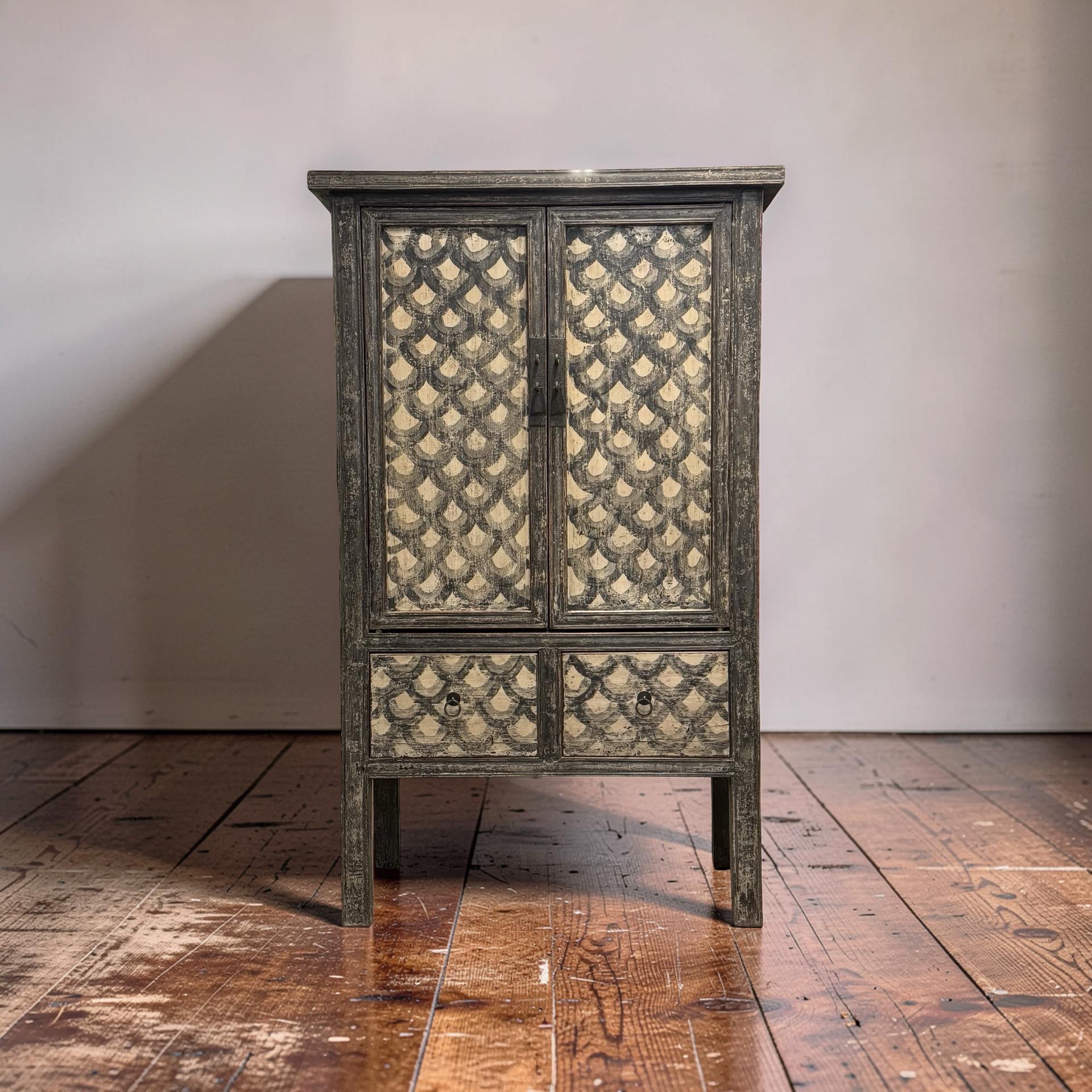 Deze unieke kast uit China is handgemaakt en uitgevoerd in een verfijnde combinatie van zwart en beige met een subtiel, decoratief motief. Voorzien van twee deuren en twee lades biedt het meubel een harmonieuze balans tussen functionaliteit en esthetiek.