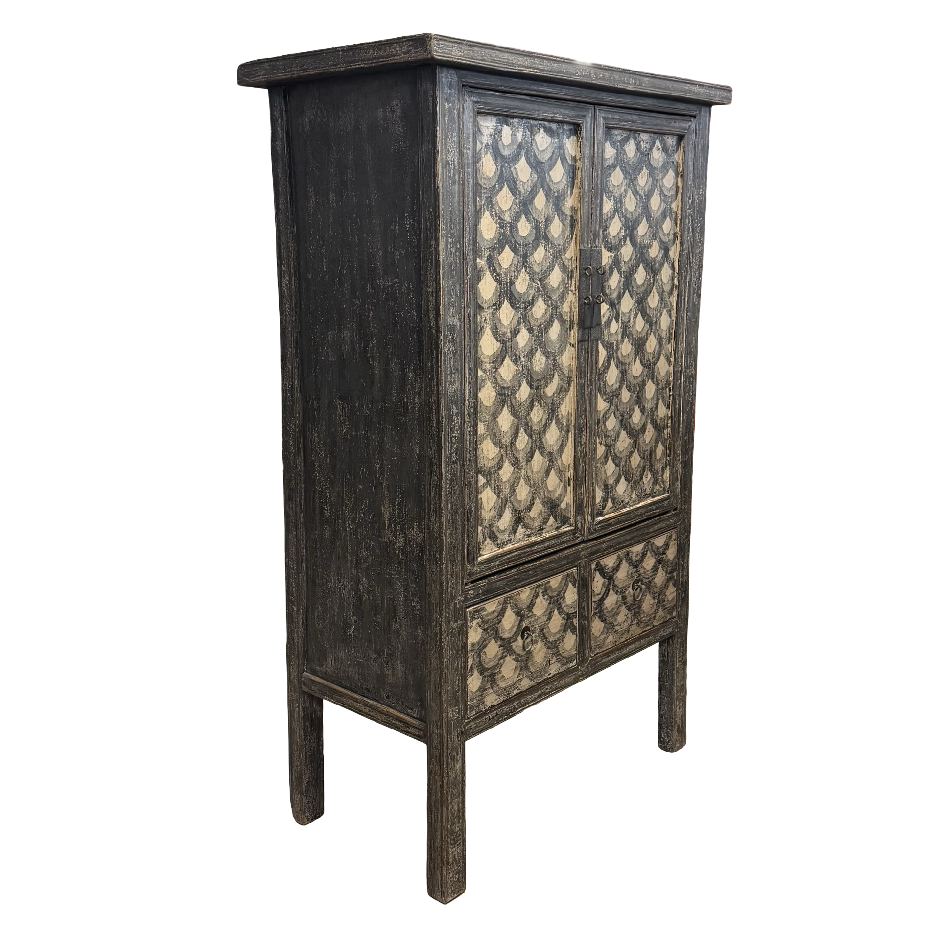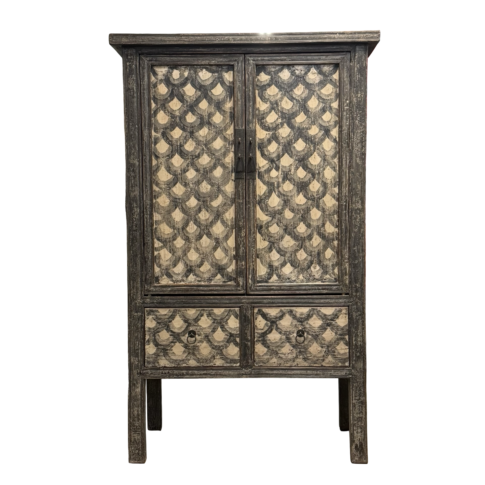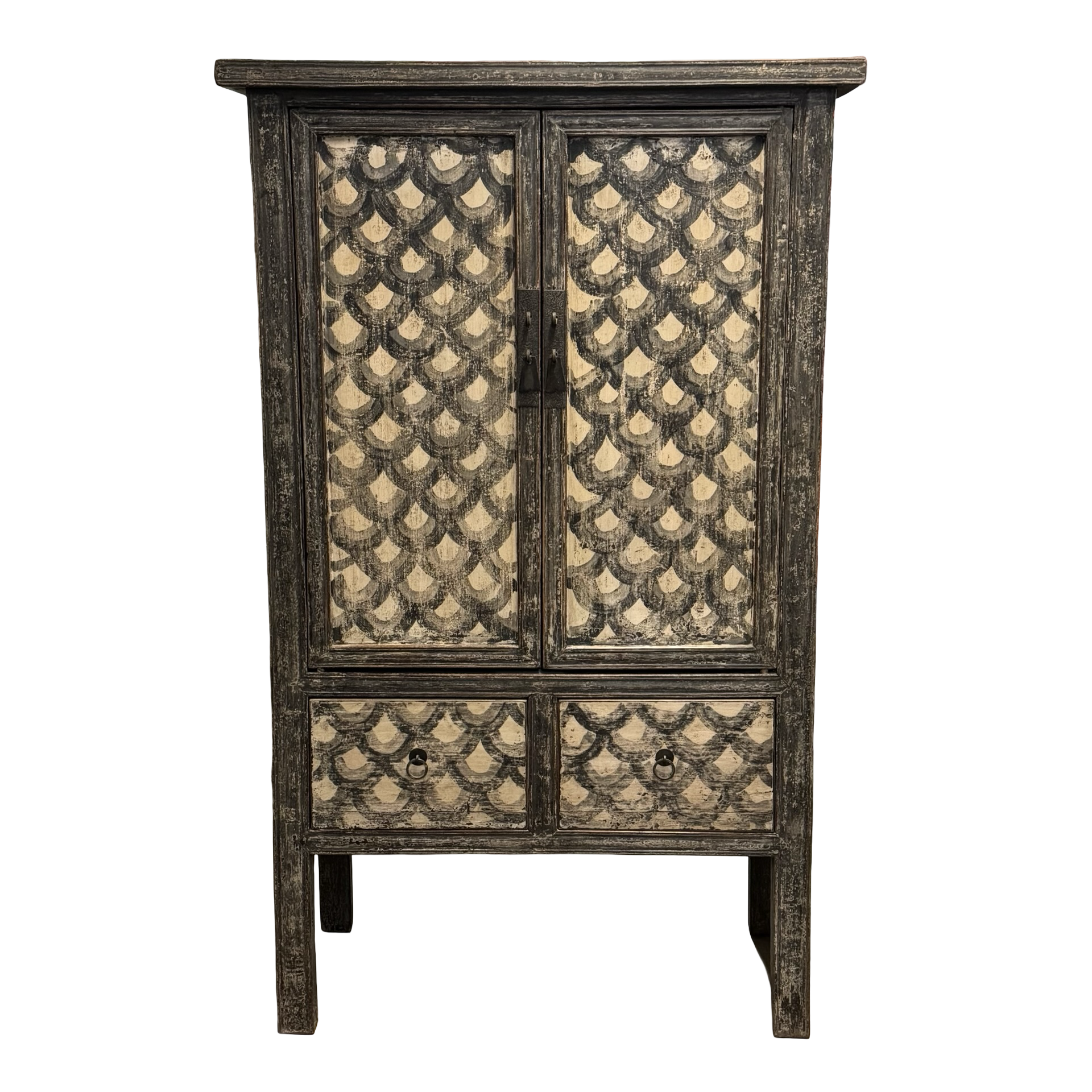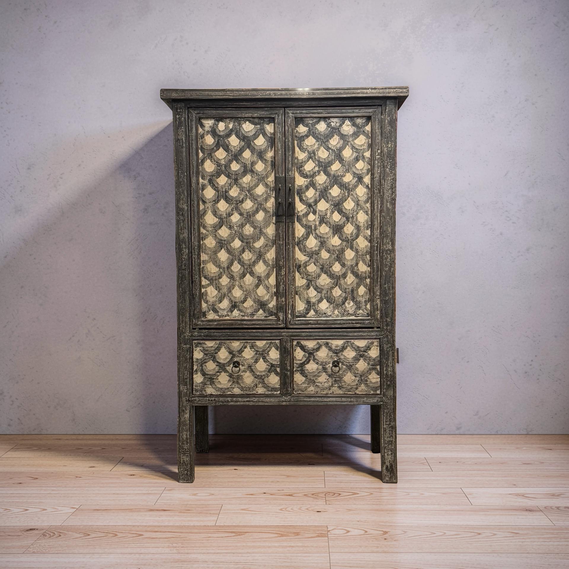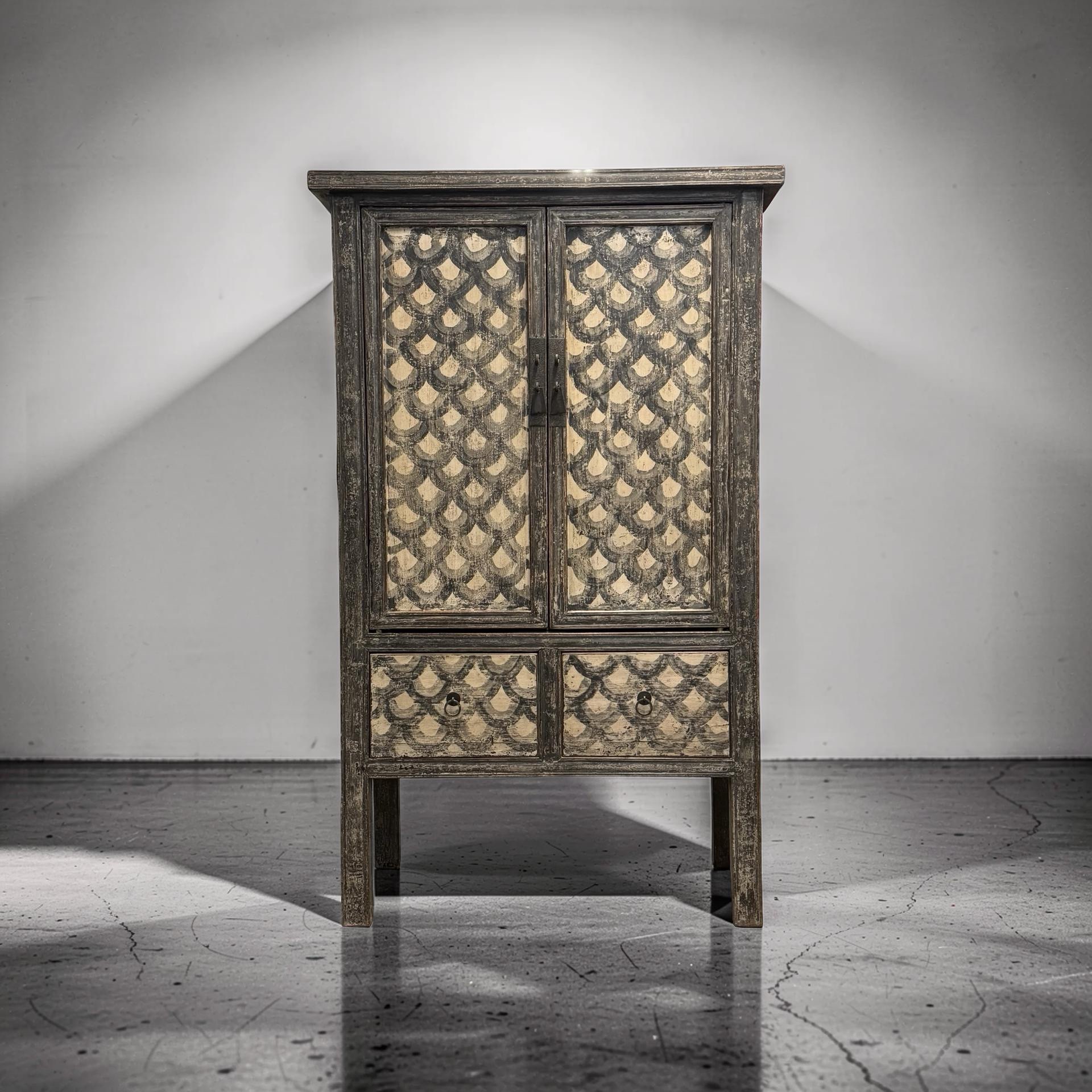 Deze unieke kast uit China is handgemaakt en uitgevoerd in een verfijnde combinatie van zwart en beige met een subtiel, decoratief motief. Voorzien van twee deuren en twee lades biedt het meubel een harmonieuze balans tussen functionaliteit en esthetiek.