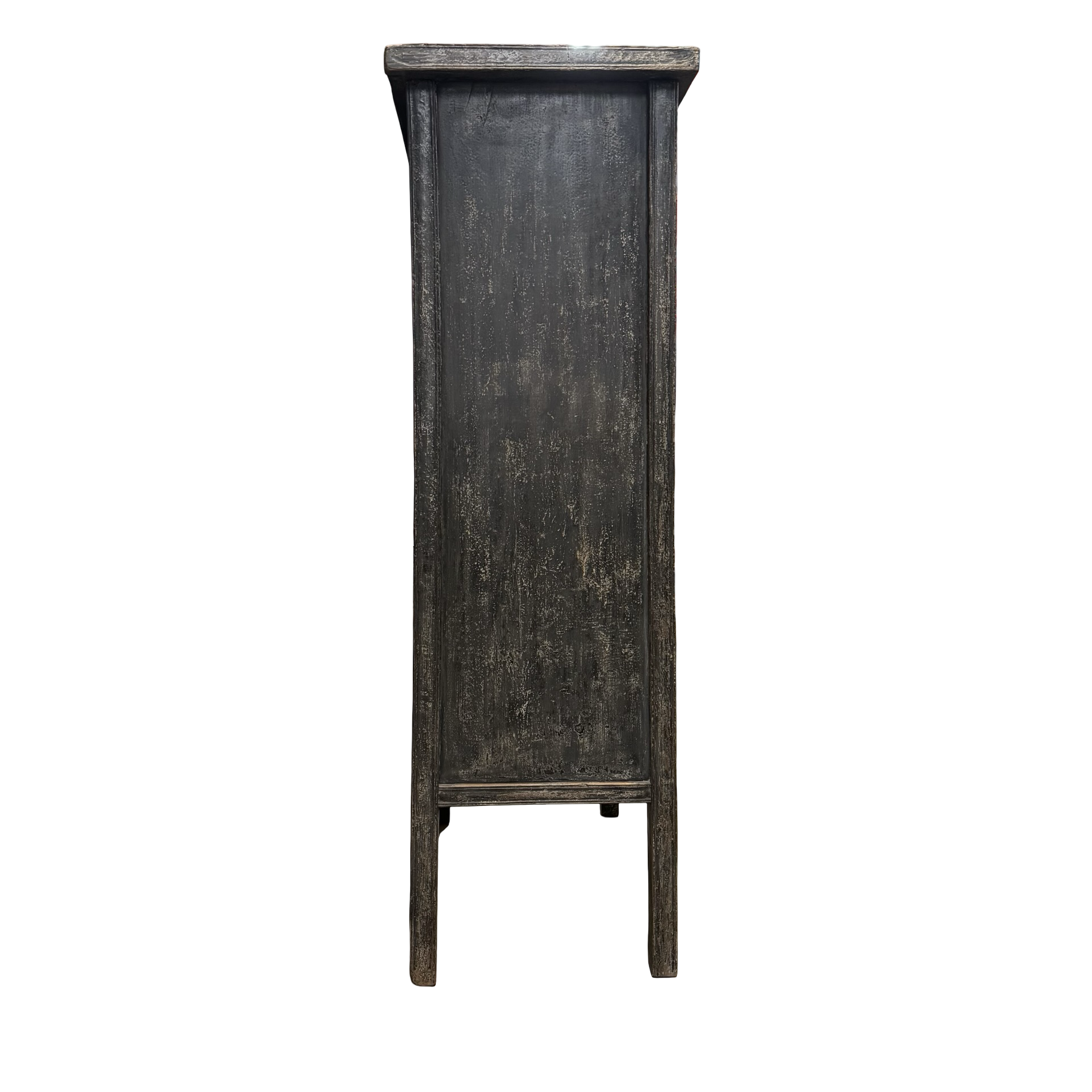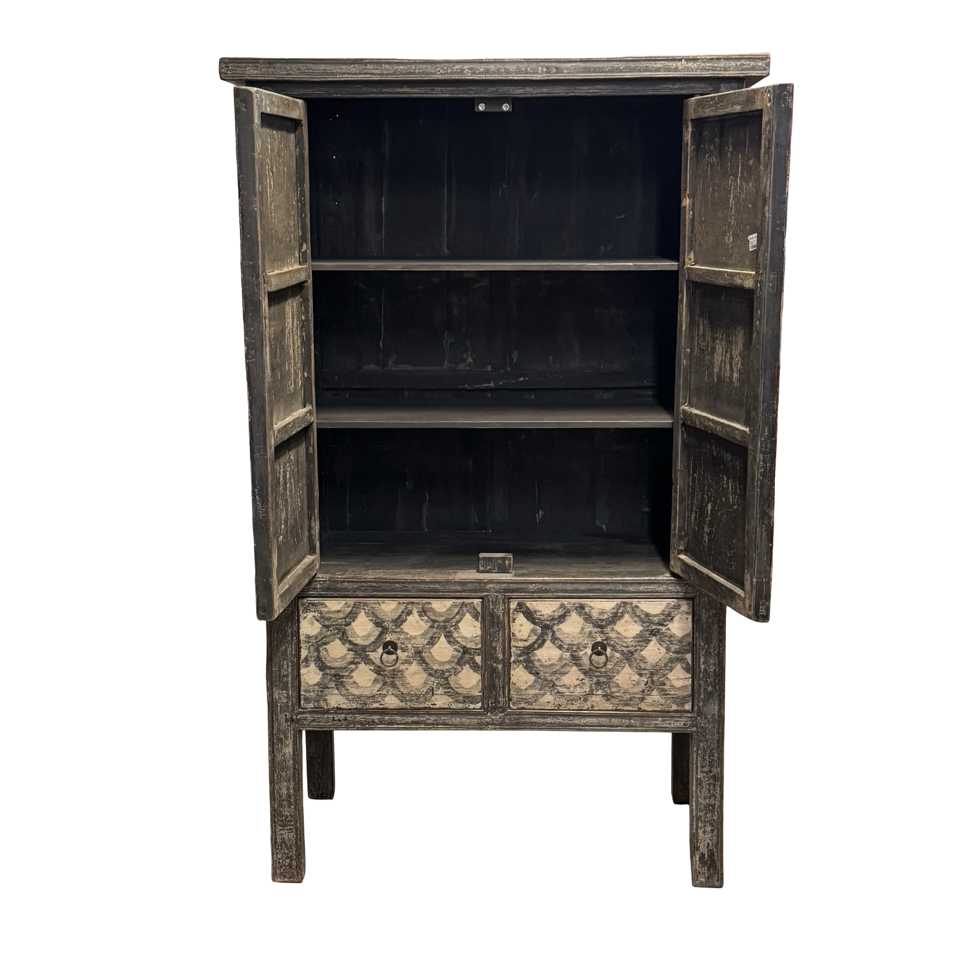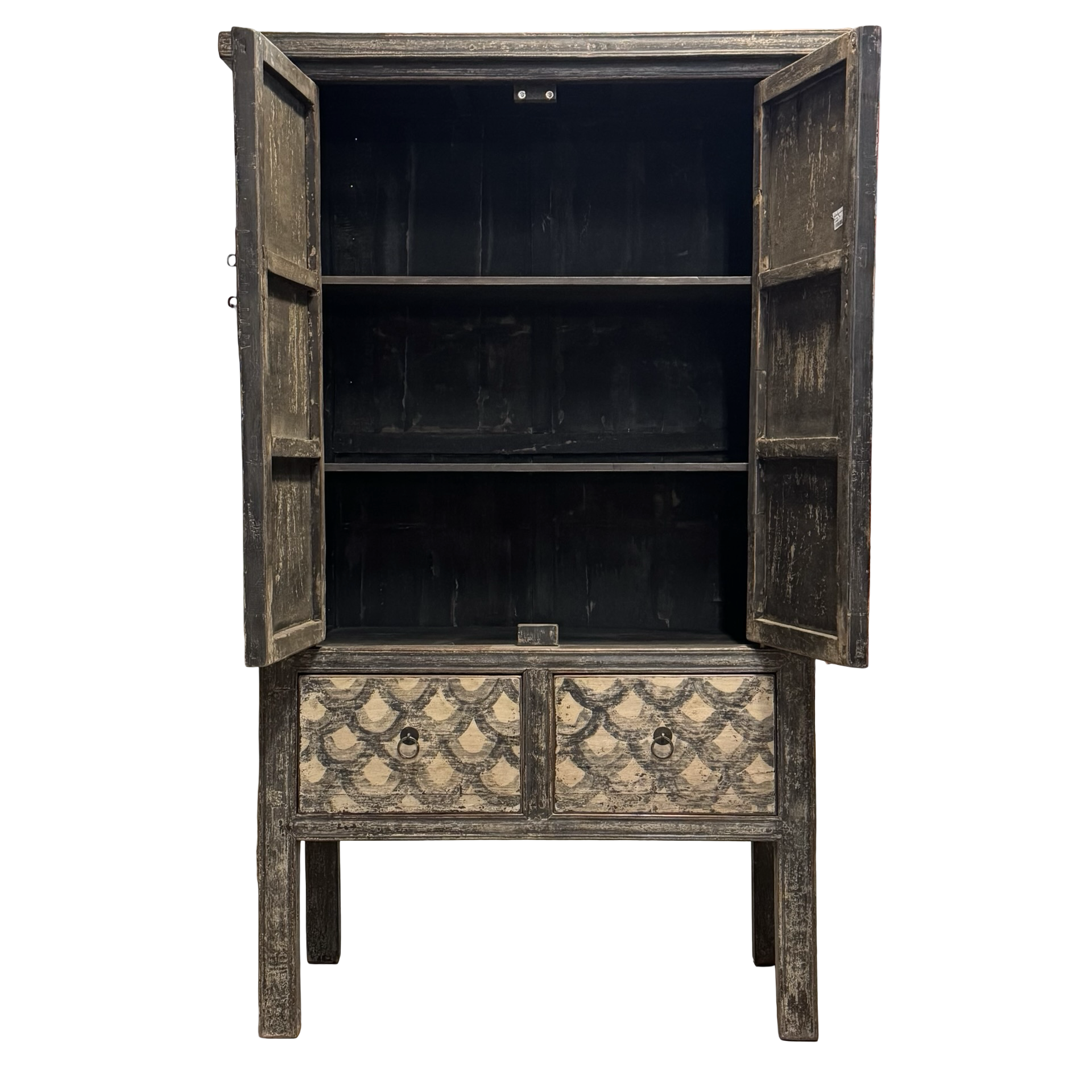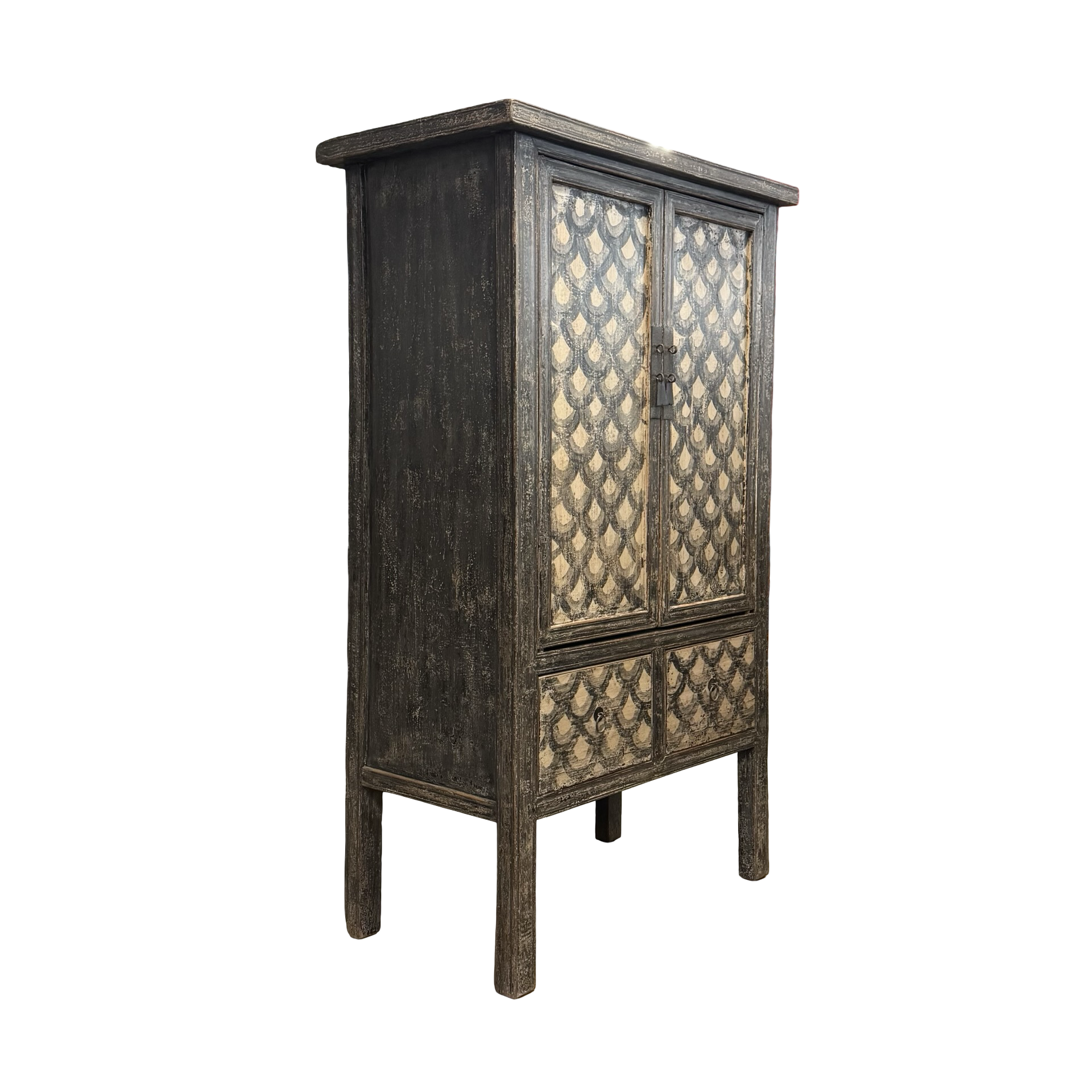 Deze unieke kast uit China is handgemaakt en uitgevoerd in een verfijnde combinatie van zwart en beige met een subtiel, decoratief motief. Voorzien van twee deuren en twee lades biedt het meubel een harmonieuze balans tussen functionaliteit en esthetiek.