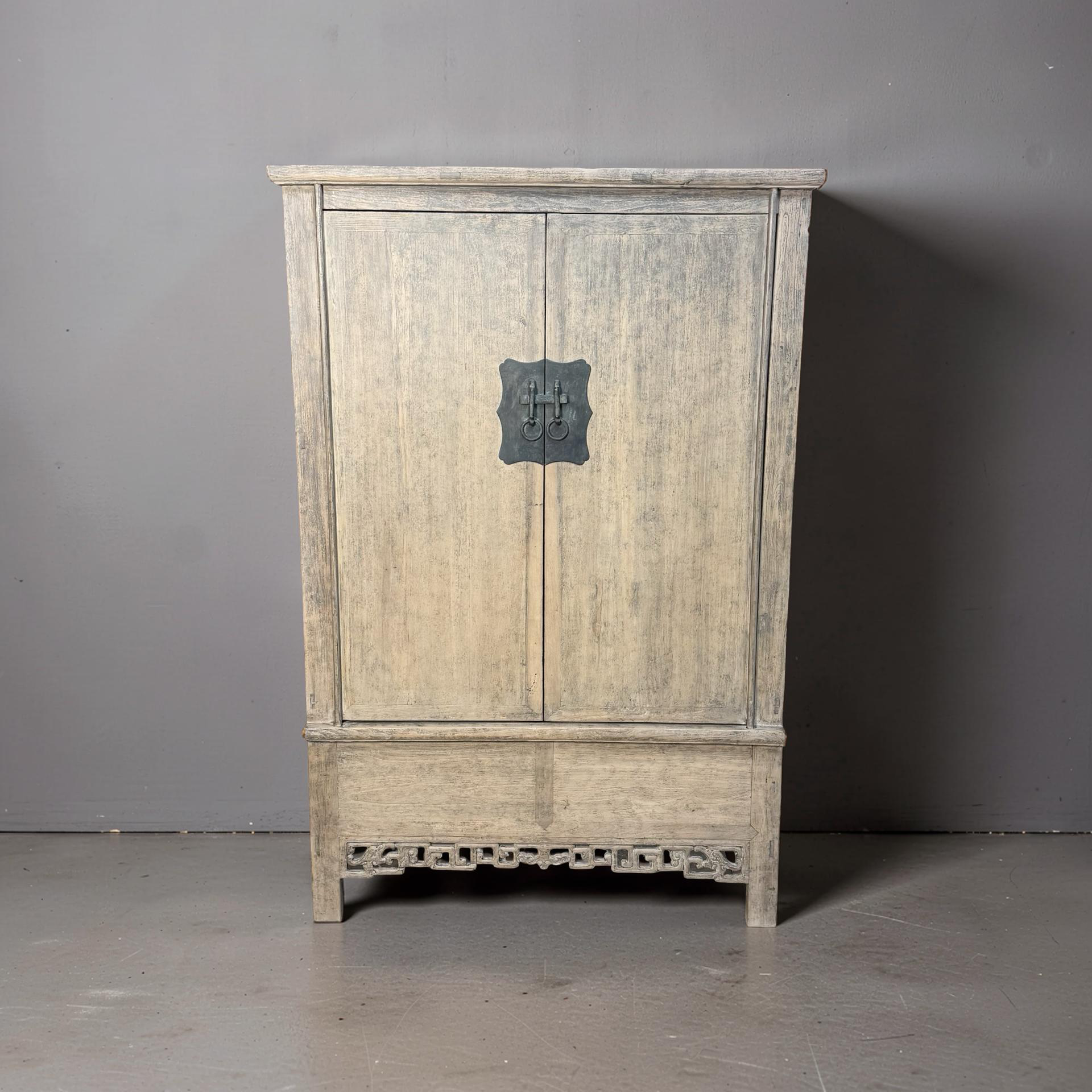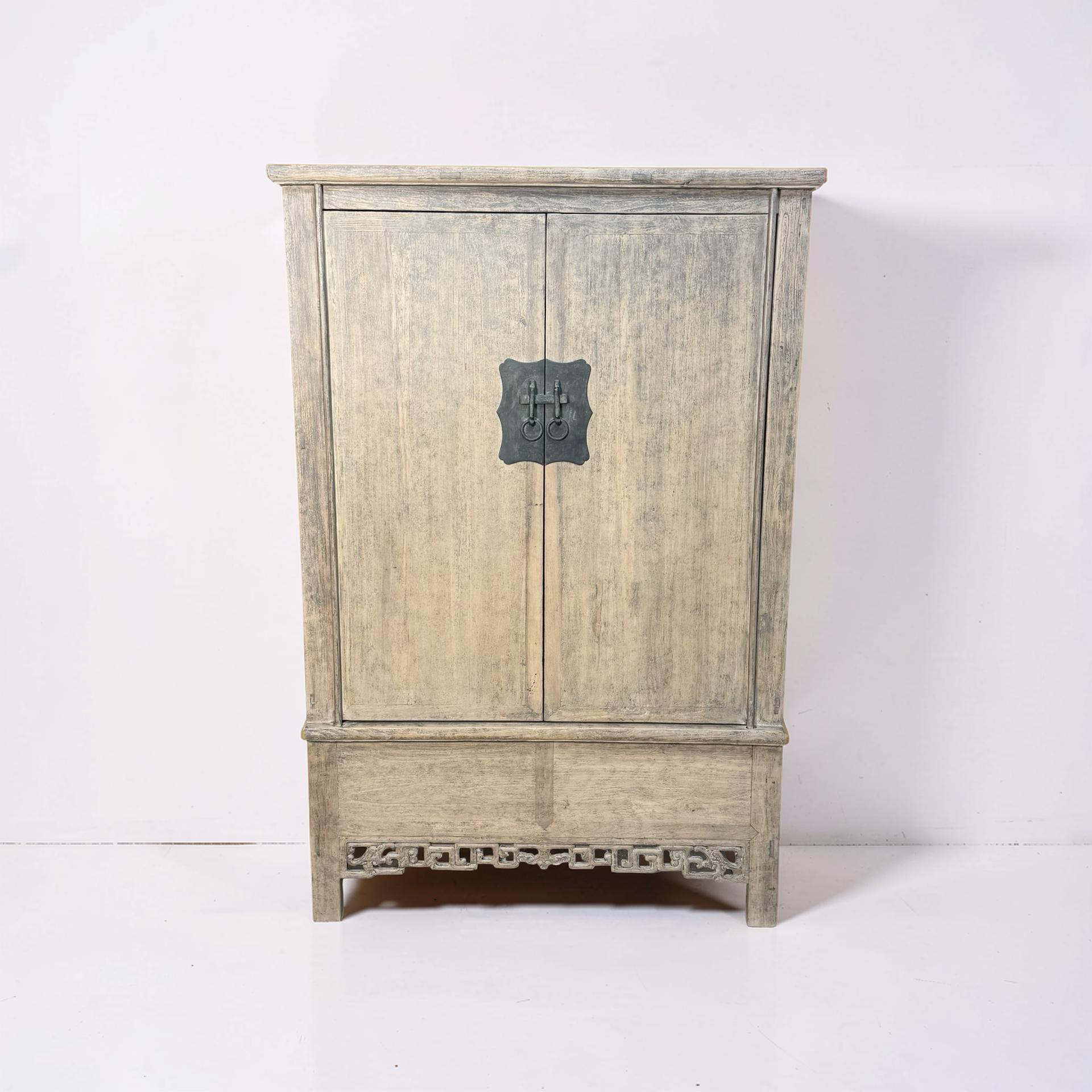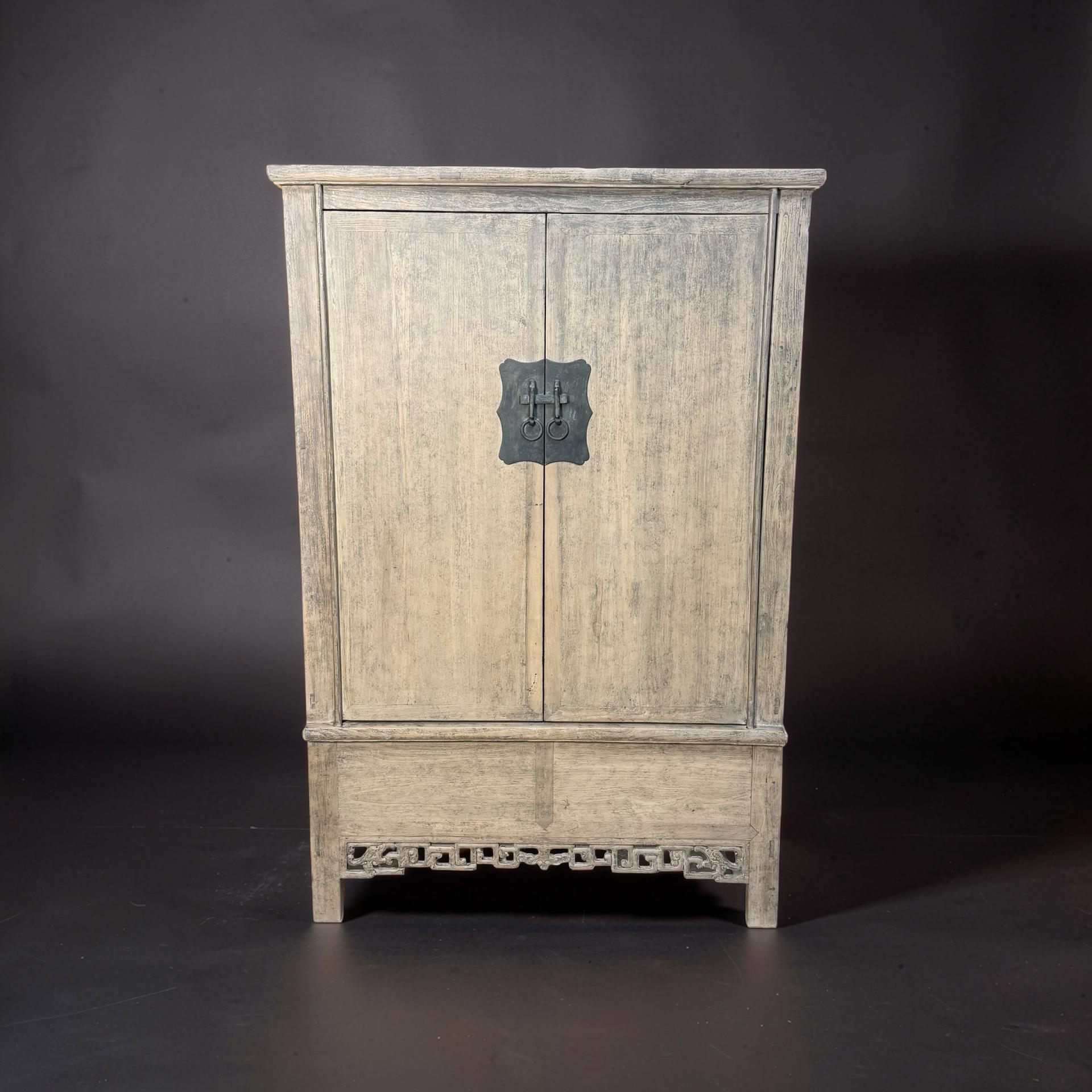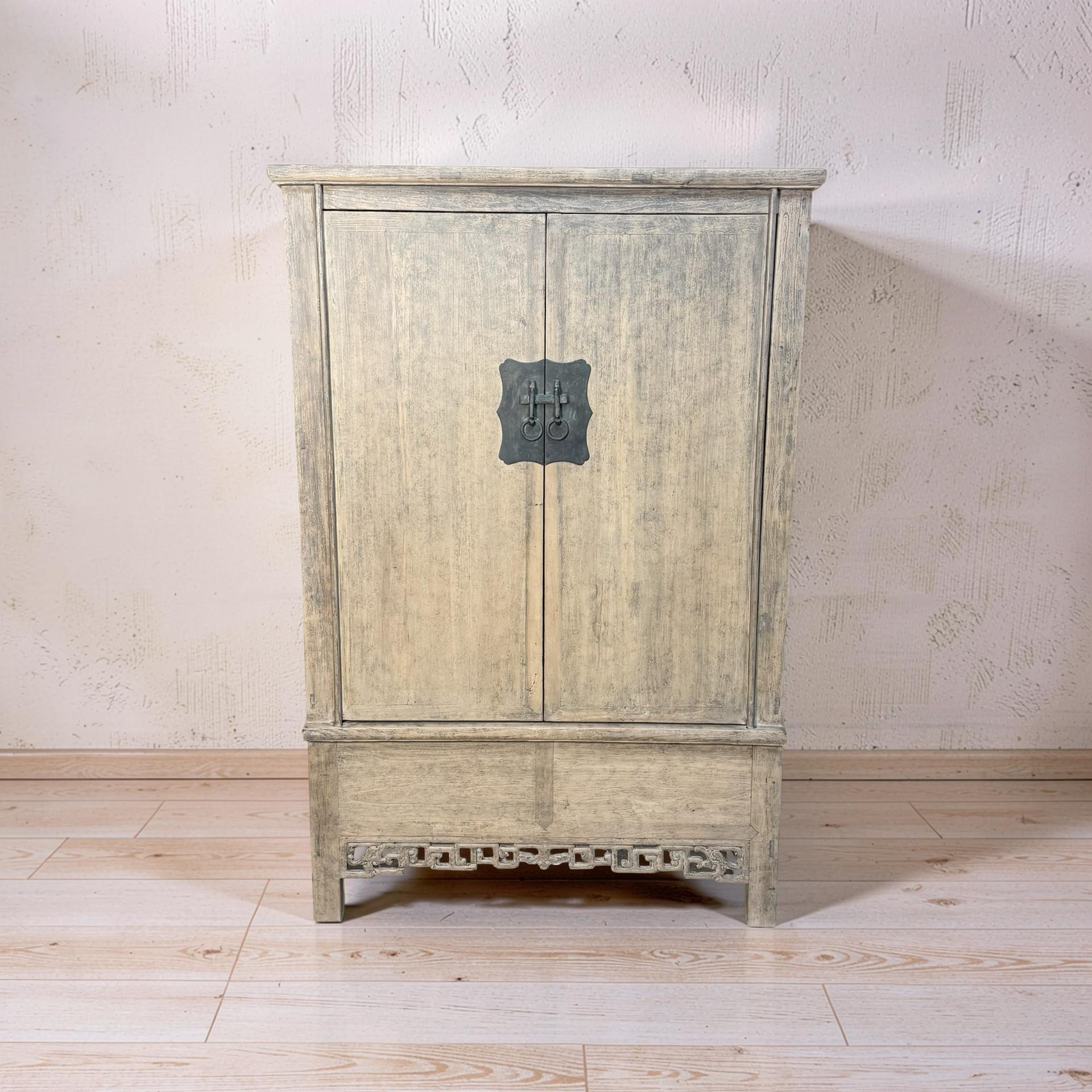 Deze unieke kast uit China is handgemaakt en uitgevoerd in naturel hout, waarbij de pure structuur en warme tinten volledig tot hun recht komen. Met twee deuren en twee lades biedt het meubel een praktische indeling met een rustige, natuurlijke uitstraling.