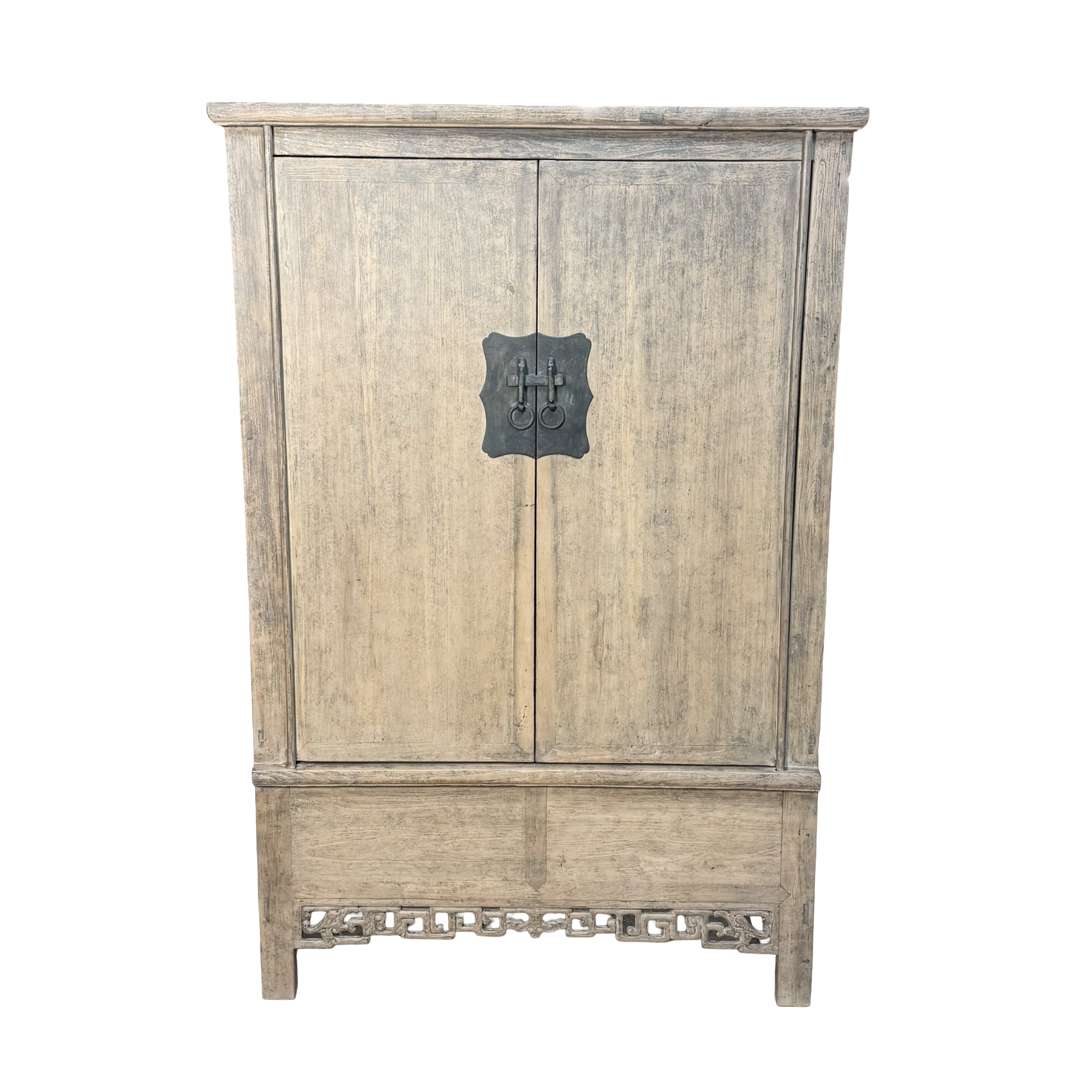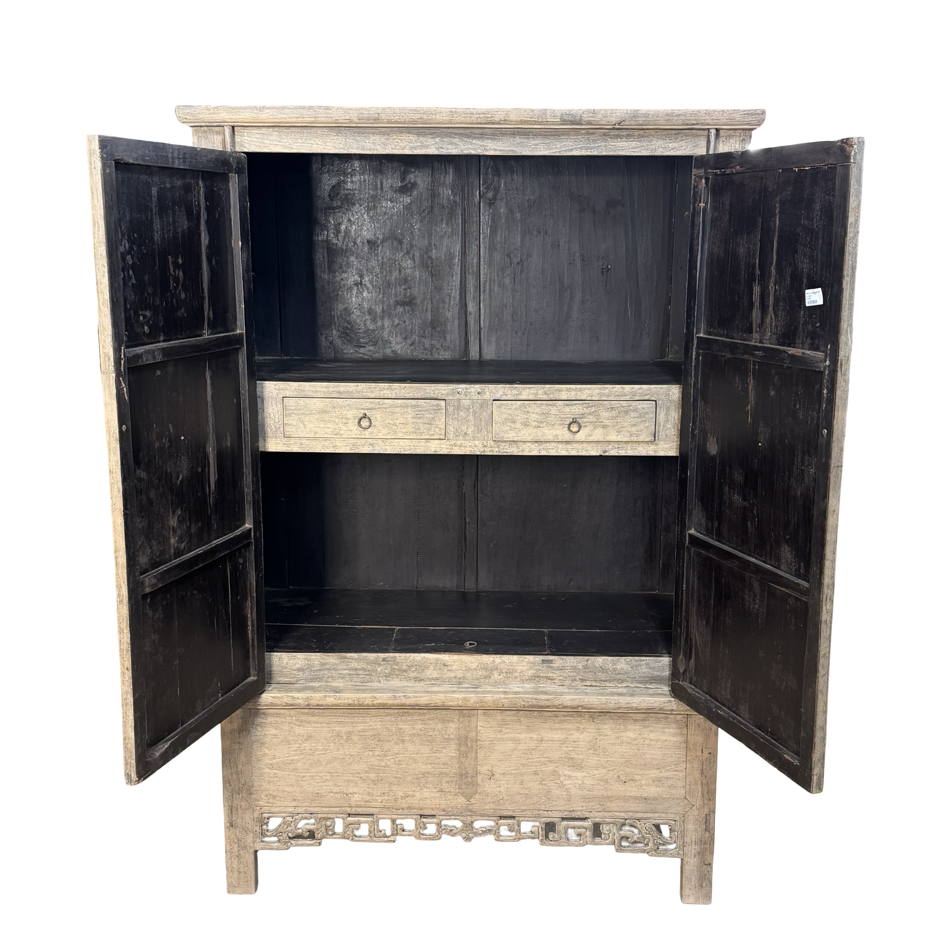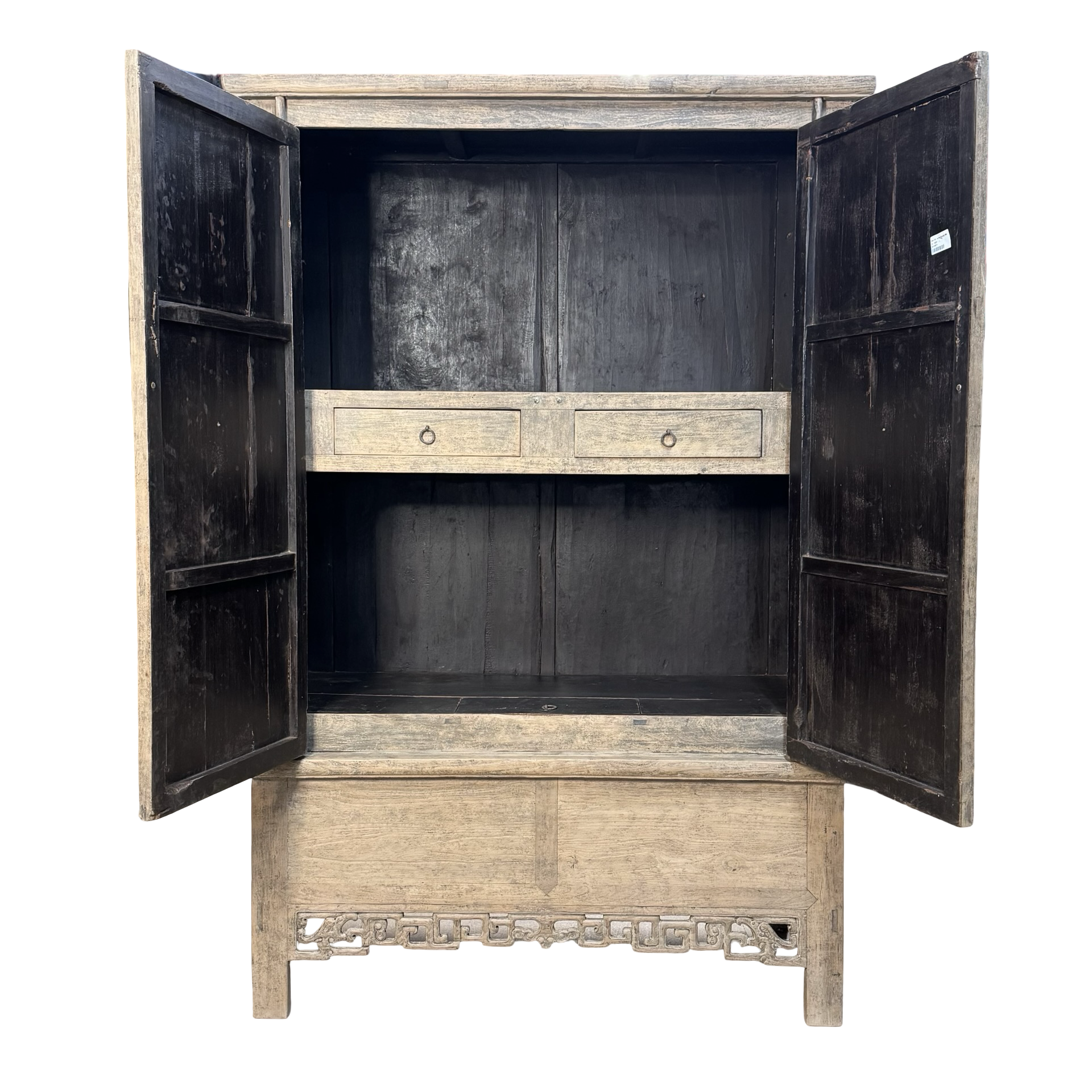 Deze unieke kast uit China is handgemaakt en uitgevoerd in naturel hout, waarbij de pure structuur en warme tinten volledig tot hun recht komen. Met twee deuren en twee lades biedt het meubel een praktische indeling met een rustige, natuurlijke uitstraling.