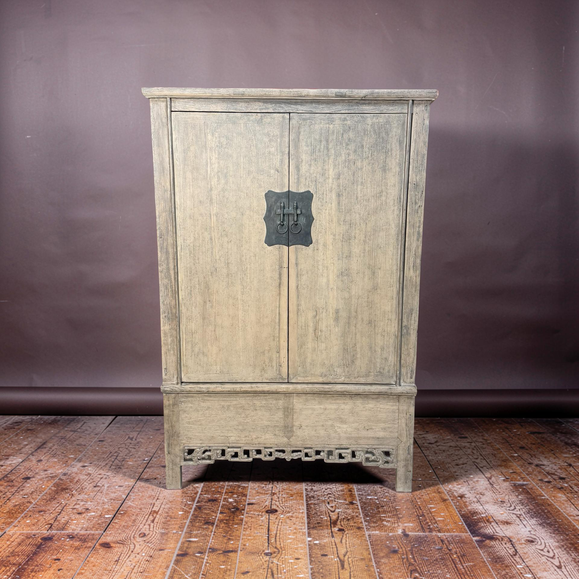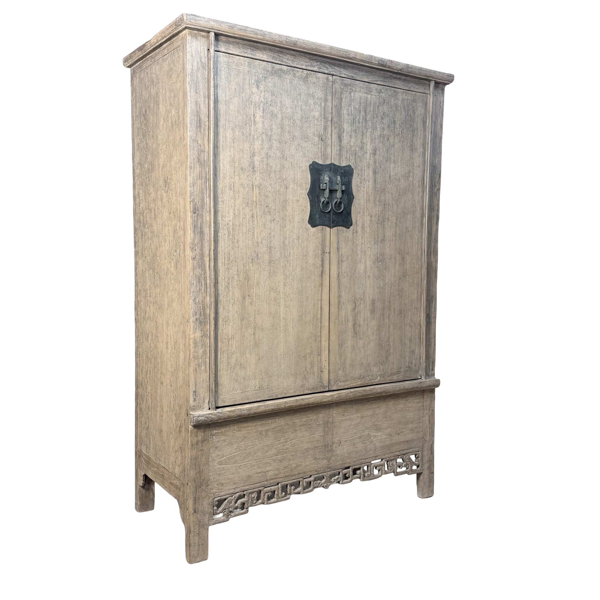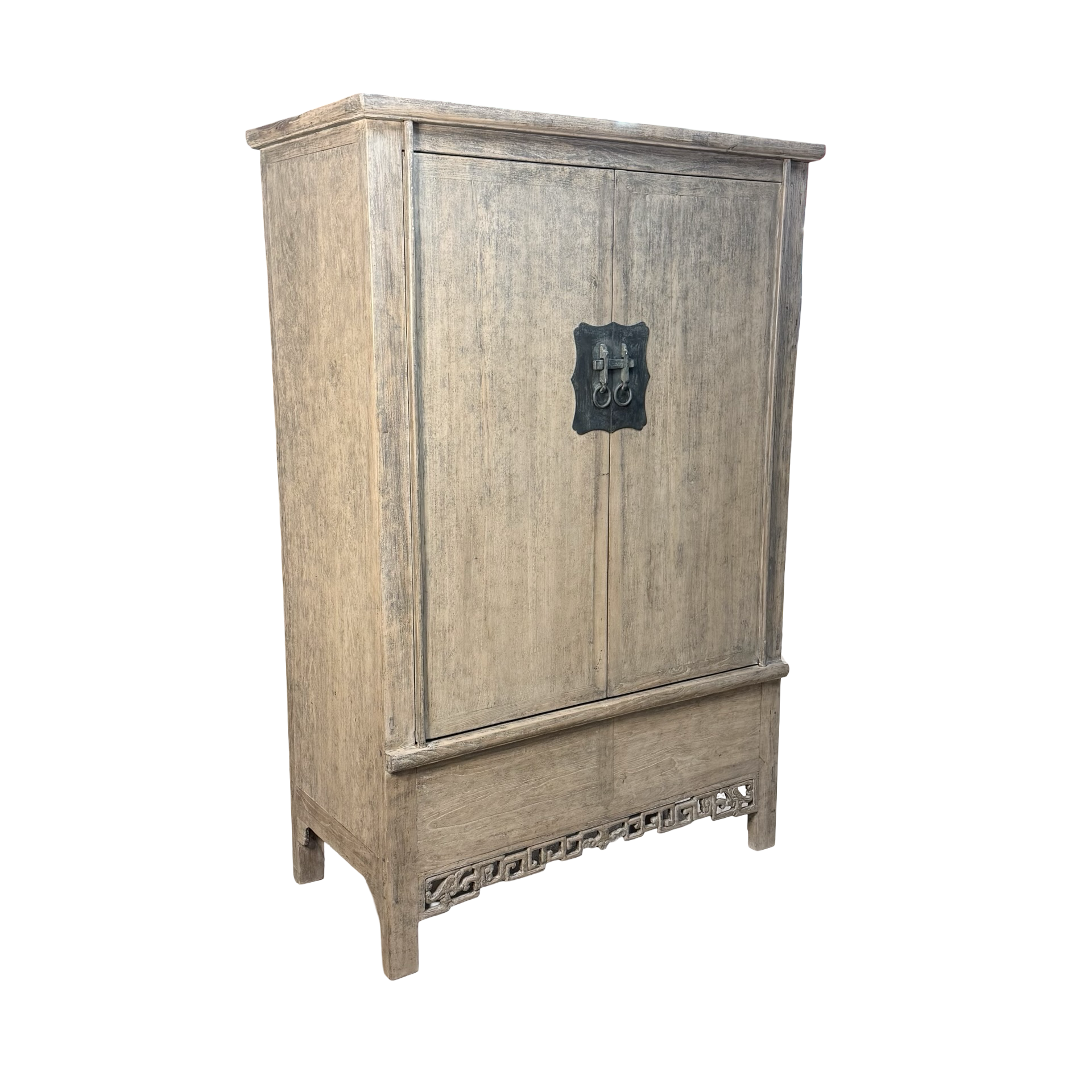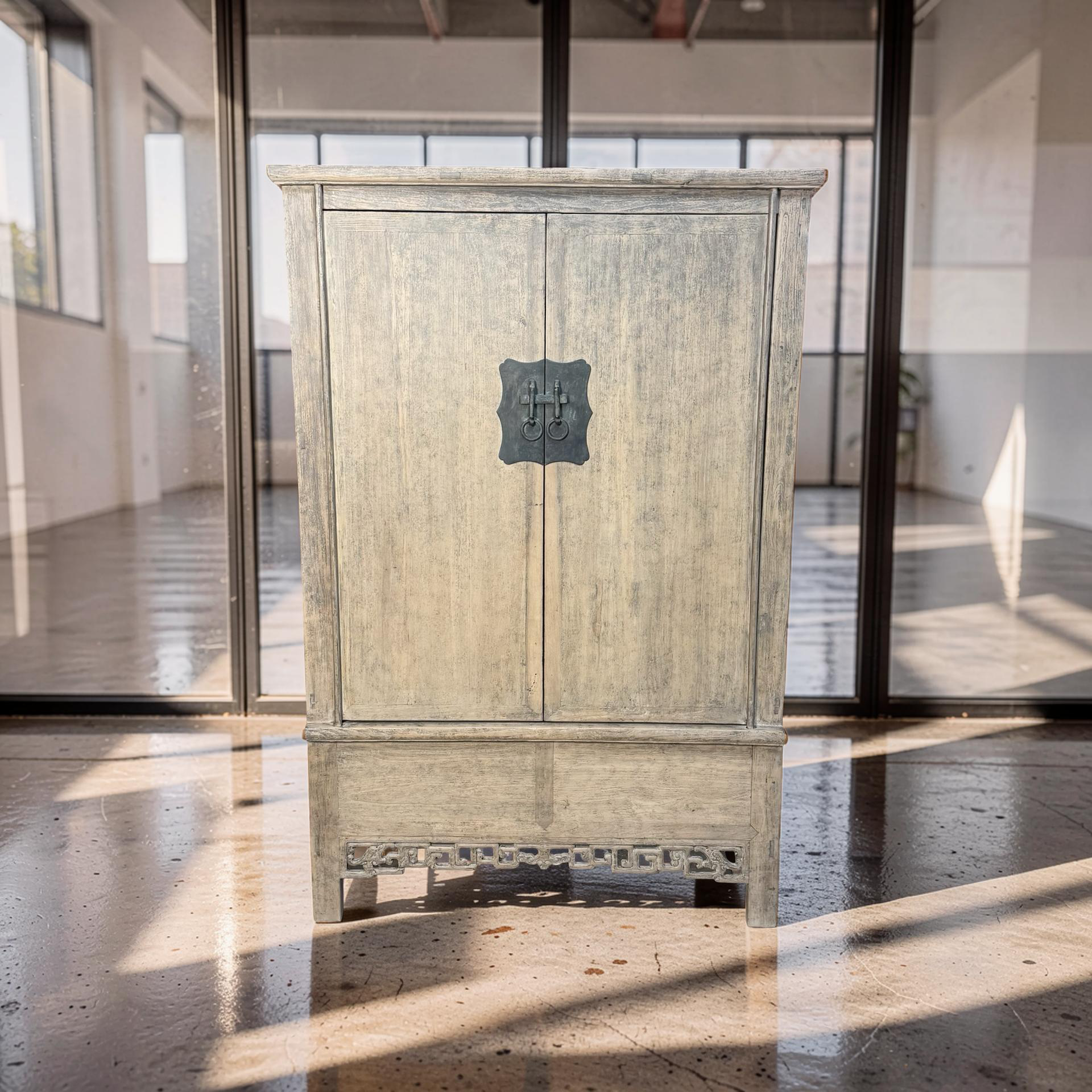 Deze unieke kast uit China is handgemaakt en uitgevoerd in naturel hout, waarbij de pure structuur en warme tinten volledig tot hun recht komen. Met twee deuren en twee lades biedt het meubel een praktische indeling met een rustige, natuurlijke uitstraling.