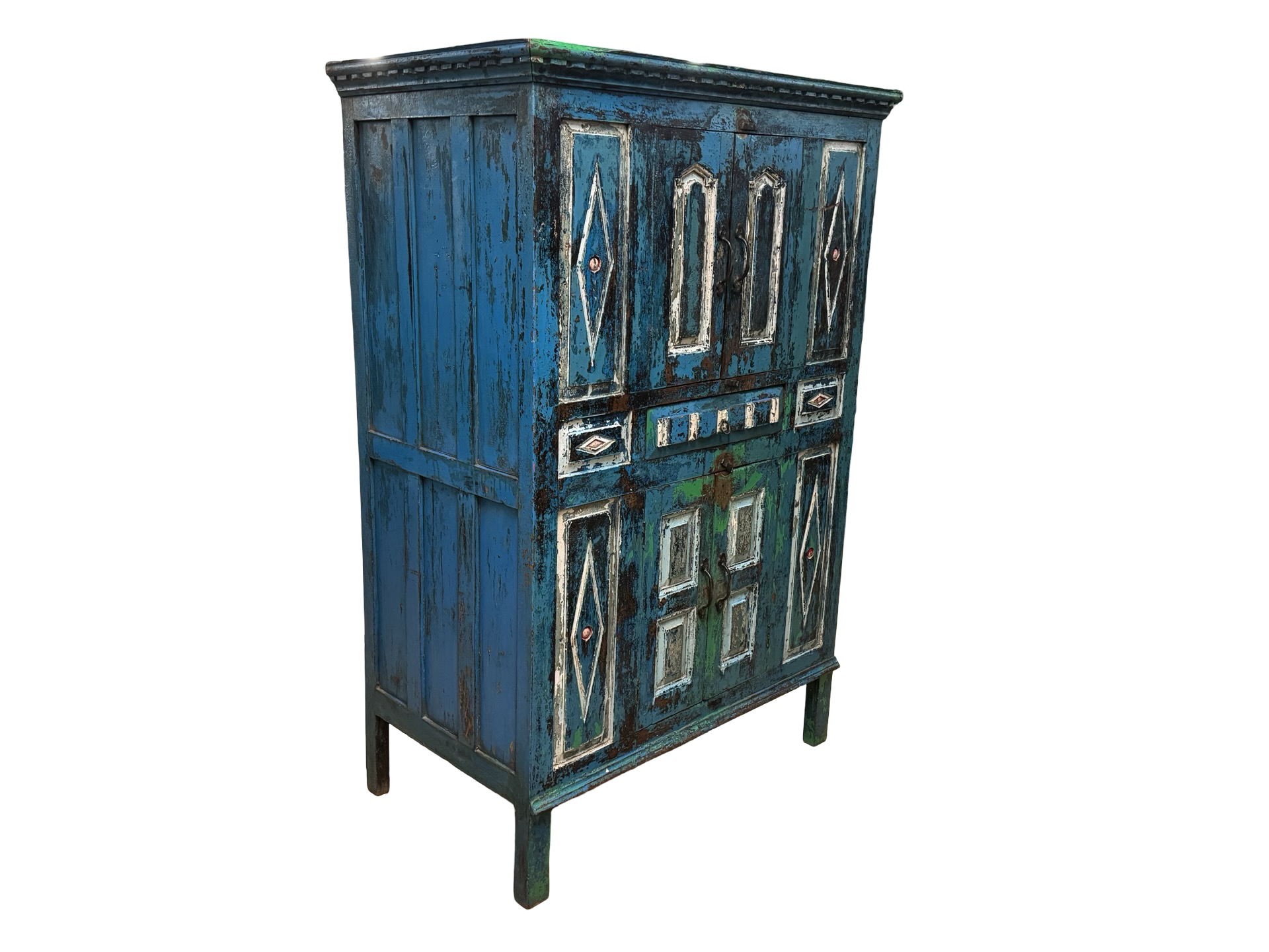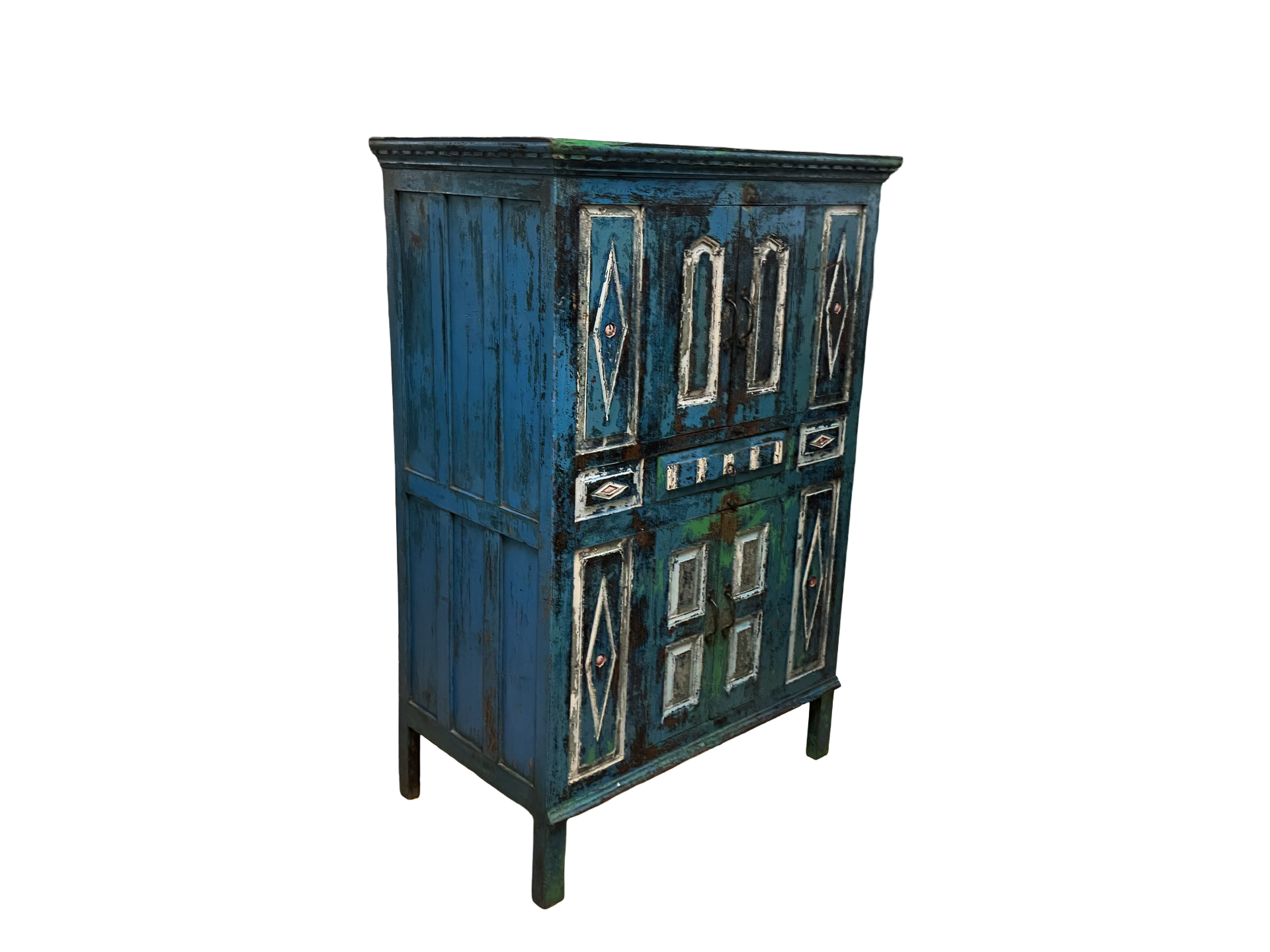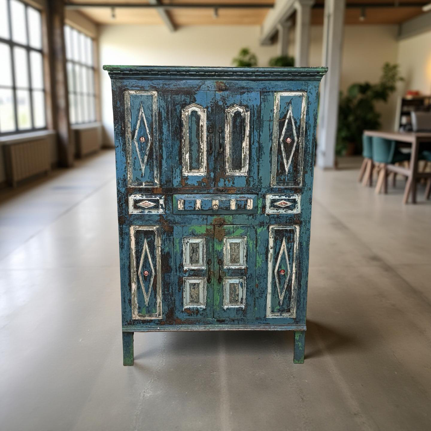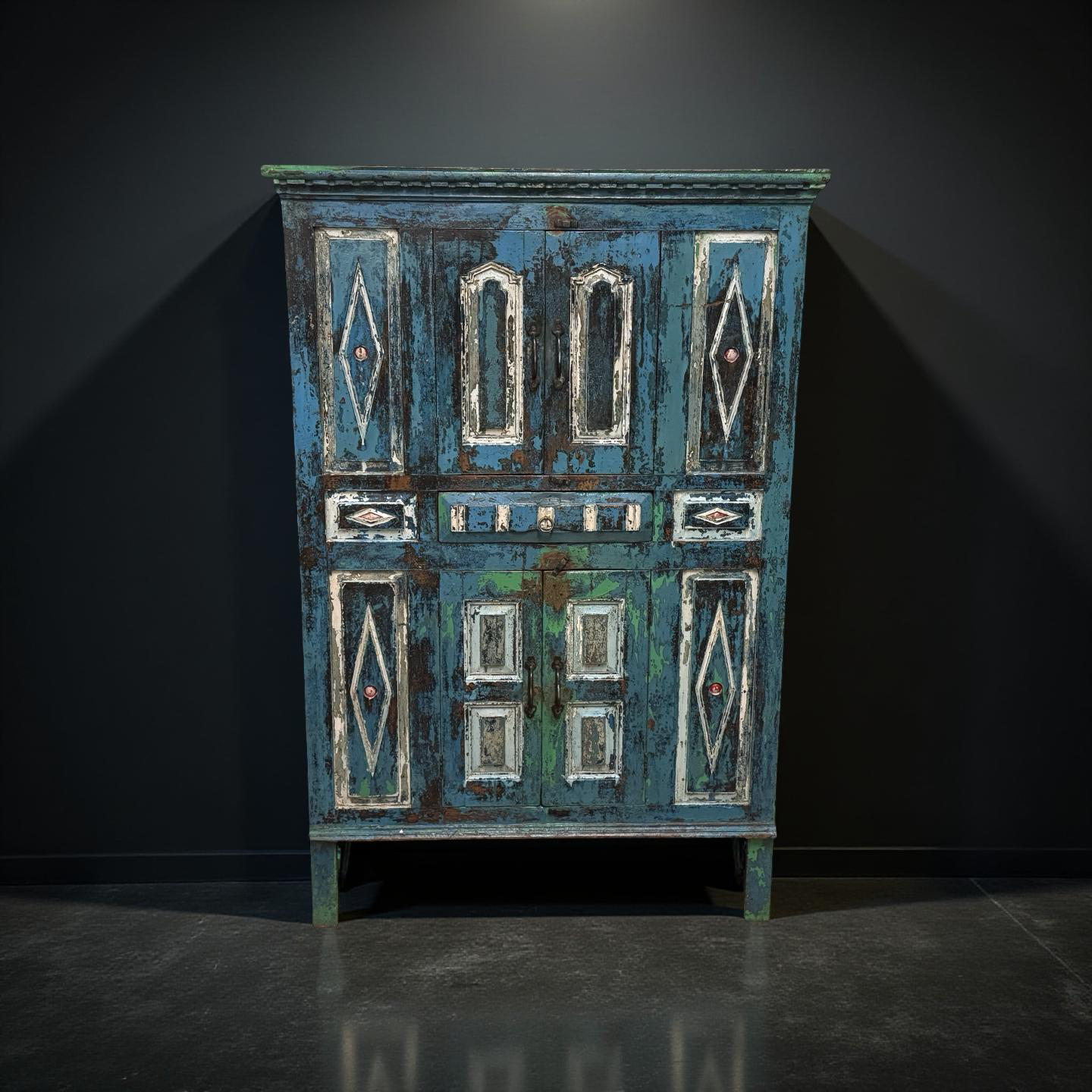 Deze authentieke blauwe kast uit India is een echte eyecatcher! Met vier deuren en een handige lade biedt hij volop opbergruimte.