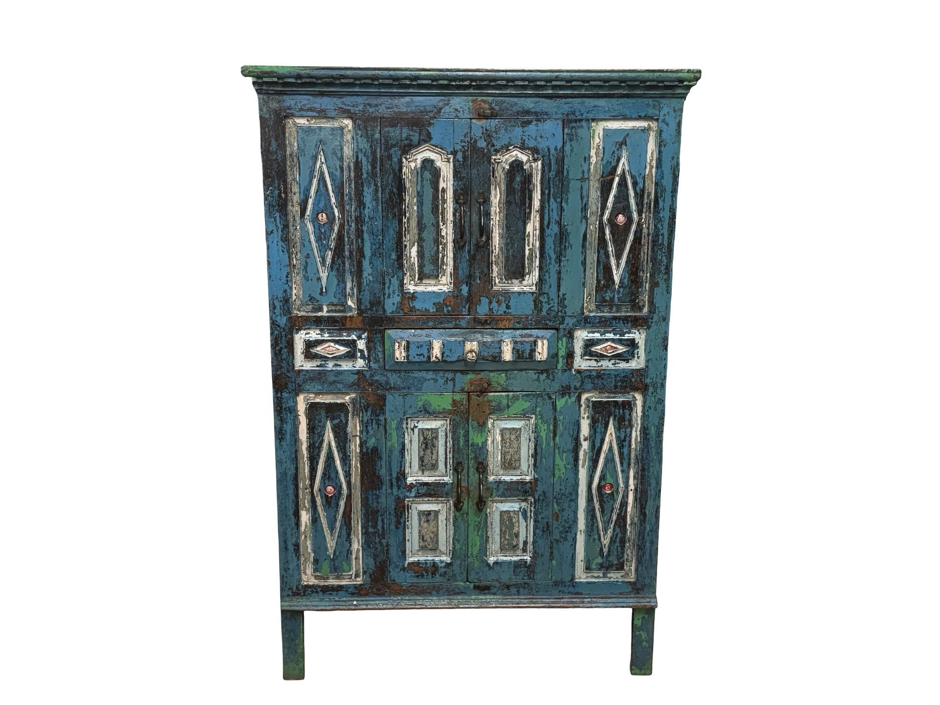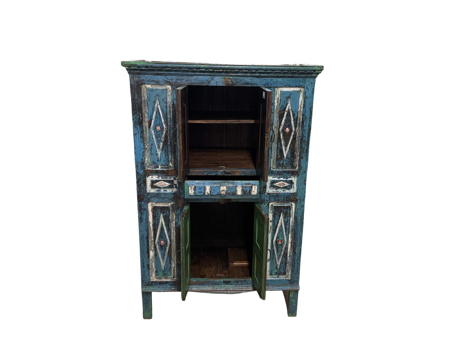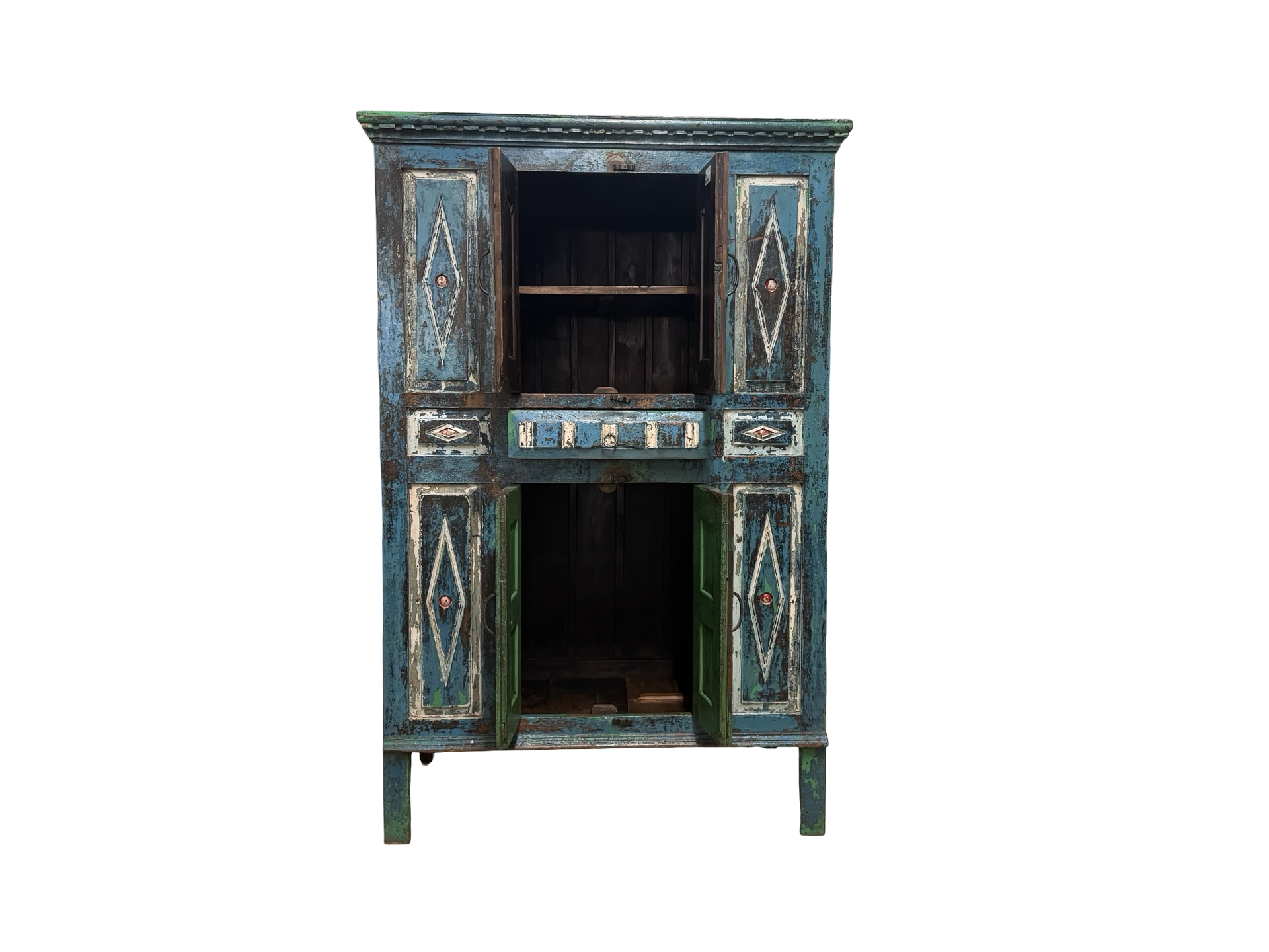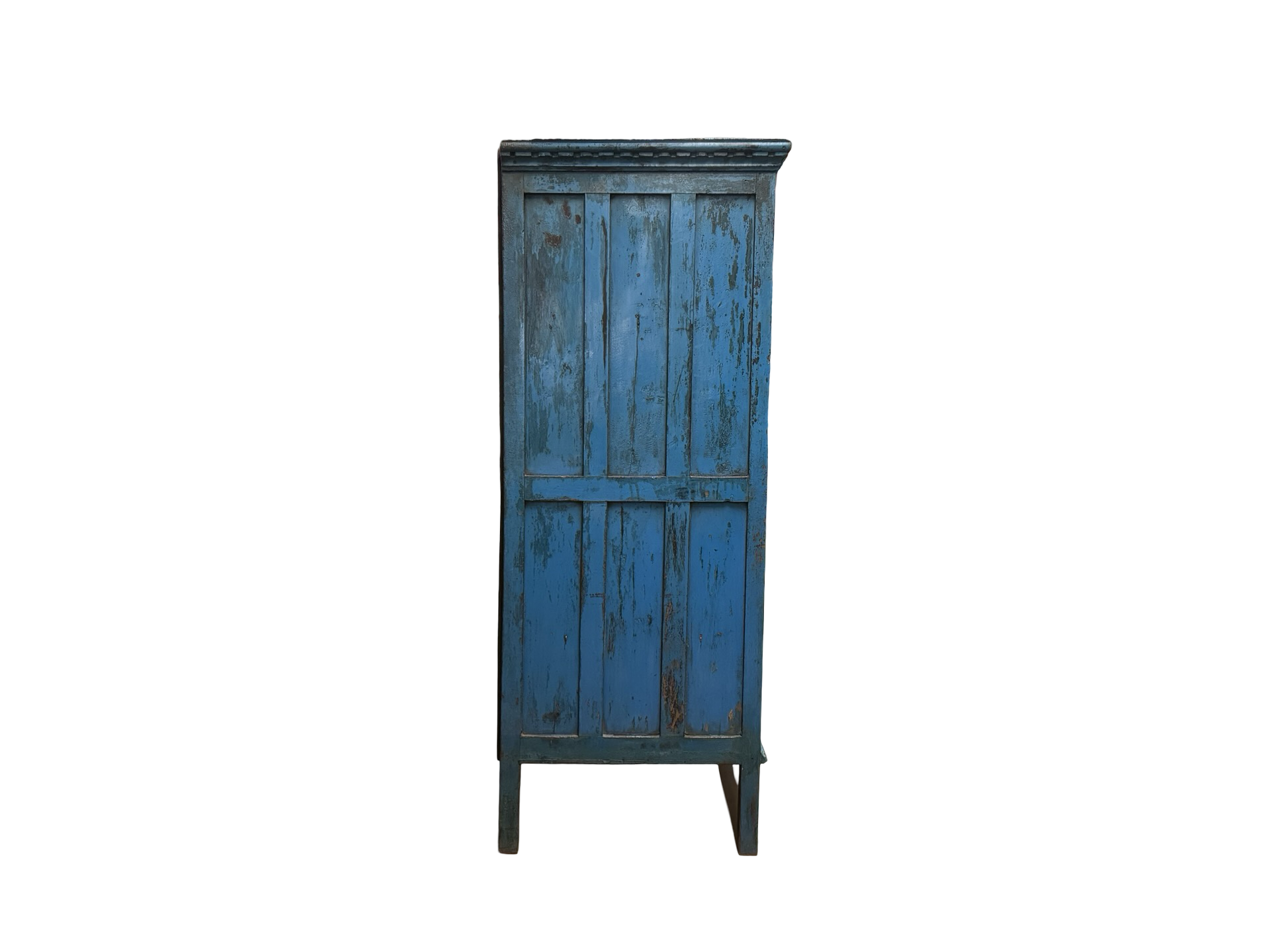Deze authentieke blauwe kast uit India is een echte eyecatcher! Met vier deuren en een handige lade biedt hij volop opbergruimte.