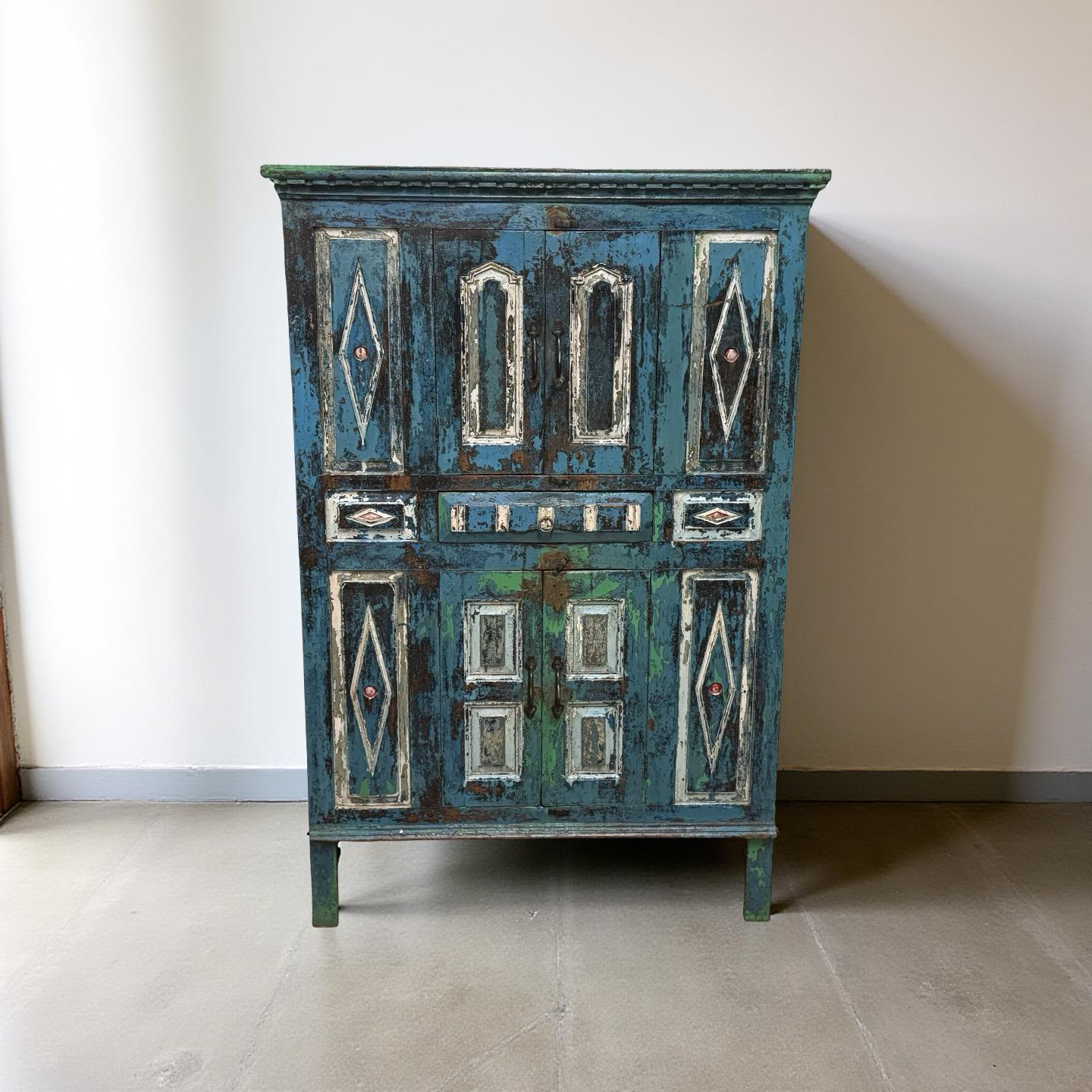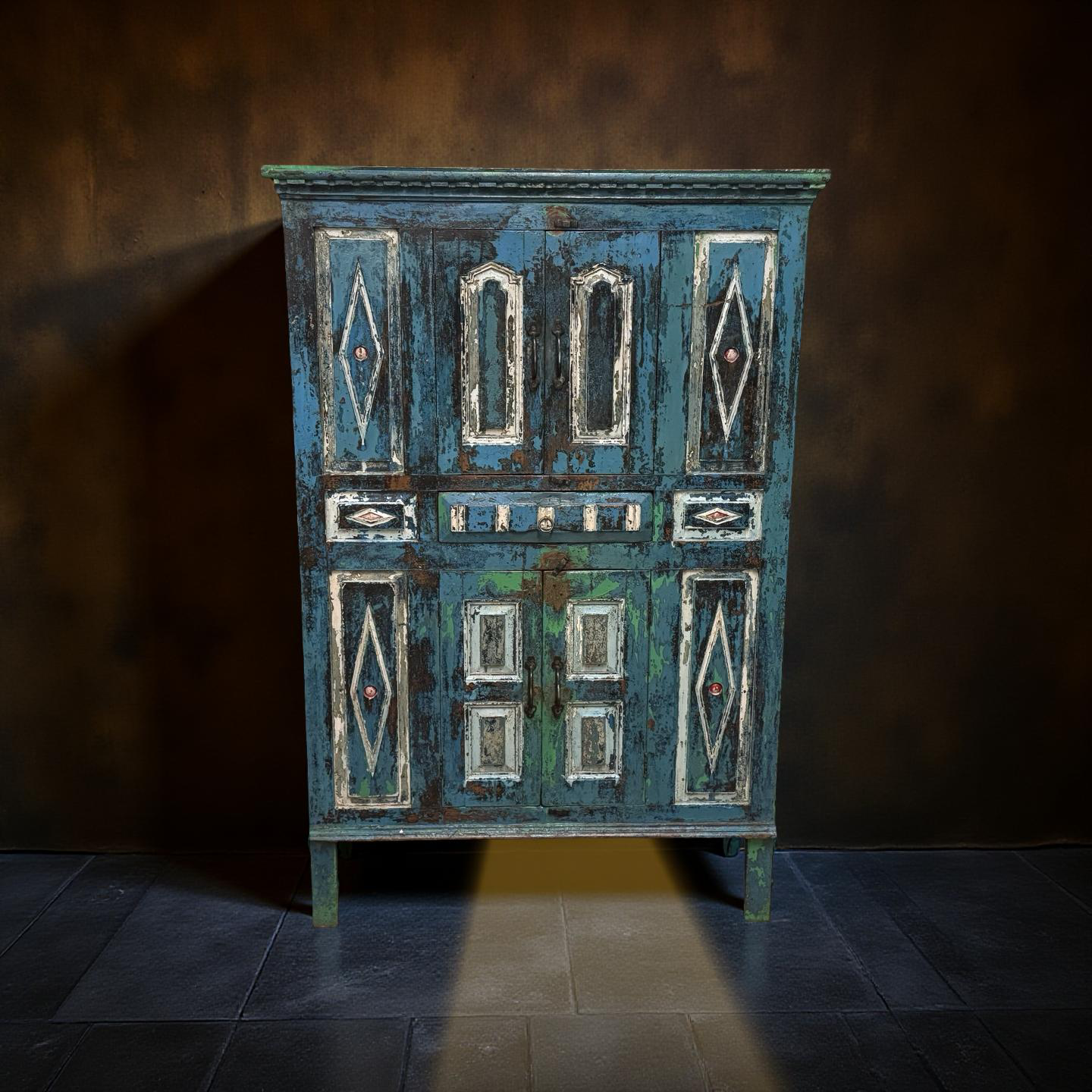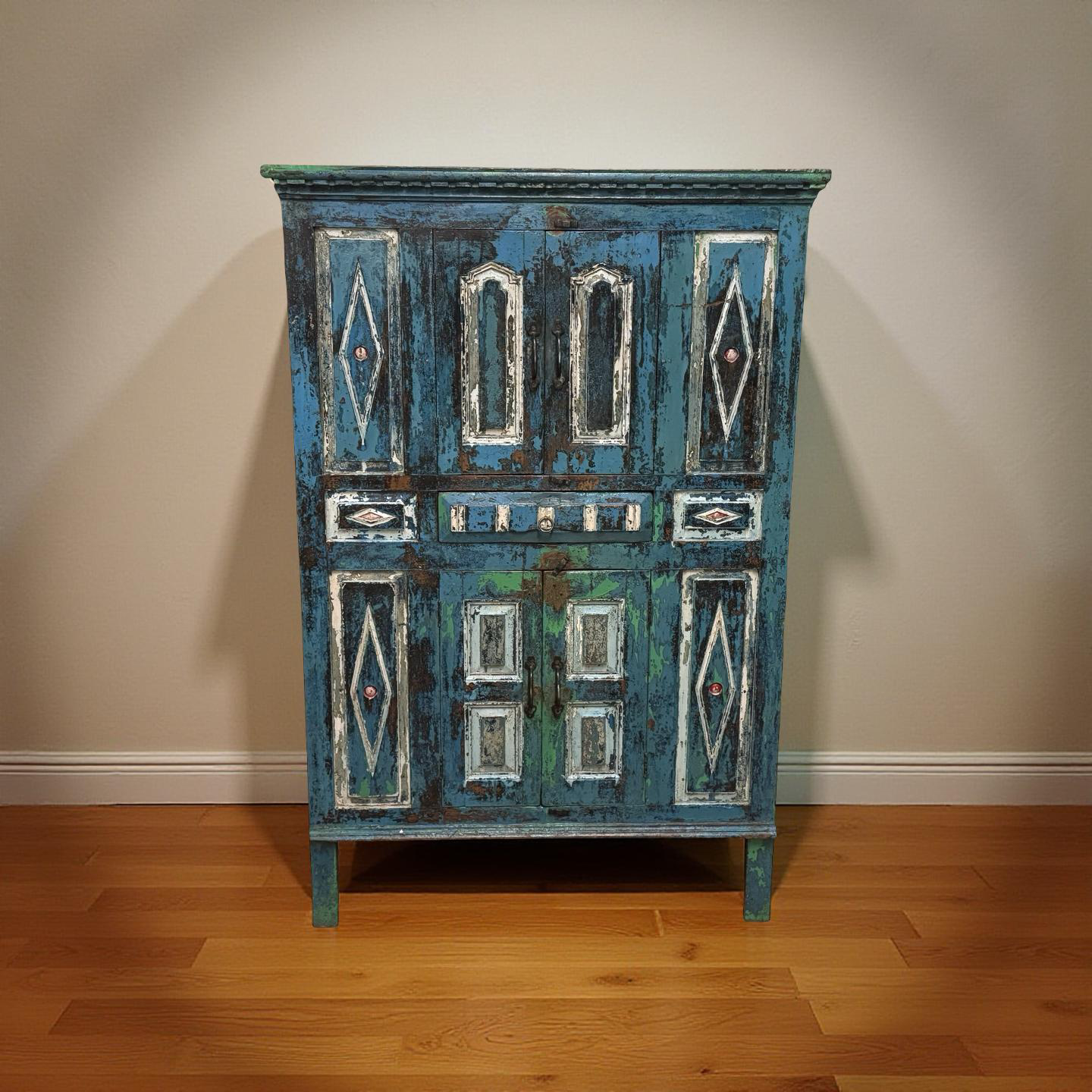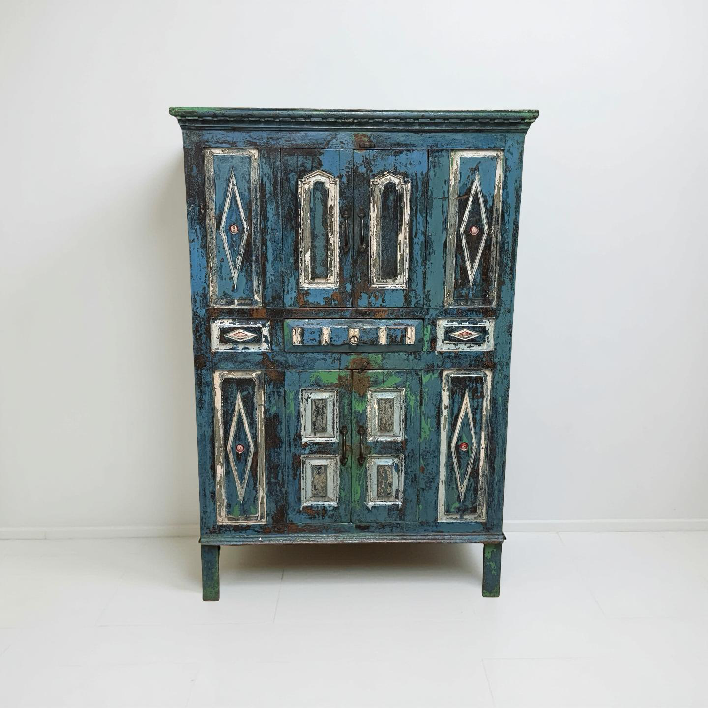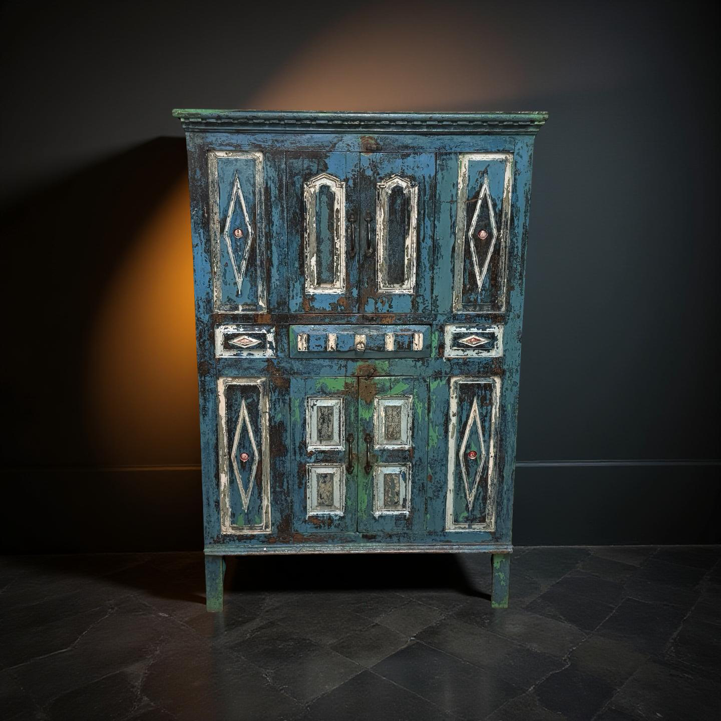 Deze authentieke blauwe kast uit India is een echte eyecatcher! Met vier deuren en een handige lade biedt hij volop opbergruimte.