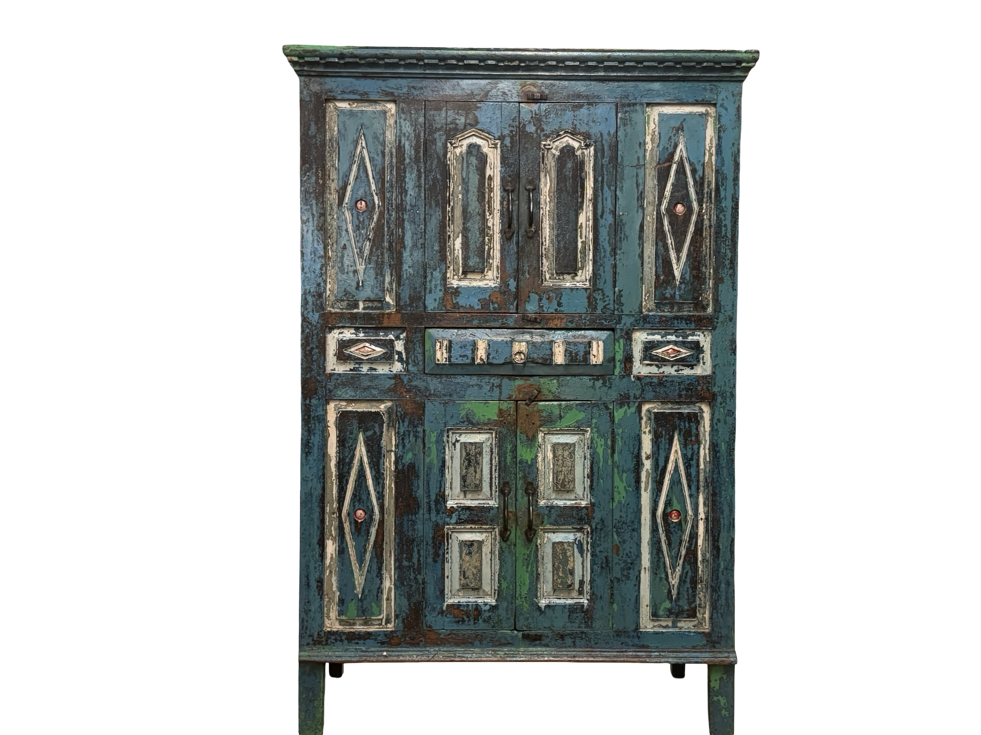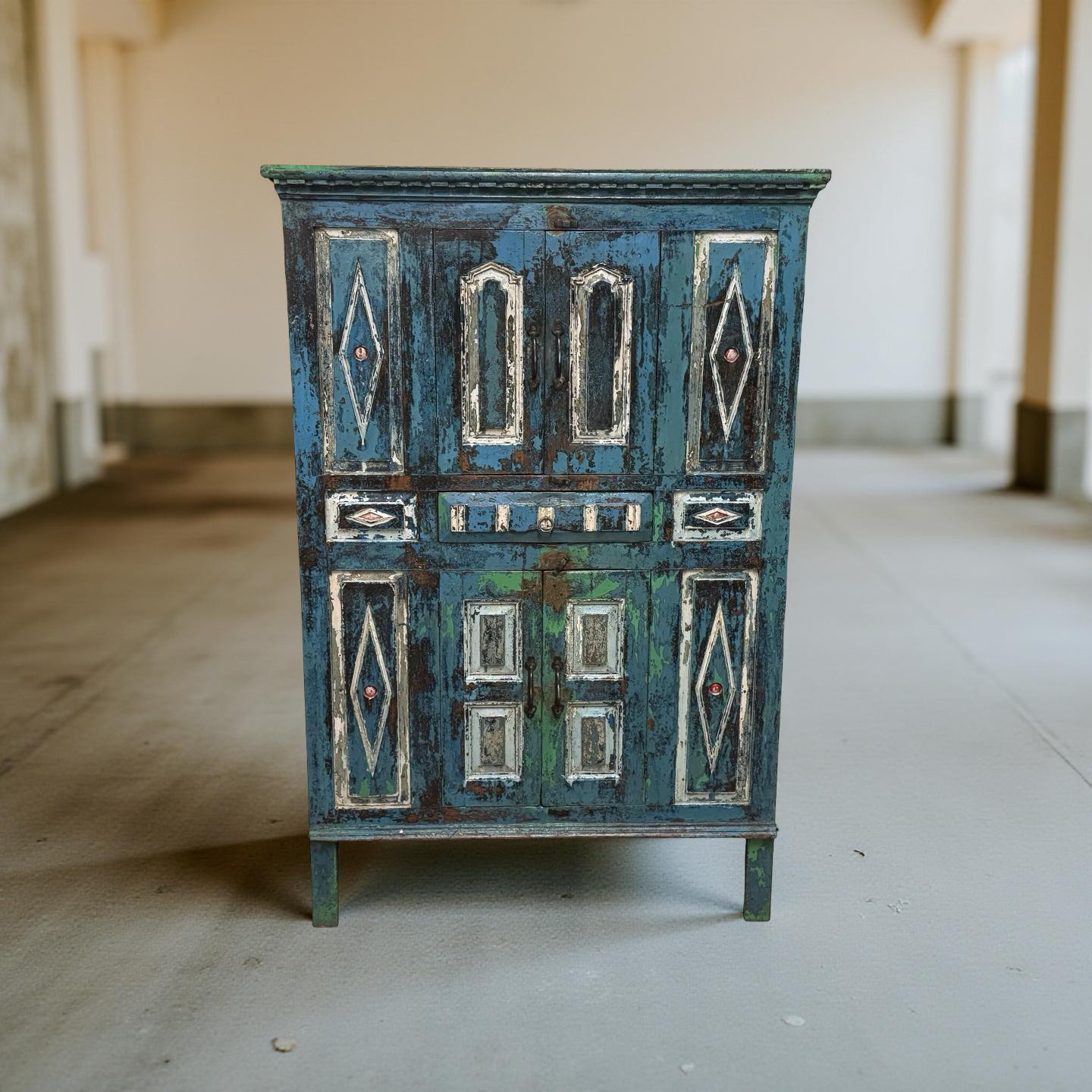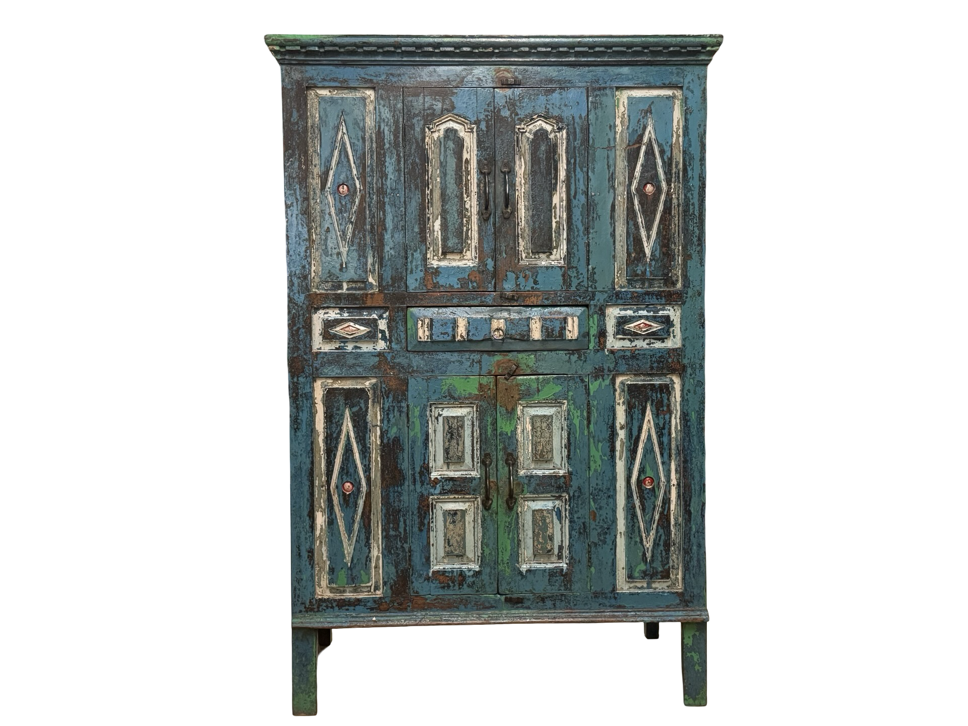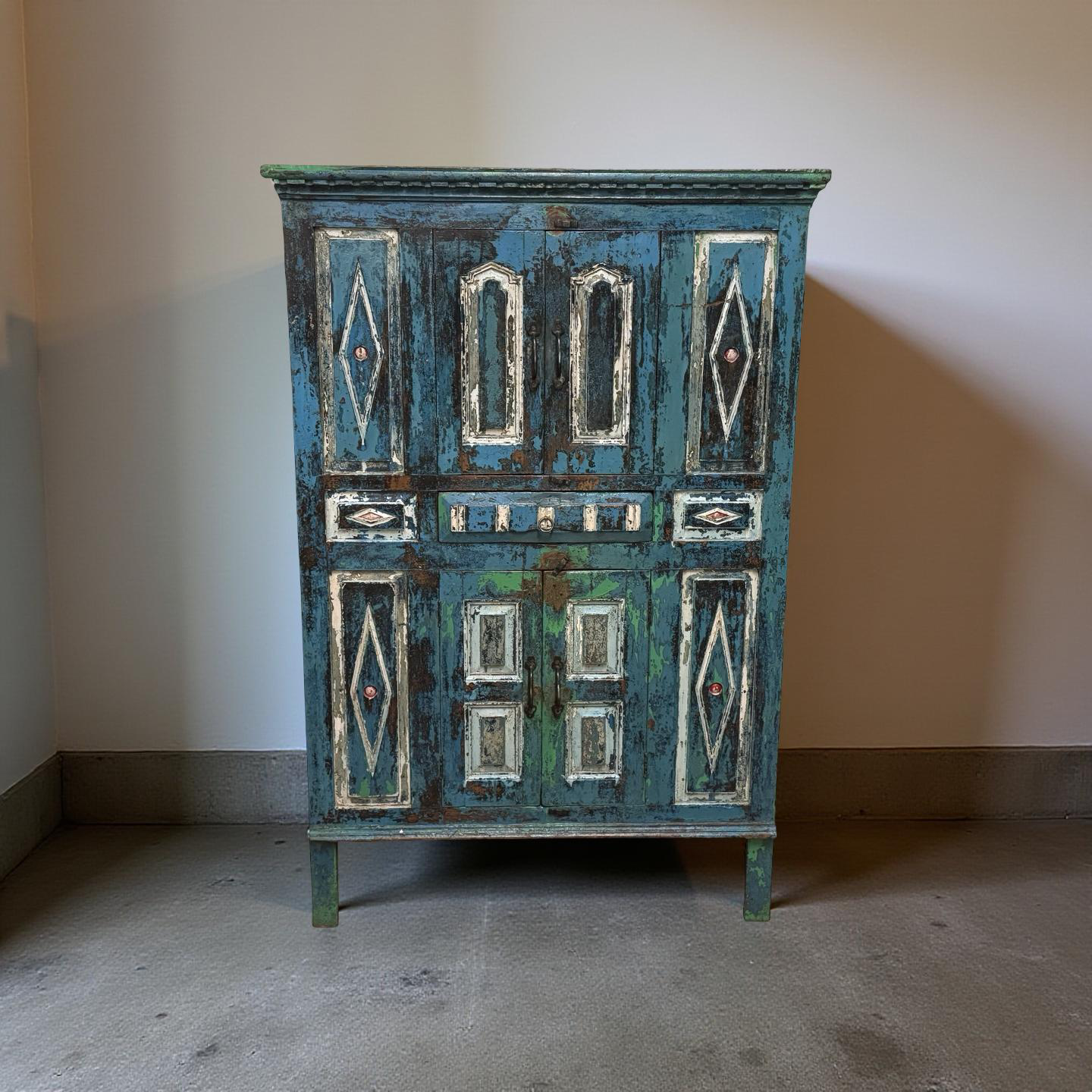 Deze authentieke blauwe kast uit India is een echte eyecatcher! Met vier deuren en een handige lade biedt hij volop opbergruimte.