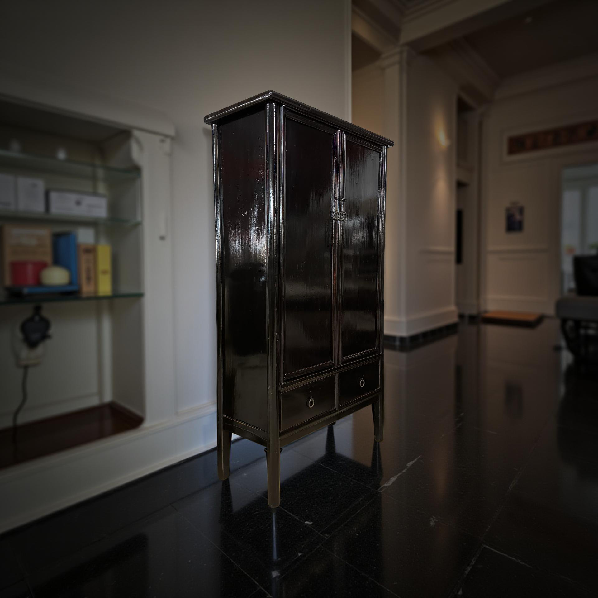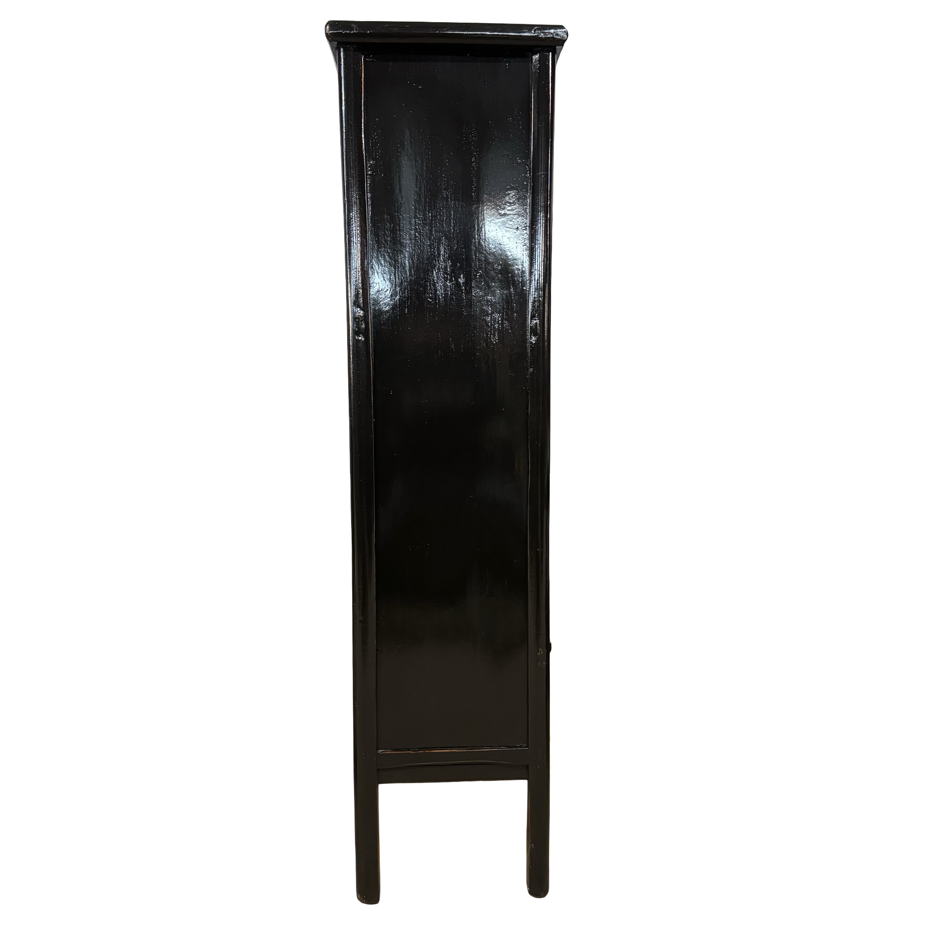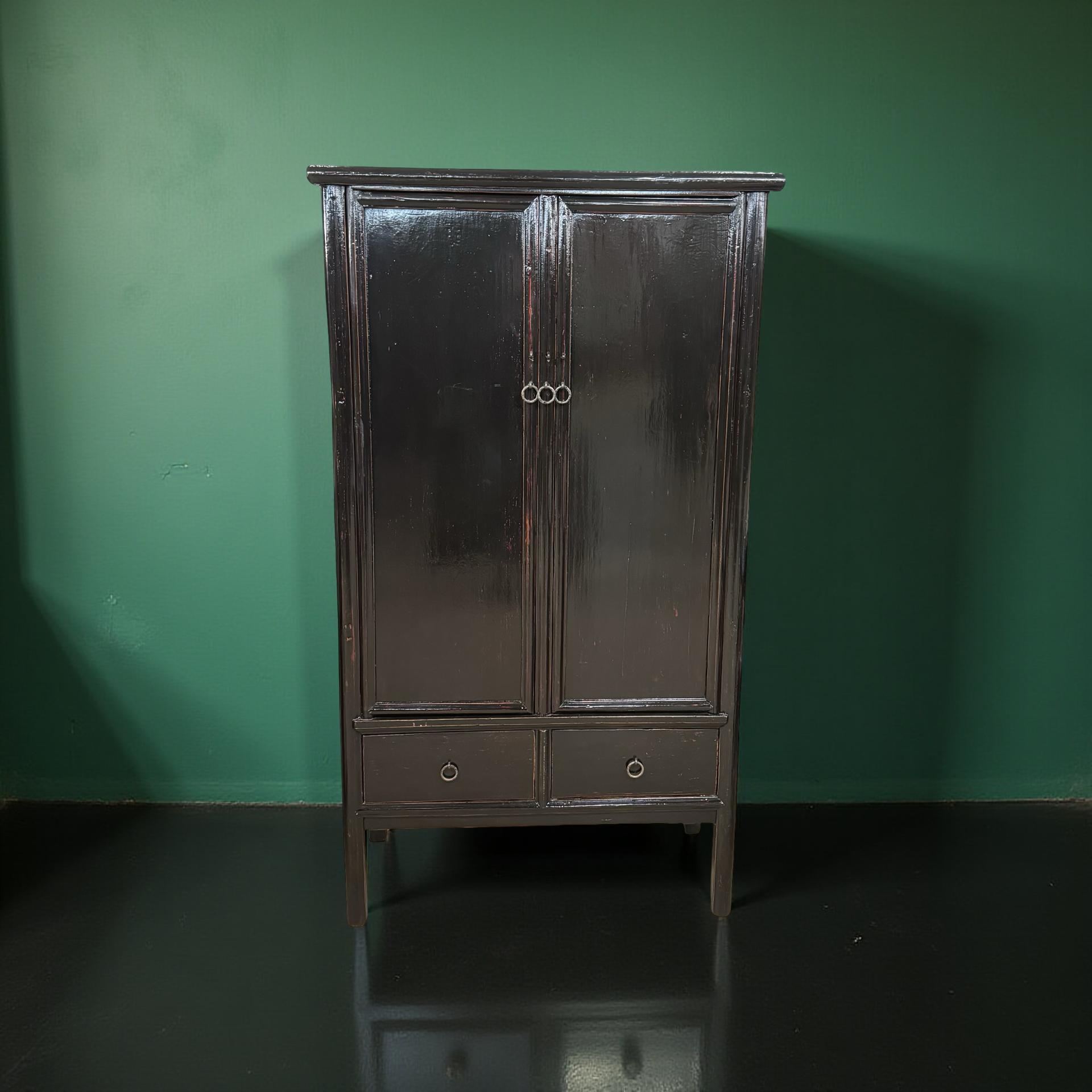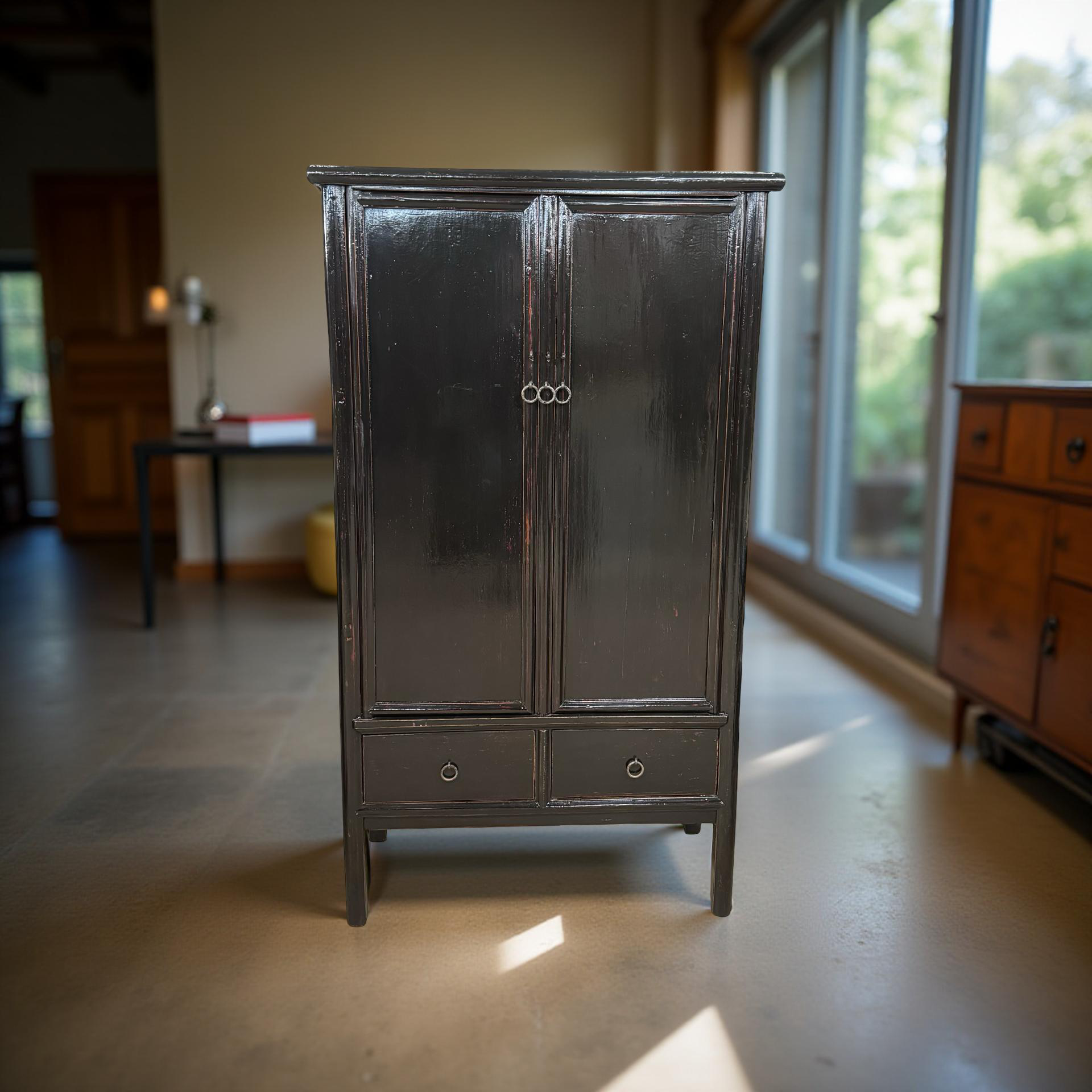 Deze unieke, handgemaakte kast uit China is uitgevoerd in hout met een subtiele laklaag in diep zwart. Het ambachtelijke lakwerk geeft het meubel een rustige glans en een verfijnde, tijdloze uitstraling.
