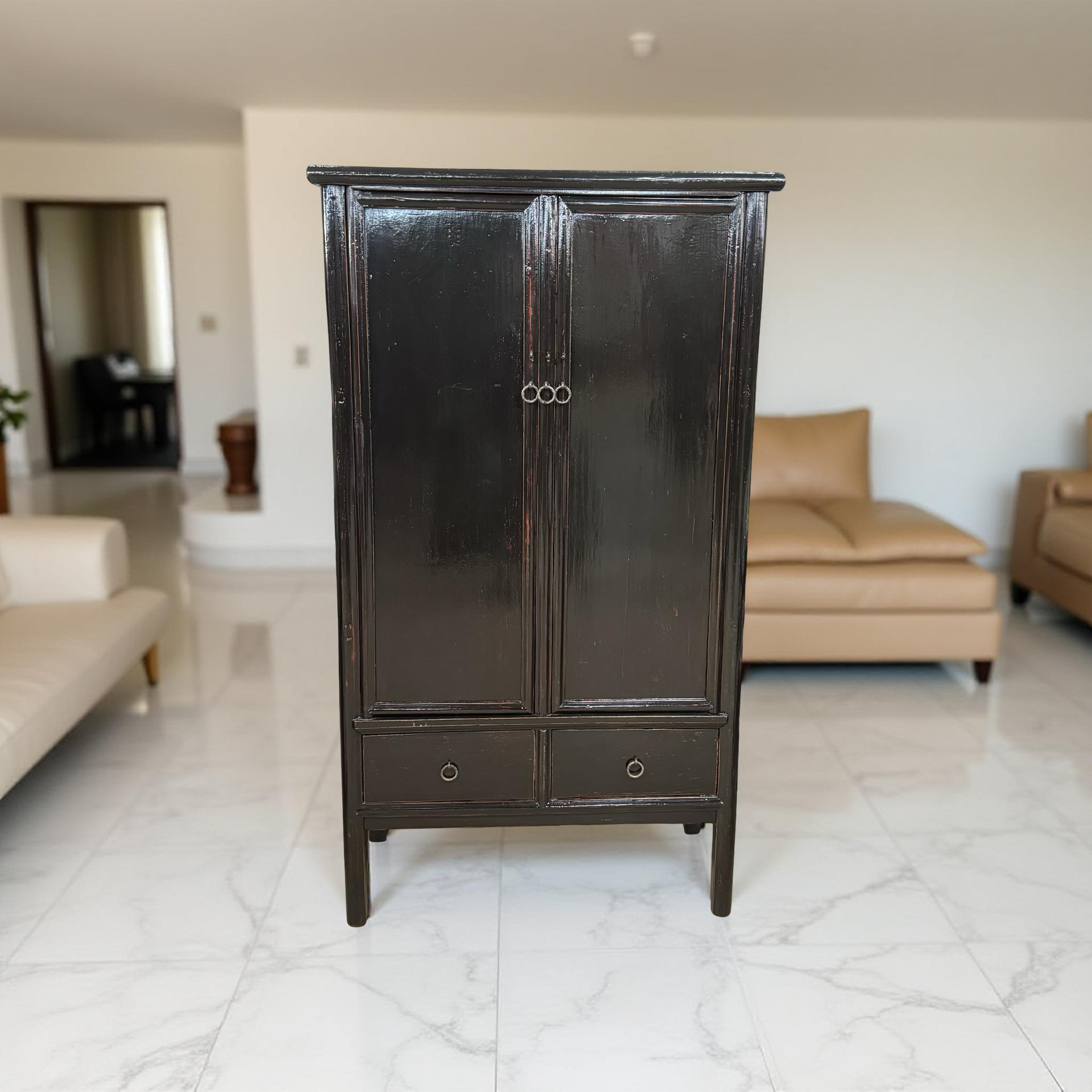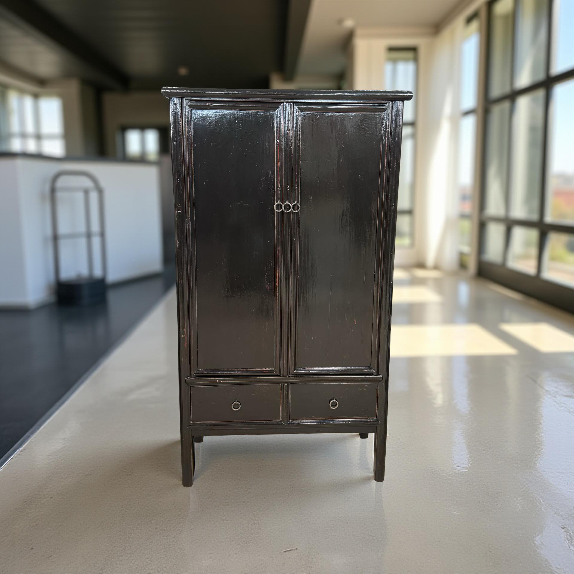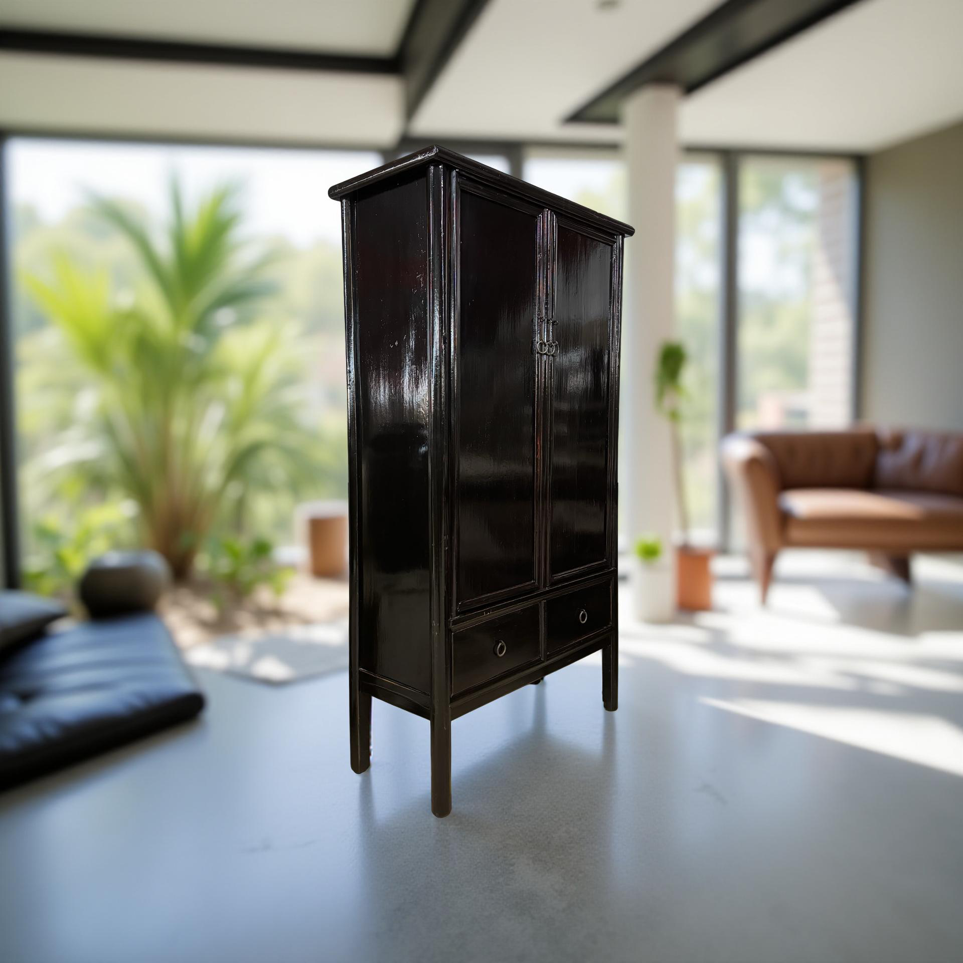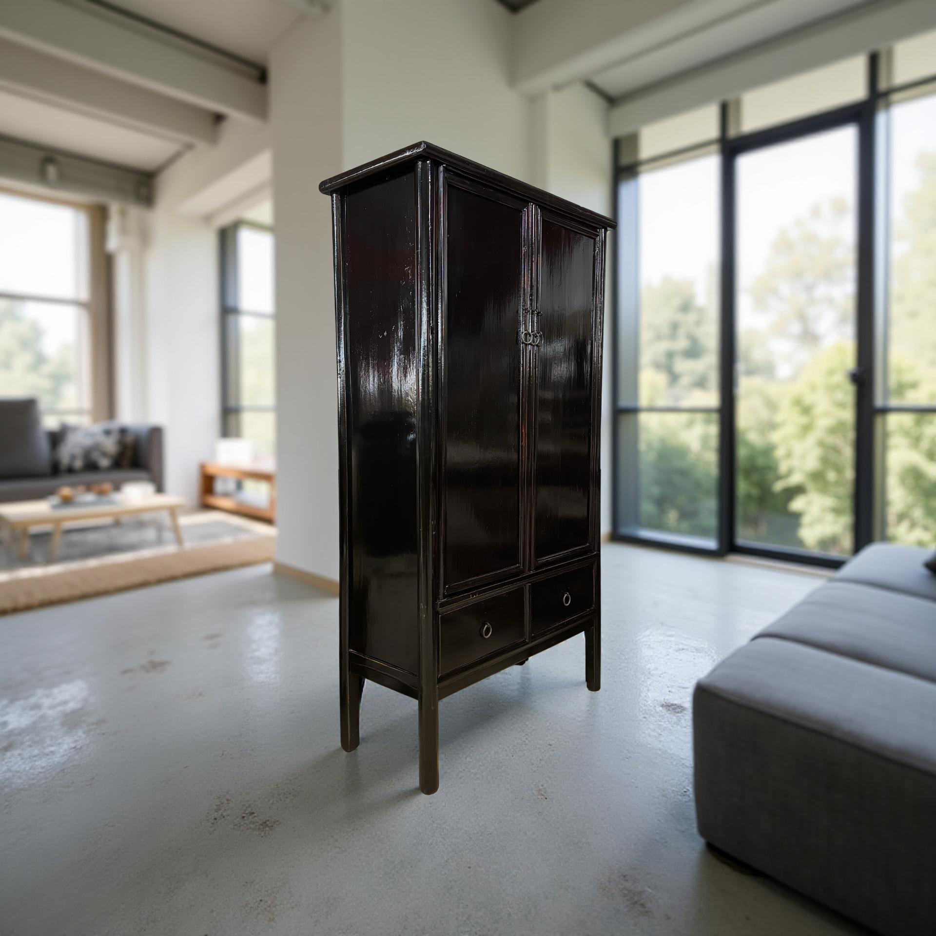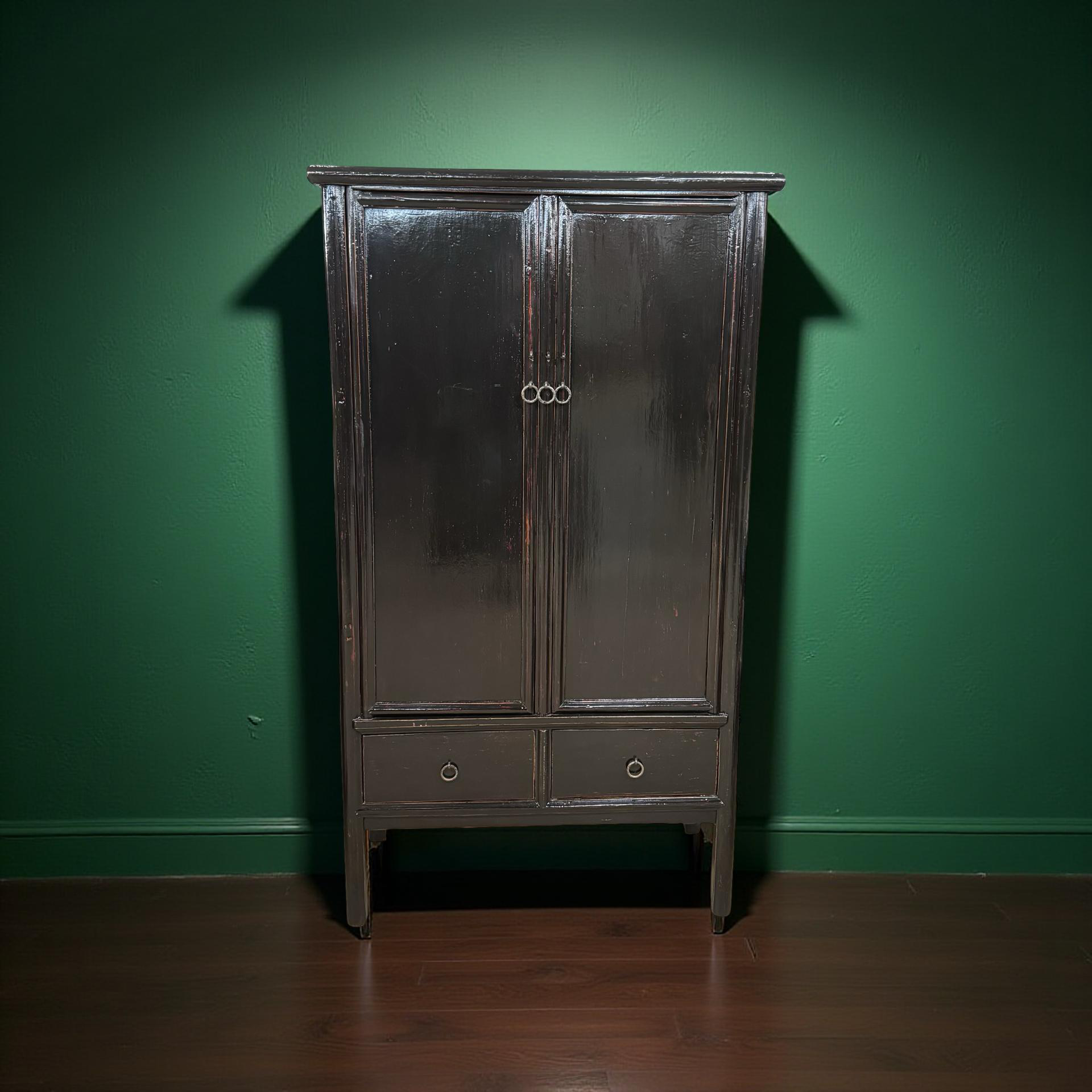 Deze unieke, handgemaakte kast uit China is uitgevoerd in hout met een subtiele laklaag in diep zwart. Het ambachtelijke lakwerk geeft het meubel een rustige glans en een verfijnde, tijdloze uitstraling.