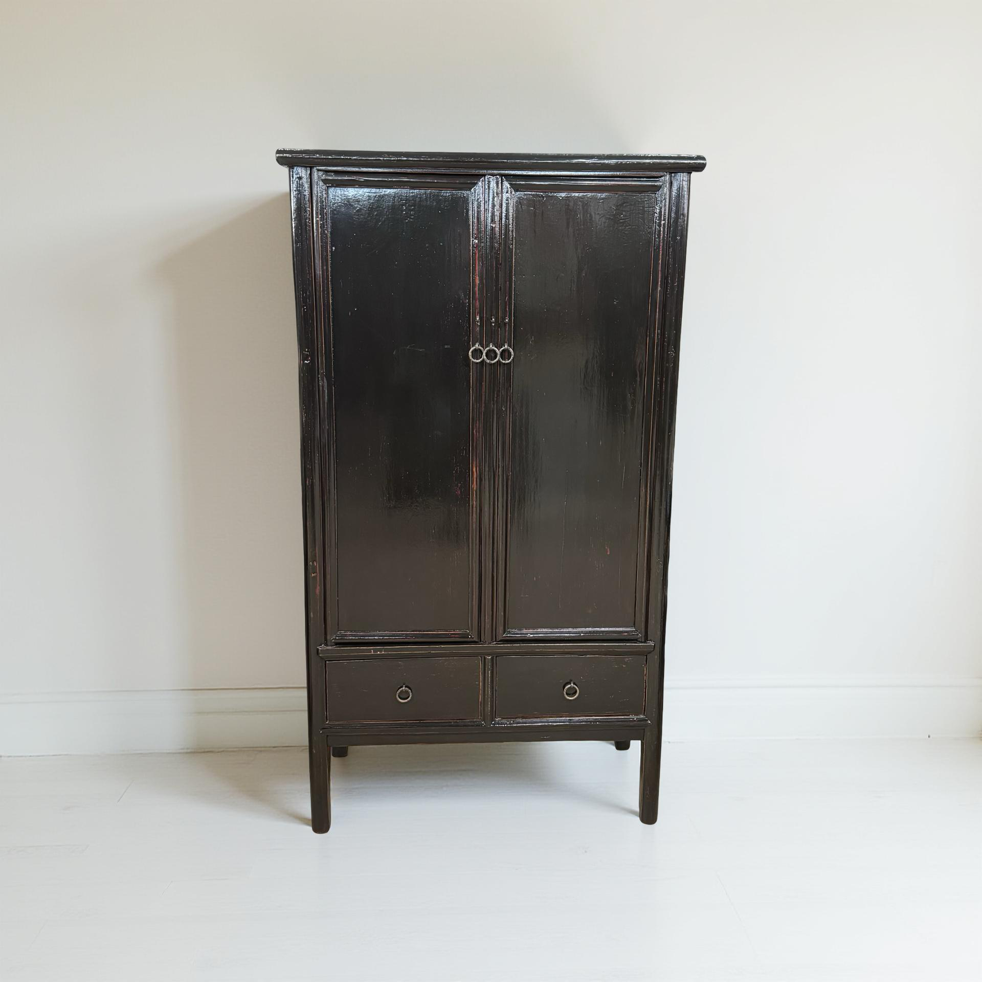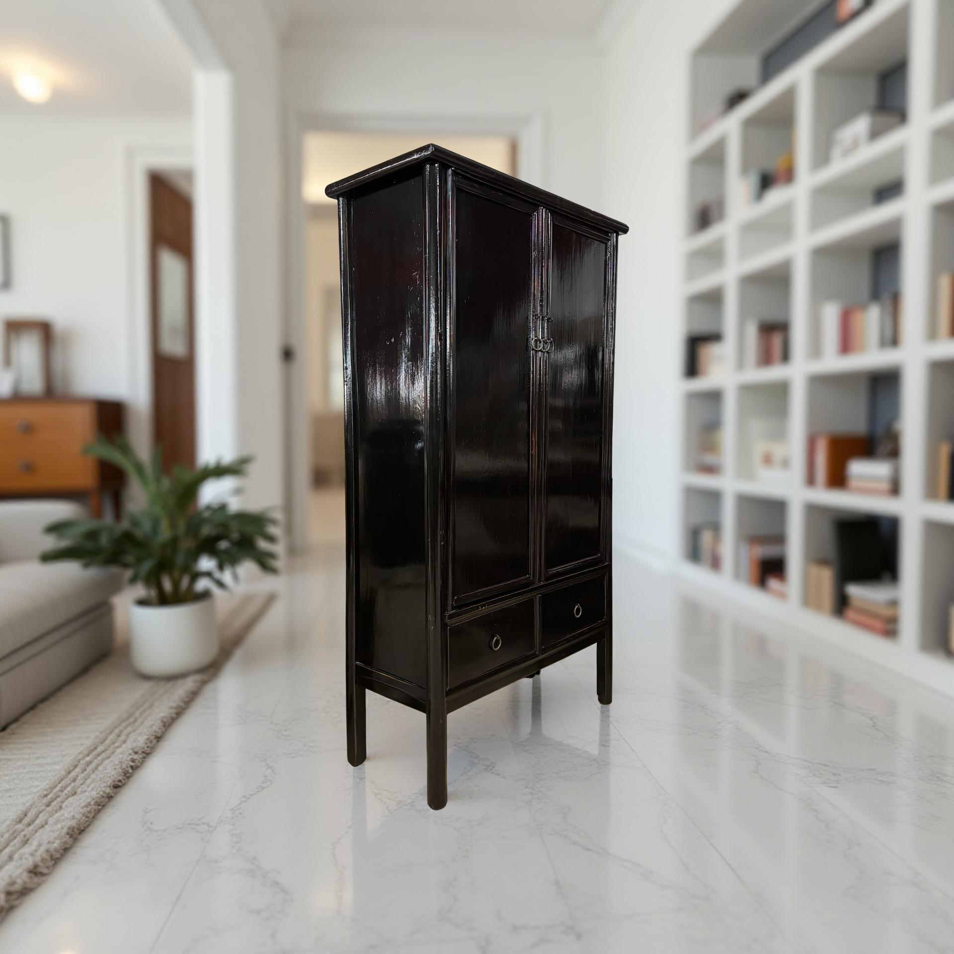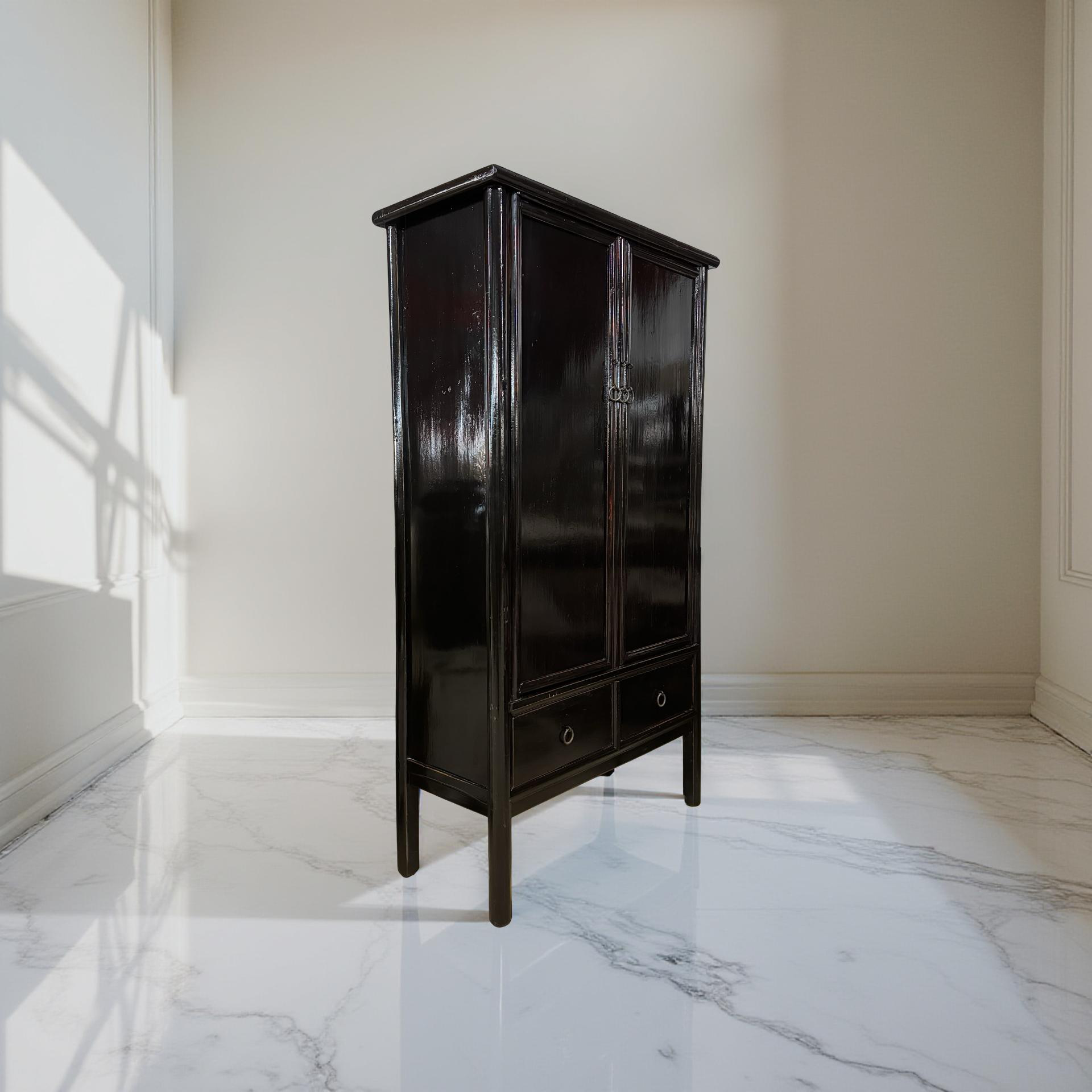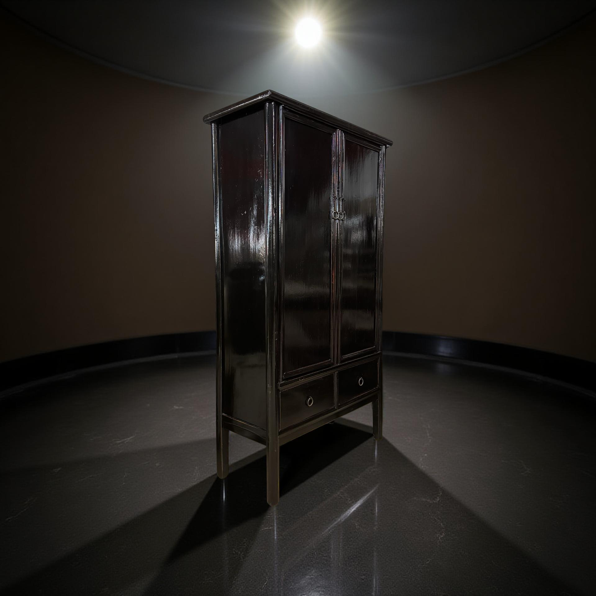 Deze unieke, handgemaakte kast uit China is uitgevoerd in hout met een subtiele laklaag in diep zwart. Het ambachtelijke lakwerk geeft het meubel een rustige glans en een verfijnde, tijdloze uitstraling.