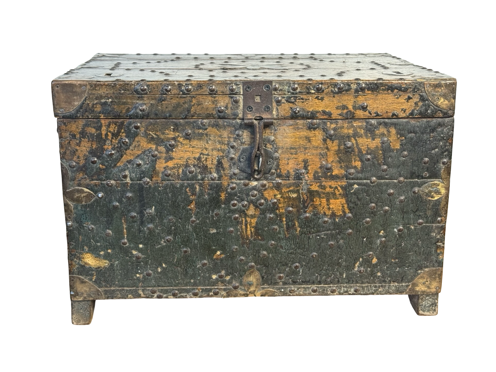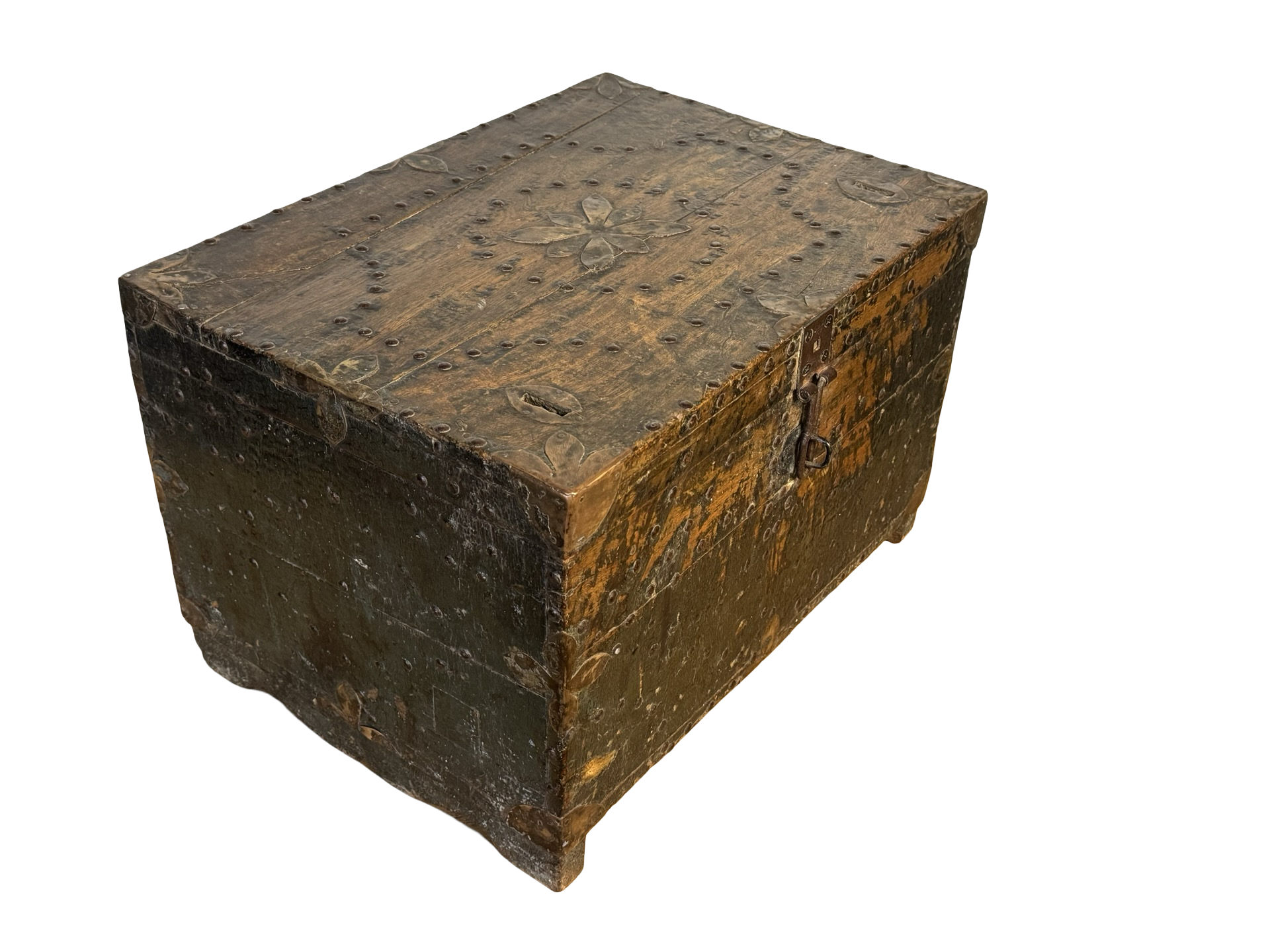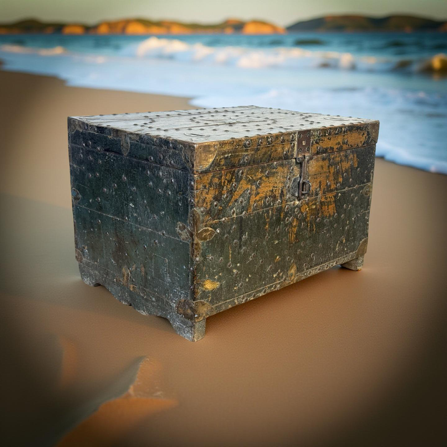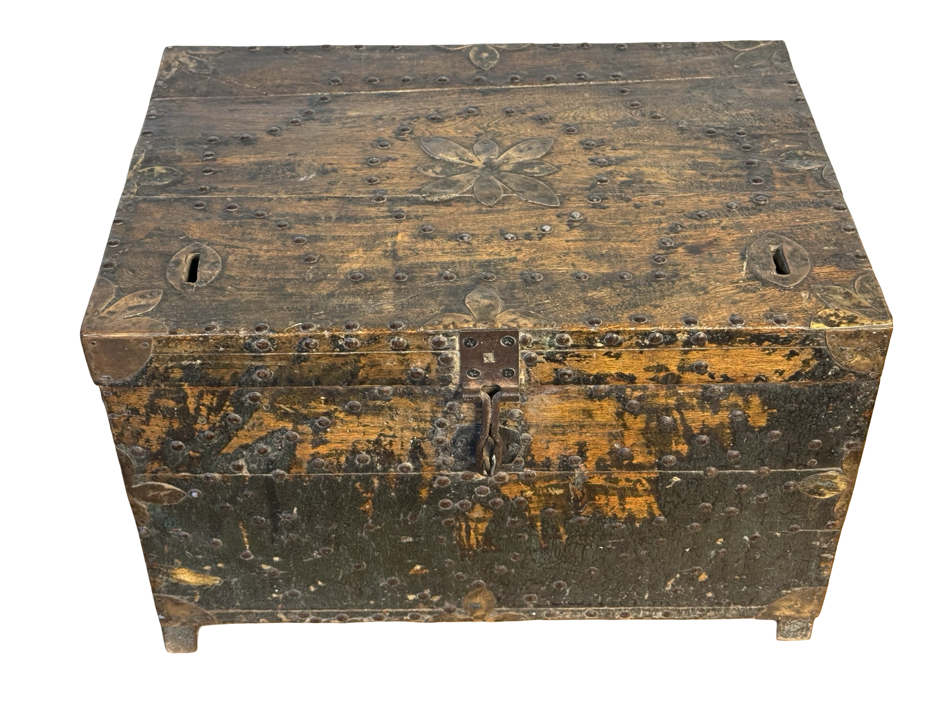 Dit handgemaakte kistje uit India straalt eenvoud en karakter uit. Met zijn primitieve vormgeving en verweerde uitstraling is elk exemplaar uniek en perfect als decoratief opbergstuk. met zijn koperen beslag schitterend