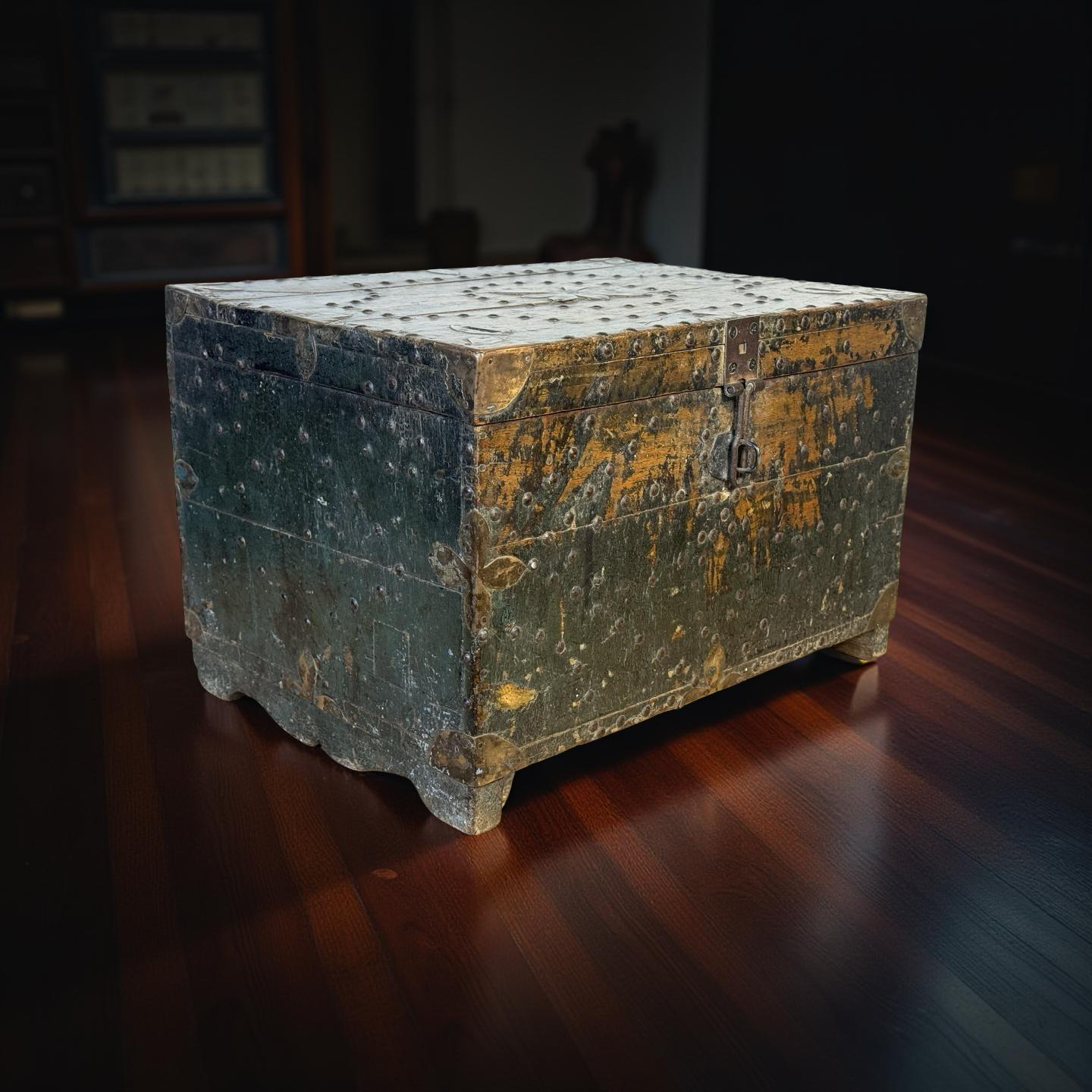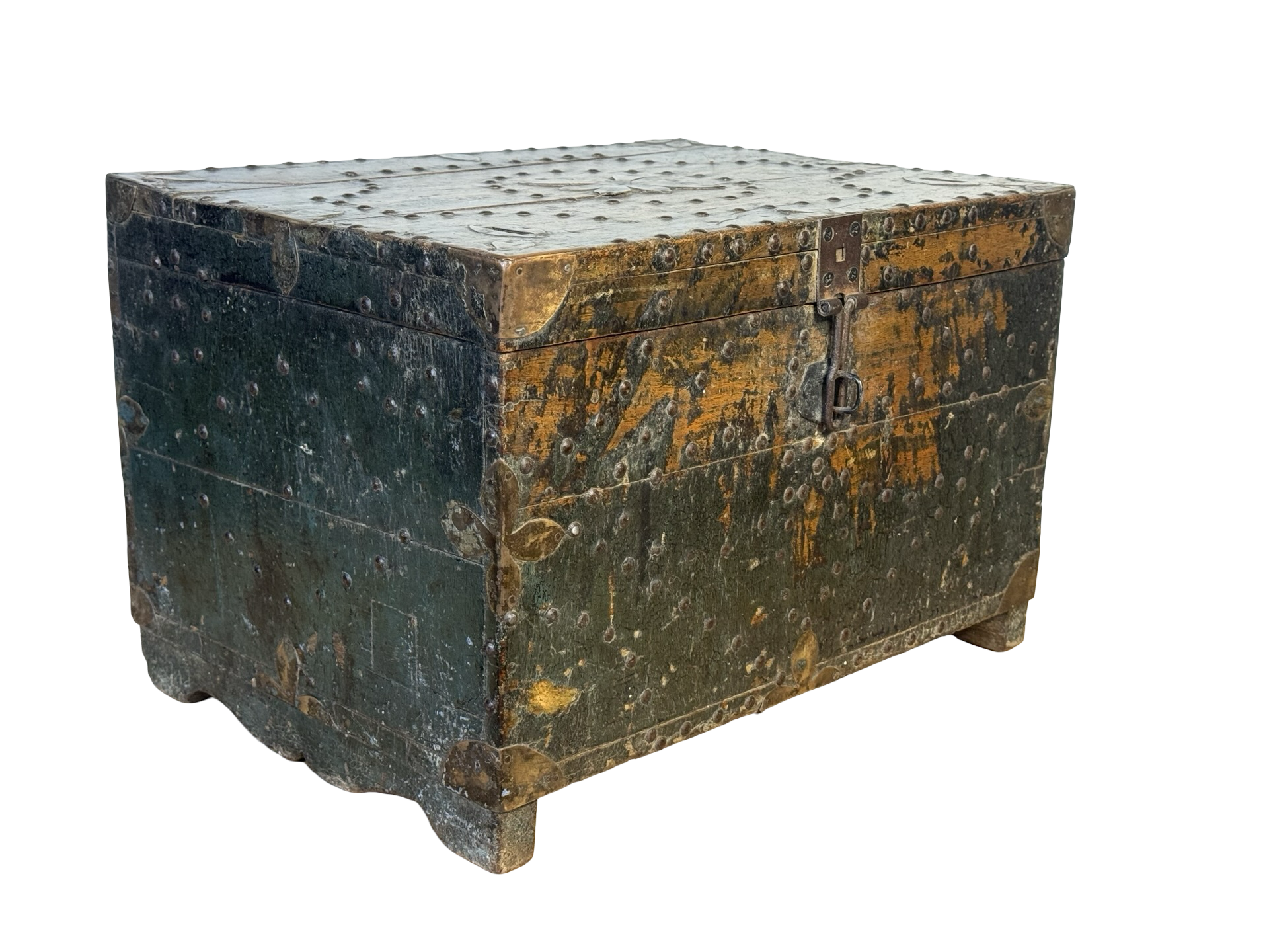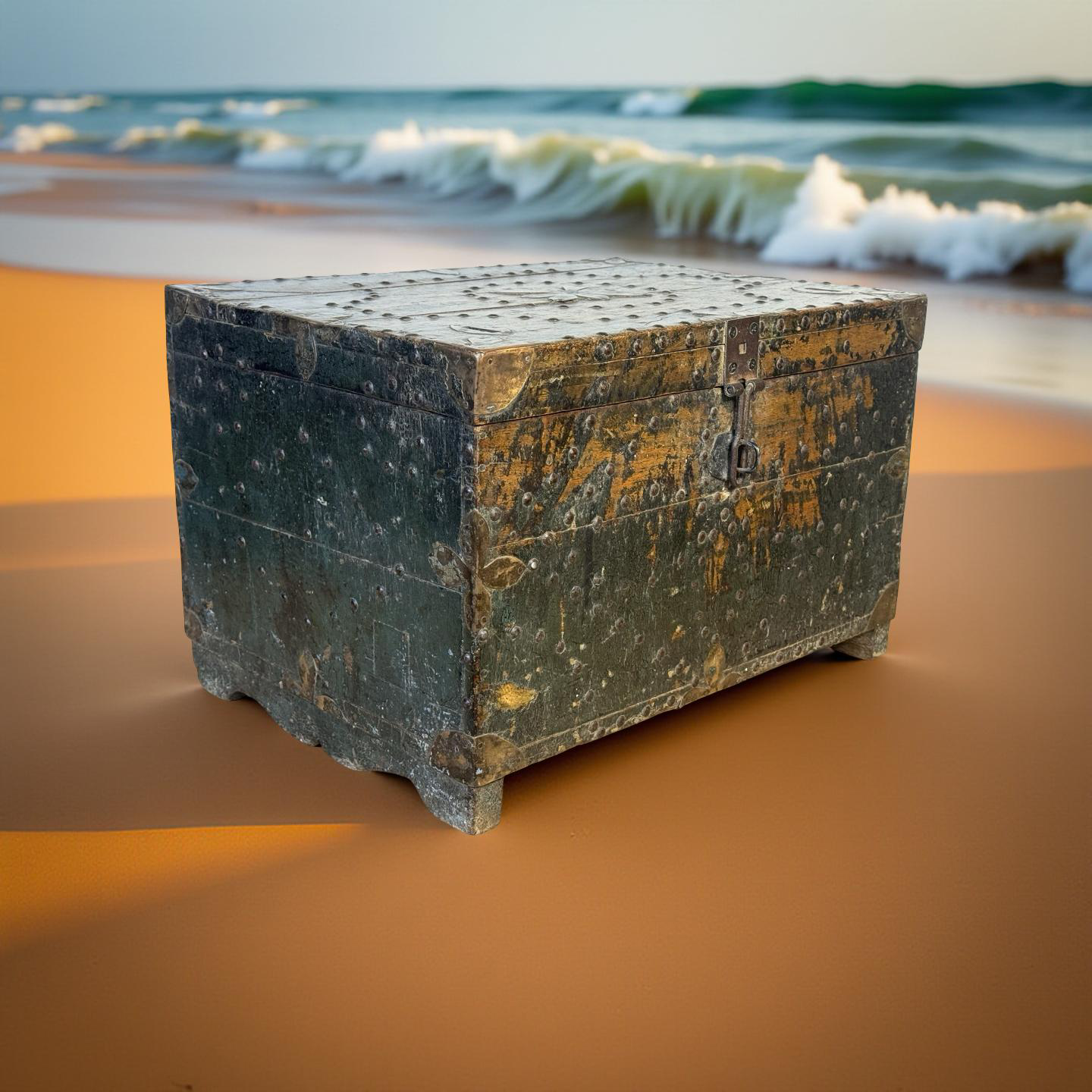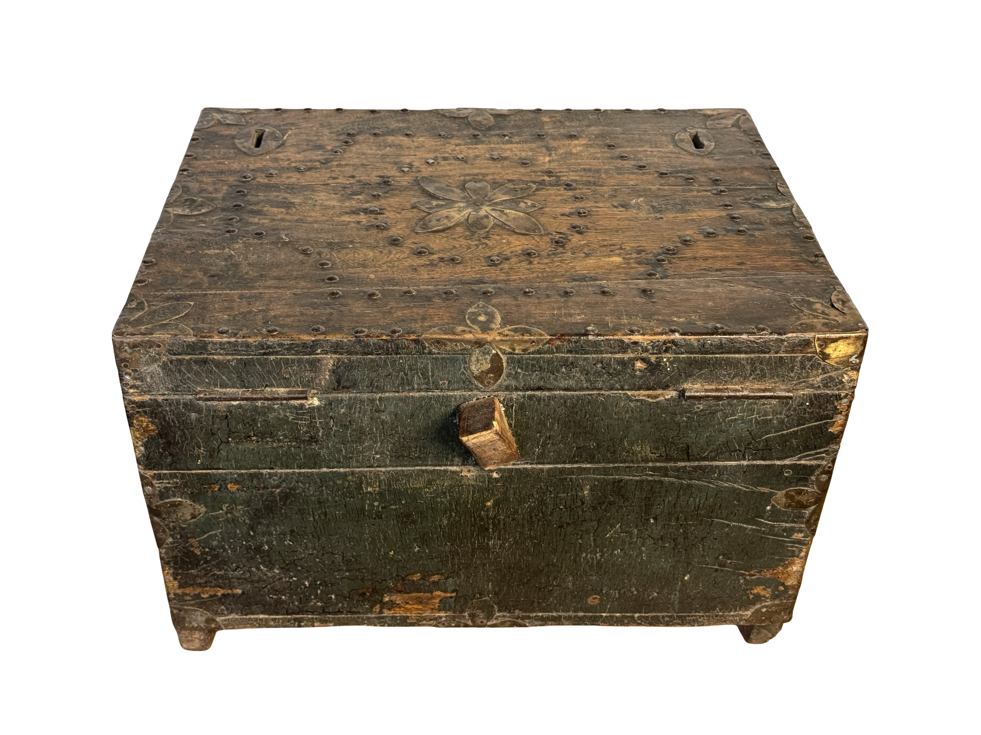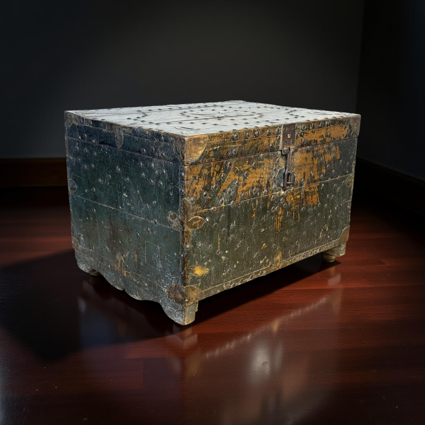 Dit handgemaakte kistje uit India straalt eenvoud en karakter uit. Met zijn primitieve vormgeving en verweerde uitstraling is elk exemplaar uniek en perfect als decoratief opbergstuk. met zijn koperen beslag schitterend