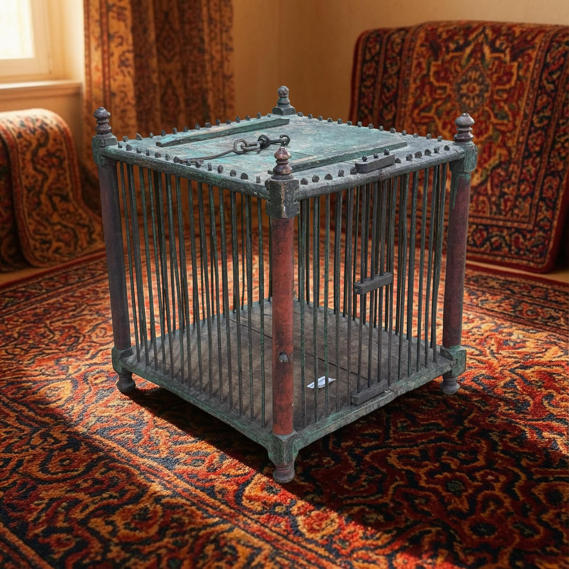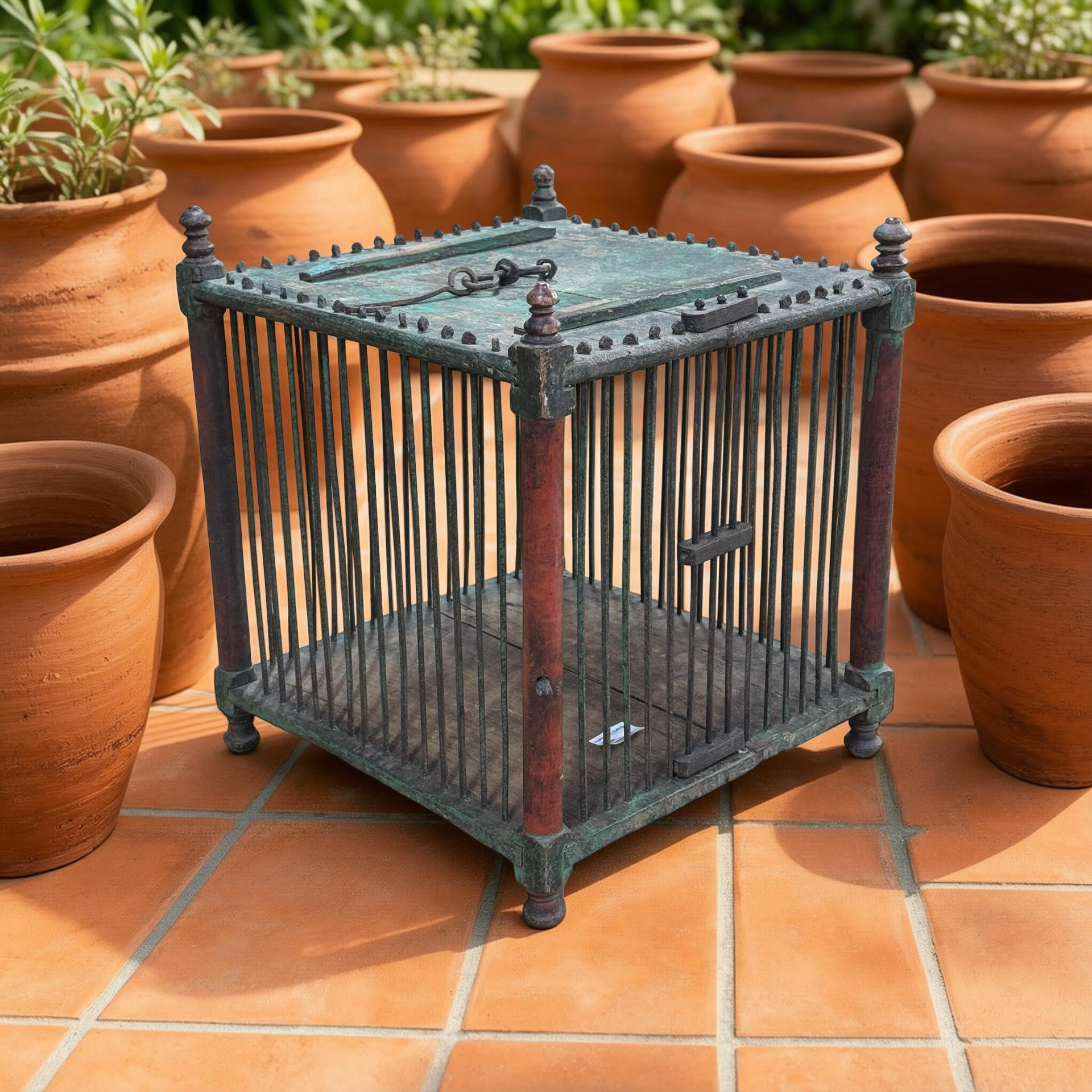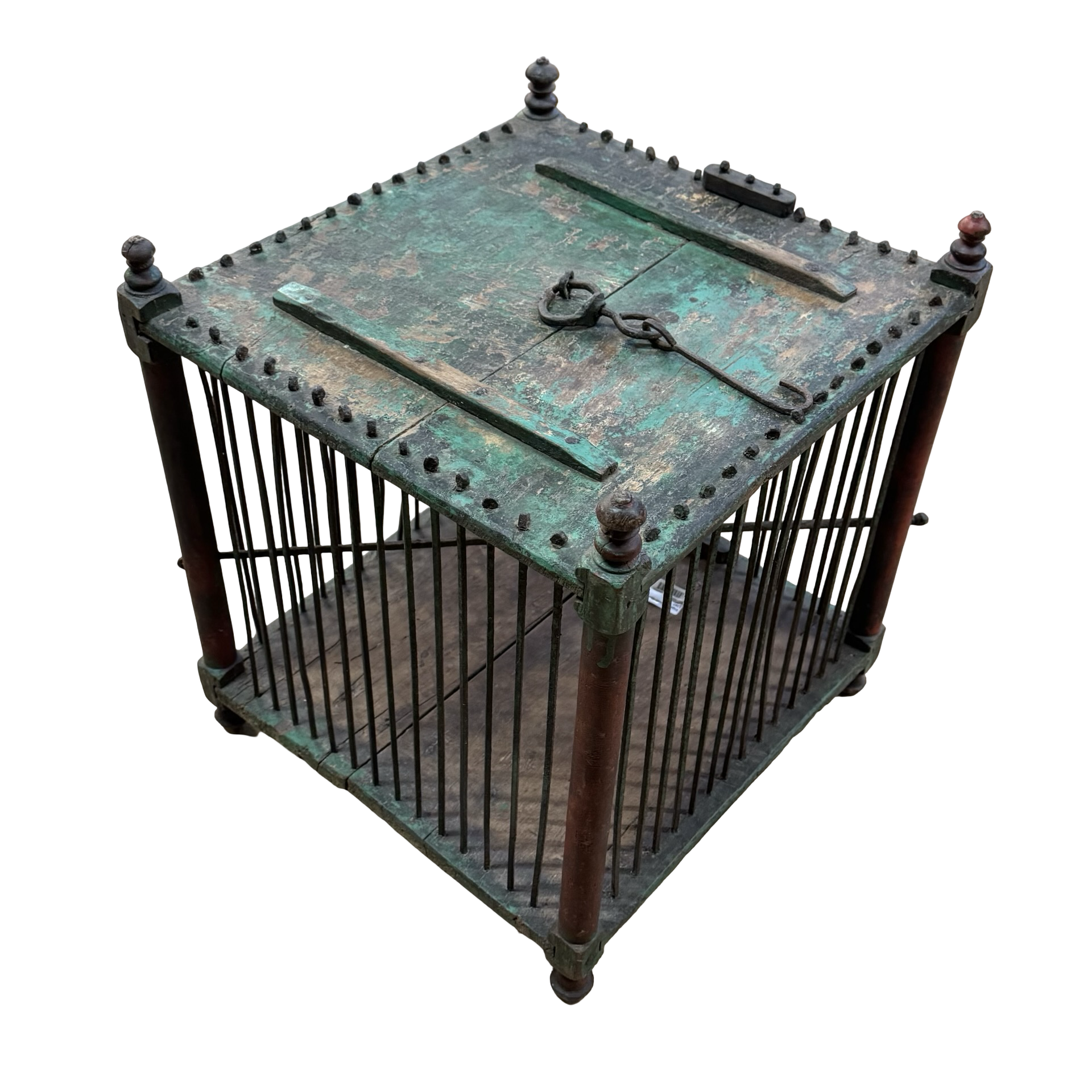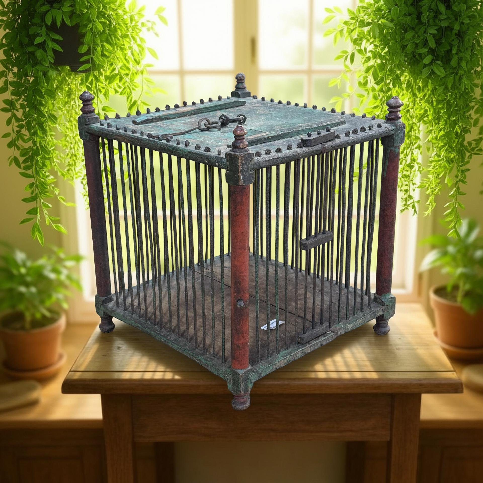 Deze oude houten vogelkooi is een uniek, handgemaakt stuk uit India met een doorleefde en authentieke uitstraling. Het ambachtelijke houtwerk en de verouderde afwerking geven het object een warme, decoratieve charme die direct de aandacht trekt.Door zijn karakter en patina vertelt deze vogelkooi een eigen verhaal en past hij perfect als bijzonder decoratiestuk in een interieur. Omdat het een uniek exemplaar betreft, is er slechts één stuk beschikbaar.
