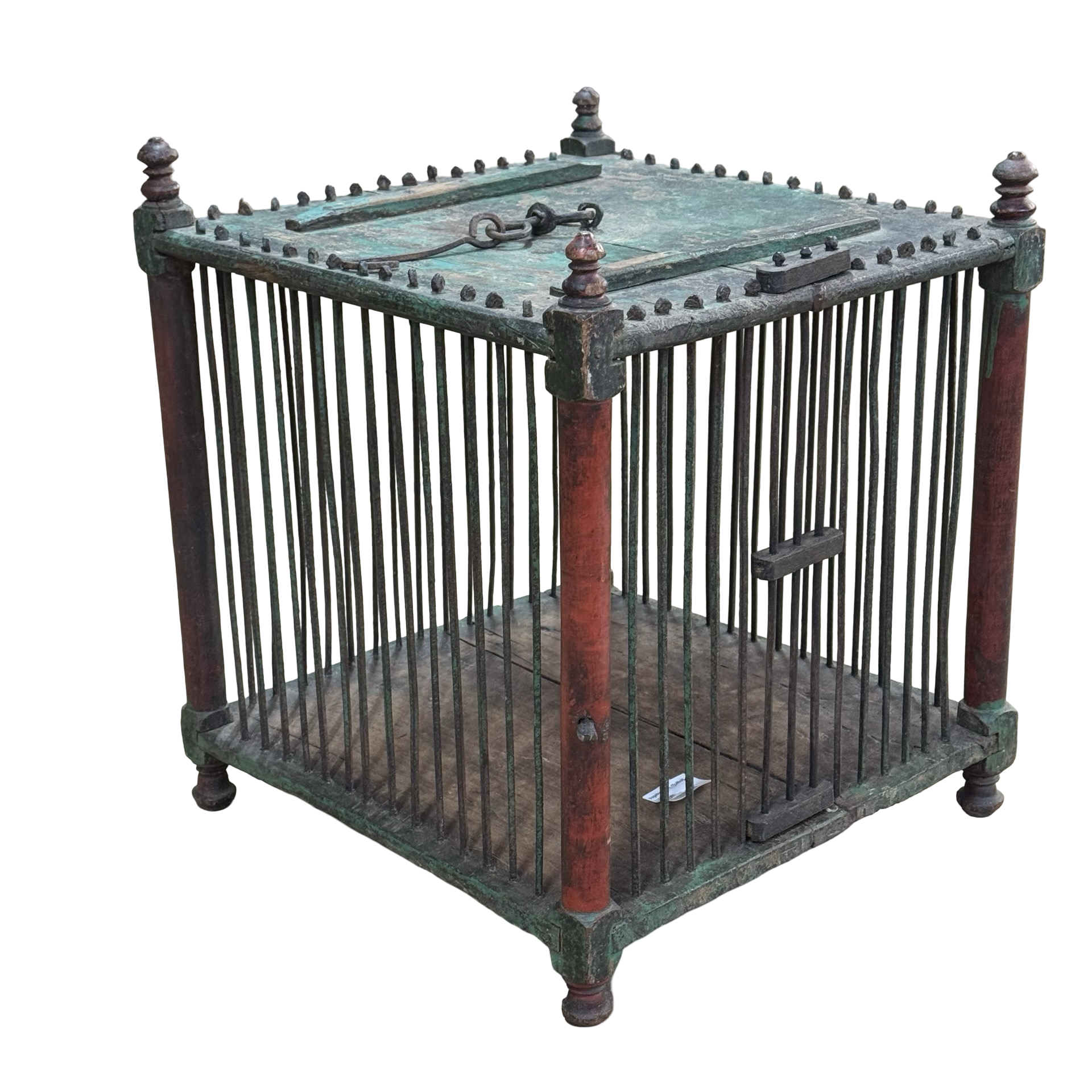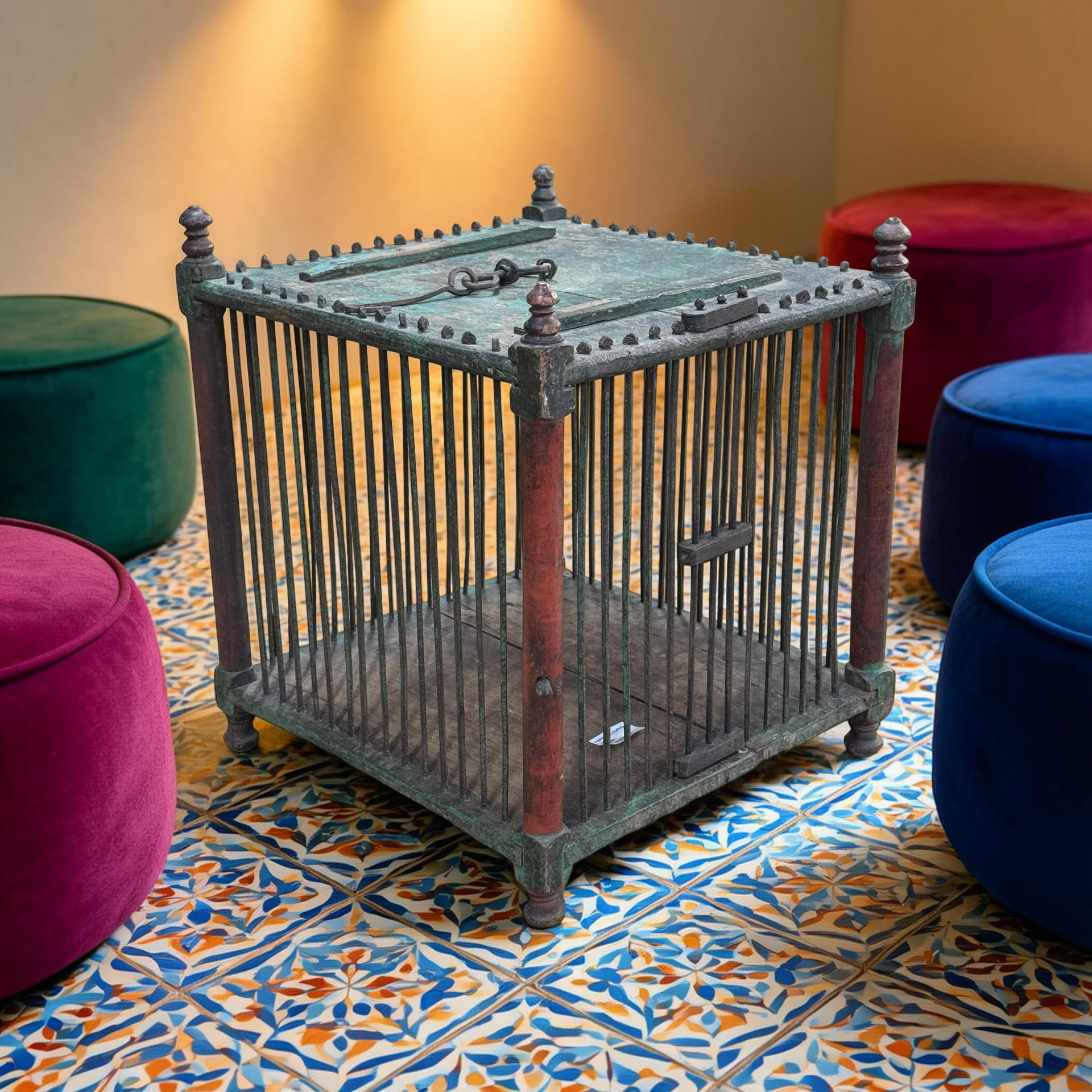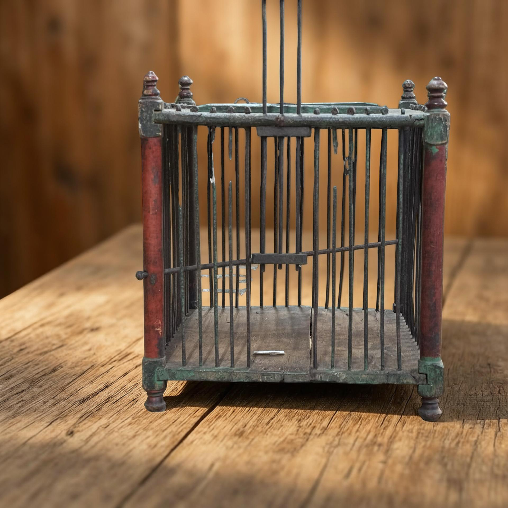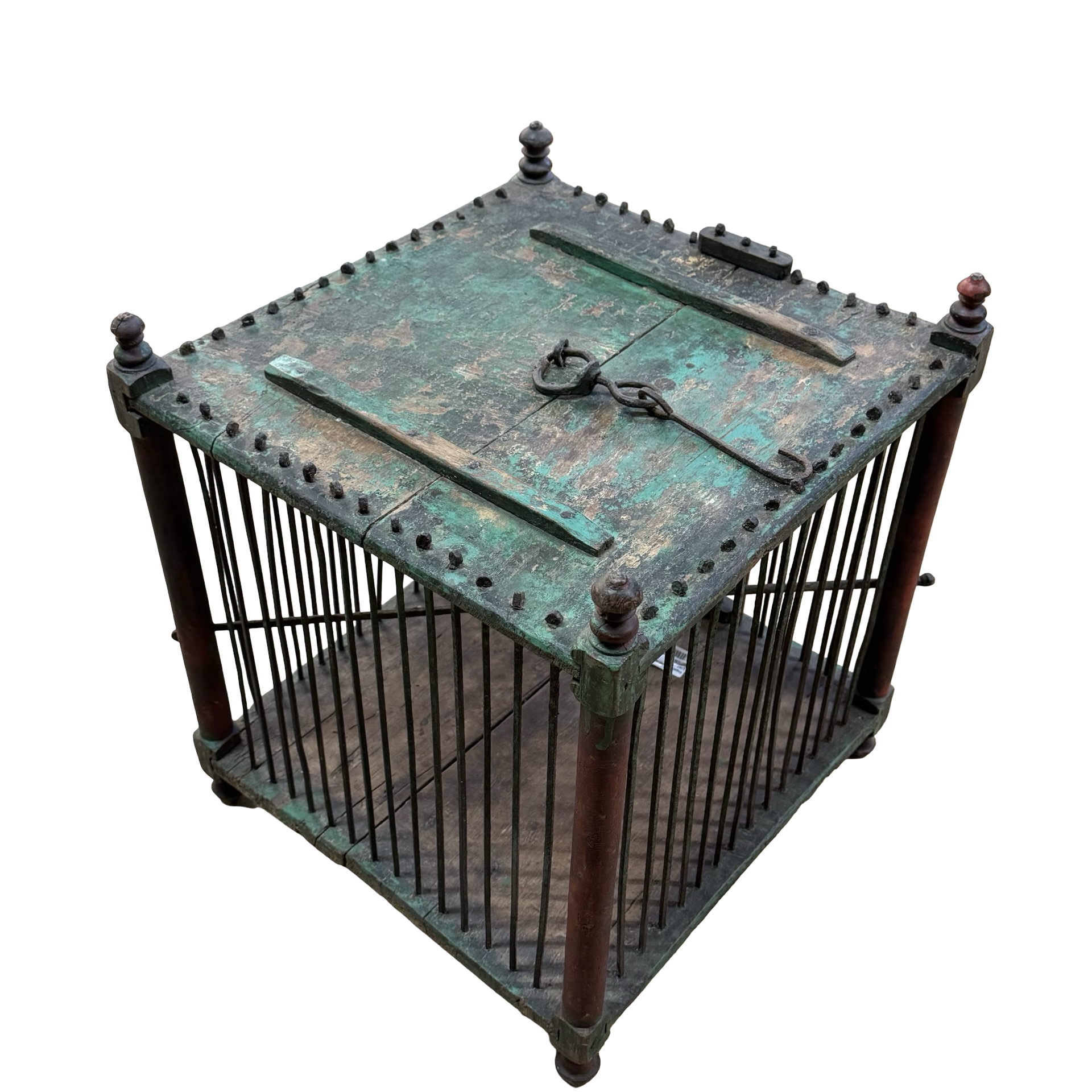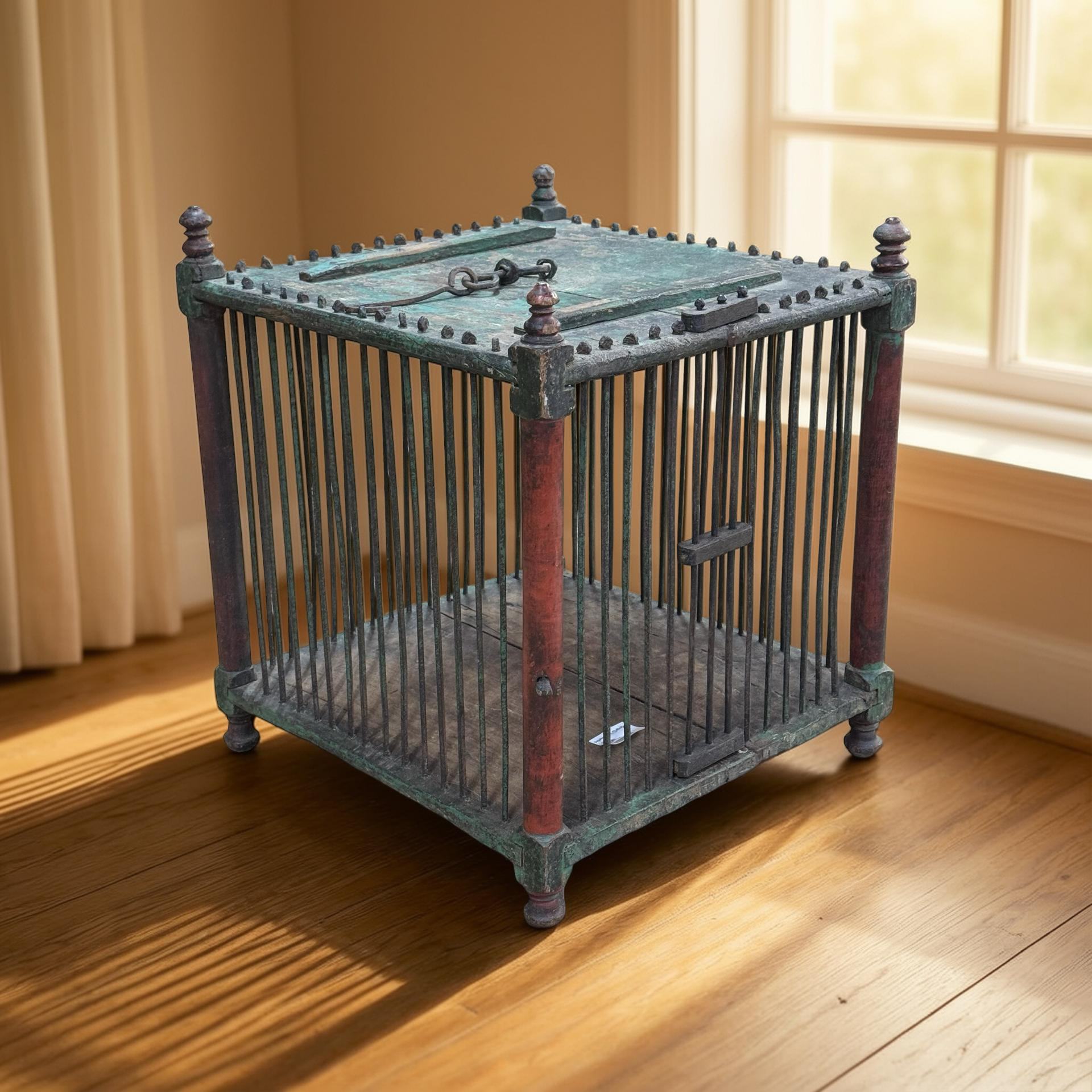 Deze oude houten vogelkooi is een uniek, handgemaakt stuk uit India met een doorleefde en authentieke uitstraling. Het ambachtelijke houtwerk en de verouderde afwerking geven het object een warme, decoratieve charme die direct de aandacht trekt.Door zijn karakter en patina vertelt deze vogelkooi een eigen verhaal en past hij perfect als bijzonder decoratiestuk in een interieur. Omdat het een uniek exemplaar betreft, is er slechts één stuk beschikbaar.