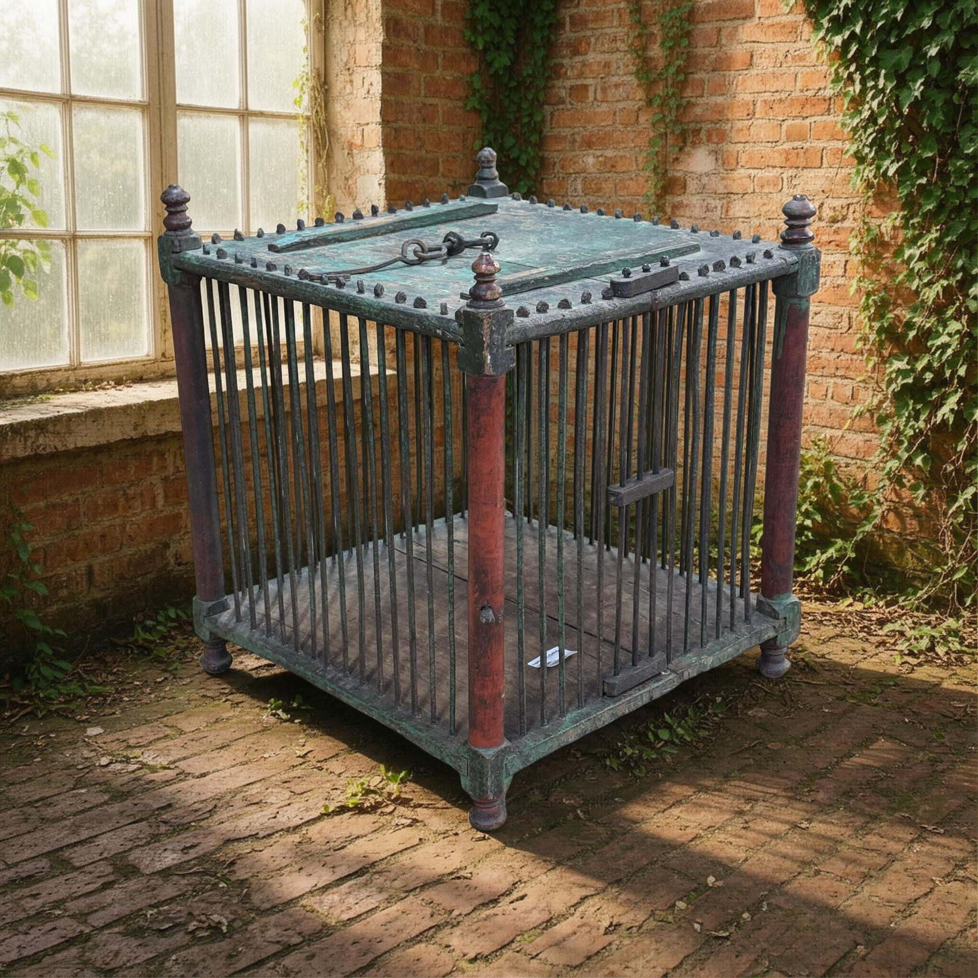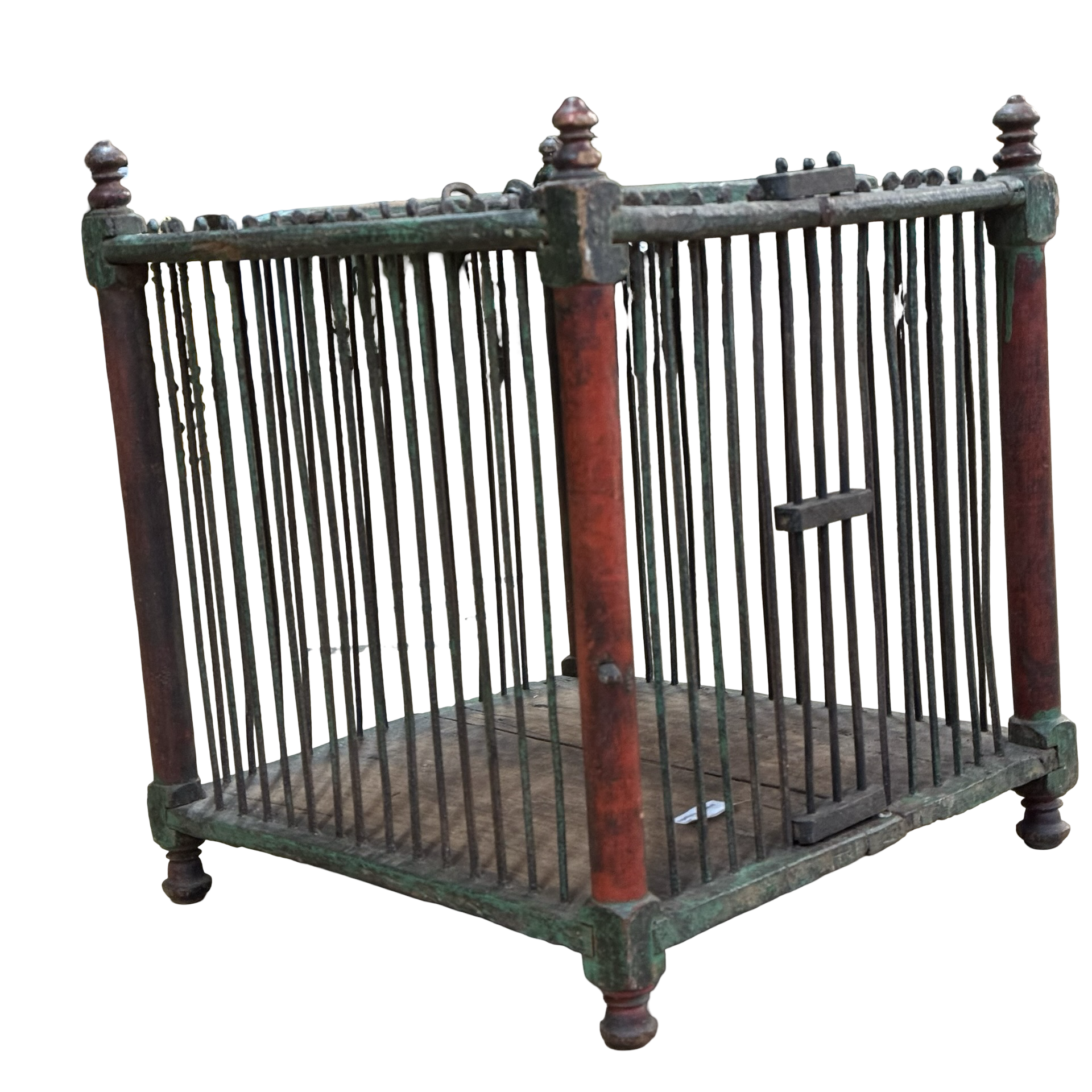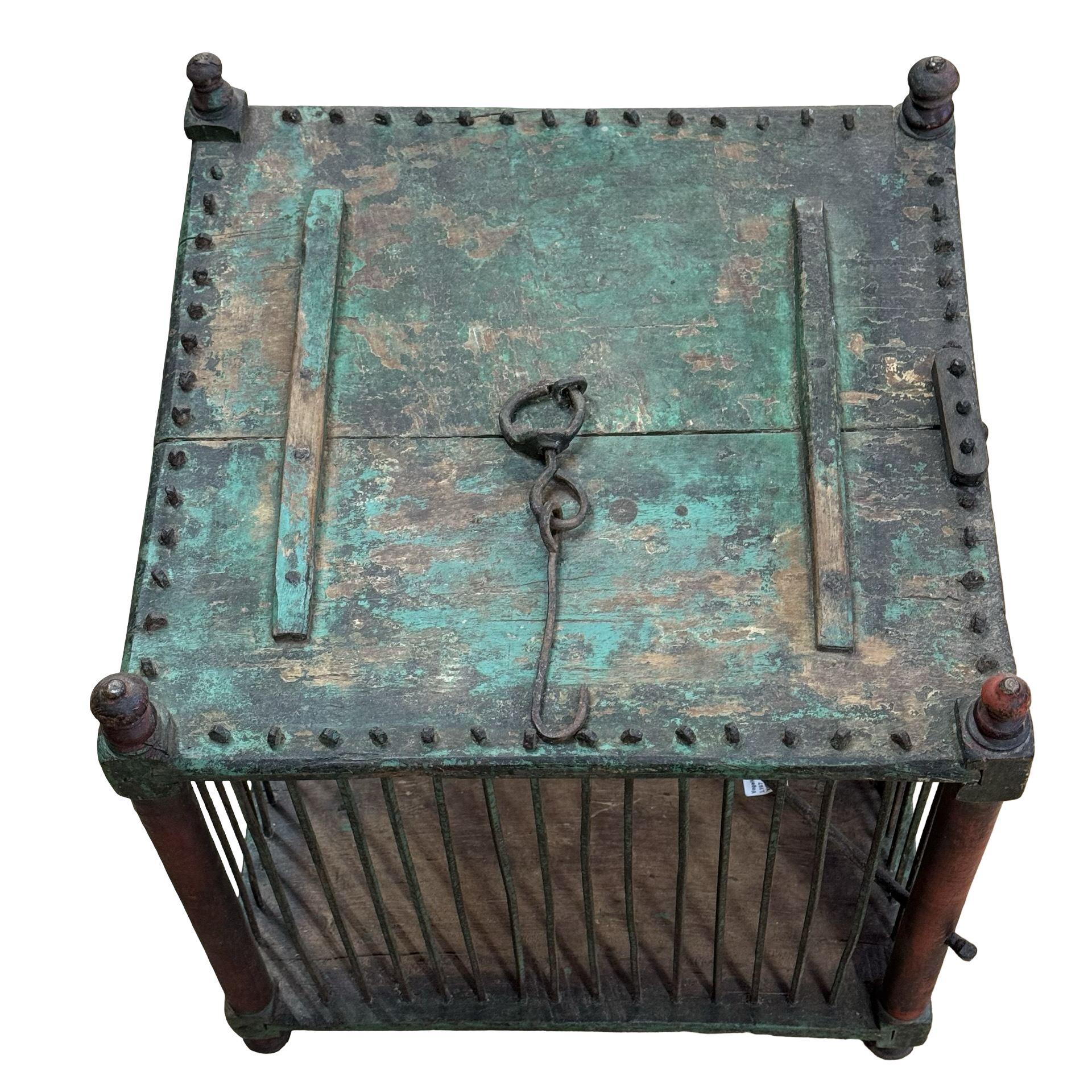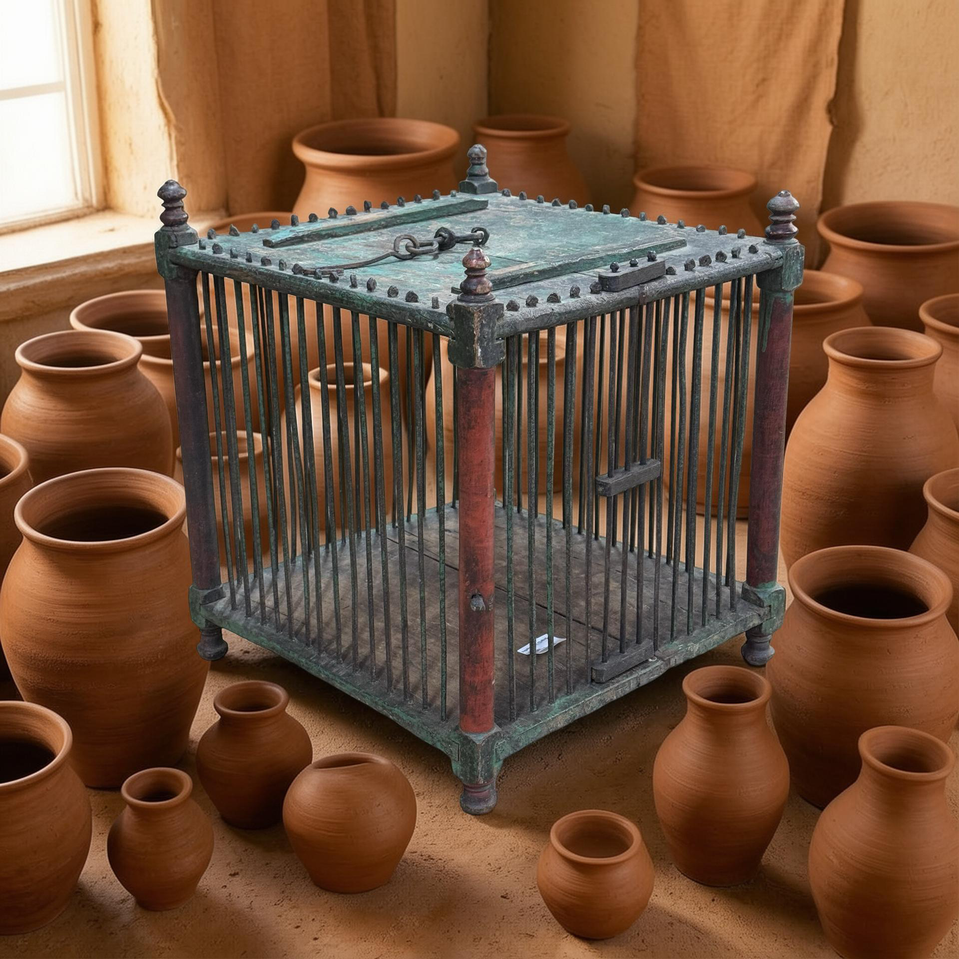 Deze oude houten vogelkooi is een uniek, handgemaakt stuk uit India met een doorleefde en authentieke uitstraling. Het ambachtelijke houtwerk en de verouderde afwerking geven het object een warme, decoratieve charme die direct de aandacht trekt.Door zijn karakter en patina vertelt deze vogelkooi een eigen verhaal en past hij perfect als bijzonder decoratiestuk in een interieur. Omdat het een uniek exemplaar betreft, is er slechts één stuk beschikbaar.