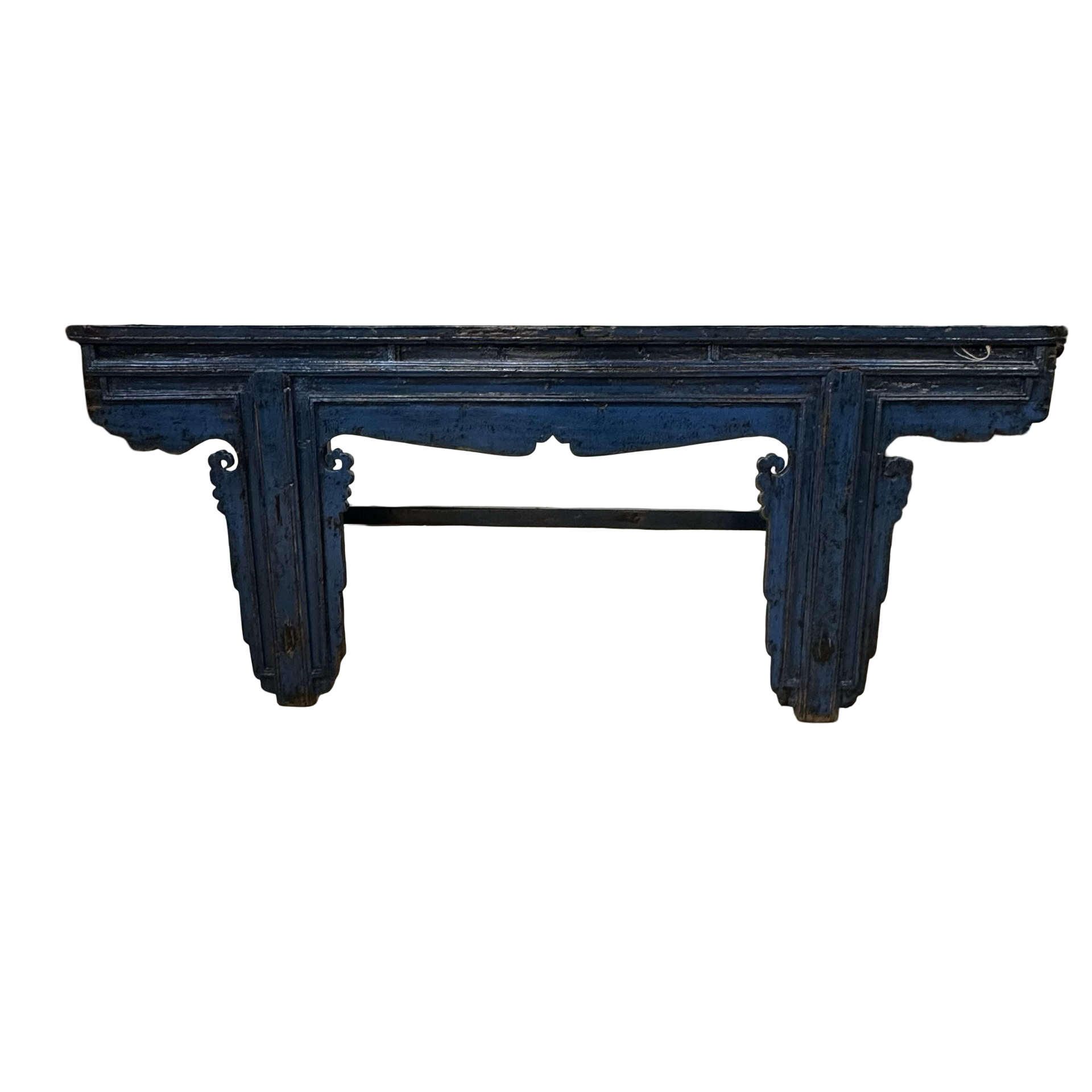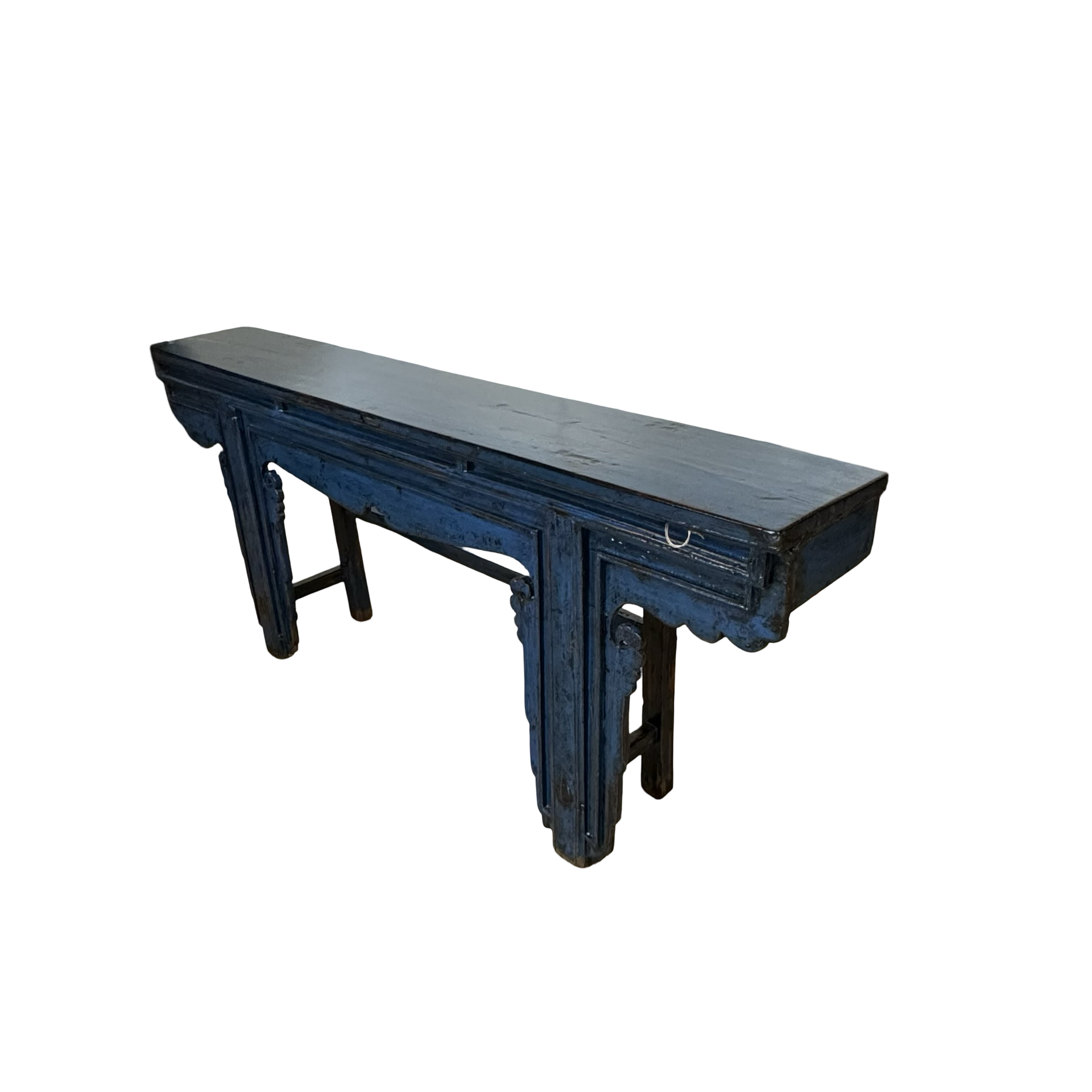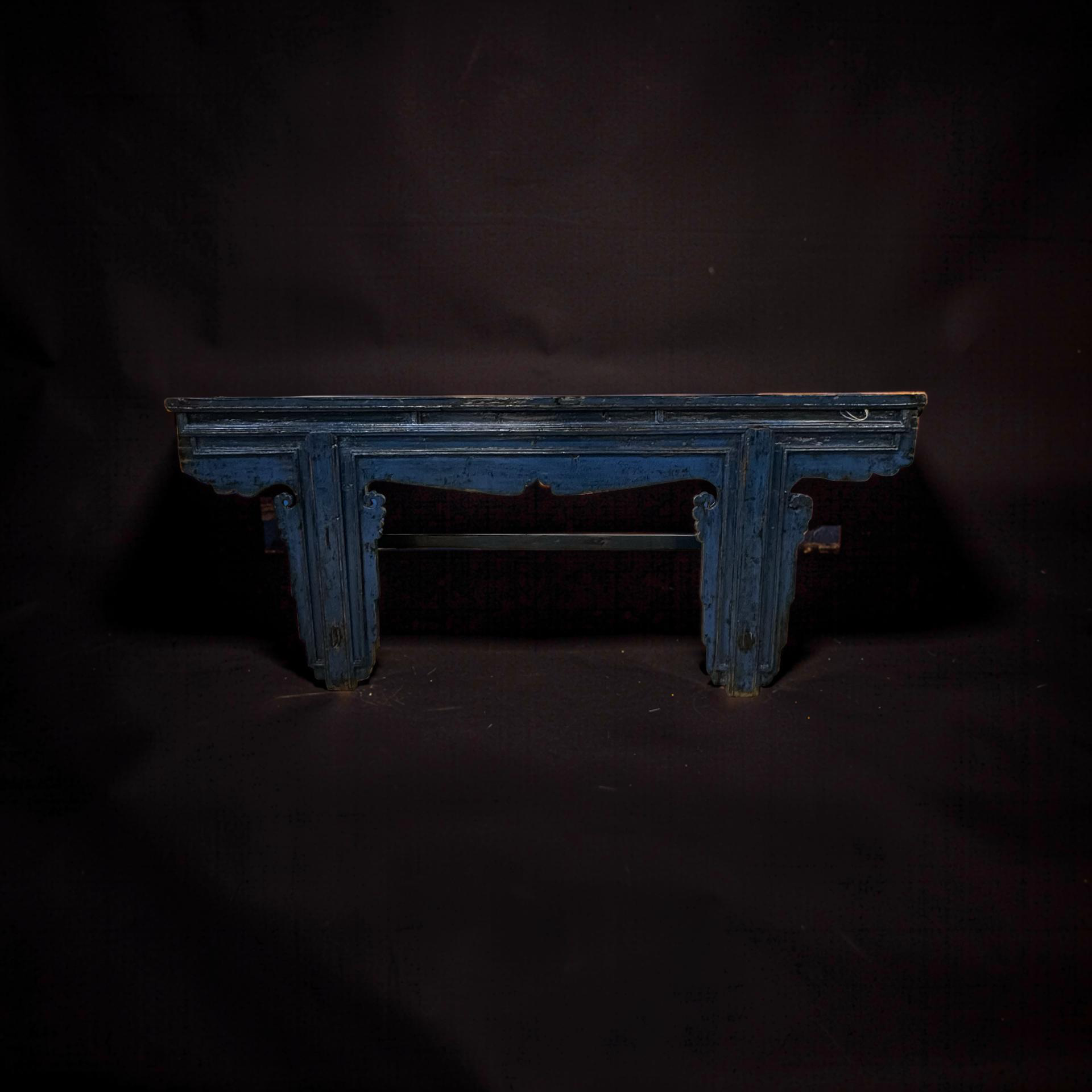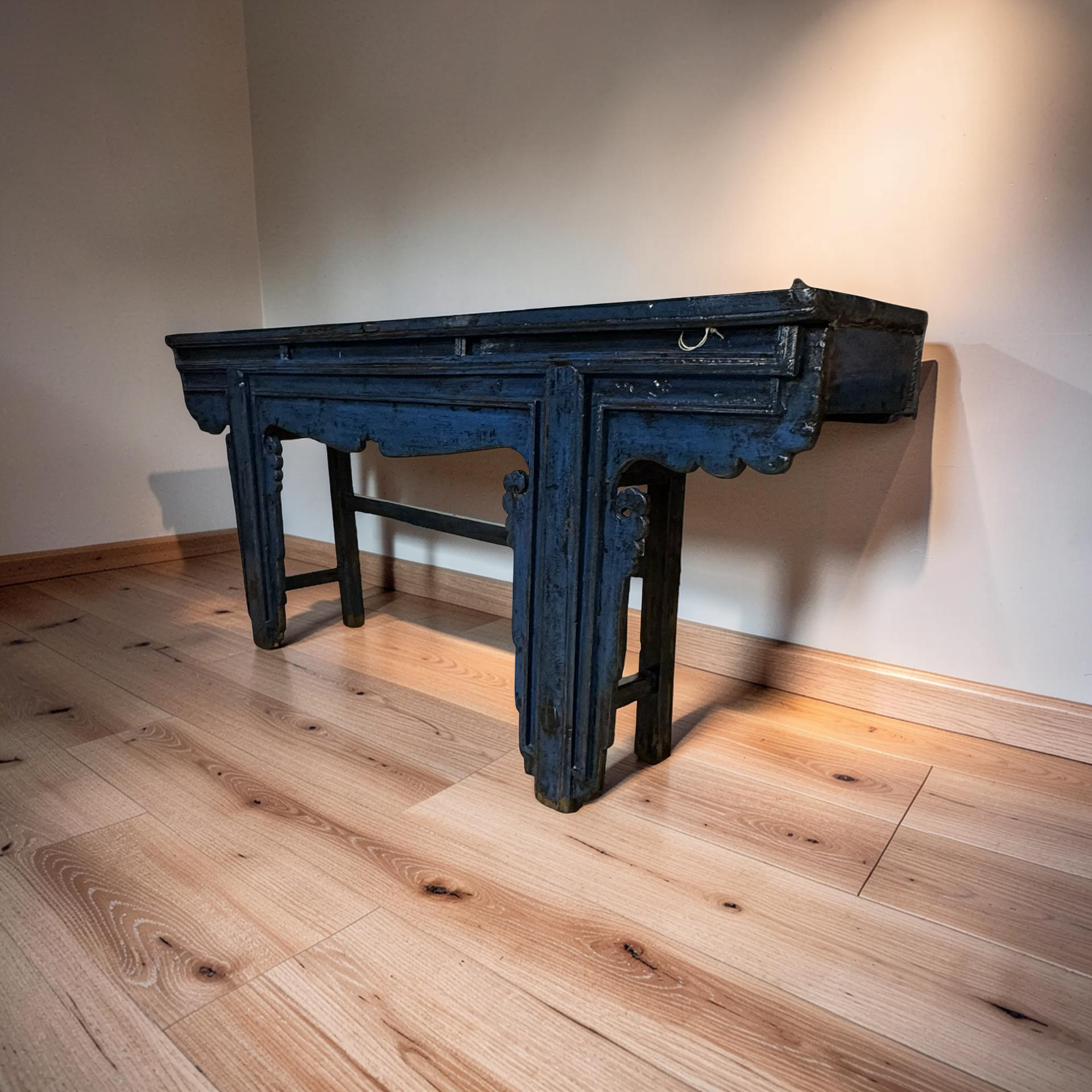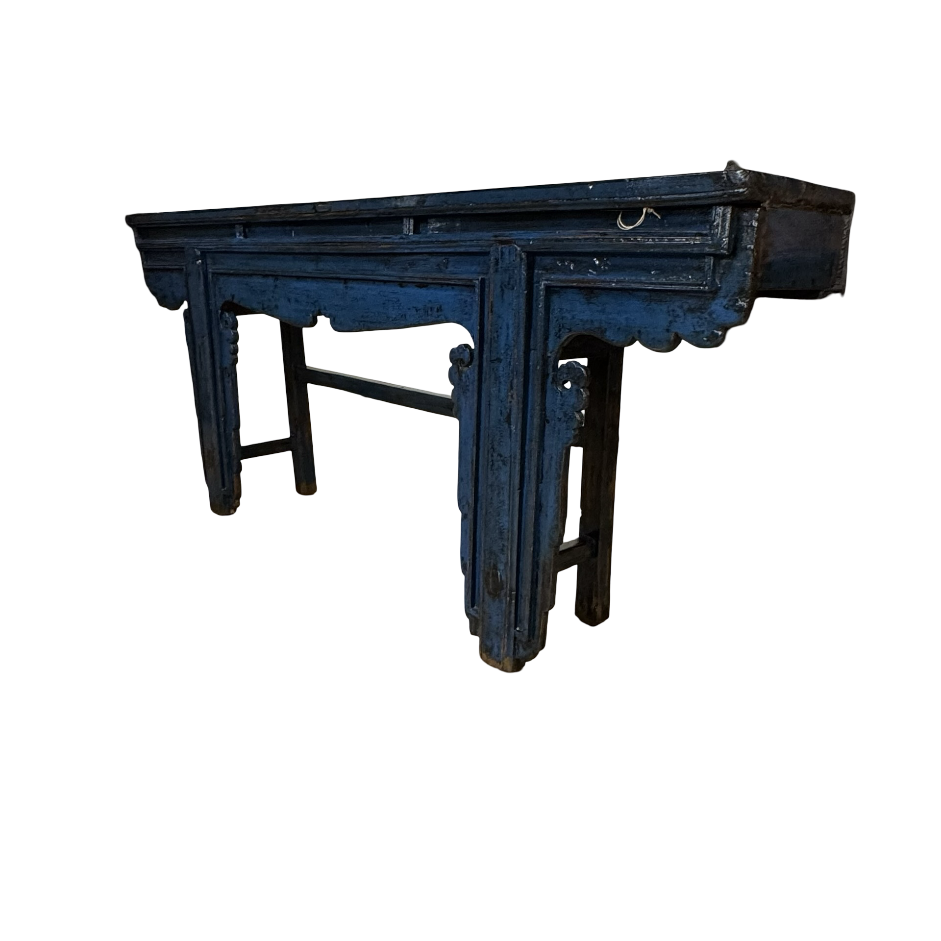 Deze unieke wandtafel uit China is uitgevoerd in een diepblauwe lak met een doorleefde, oude uitstraling. Het handgemaakte stuk draagt subtiele sporen van gebruik en ambacht, wat zorgt voor karakter en authenticiteit in het meubel.