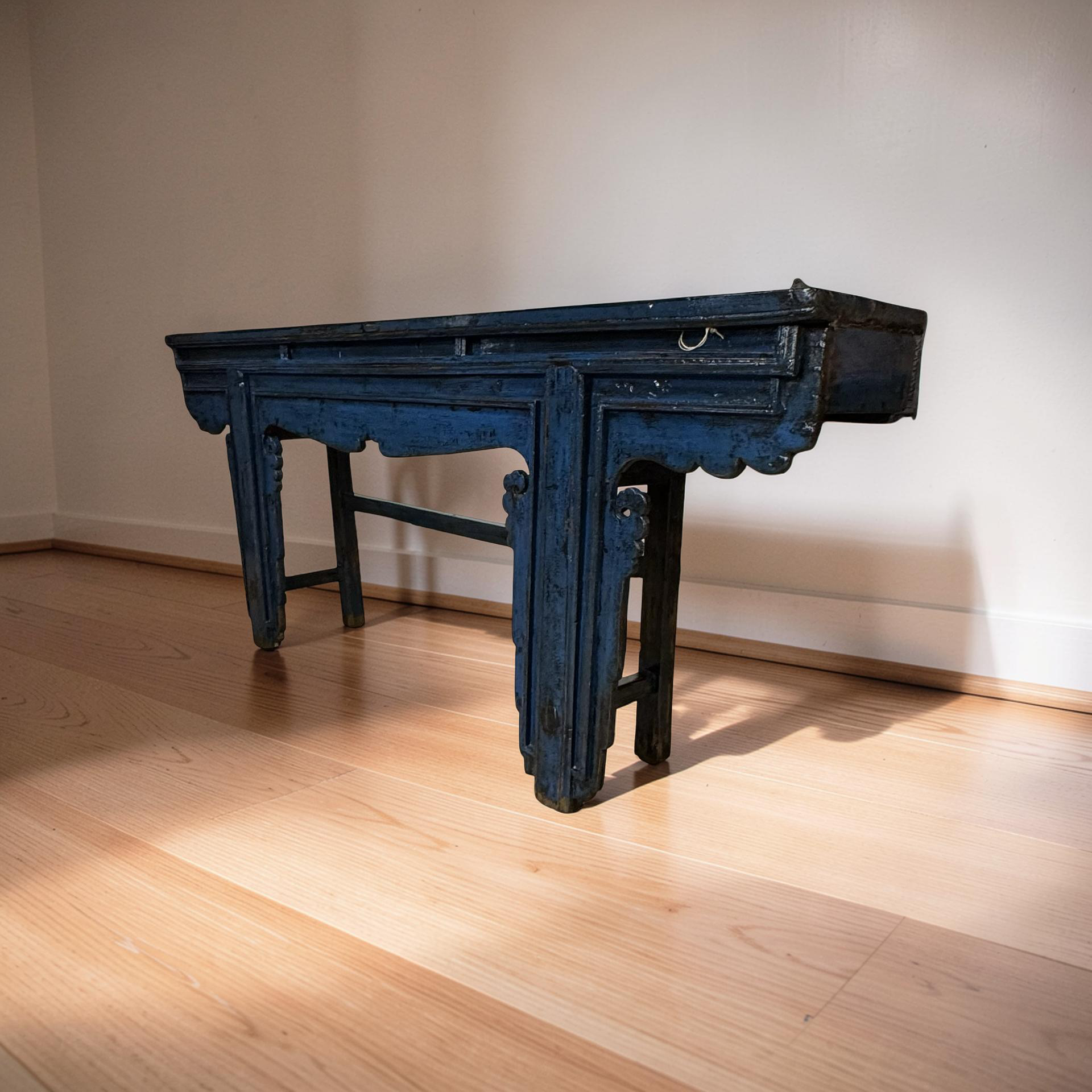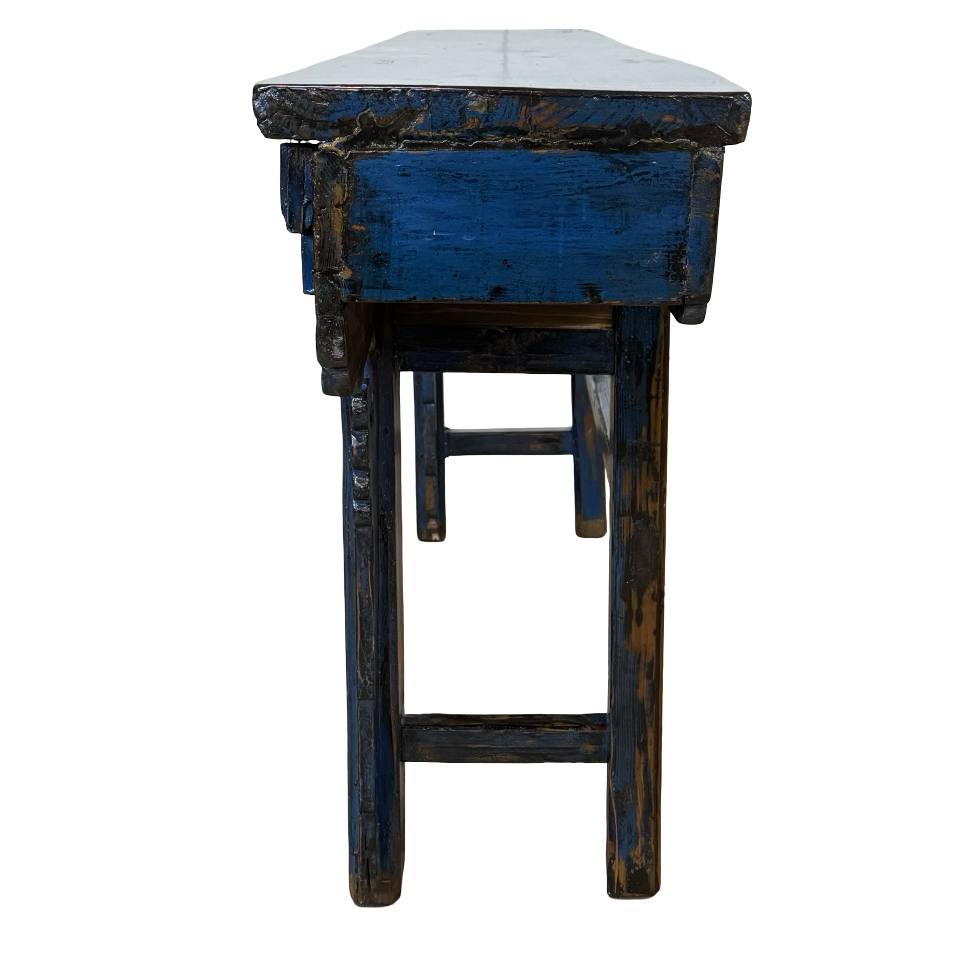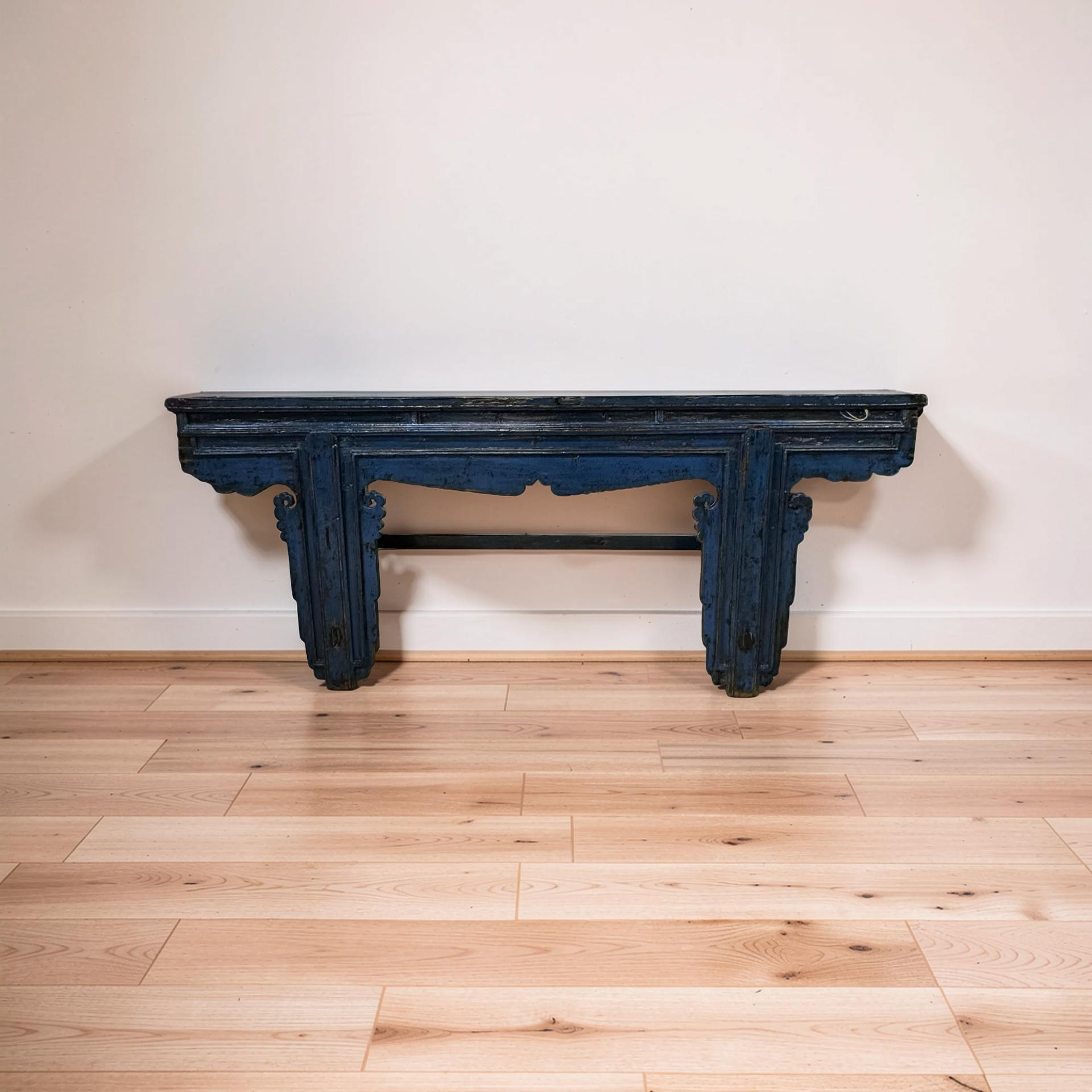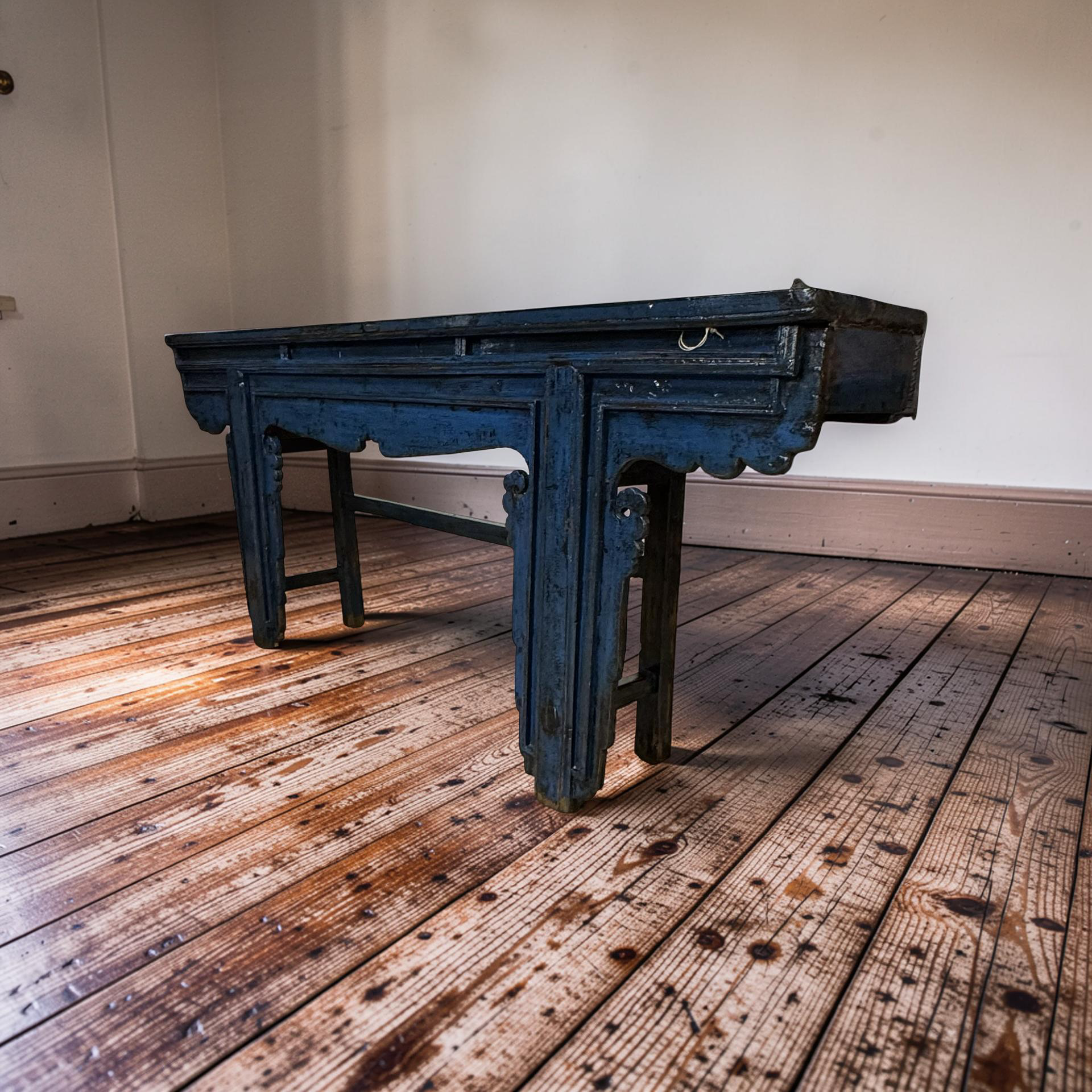 Deze unieke wandtafel uit China is uitgevoerd in een diepblauwe lak met een doorleefde, oude uitstraling. Het handgemaakte stuk draagt subtiele sporen van gebruik en ambacht, wat zorgt voor karakter en authenticiteit in het meubel.