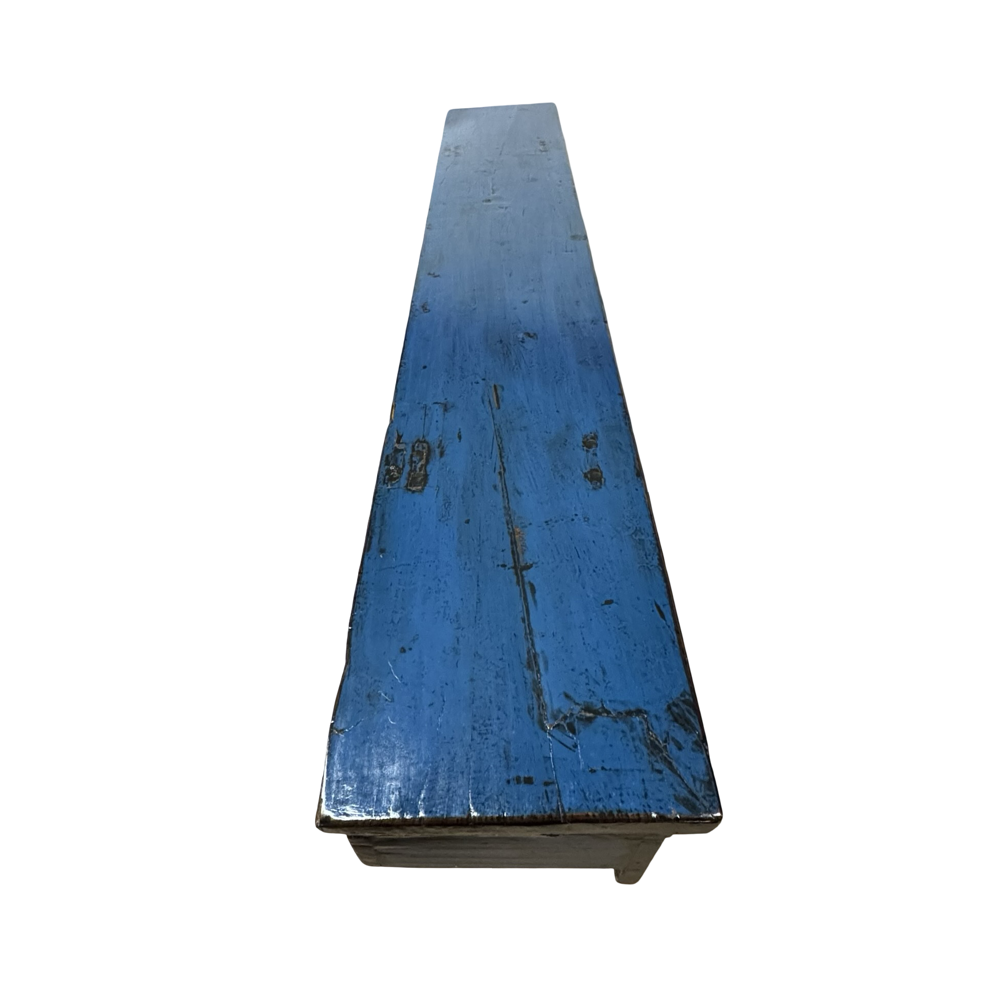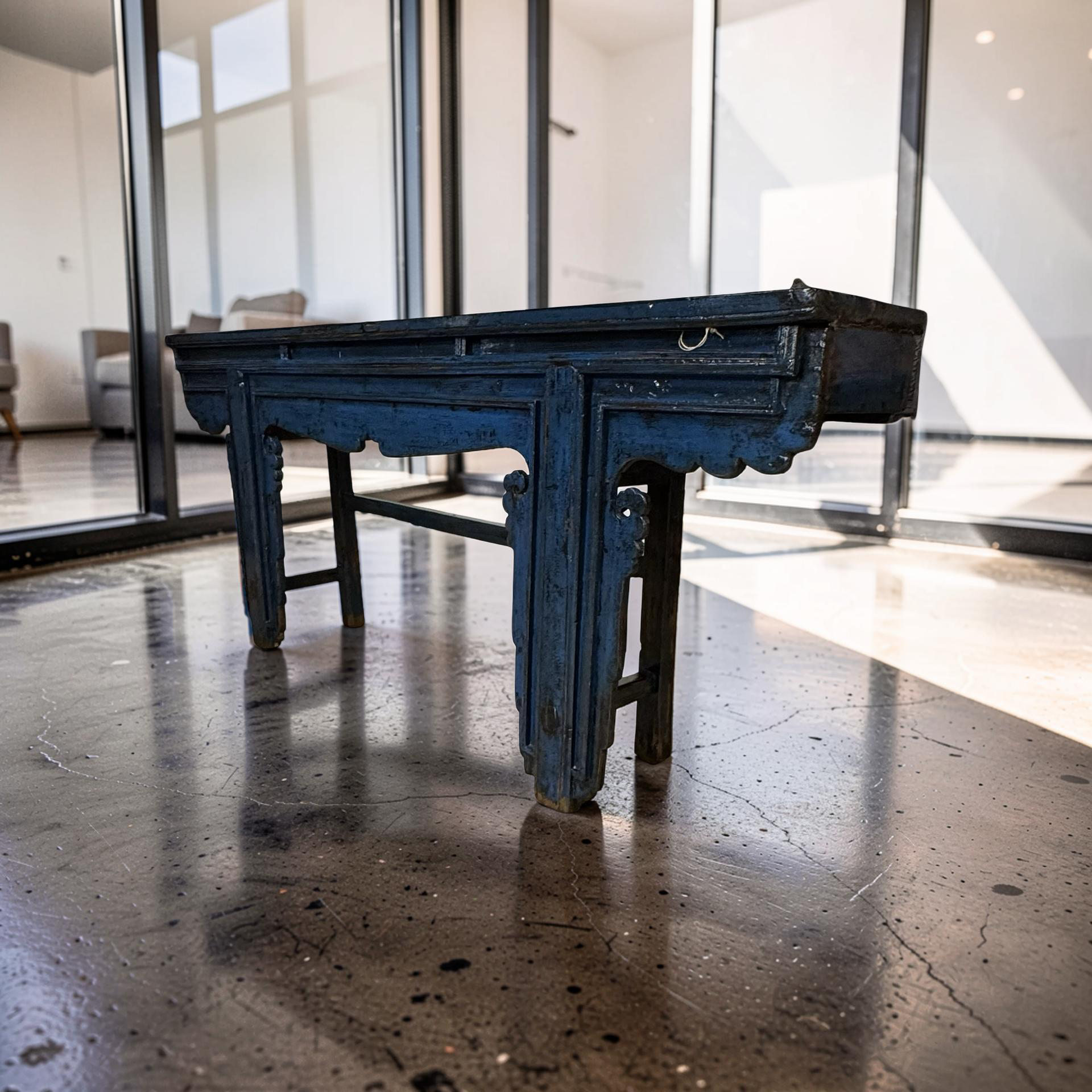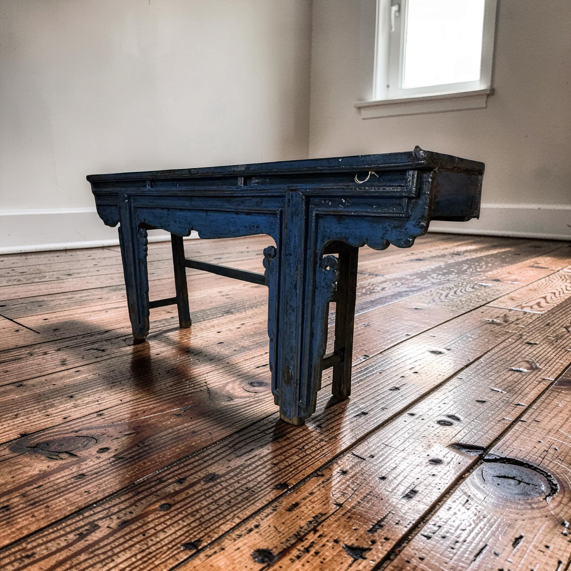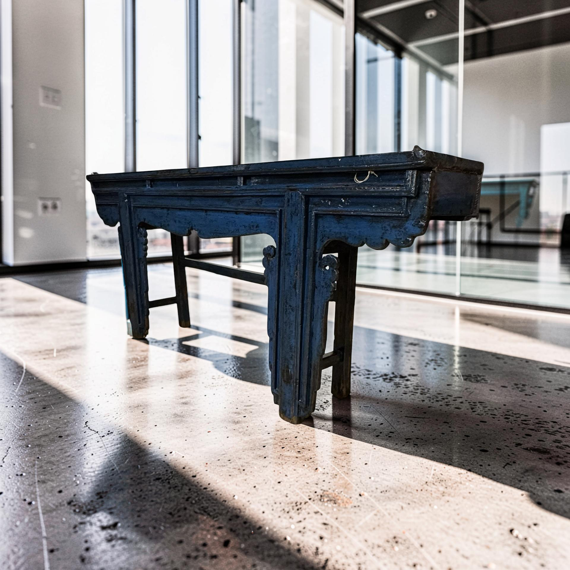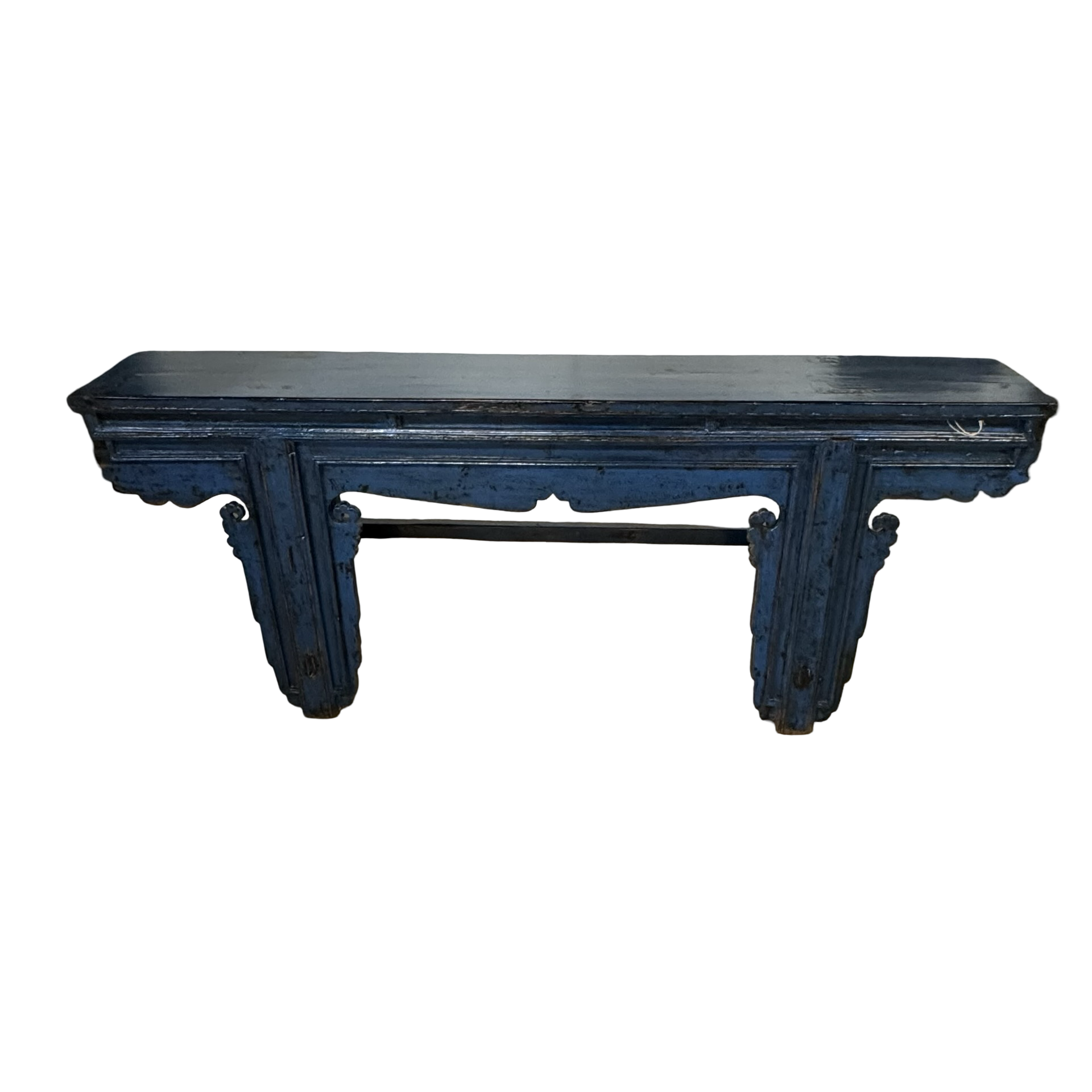 Deze unieke wandtafel uit China is uitgevoerd in een diepblauwe lak met een doorleefde, oude uitstraling. Het handgemaakte stuk draagt subtiele sporen van gebruik en ambacht, wat zorgt voor karakter en authenticiteit in het meubel.