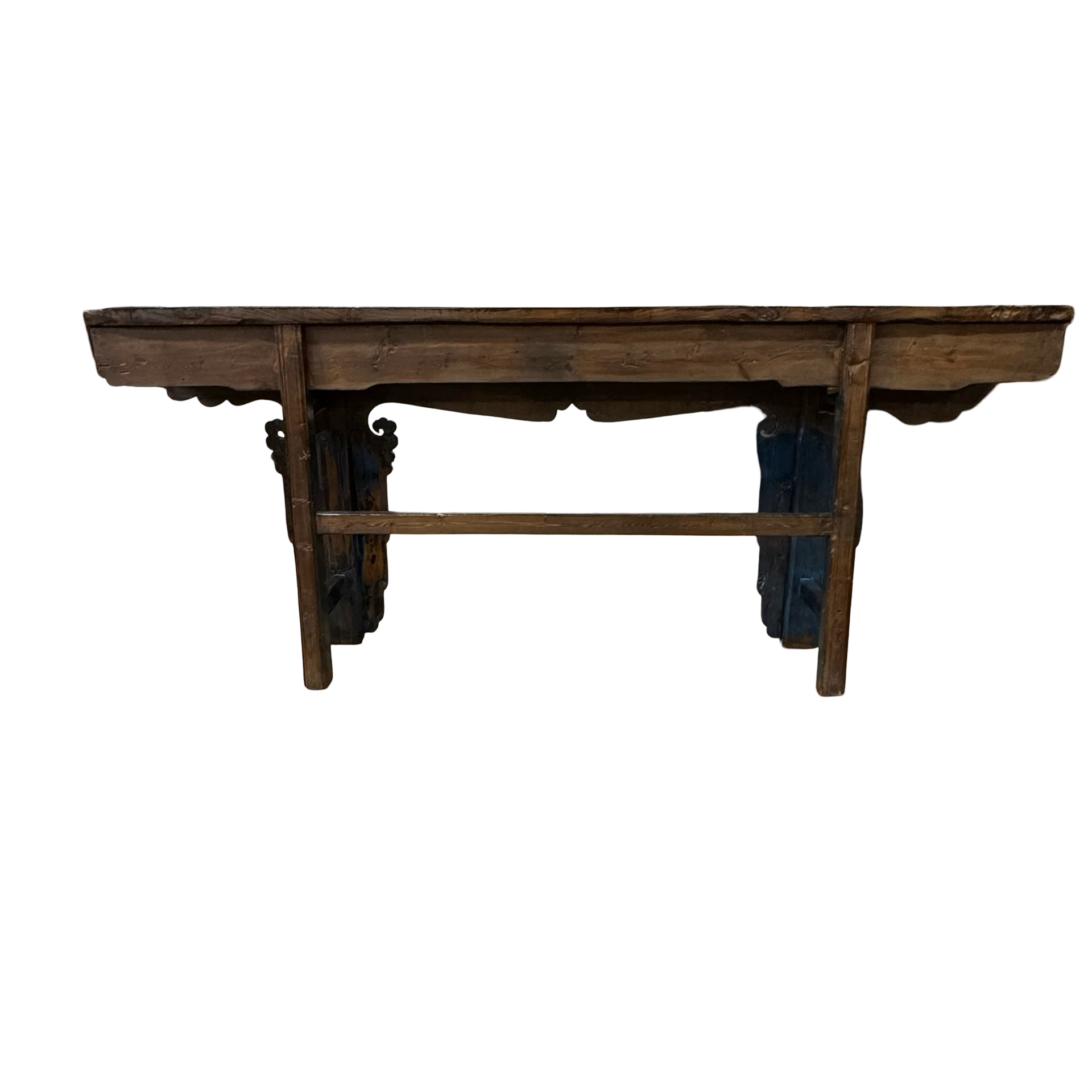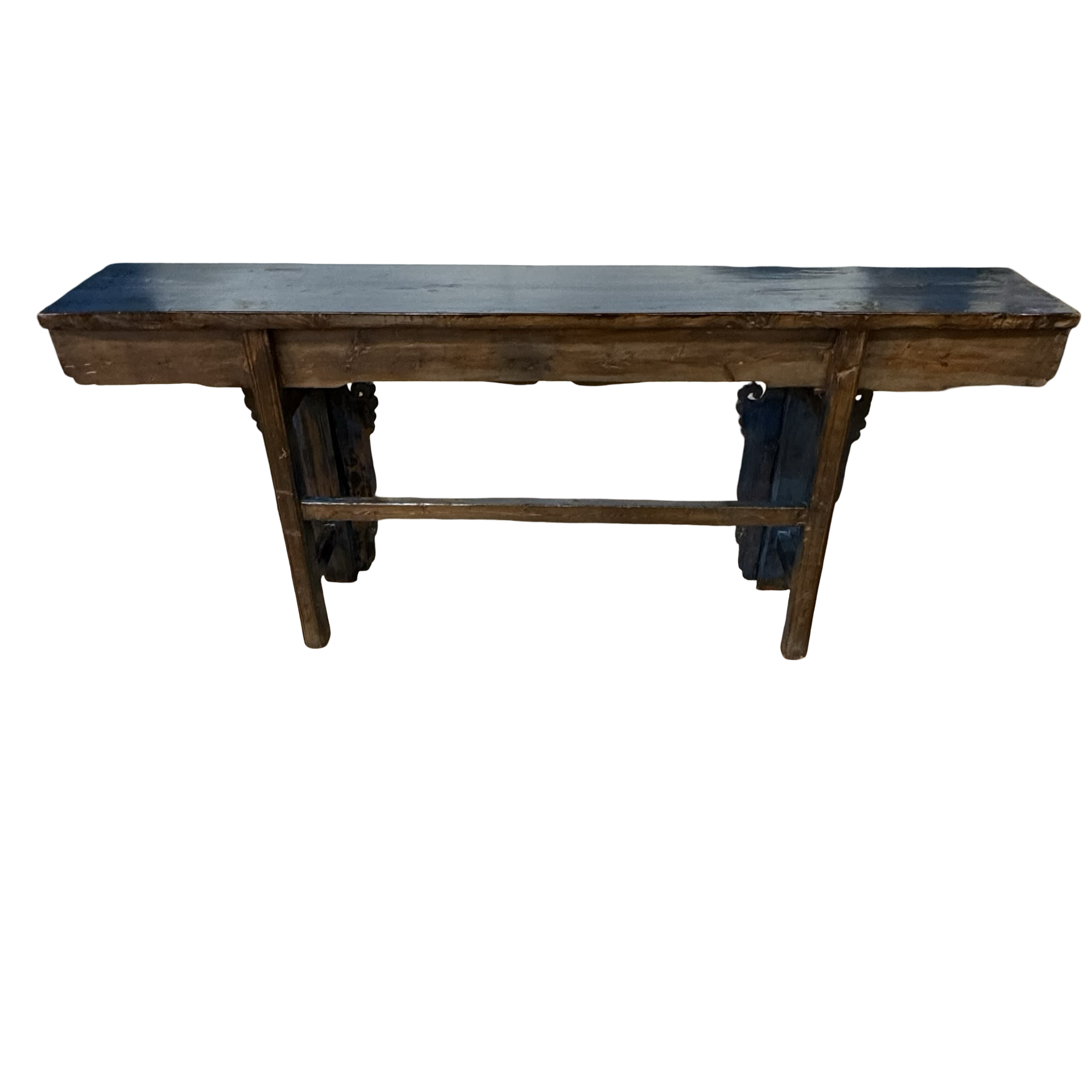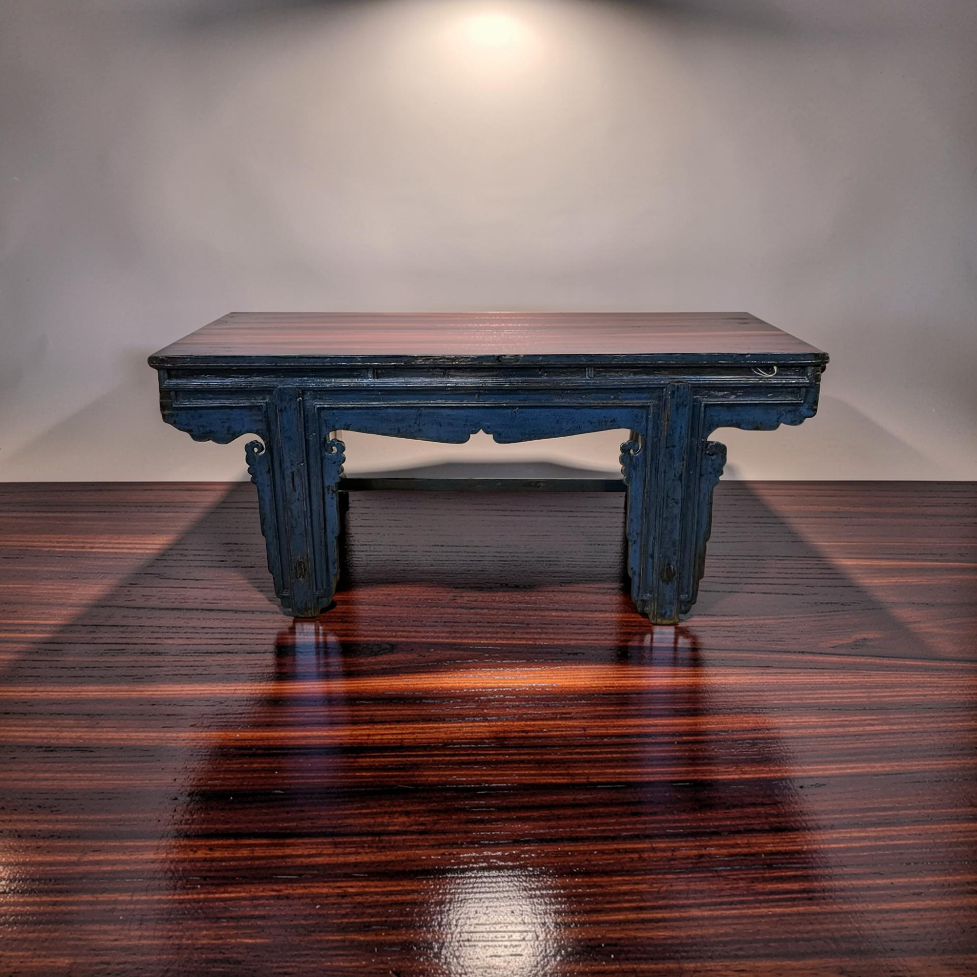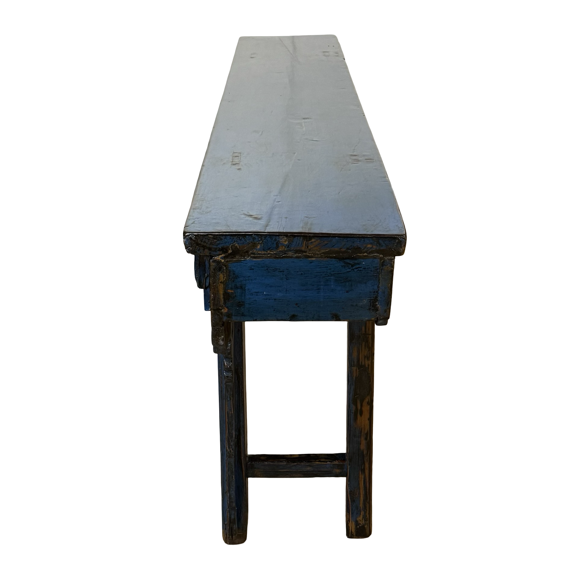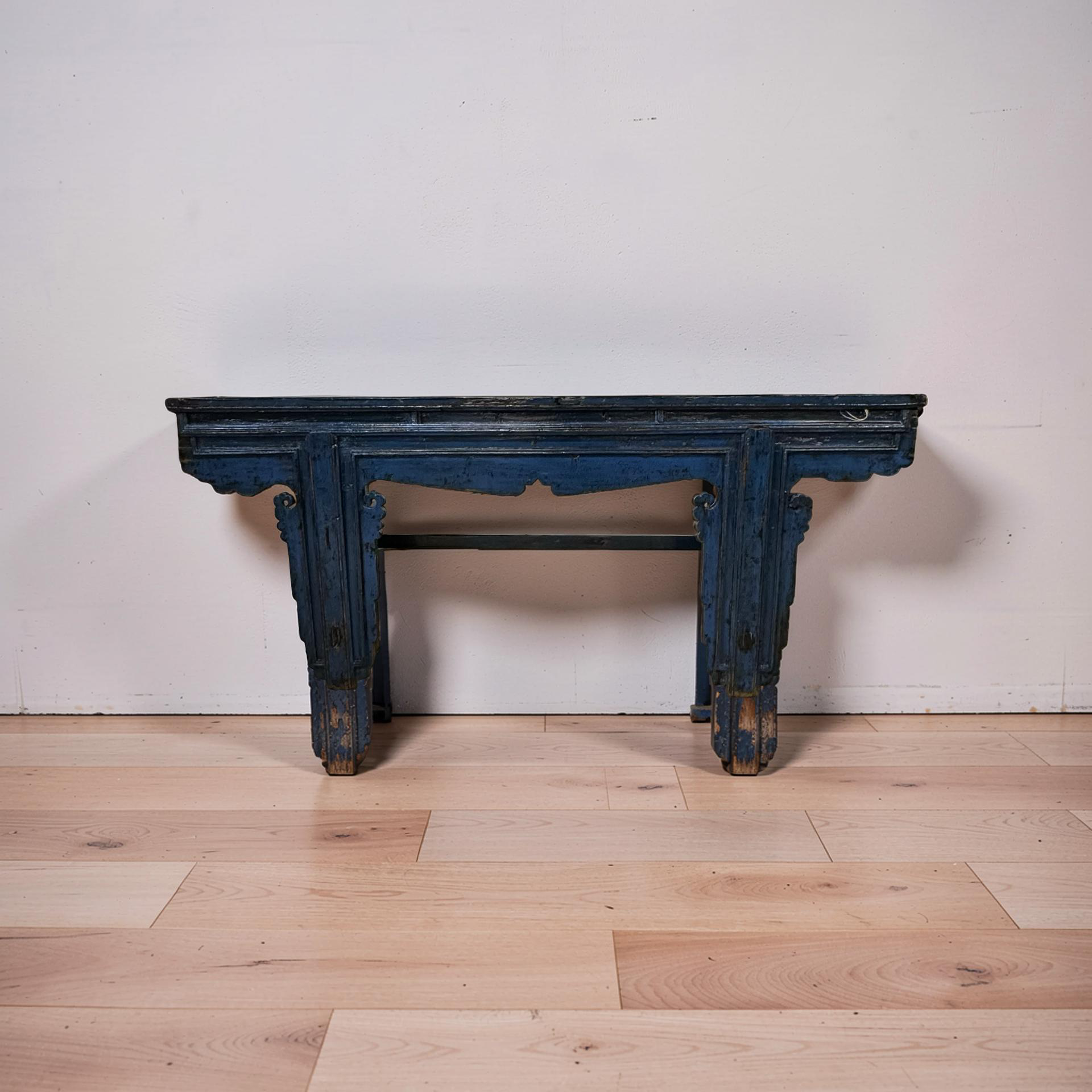 Deze unieke wandtafel uit China is uitgevoerd in een diepblauwe lak met een doorleefde, oude uitstraling. Het handgemaakte stuk draagt subtiele sporen van gebruik en ambacht, wat zorgt voor karakter en authenticiteit in het meubel.